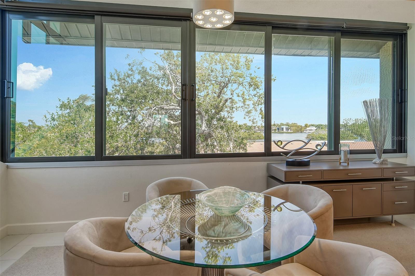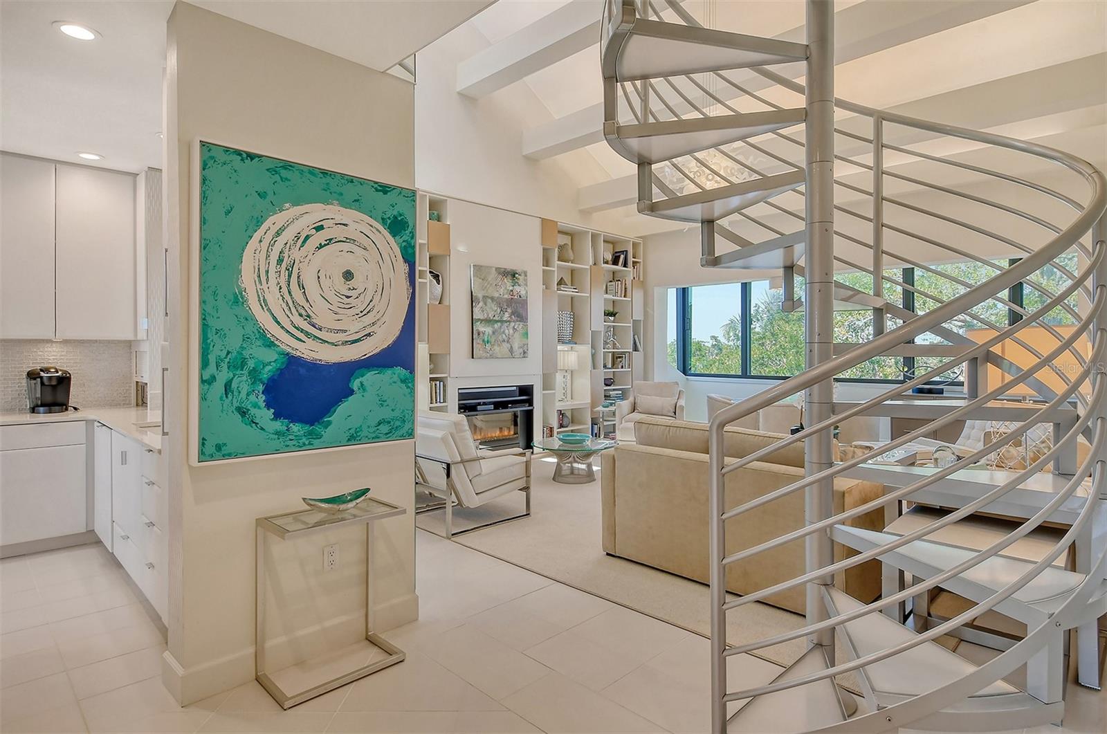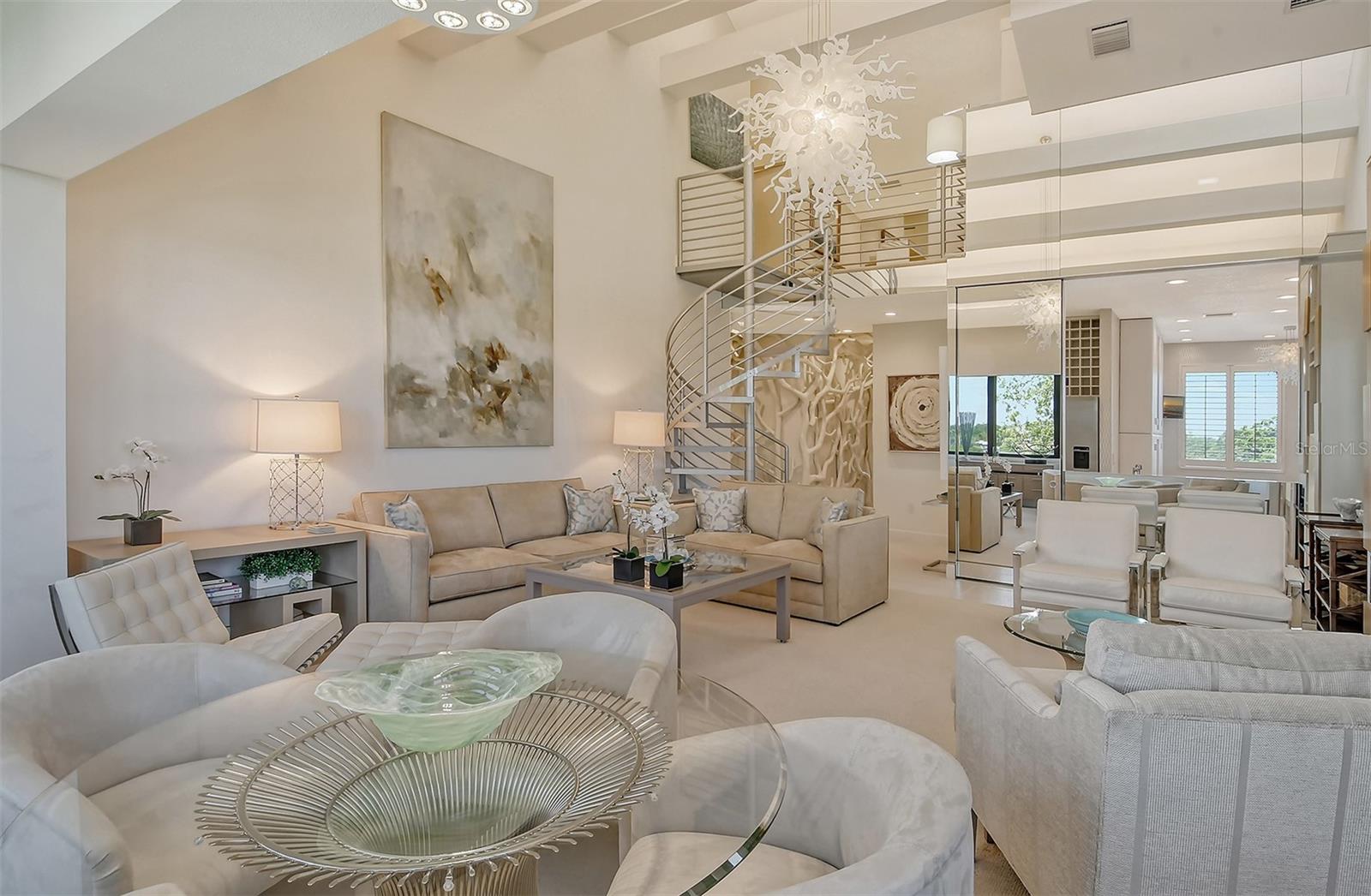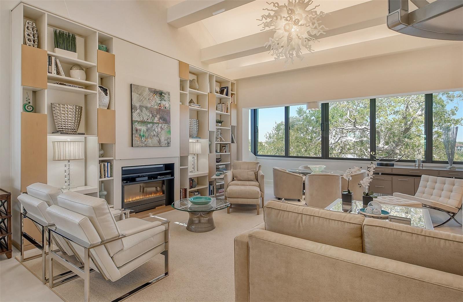 Treetop Retreat on the Bay! Welcome to living your perfect Siesta Key lifestyle. This turnkey furnished condo is situated bayside, the views from this bay view condo are of lush trees and thick tropical foilage and flowers. This condo has a tree-house feeling., The living room ceiling is 23 feet high! There is a spiral staircase made of matte-finish metal and frosted glass. The glass stair treads are lit and at night- the staircase looks like a piece of floating modern sculpture. The loft is elegant, done in creamy taupe and upholstered furniture and fine wall coverings with a Murphy bed. The loft could be a third bedroom with a full bath and closet. A larger aqua painting over the electric fireplace raises and lowers by remote control to reveal a flat-screen tv The flooring throughout is a combination of porcelain textured tile (heated floors) and wool sisal carpeting. The design of this unique tree house condo makes it like no other. The dining area has a view of the bay! Soaring ceilings fill the space with natural light-You can make this a great vacation get-a-way or investment property. Pet friendly , with pickle ball and tennis courts, bar-b-ques, 2 heated pools,2 spas, deeded private beach, fishing pier and clubhouse. Hop the trolley to Siesta Key Village for great shopping, dining and lively night life. The best of Island living starts here!