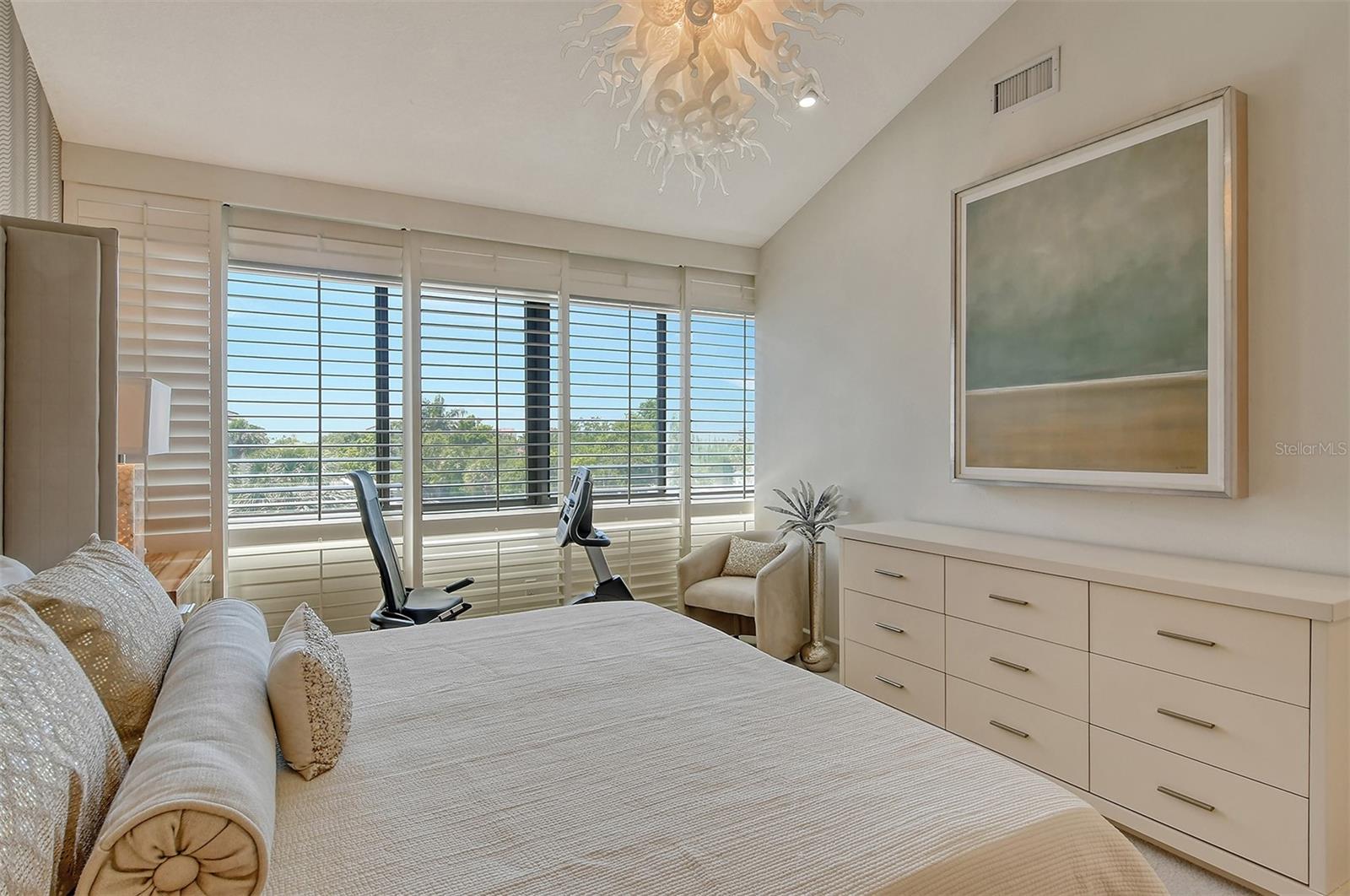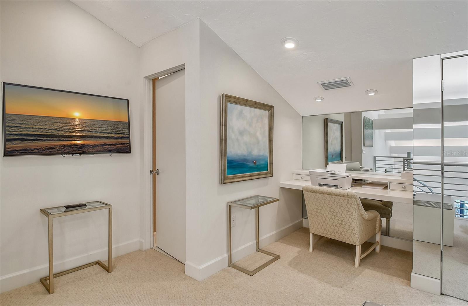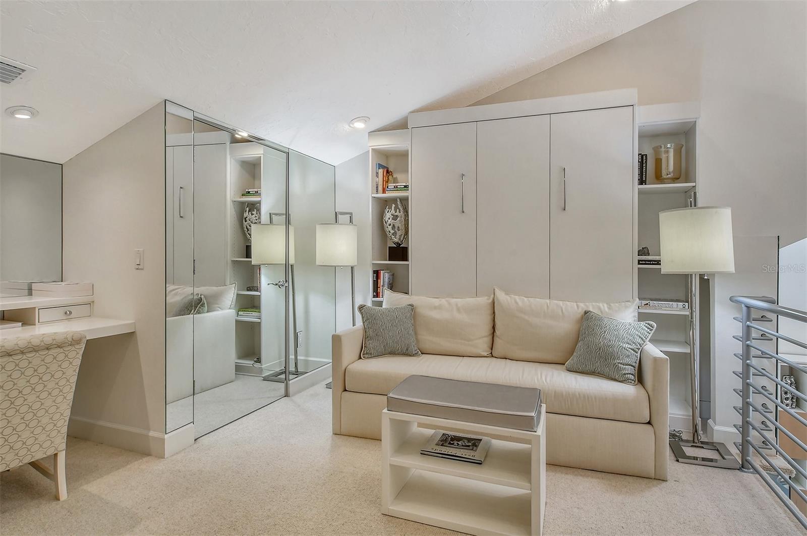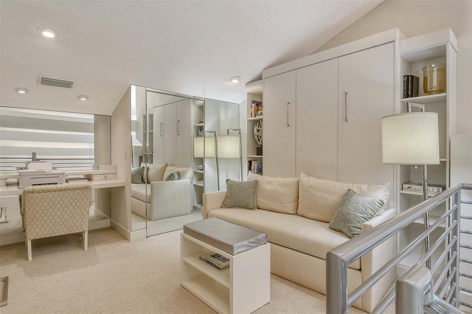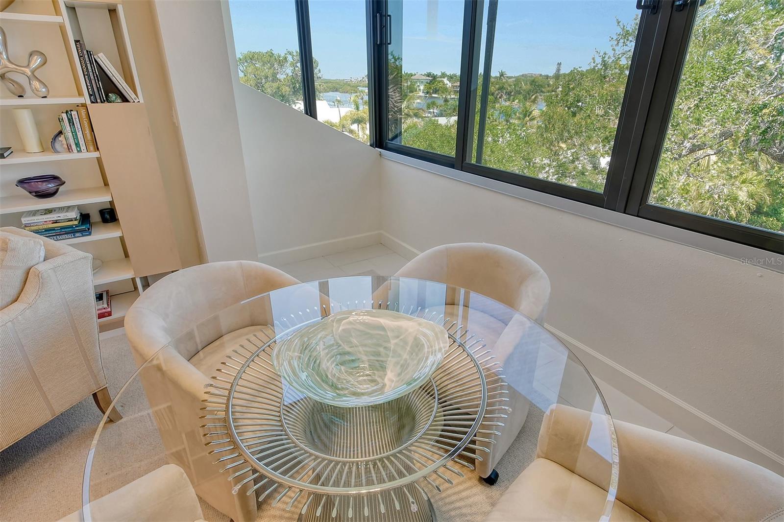Treetop Retreat on the Bay! Welcome to living your perfect Siesta Key lifestyle. This turnkey furnished condo is situated bayside, the views from this bay view condo are of lush trees and thick tropical foilage and flowers. This condo has a tree-house feeling., The living room ceiling is 23 feet high! There is a spiral staircase made of matte-finish metal and frosted glass. The glass stair treads are lit and at night- the staircase looks like a piece of floating modern sculpture. The loft is elegant, done in creamy taupe and upholstered furniture and fine wall coverings with a Murphy bed. The loft could be a third bedroom with a full bath and closet. A larger aqua painting over the electric fireplace raises and lowers by remote control to reveal a flat-screen tv The flooring throughout is a combination of porcelain textured tile (heated floors) and wool sisal carpeting. The design of this unique tree house condo makes it like no other. The dining area has a view of the bay! Soaring ceilings fill the space with natural light-You can make this a great vacation get-a-way or investment property. Pet friendly , with pickle ball and tennis courts, bar-b-ques, 2 heated pools,2 spas, deeded private beach, fishing pier and clubhouse. Hop the trolley to Siesta Key Village for great shopping, dining and lively night life. The best of Island living starts here!