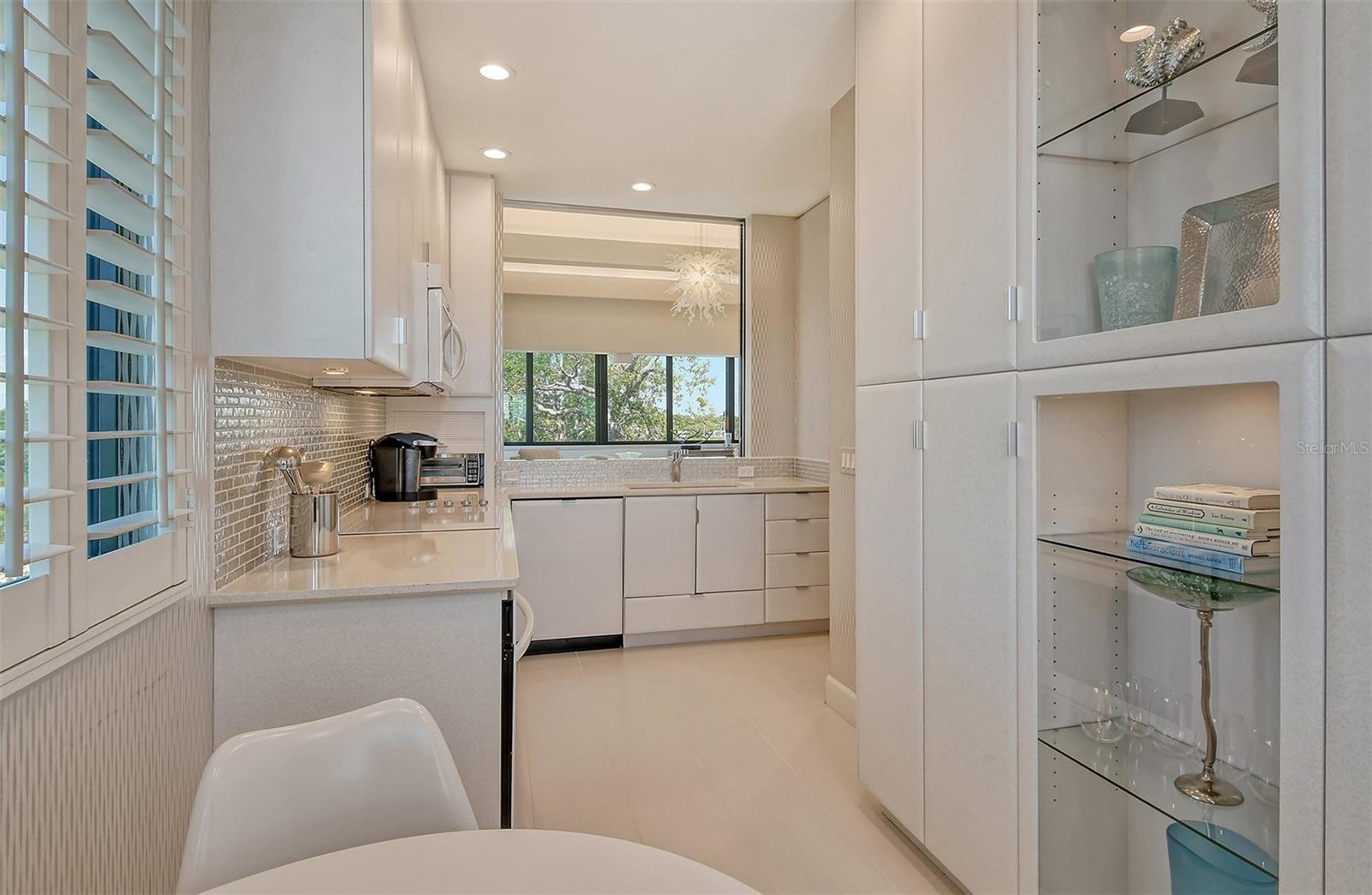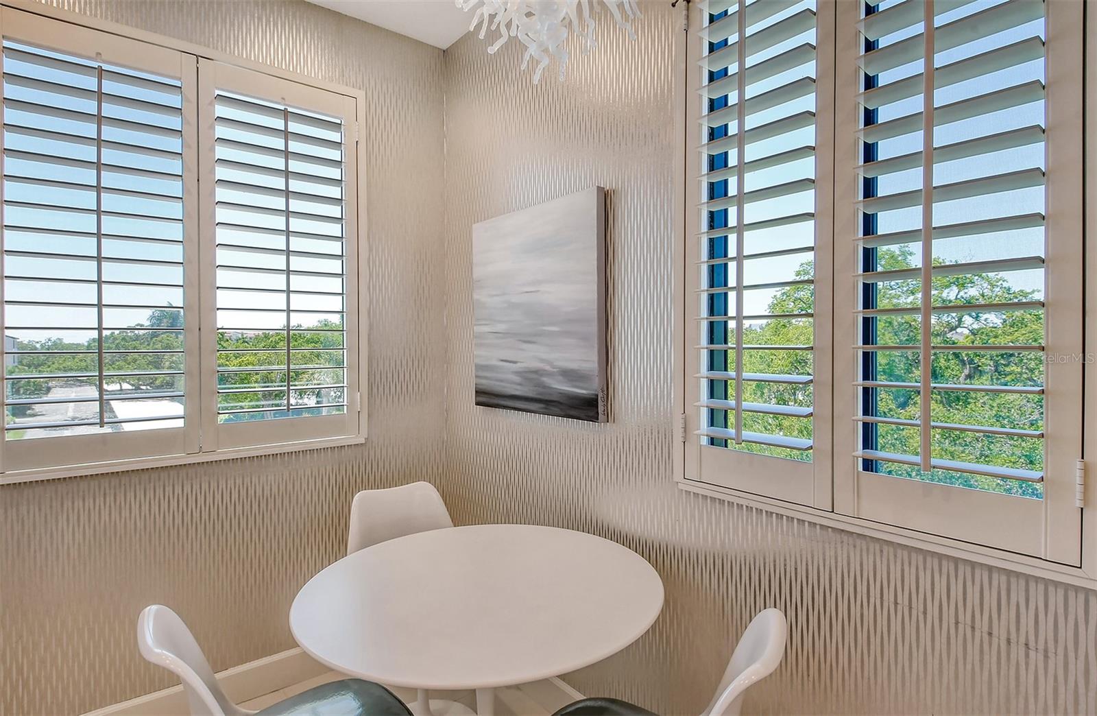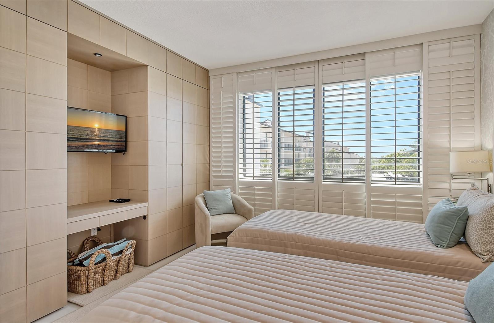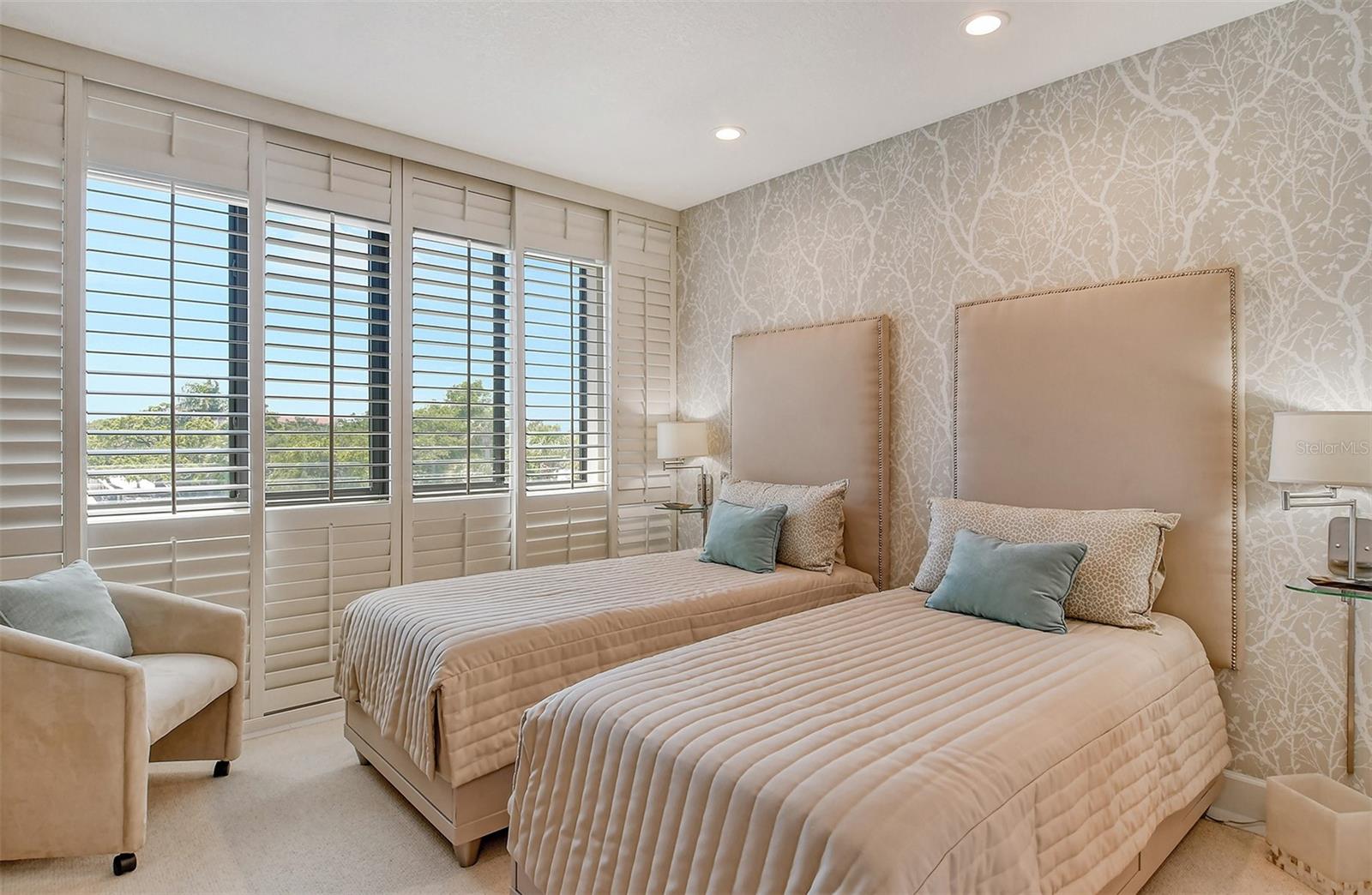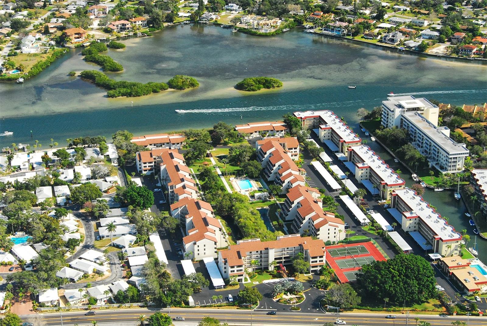 Treetop Retreat on the Bay! Welcome to living your perfect Siesta Key lifestyle. This turnkey furnished condo is situated bayside, the views from this bay view condo are of lush trees and thick tropical foilage and flowers. This condo has a tree-house feeling., The living room ceiling is 23 feet high! There is a spiral staircase made of matte-finish metal and frosted glass. The glass stair treads are lit and at night- the staircase looks like a piece of floating modern sculpture. The loft is elegant, done in creamy taupe and upholstered furniture and fine wall coverings with a Murphy bed. The loft could be a third bedroom with a full bath and closet. A larger aqua painting over the electric fireplace raises and lowers by remote control to reveal a flat-screen tv The flooring throughout is a combination of porcelain textured tile (heated floors) and wool sisal carpeting. The design of this unique tree house condo makes it like no other. The dining area has a view of the bay! Soaring ceilings fill the space with natural light-You can make this a great vacation get-a-way or investment property. Pet friendly , with pickle ball and tennis courts, bar-b-ques, 2 heated pools,2 spas, deeded private beach, fishing pier and clubhouse. Hop the trolley to Siesta Key Village for great shopping, dining and lively night life. The best of Island living starts here!