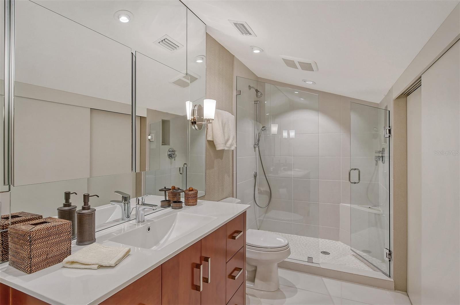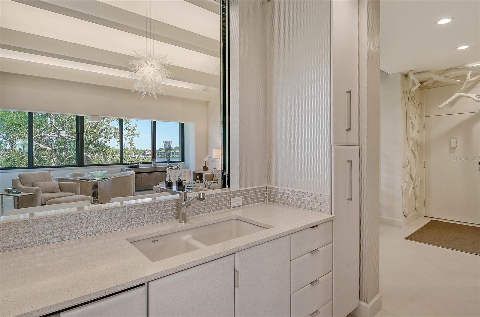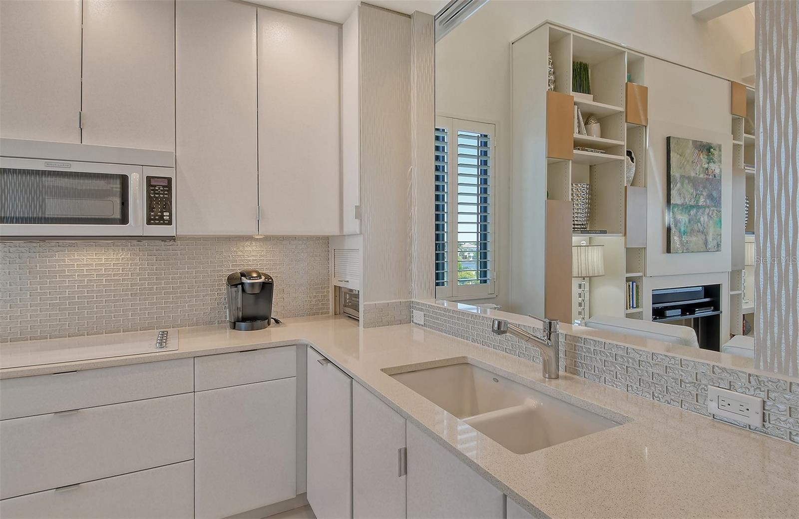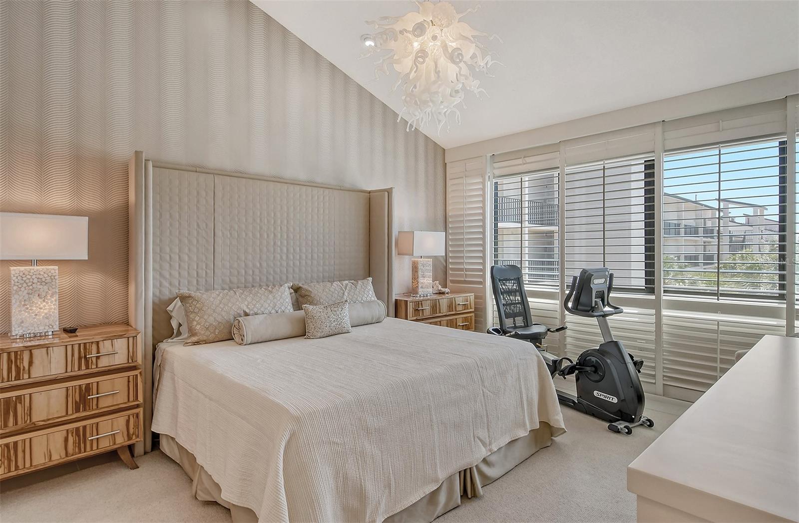 Treetop Retreat on the Bay! Welcome to living your perfect Siesta Key lifestyle. This turnkey furnished condo is situated bayside, the views from this bay view condo are of lush trees and thick tropical foilage and flowers. This condo has a tree-house feeling., The living room ceiling is 23 feet high! There is a spiral staircase made of matte-finish metal and frosted glass. The glass stair treads are lit and at night- the staircase looks like a piece of floating modern sculpture. The loft is elegant, done in creamy taupe and upholstered furniture and fine wall coverings with a Murphy bed. The loft could be a third bedroom with a full bath and closet. A larger aqua painting over the electric fireplace raises and lowers by remote control to reveal a flat-screen tv The flooring throughout is a combination of porcelain textured tile (heated floors) and wool sisal carpeting. The design of this unique tree house condo makes it like no other. The dining area has a view of the bay! Soaring ceilings fill the space with natural light-You can make this a great vacation get-a-way or investment property. Pet friendly , with pickle ball and tennis courts, bar-b-ques, 2 heated pools,2 spas, deeded private beach, fishing pier and clubhouse. Hop the trolley to Siesta Key Village for great shopping, dining and lively night life. The best of Island living starts here!