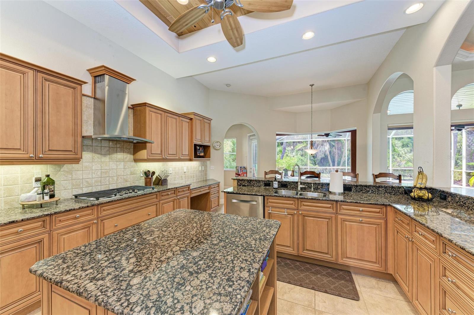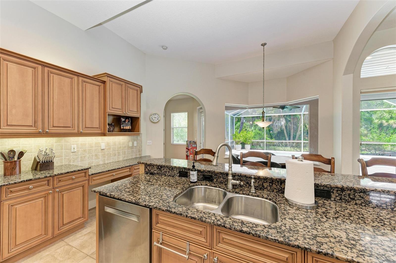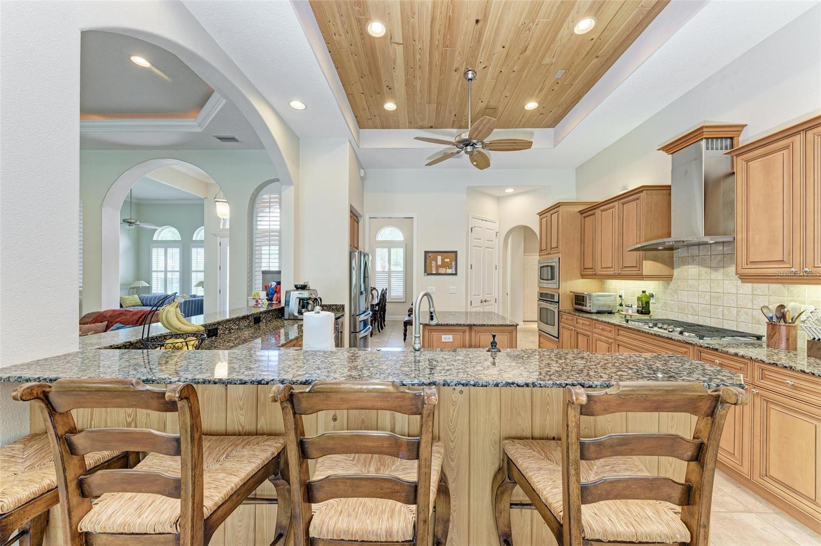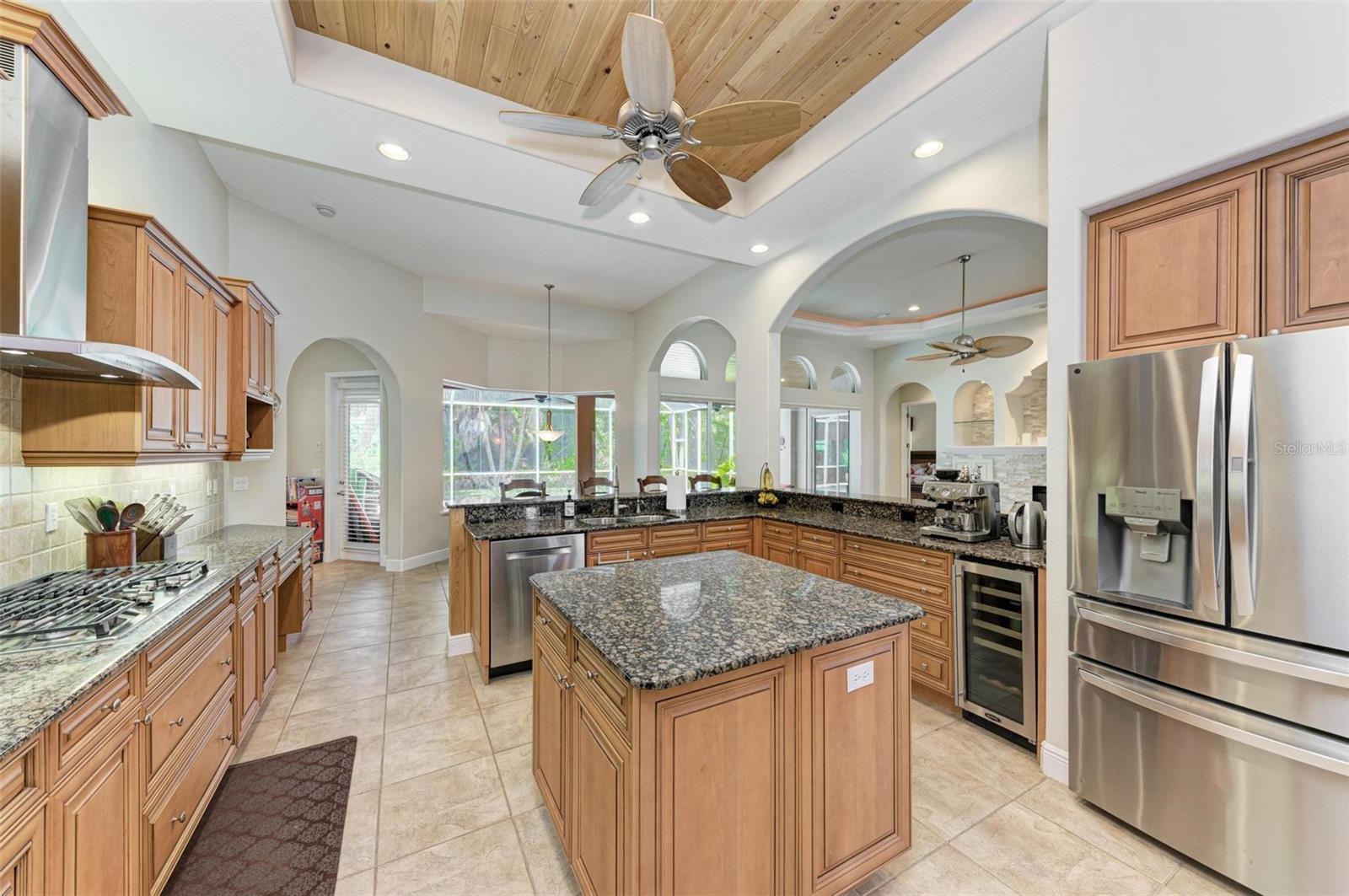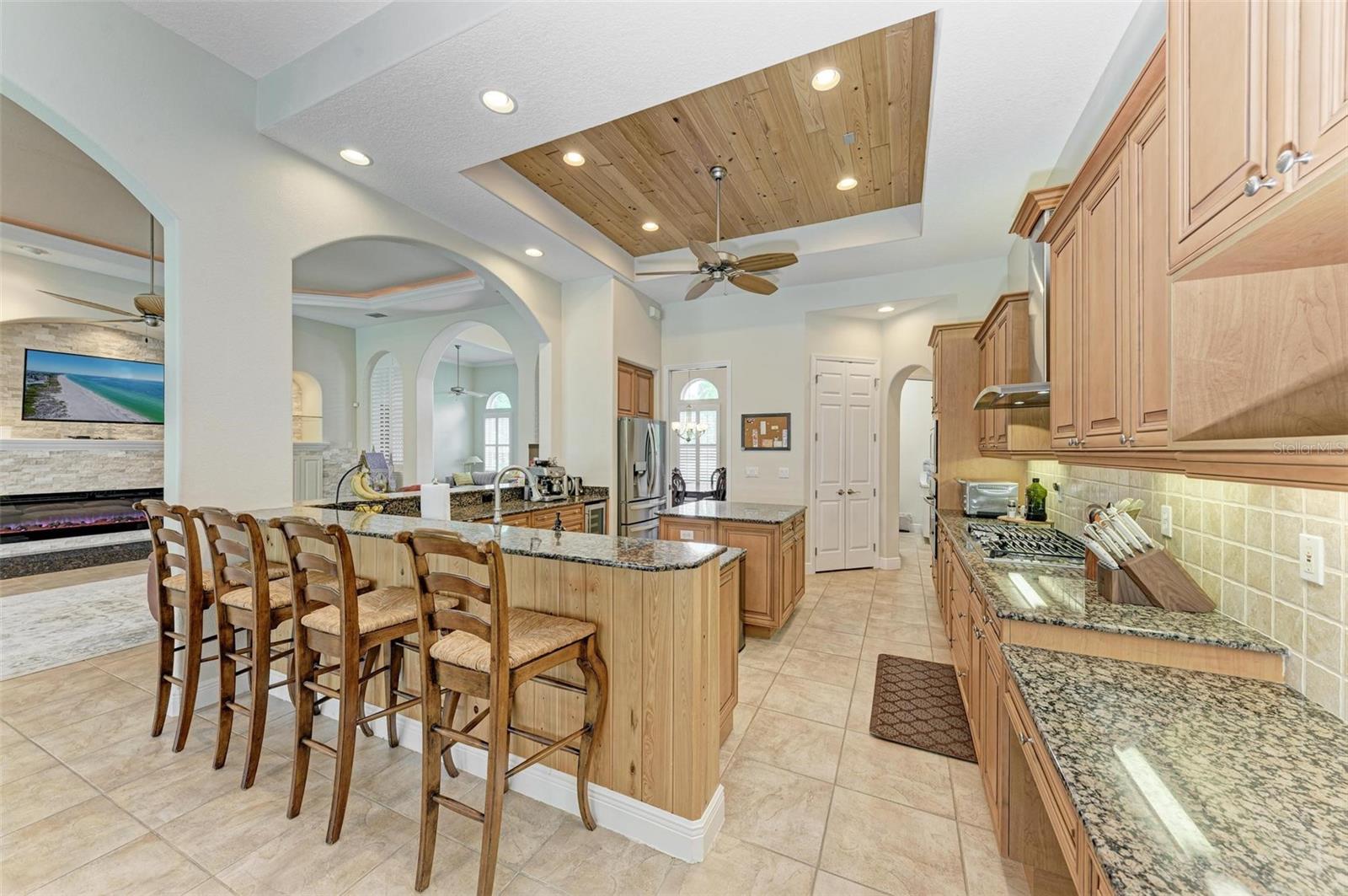 NEW POOL HEATER JUST INSTALLED. The home was constructed by John Cannon. Nestled in the gated community of The Hammocks, this timeless beauty awaits you. Meticulously maintained, this 3-bedroom, 3-bath oasis boasts soaring ceilings and an open floor plan, creating a spacious and inviting atmosphere. The heart of the home is the Gi-NORMOUS chef's kitchen, equipped with stainless steel appliances, a natural gas stove, ample storage space, and a sizable pantry. Unique cypress wood accents add a touch of elegance to the ceiling, making every meal preparation a delight. Entertain guests in the formal dining room with 12-foot tray ceilings or unwind in the impressive family room. A dedicated office space with wood floors and plantation shutters provides the perfect environment for productivity. Step outside through the wall of sliders to discover the serene paver brick patio and heated saltwater pool area, surrounded by lush landscaping and a picturesque preserve. The patio ceiling, adorned with honeyed cypress wood, adds to the ambiance of outdoor relaxation. Recent upgrades include a new pool heater, electric fireplace installation, and conversion to a heated saltwater pool, ensuring year-round comfort and enjoyment. Additionally, each bedroom offers wood flooring, ample closet space, and privacy, making this home ideal for families or guests. Complete with a 3-car garage, freshly painted exterior, and landscape lighting, this home exudes curb appeal and sophistication. Experience the tranquility of country living while being just minutes away from Downtown Sarasota, beaches, dining, and shopping. Don't miss the opportunity to make this exceptional property your own!