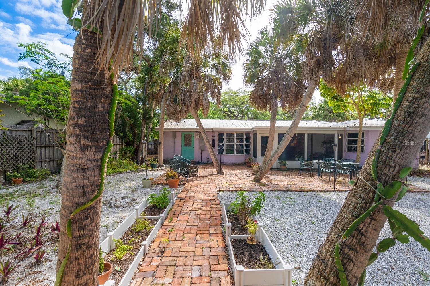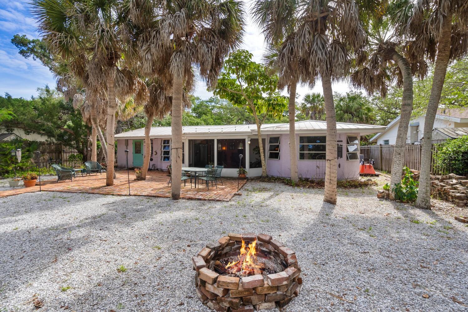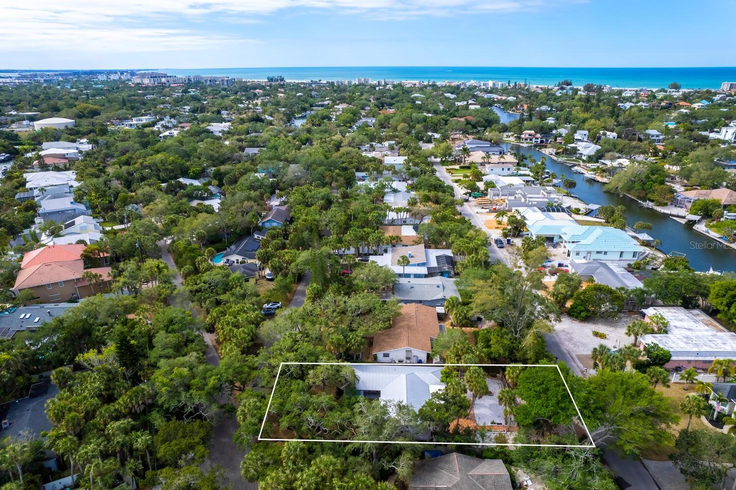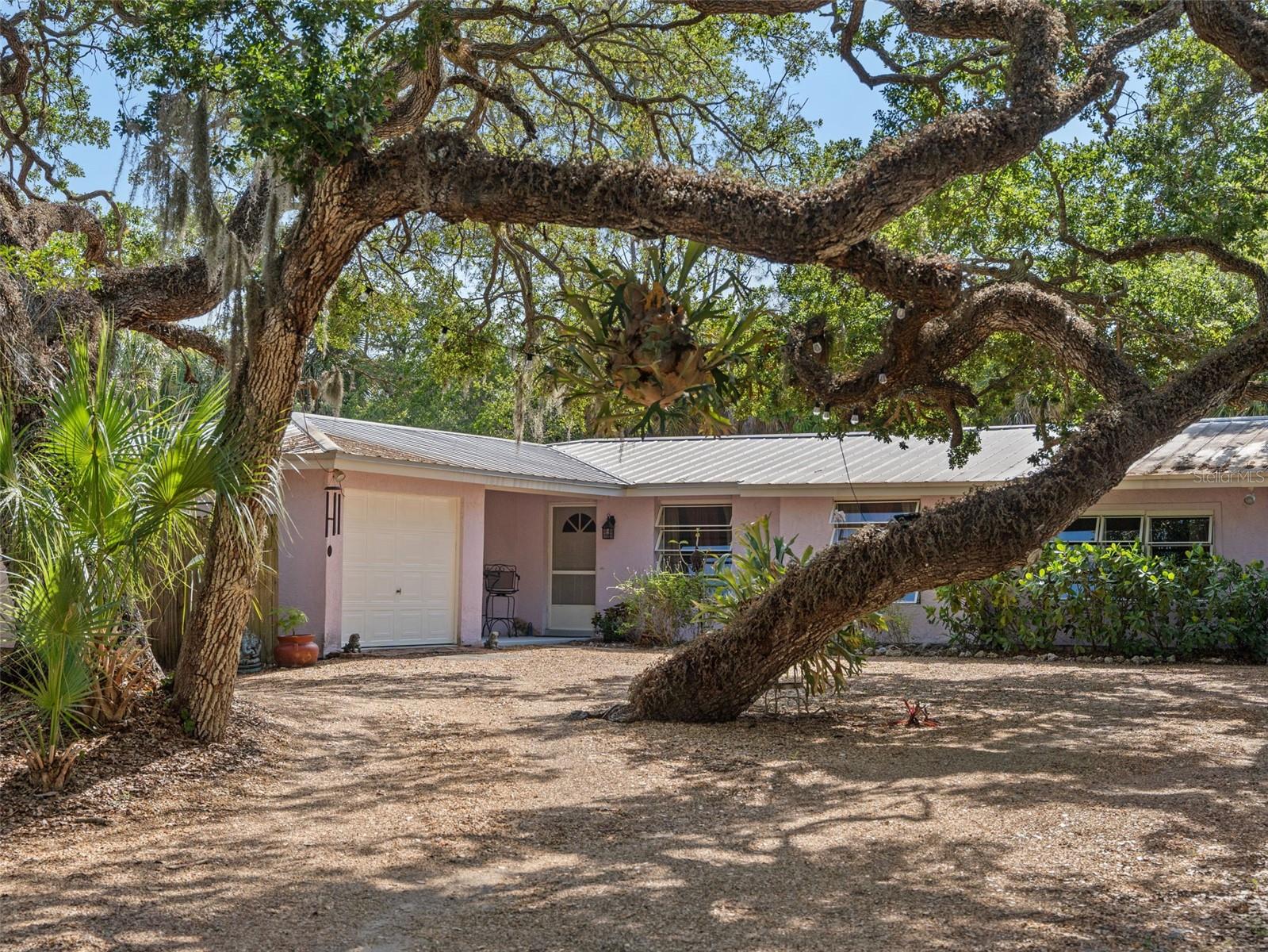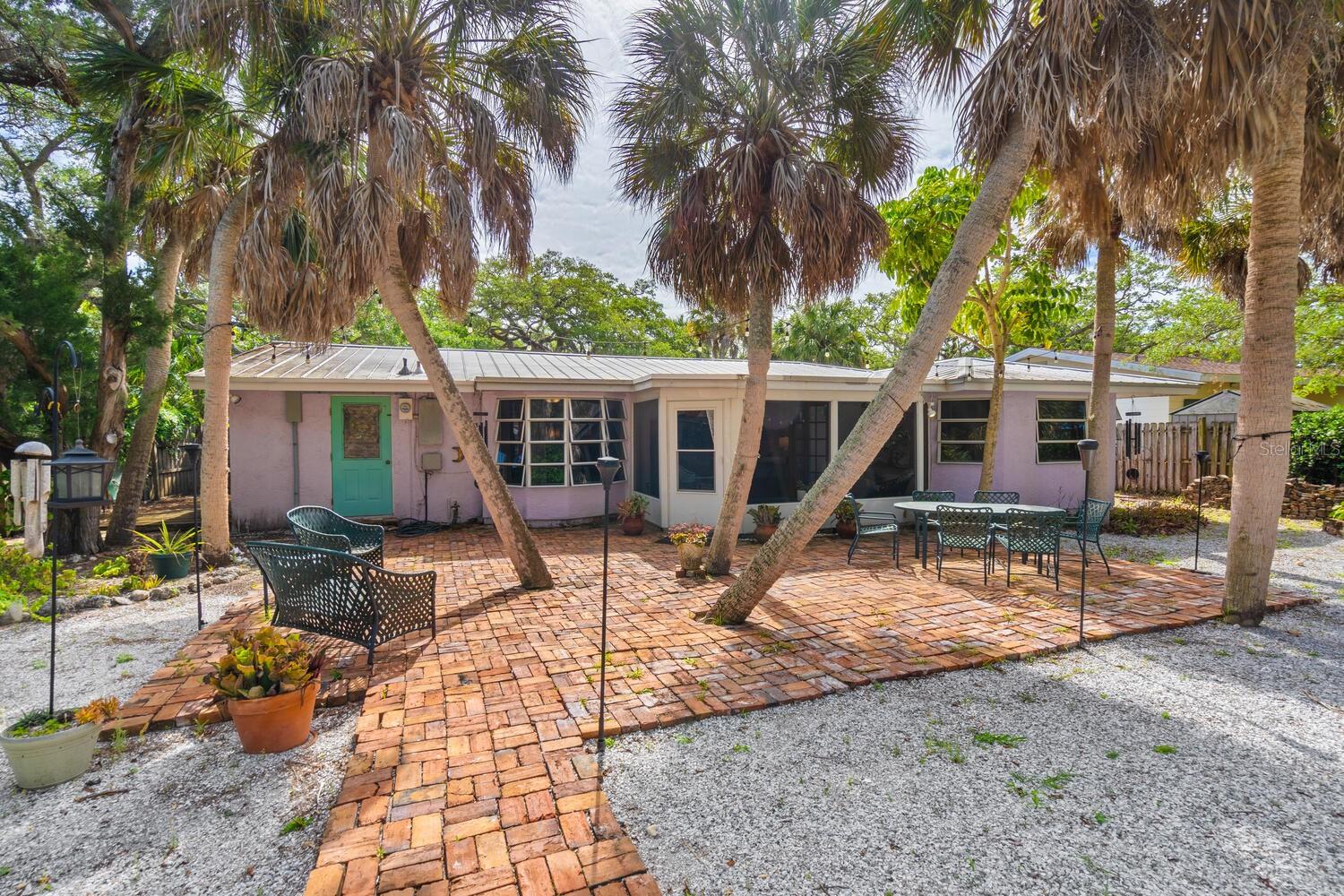 Quietly located along a canopy road of grand oaks, this 3 Bedroom, 3 Bath home is ready for your updating ideas. Imbued with the rich vibrance of Siesta Key, this particular location is a favorite for those who value its peaceful ambiance. Terracotta flooring runs throughout with an open Great room, Kitchen and Lanai; a harmonious connection between indoor and outdoor spaces. The open Kitchen features stainless steel appliances, complemented by a spacious bar top area ideal for hosting gatherings, alongside a convenient built-in desk space. Stepping into the primary suite reveals a welcoming sanctuary with double doors, two closets, dual sinks, and a luxurious tub accompanied by a separate shower. The third bedroom, cleverly designed with a split plan layout, features its own private back door entrance and a charming loft space within the room. The enchanting backyard oasis beckons with palm trees, a Chicago brick patio, and soothing gentle sea breezes. Featuring block construction and a metal roof, the property is also accessible via Sandy Beach Ave, offering plentiful additional parking and the potential for expansion and versatile access. Come and add your signature to this hidden jewel and make it your Siesta Key home.