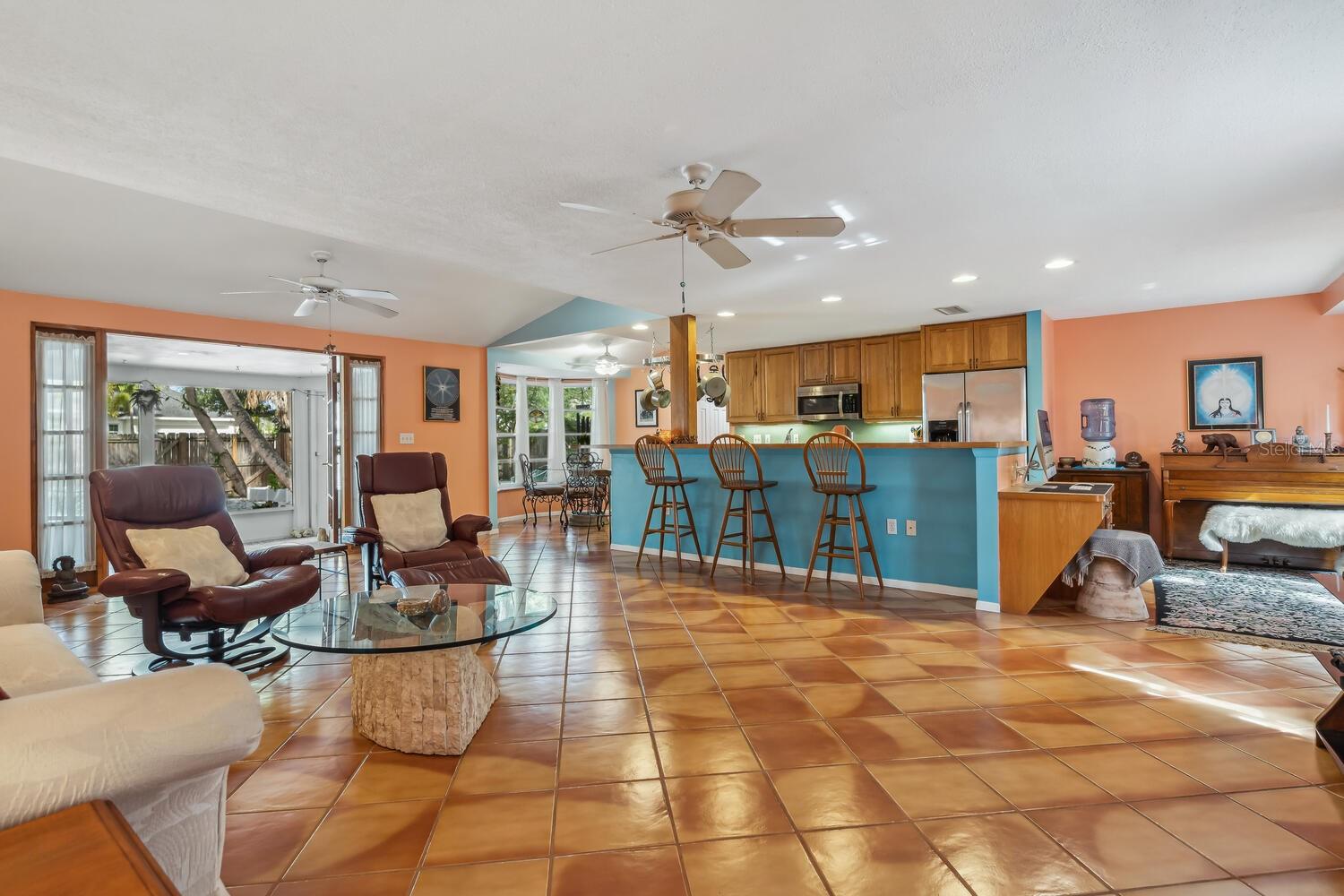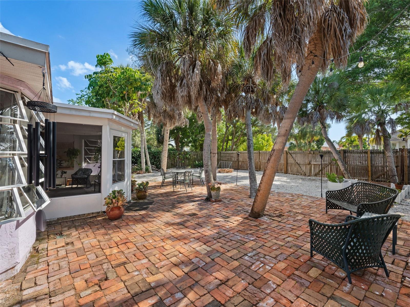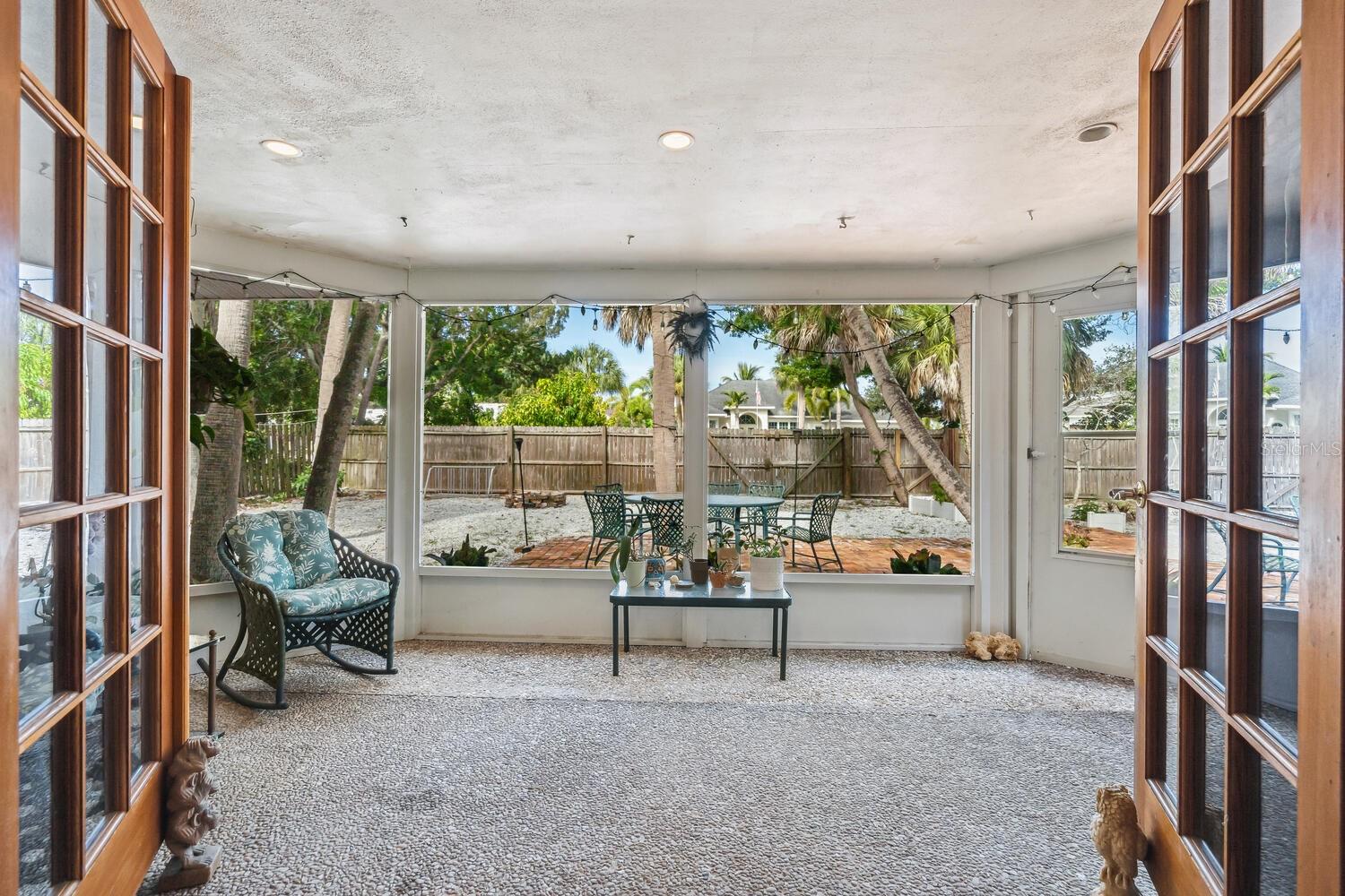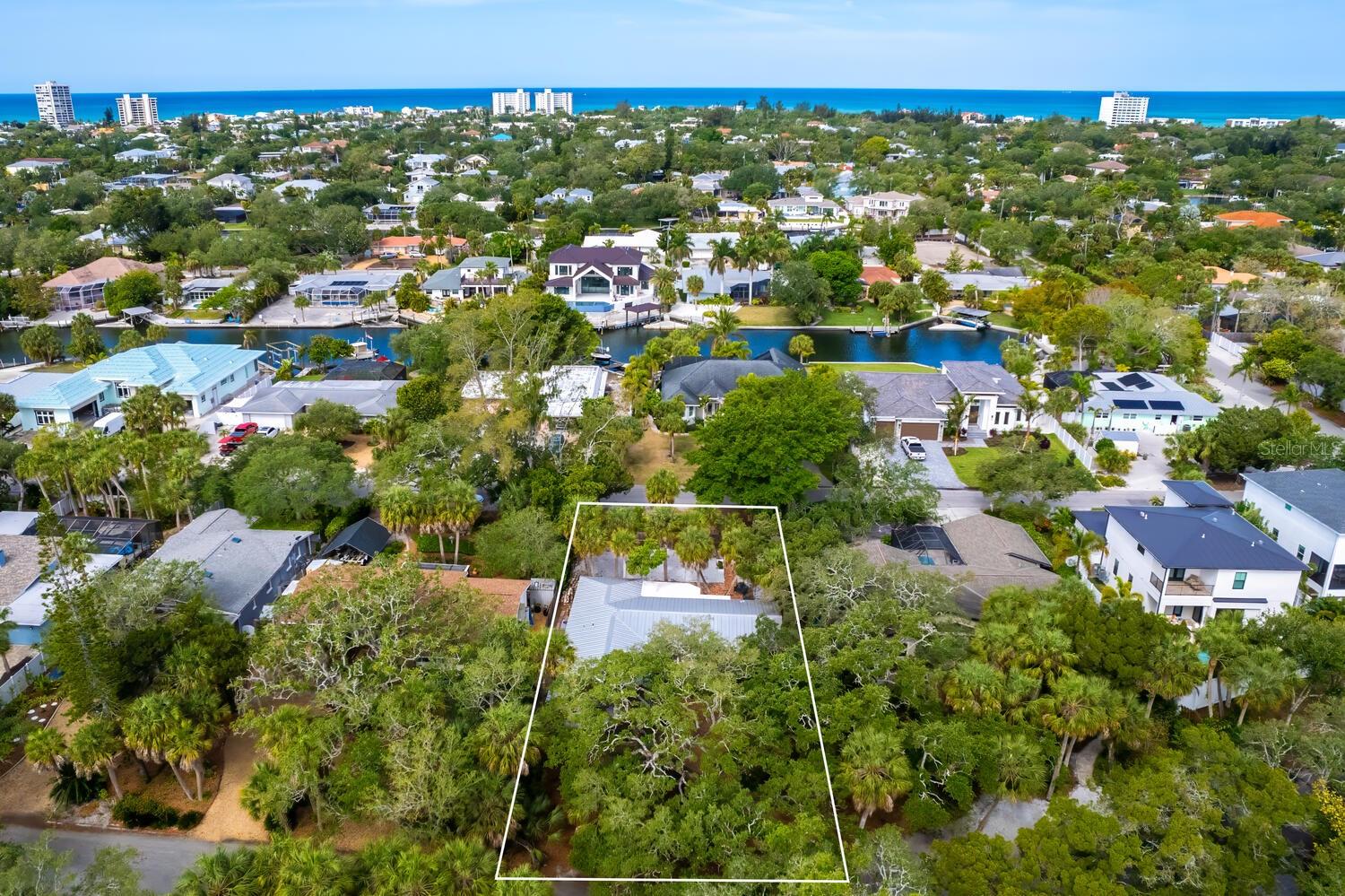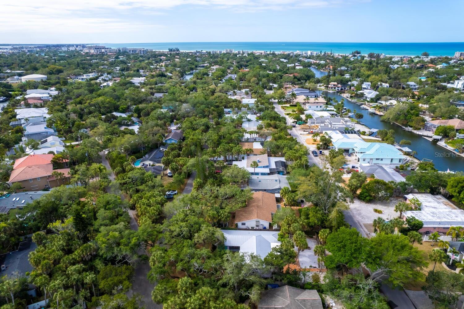 Quietly located along a canopy road of grand oaks, this 3 Bedroom, 3 Bath home is ready for your updating ideas. Imbued with the rich vibrance of Siesta Key, this particular location is a favorite for those who value its peaceful ambiance. Terracotta flooring runs throughout with an open Great room, Kitchen and Lanai; a harmonious connection between indoor and outdoor spaces. The open Kitchen features stainless steel appliances, complemented by a spacious bar top area ideal for hosting gatherings, alongside a convenient built-in desk space. Stepping into the primary suite reveals a welcoming sanctuary with double doors, two closets, dual sinks, and a luxurious tub accompanied by a separate shower. The third bedroom, cleverly designed with a split plan layout, features its own private back door entrance and a charming loft space within the room. The enchanting backyard oasis beckons with palm trees, a Chicago brick patio, and soothing gentle sea breezes. Featuring block construction and a metal roof, the property is also accessible via Sandy Beach Ave, offering plentiful additional parking and the potential for expansion and versatile access. Come and add your signature to this hidden jewel and make it your Siesta Key home.