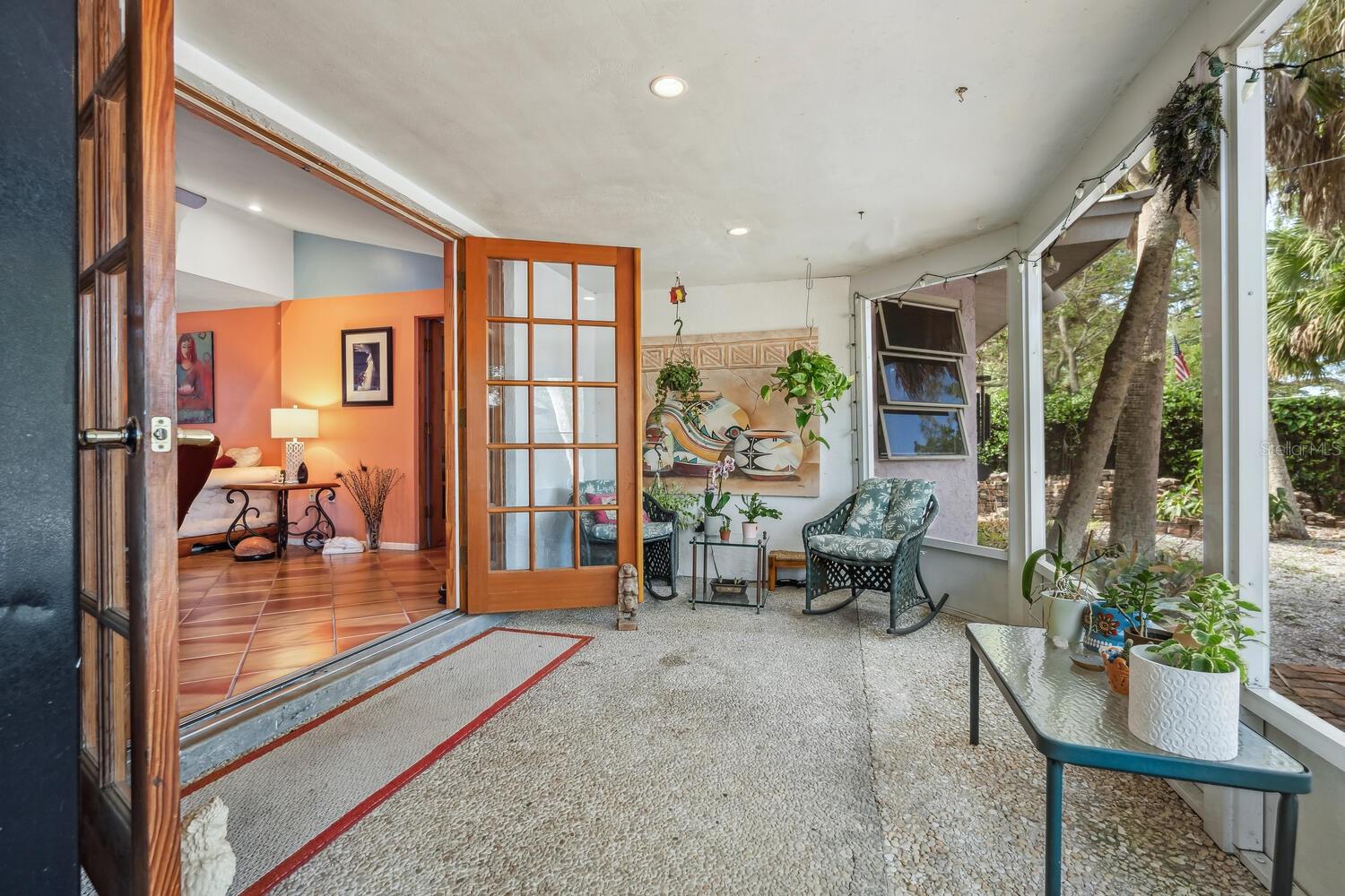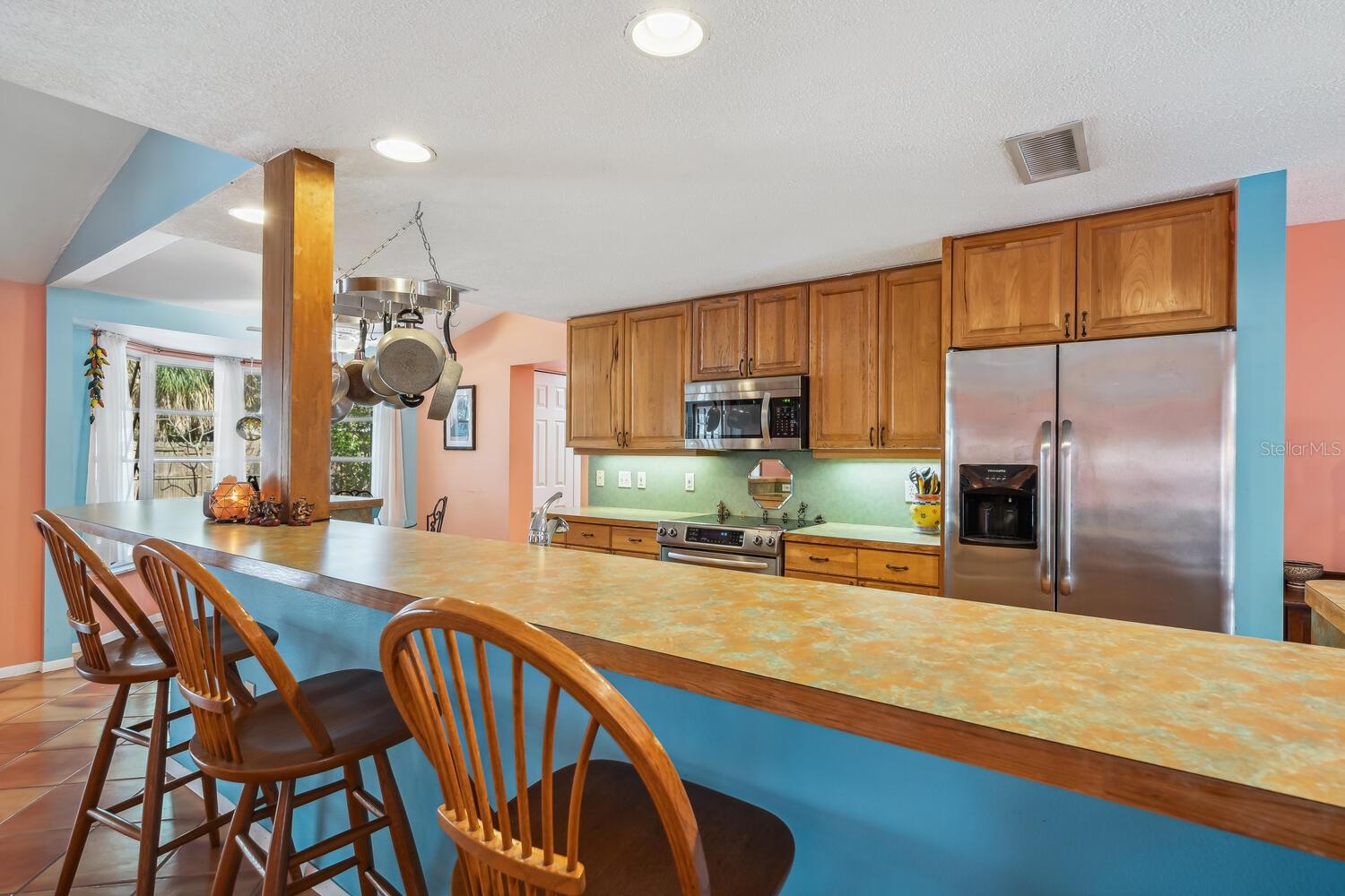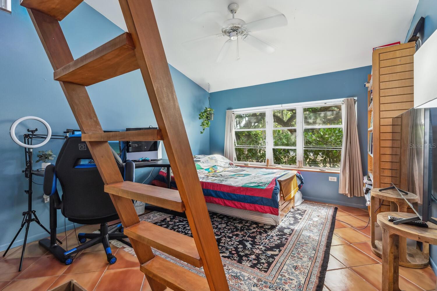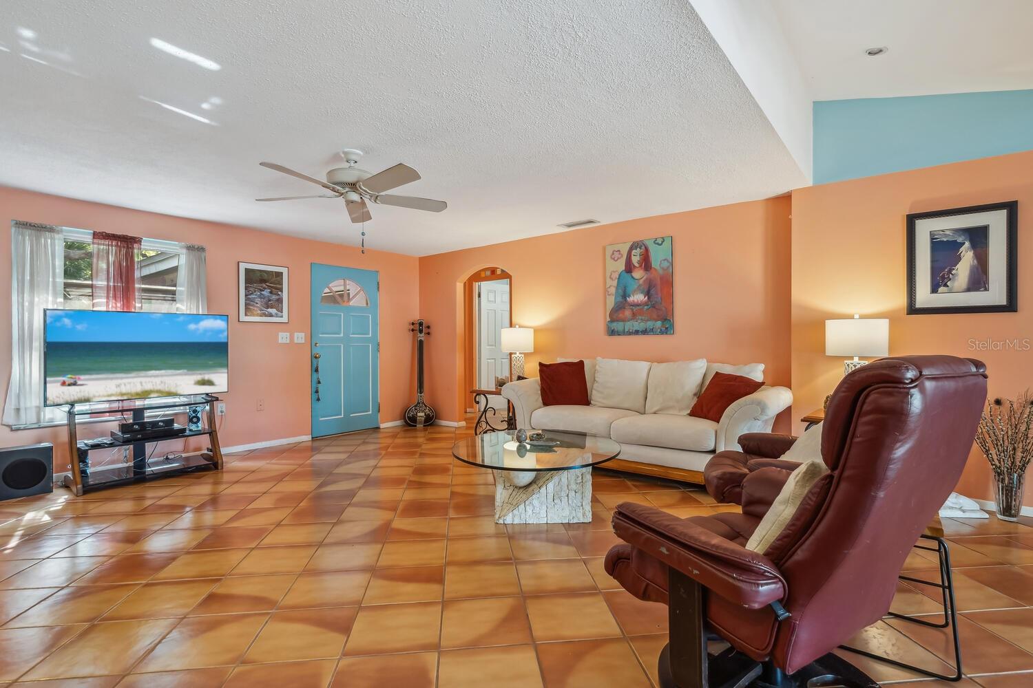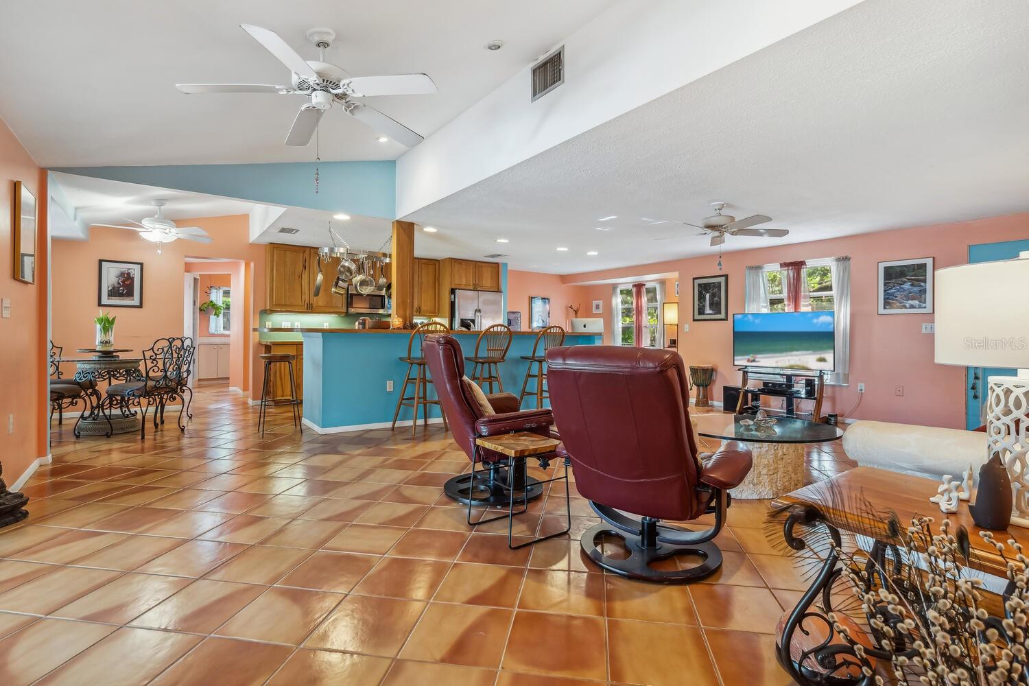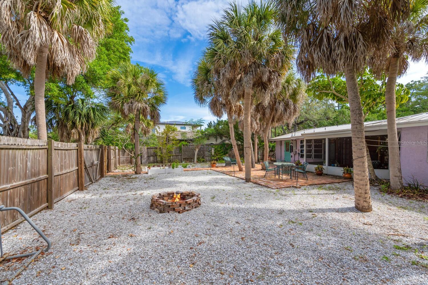 Quietly located along a canopy road of grand oaks, this 3 Bedroom, 3 Bath home is ready for your updating ideas. Imbued with the rich vibrance of Siesta Key, this particular location is a favorite for those who value its peaceful ambiance. Terracotta flooring runs throughout with an open Great room, Kitchen and Lanai; a harmonious connection between indoor and outdoor spaces. The open Kitchen features stainless steel appliances, complemented by a spacious bar top area ideal for hosting gatherings, alongside a convenient built-in desk space. Stepping into the primary suite reveals a welcoming sanctuary with double doors, two closets, dual sinks, and a luxurious tub accompanied by a separate shower. The third bedroom, cleverly designed with a split plan layout, features its own private back door entrance and a charming loft space within the room. The enchanting backyard oasis beckons with palm trees, a Chicago brick patio, and soothing gentle sea breezes. Featuring block construction and a metal roof, the property is also accessible via Sandy Beach Ave, offering plentiful additional parking and the potential for expansion and versatile access. Come and add your signature to this hidden jewel and make it your Siesta Key home.