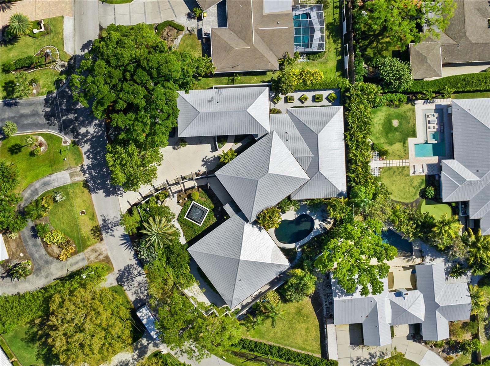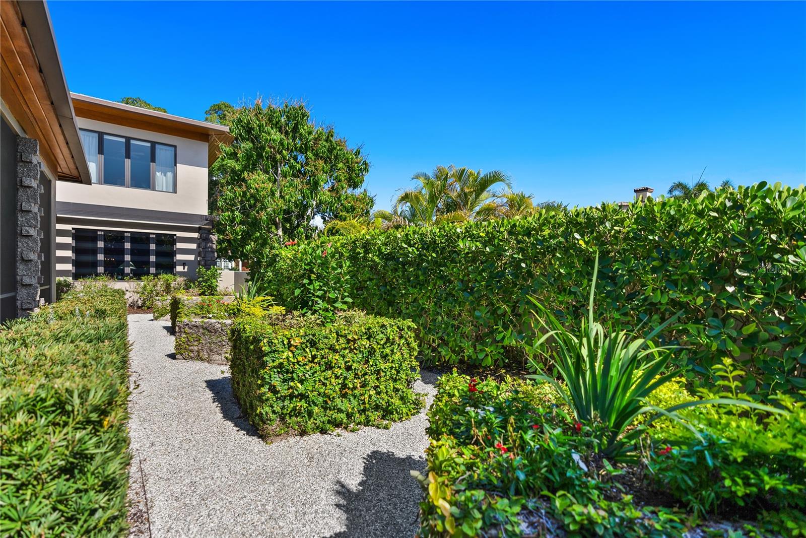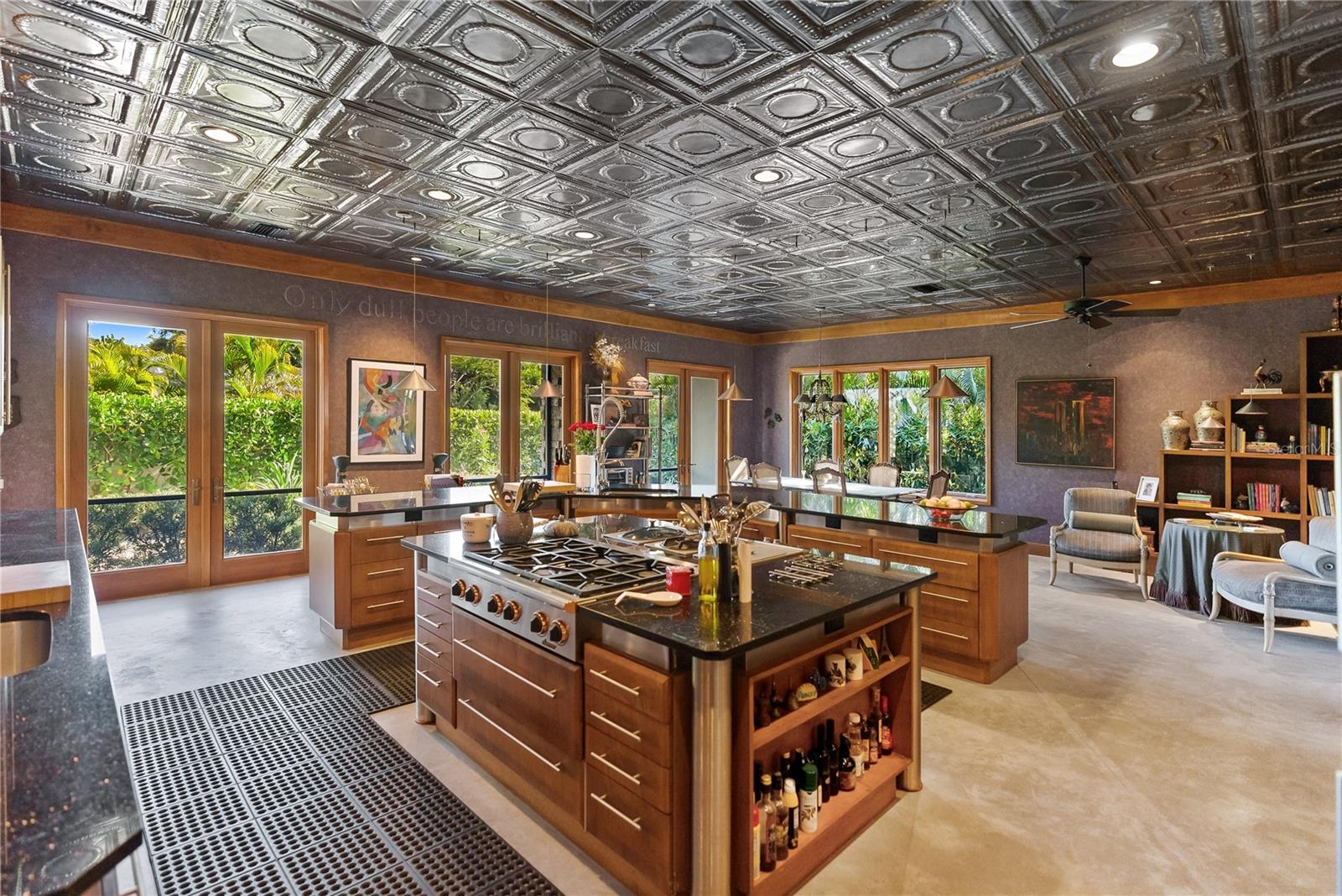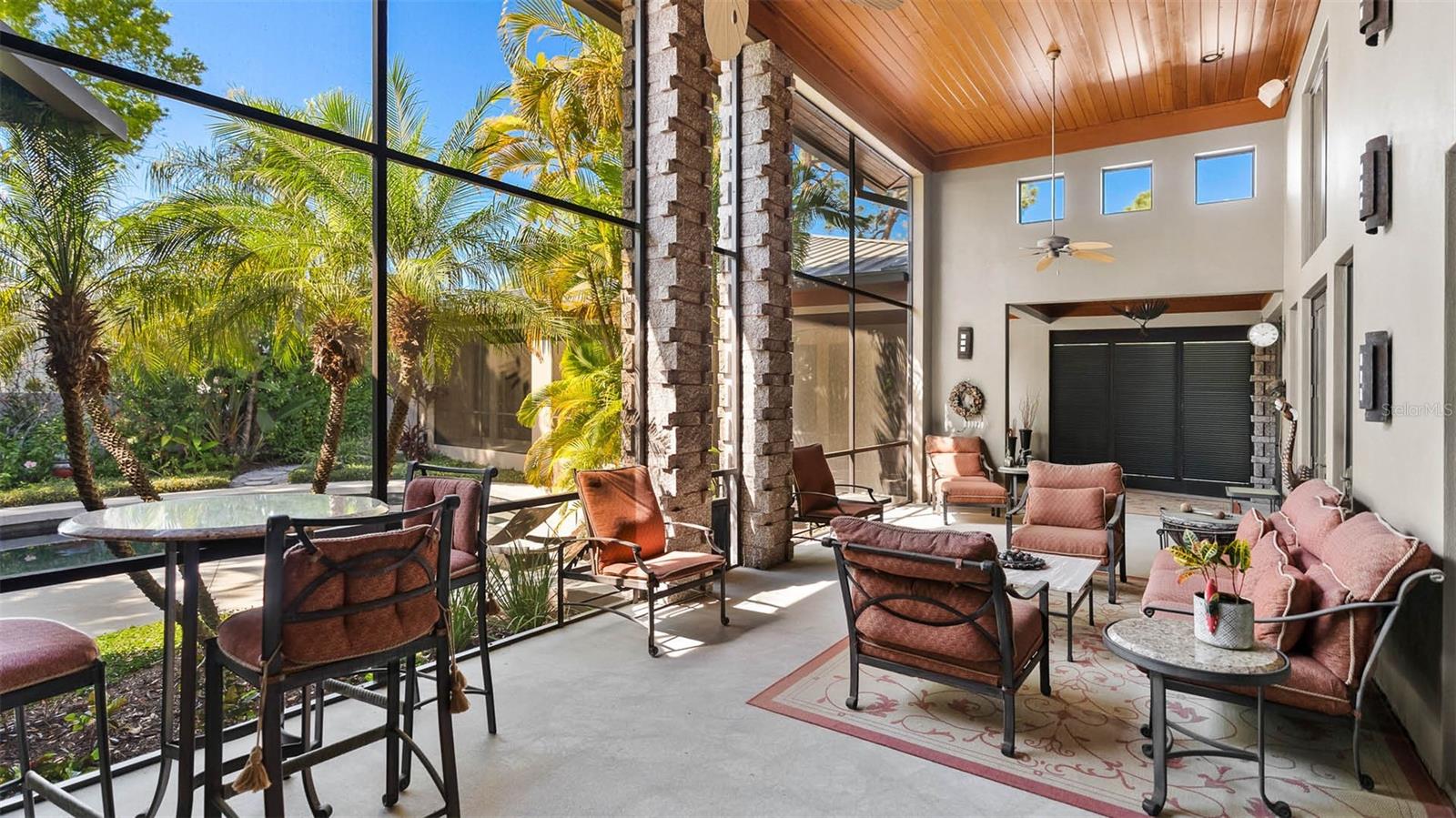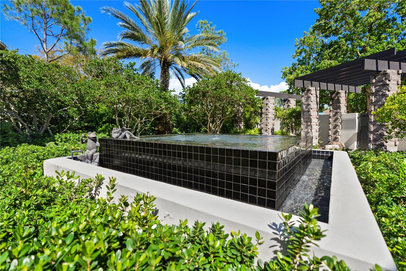This unique home is designed to assemble your family and friends, to share good food, and to enjoy the good life. Esteemed architect John Potvin imagined three separate buildings connected by covered lanais to provide complete privacy when desired, balanced with grand convivial spaces for connection that magnetically attract you to all the action when you want to socialize. The home exudes elegance, but also remains warm and approachable incorporating casual tropical elements with stone columns, metal pergolas, and concrete textures, ultimately resulting in a relaxed oasis like no other. A stucco wall surrounds the perimeter, providing exceptional privacy enabling you to unwind with the ambient sound of the fountain, while surrounded by luscious green foliage in a peaceful atmosphere.