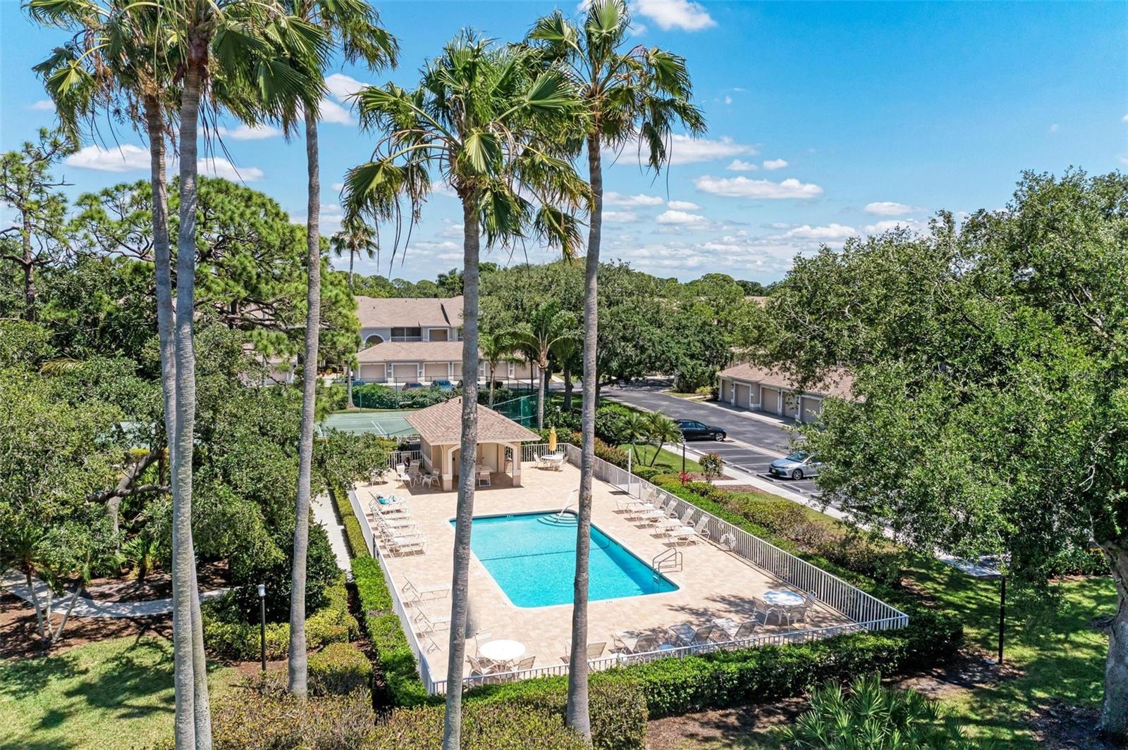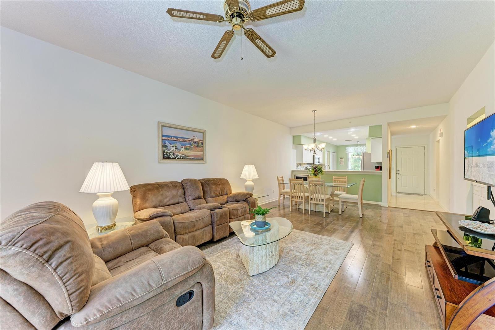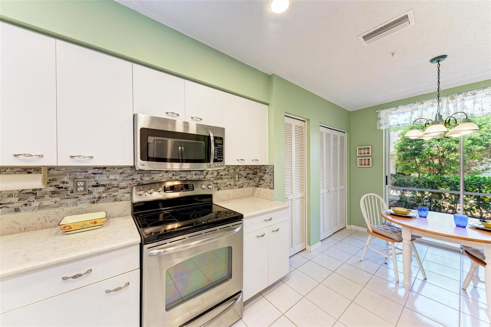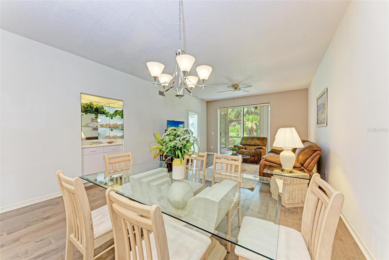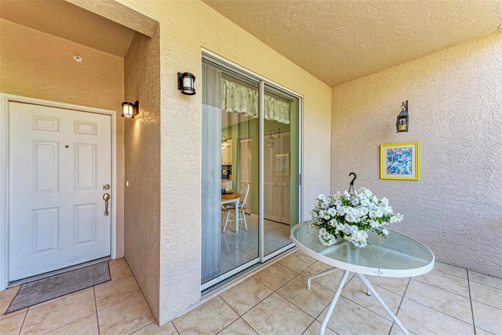 PRICE REDUCTION & READY FOR QUICK MOVE-IN! Ready for the right person, could be YOU! Offered Turn-Key. Experience the pinnacle of country club living at Stoneybrook Golf & Country Club. Enjoy the lifestyle and convenience you deserve in this ground-floor condo, complete with a bonus detached one-car garage conveniently located in front of your unit amidst lush landscaping and meticulously maintained grounds. Two covered private screened lanais, one at the front and one at the back, each with sliding glass doors to provide a tranquil retreat for seamless indoor/outdoor living. This remarkable condo is ideally situated just steps away from walking trails, a pool, tennis courts, and pickleball courts. Inside, discover a beautifully designed two-bedroom, two-bathroom split floorplan condo. The kitchen has been upgraded with Spanish Quartz Countertops, Stainless Steel Appliances, and NEW Recessed Lighting, along with convenient pull-out shelving. Start your day with a cup of coffee in the separate breakfast area/eat-in kitchen as you greet the morning. NEW engineered hardwood flooring enhances the living areas and bedrooms. Step into effortless entertainment in the expansive, luminous living space, seamlessly connected to a dining area and kitchen bar featuring a sleek built-in wine cooler. With panoramic windows offering stunning vistas of your private tropical haven, this inviting setting elevates every gathering into a memorable experience. The master suite is a haven of tranquility, with a bay window,, two walk-in closets, and a spacious bathroom with a double sink vanity and frameless glass shower door. The guest bedroom offers two twin beds in the front and is equally spacious, conveniently located next to the second bathroom. Additional highlights of this magnificent condo include a designated laundry room with a large front-load washer and dryer included, as well as a large storage closet. Newly painted color accents have been updated to evoke the Florida feel. Tasteful furnishings can be negotiated. (Master Bedroom is Virtually Staged) Enjoy access to a wealth of community amenities. Whether you're a golf enthusiast, tennis pro, or simply crave a vibrant community with abundant green space and exciting activities, Stoneybrook Golf & Country Club is the perfect place to call home. With a renowned Arthur Hills-designed 18-hole golf course, pro shop, fitness center, illuminated Har-Tru tennis courts, walking trails, bocce, pickleball, pool, spa, and a full-service restaurant offering both indoor and outdoor dining, you'll find everything you need right at your fingertips. Plus, this incredible community is situated adjacent to the picturesque Legacy Trail and just moments away from Nokomis and Siesta Beaches, Costco, shopping, and a wide array of fantastic restaurants. Call today to schedule a private showing and make your dreams a reality today.