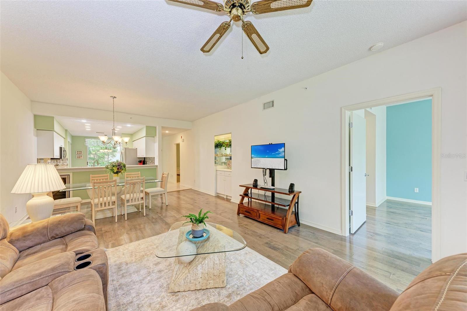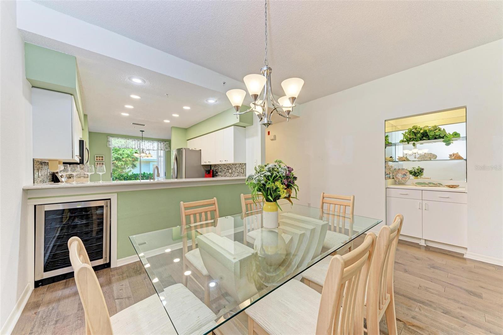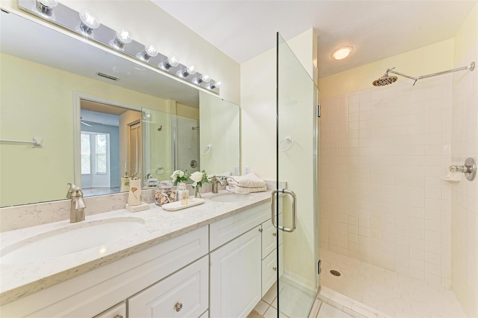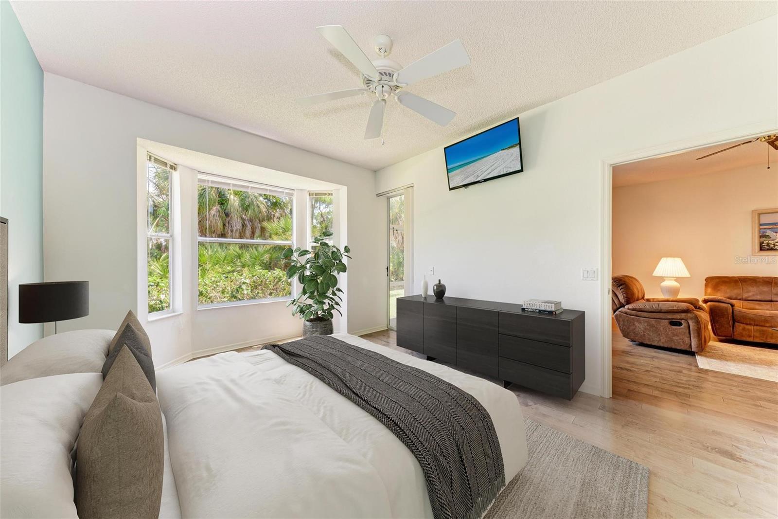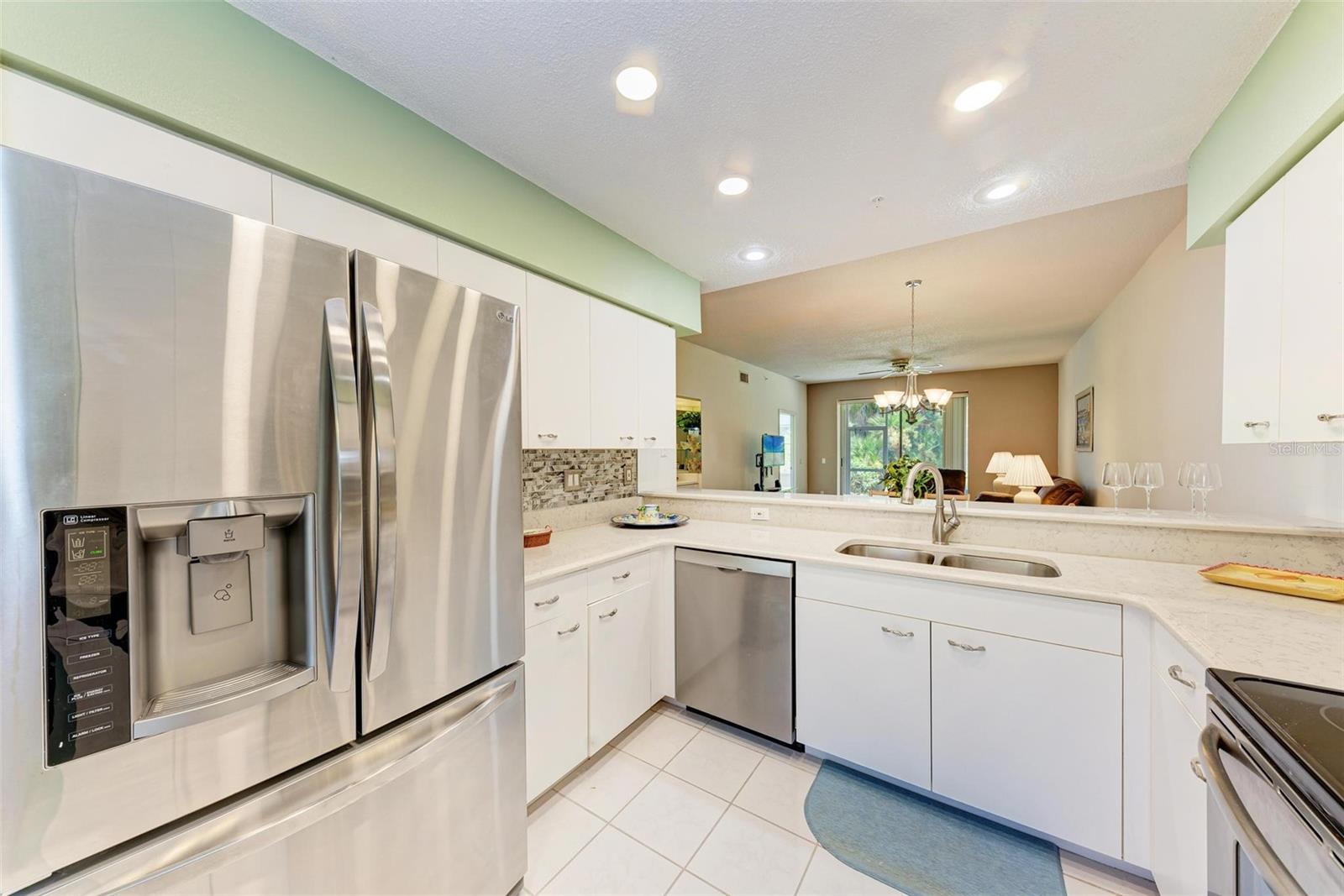 PRICE REDUCTION & READY FOR QUICK MOVE-IN! Ready for the right person, could be YOU! Offered Turn-Key. Experience the pinnacle of country club living at Stoneybrook Golf & Country Club. Enjoy the lifestyle and convenience you deserve in this ground-floor condo, complete with a bonus detached one-car garage conveniently located in front of your unit amidst lush landscaping and meticulously maintained grounds. Two covered private screened lanais, one at the front and one at the back, each with sliding glass doors to provide a tranquil retreat for seamless indoor/outdoor living. This remarkable condo is ideally situated just steps away from walking trails, a pool, tennis courts, and pickleball courts. Inside, discover a beautifully designed two-bedroom, two-bathroom split floorplan condo. The kitchen has been upgraded with Spanish Quartz Countertops, Stainless Steel Appliances, and NEW Recessed Lighting, along with convenient pull-out shelving. Start your day with a cup of coffee in the separate breakfast area/eat-in kitchen as you greet the morning. NEW engineered hardwood flooring enhances the living areas and bedrooms. Step into effortless entertainment in the expansive, luminous living space, seamlessly connected to a dining area and kitchen bar featuring a sleek built-in wine cooler. With panoramic windows offering stunning vistas of your private tropical haven, this inviting setting elevates every gathering into a memorable experience. The master suite is a haven of tranquility, with a bay window,, two walk-in closets, and a spacious bathroom with a double sink vanity and frameless glass shower door. The guest bedroom offers two twin beds in the front and is equally spacious, conveniently located next to the second bathroom. Additional highlights of this magnificent condo include a designated laundry room with a large front-load washer and dryer included, as well as a large storage closet. Newly painted color accents have been updated to evoke the Florida feel. Tasteful furnishings can be negotiated. (Master Bedroom is Virtually Staged) Enjoy access to a wealth of community amenities. Whether you're a golf enthusiast, tennis pro, or simply crave a vibrant community with abundant green space and exciting activities, Stoneybrook Golf & Country Club is the perfect place to call home. With a renowned Arthur Hills-designed 18-hole golf course, pro shop, fitness center, illuminated Har-Tru tennis courts, walking trails, bocce, pickleball, pool, spa, and a full-service restaurant offering both indoor and outdoor dining, you'll find everything you need right at your fingertips. Plus, this incredible community is situated adjacent to the picturesque Legacy Trail and just moments away from Nokomis and Siesta Beaches, Costco, shopping, and a wide array of fantastic restaurants. Call today to schedule a private showing and make your dreams a reality today.