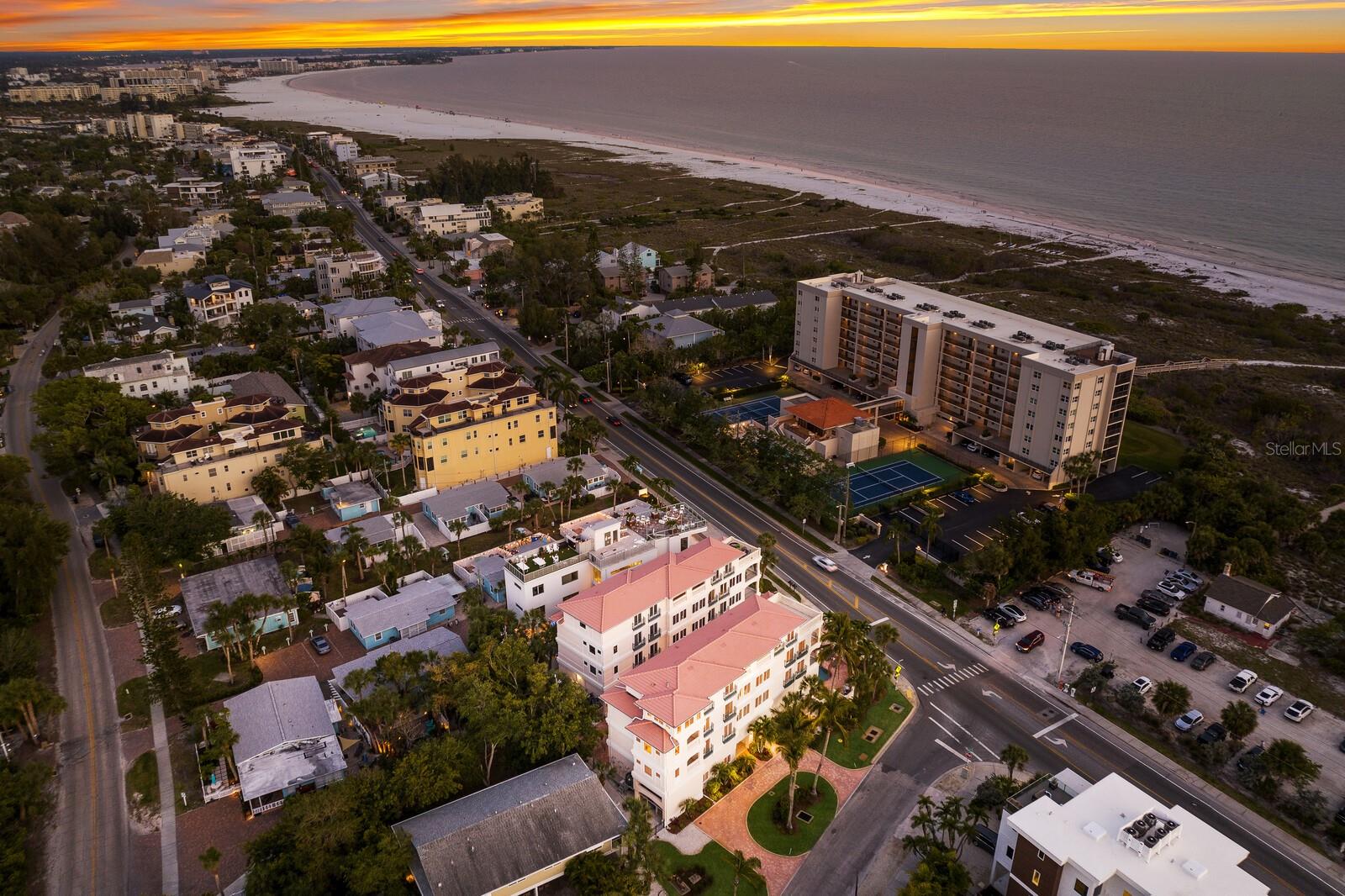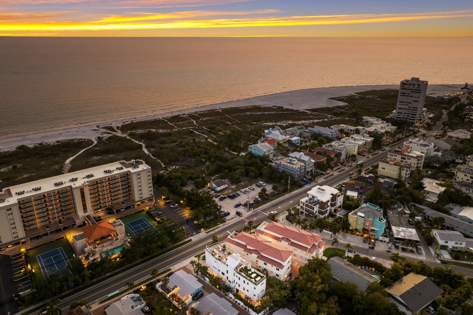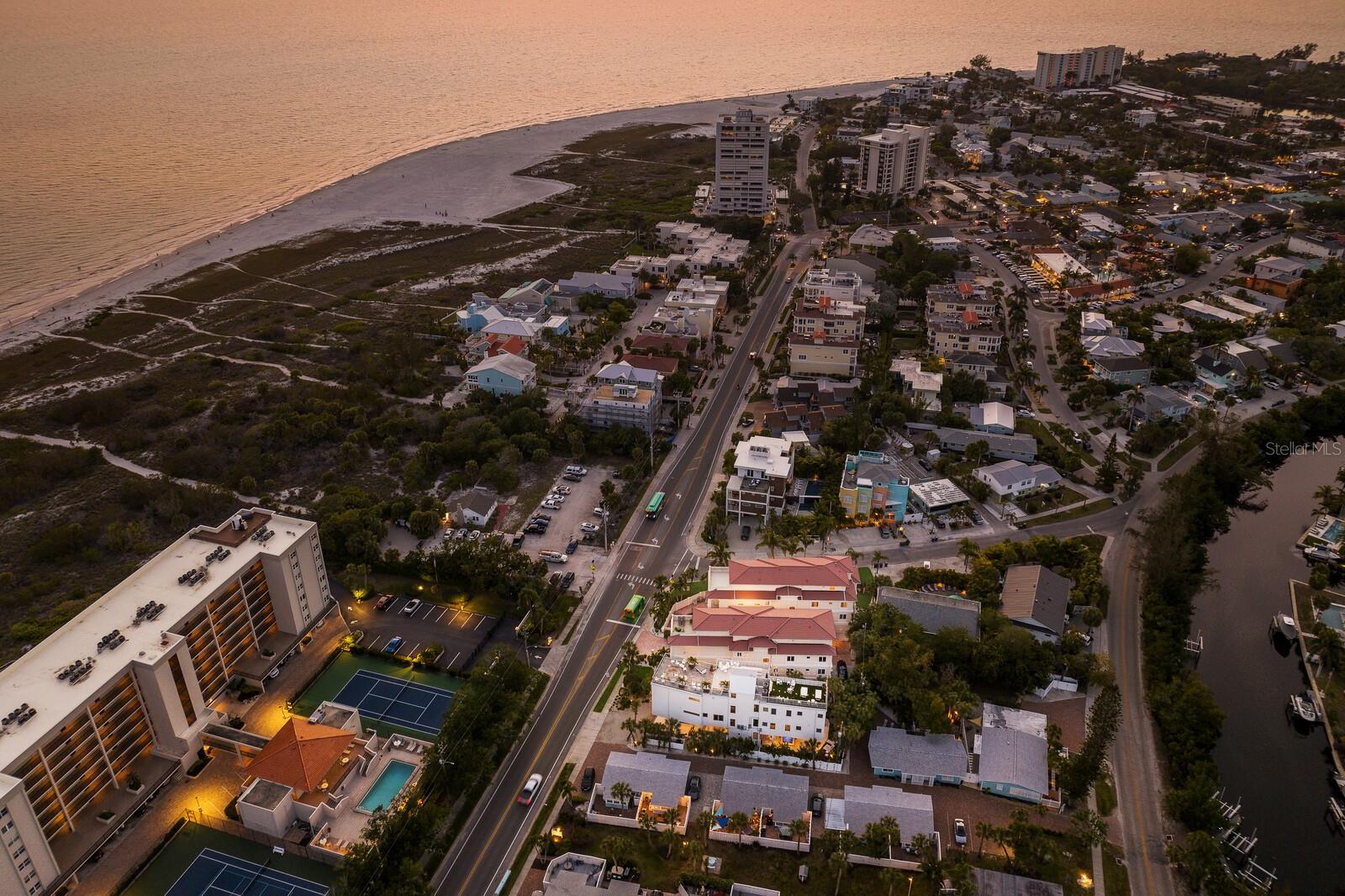 One or more photo(s) has been virtually staged. Nestled in the heart of Siesta Key village, this breathtaking two story penthouse offers a lavish retreat boasting 4,646 square feet of luxurious living space. With four opulent bedrooms, this residence provides ample space for relaxation and entertainment .As you step inside, you're greeted by an expansive interior adorned with elegant finishes and meticulous attention to detail. The top floor of the unit features and amazing primary suite with gas fireplace and a huge bonus room with a wet bar and immense patio, offering panoramic views of the Gulf of Mexico and the pristine beach below. Imagine savoring the vibrant hues of sunsets casting their golden glow over the tranquil waters from the comfort of your own private oasis. This exclusive residence boasts direct beach access, allowing you to indulge in the laid-back coastal lifestyle effortlessly. Just steps away from the sugary sands, you can immerse yourself in the warm embrace of the sun and the soothing sounds of the waves. For those seeking the perfect blend of convenience and leisure, Siesta Village's charming shops and delectable dining options are within easy reach. Whether you're strolling along the quaint streets or savoring a delicious meal at a local restaurant, the vibrant energy of the village awaits. A truly unique six-car garage provides ample space for your vehicles and watercraft. Additionally, residents can enjoy the community pool, perfect for unwinding with a refreshing swim amidst lush tropical surroundings. Convenience meets sophistication with a private elevator whisking you to the top two floors of the building, where serenity and panoramic views await. Whether you're hosting a soirée or simply enjoying a quiet evening at home, this condo offers the perfect backdrop for every occasion.