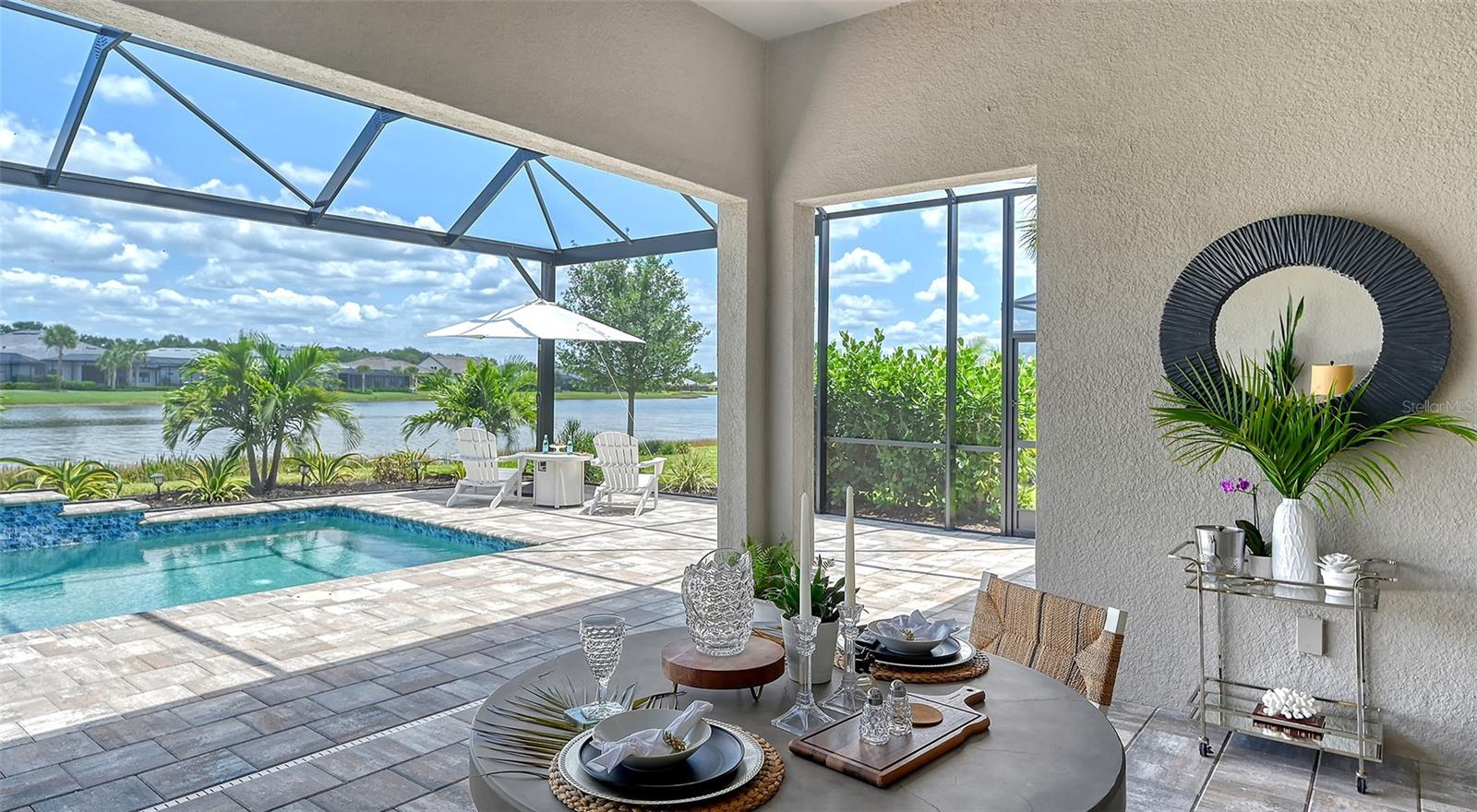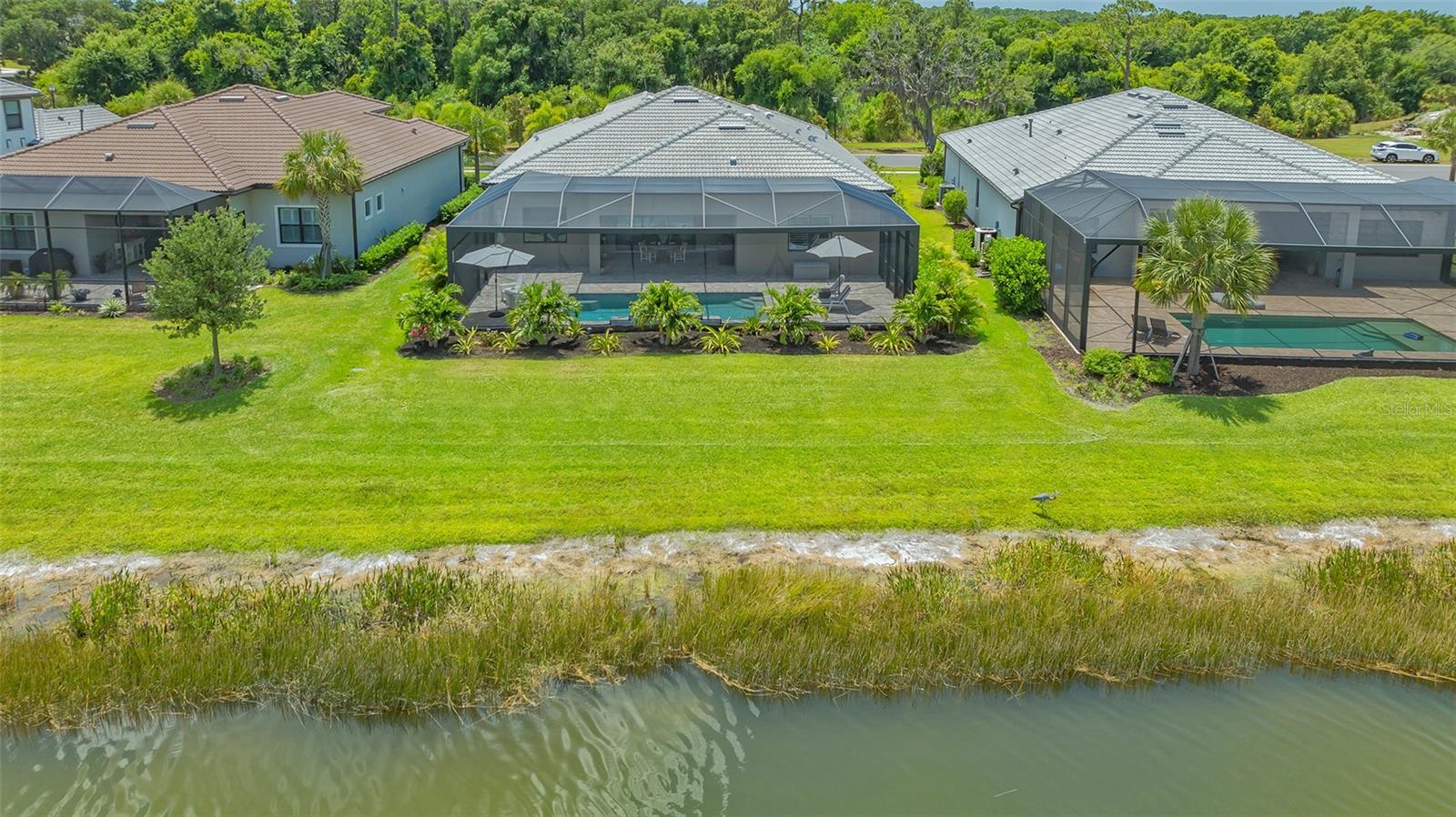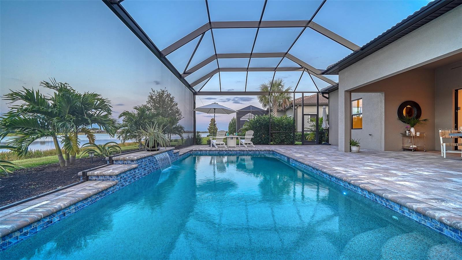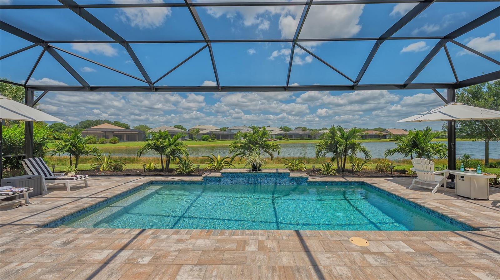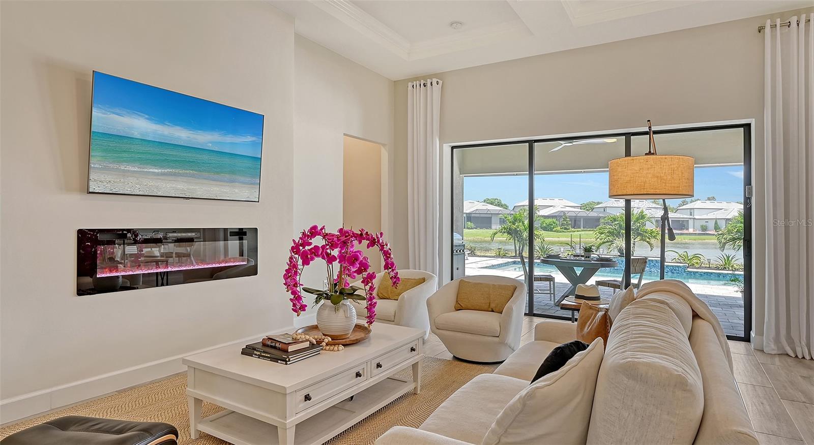 Welcome to the coveted Florida lifestyle at Shoreview Community at Waterside Place. Off the beaten path of the main entrance, 716 Sigsbee Loop is uniquely nestled on the peaceful banks of gently flowing Middle Teal Lake, and at the same time graciously positioned opposite one of Shoreview’s beautiful nature preserves. Custom 3 bedrooms, 3 full bathrooms – This 2021 “Pinnacle” model shows like a new home! Step inside to a spacious open floor plan. Fully tiled throughout, and using a neutral palate, this light and airy home exudes a relaxed, casual elegance. The Pinnacle features a 12’ coffered ceiling gathering room, a dining area with opulent palm and water views, and a well-appointed kitchen - where all 3 meet, for the perfect entertainment area! The kitchen boasts white, stacked cabinets with glass doors, upgraded KitchenAid appliances, a massive island, and large custom walk-in pantry. Overlooking Middle Teal Lake are triple sliding glass doors opening from the gathering room, which have a built-in linear fireplace. Enjoy the panoramic view from the lovely partially covered open lanai, overlooking the sparkling and lit saltwater pool and waterfall. The Primary owner’s suite, with a 12’ ceiling tray, overlooks the lake and pool, also has an extended shower, private linen closet, private en-suite bath and expansive custom walk-in closet. Two additional bedrooms have walk-in closets, one with en-suite bath and the study/flex room is off the foyer. Enter a finished laundry room featuring a stainless sink, custom built-ins and a sliding barn door with easy access to the 3-car air-conditioned and epoxied garage. Shoreview is a maintenance free community, so your lawn-care is included in your HOA as well as ALL the amenities here; clubhouse, tennis, pickleball, fitness center, kayak launch and MORE! Be sure to ask for the home and community features sheet. Bike, golf cart, or take Shoreviews Water Taxi to breathtaking sunsets minutes away at Waterside Plaza on Kingfisher Lake. Shoreview is conveniently located near shopping, dining, great schools, beaches and Sarasota Int’l Airport, making it one of Sarasota’s most sought after, new neighborhoods. Call for your personal tour today!