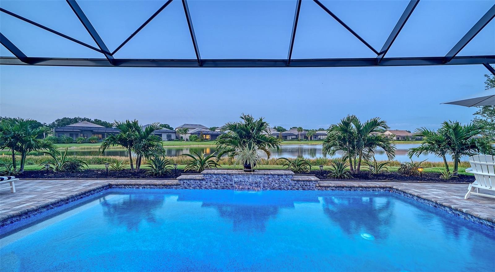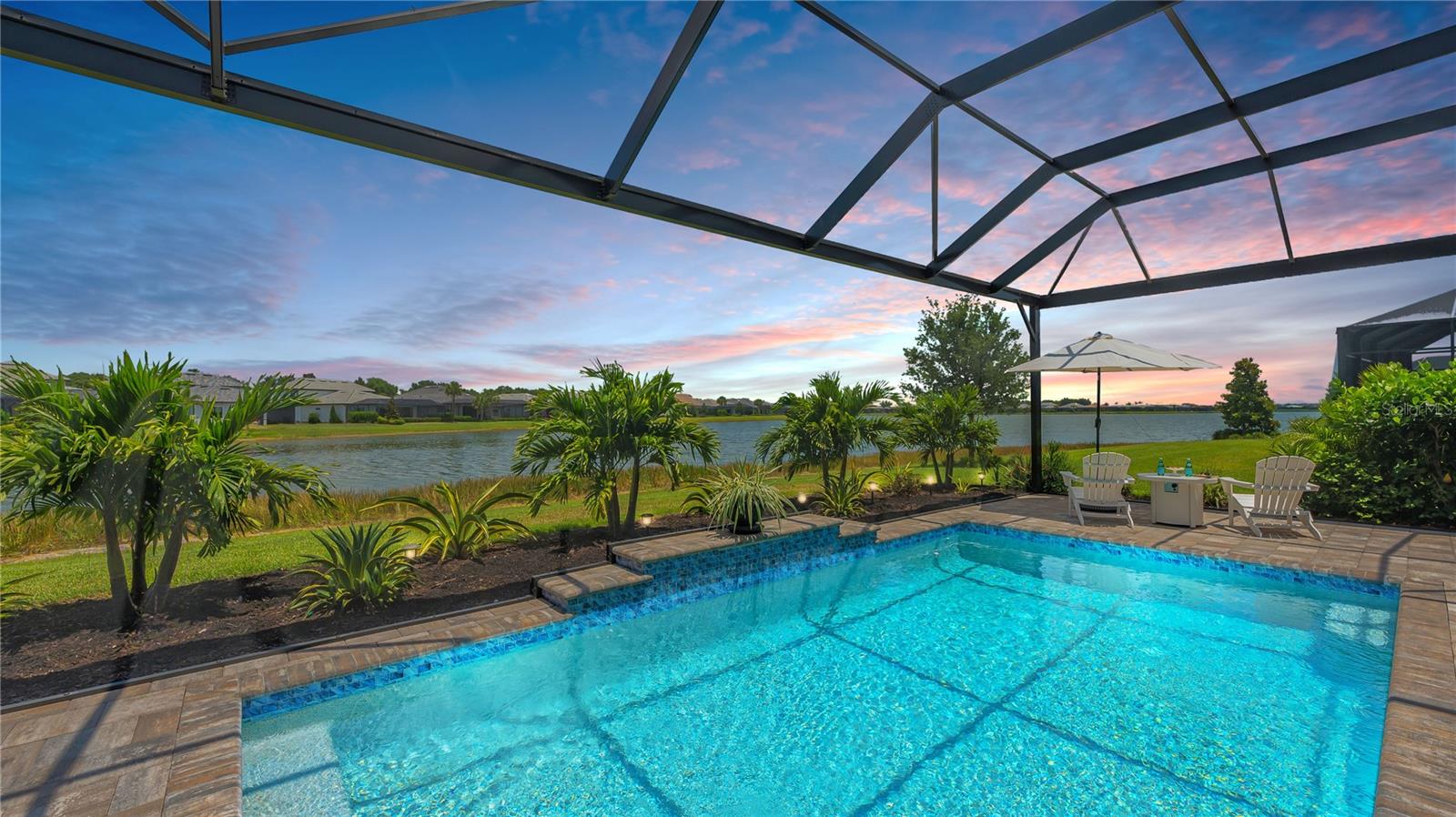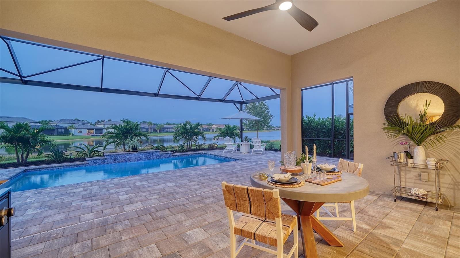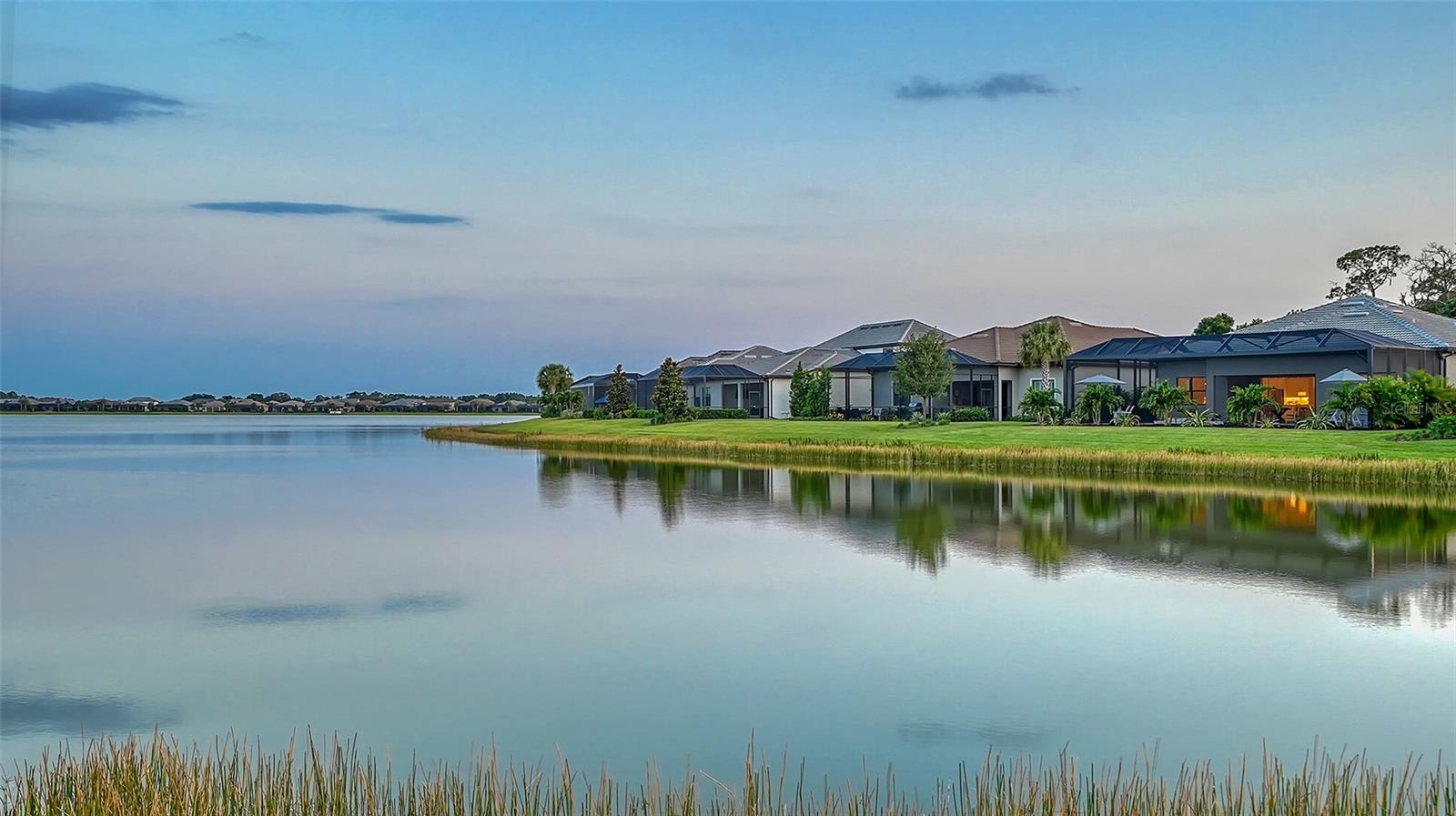 Welcome to the coveted Florida lifestyle at Shoreview Community at Waterside Place. Off the beaten path of the main entrance, 716 Sigsbee Loop is uniquely nestled on the peaceful banks of gently flowing Middle Teal Lake, and at the same time graciously positioned opposite one of Shoreview’s beautiful nature preserves. Custom 3 bedrooms, 3 full bathrooms – This 2021 “Pinnacle” model shows like a new home! Step inside to a spacious open floor plan. Fully tiled throughout, and using a neutral palate, this light and airy home exudes a relaxed, casual elegance. The Pinnacle features a 12’ coffered ceiling gathering room, a dining area with opulent palm and water views, and a well-appointed kitchen - where all 3 meet, for the perfect entertainment area! The kitchen boasts white, stacked cabinets with glass doors, upgraded KitchenAid appliances, a massive island, and large custom walk-in pantry. Overlooking Middle Teal Lake are triple sliding glass doors opening from the gathering room, which have a built-in linear fireplace. Enjoy the panoramic view from the lovely partially covered open lanai, overlooking the sparkling and lit saltwater pool and waterfall. The Primary owner’s suite, with a 12’ ceiling tray, overlooks the lake and pool, also has an extended shower, private linen closet, private en-suite bath and expansive custom walk-in closet. Two additional bedrooms have walk-in closets, one with en-suite bath and the study/flex room is off the foyer. Enter a finished laundry room featuring a stainless sink, custom built-ins and a sliding barn door with easy access to the 3-car air-conditioned and epoxied garage. Shoreview is a maintenance free community, so your lawn-care is included in your HOA as well as ALL the amenities here; clubhouse, tennis, pickleball, fitness center, kayak launch and MORE! Be sure to ask for the home and community features sheet. Bike, golf cart, or take Shoreviews Water Taxi to breathtaking sunsets minutes away at Waterside Plaza on Kingfisher Lake. Shoreview is conveniently located near shopping, dining, great schools, beaches and Sarasota Int’l Airport, making it one of Sarasota’s most sought after, new neighborhoods. Call for your personal tour today!