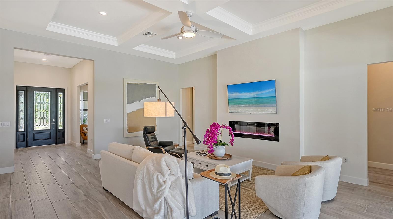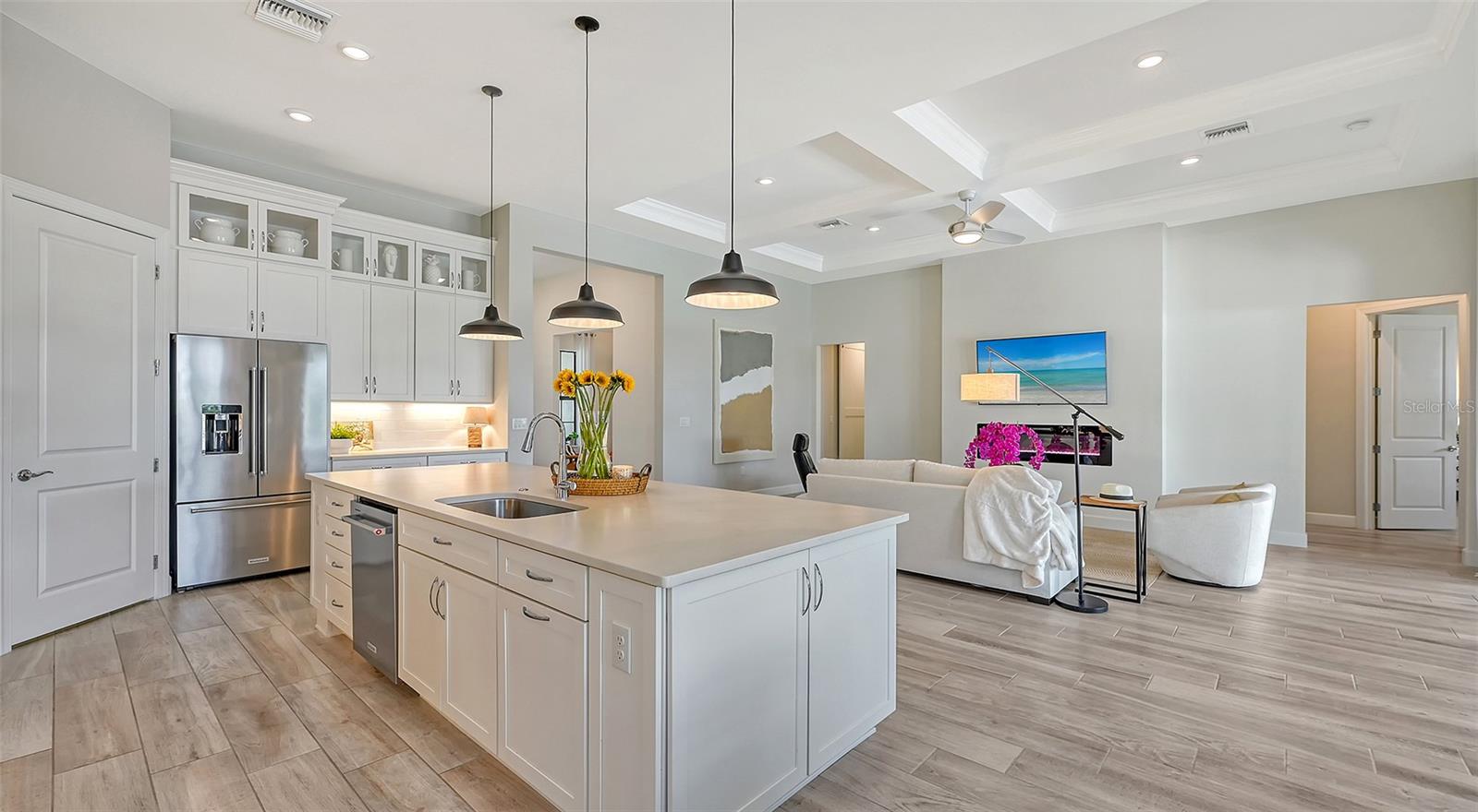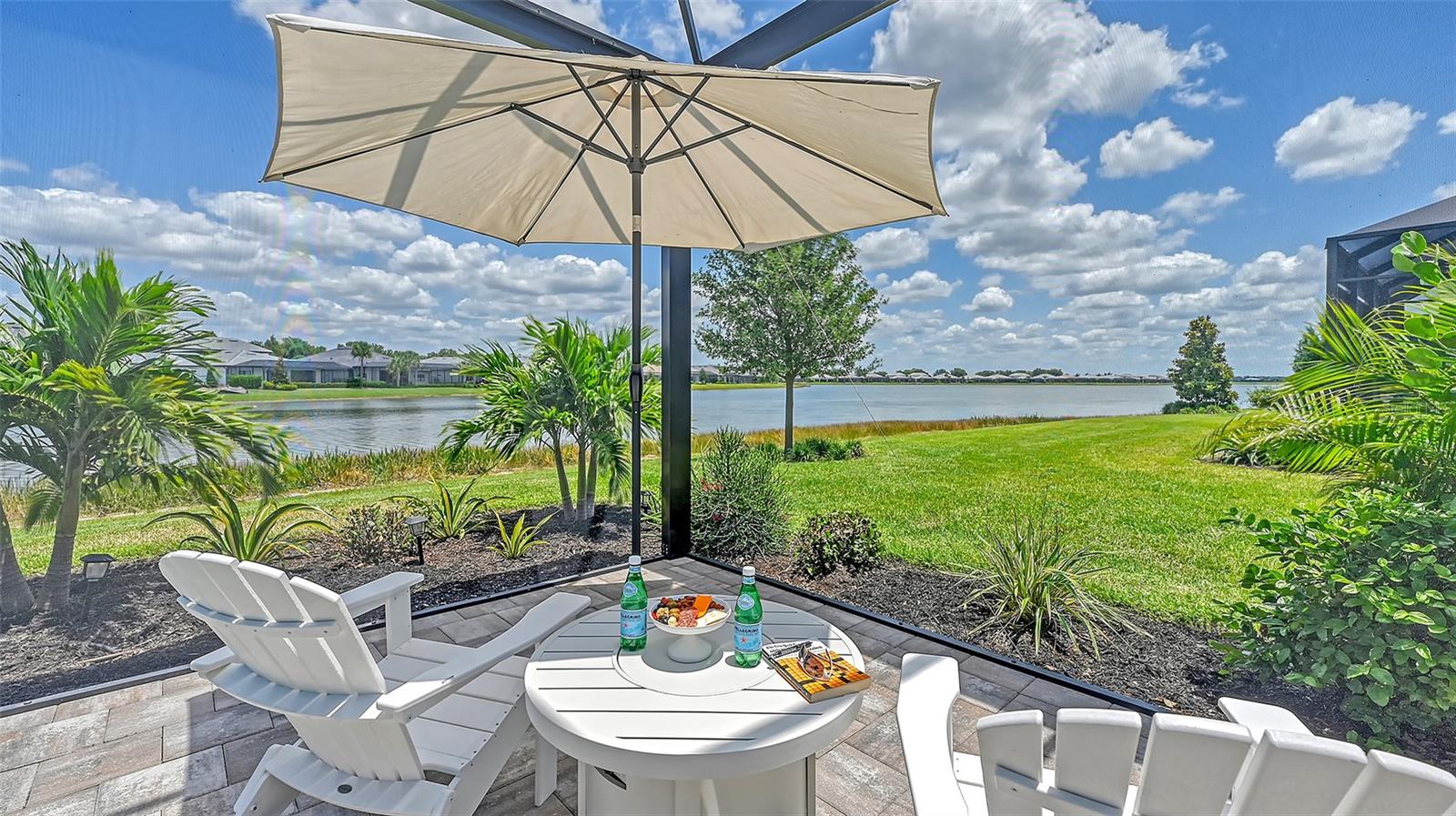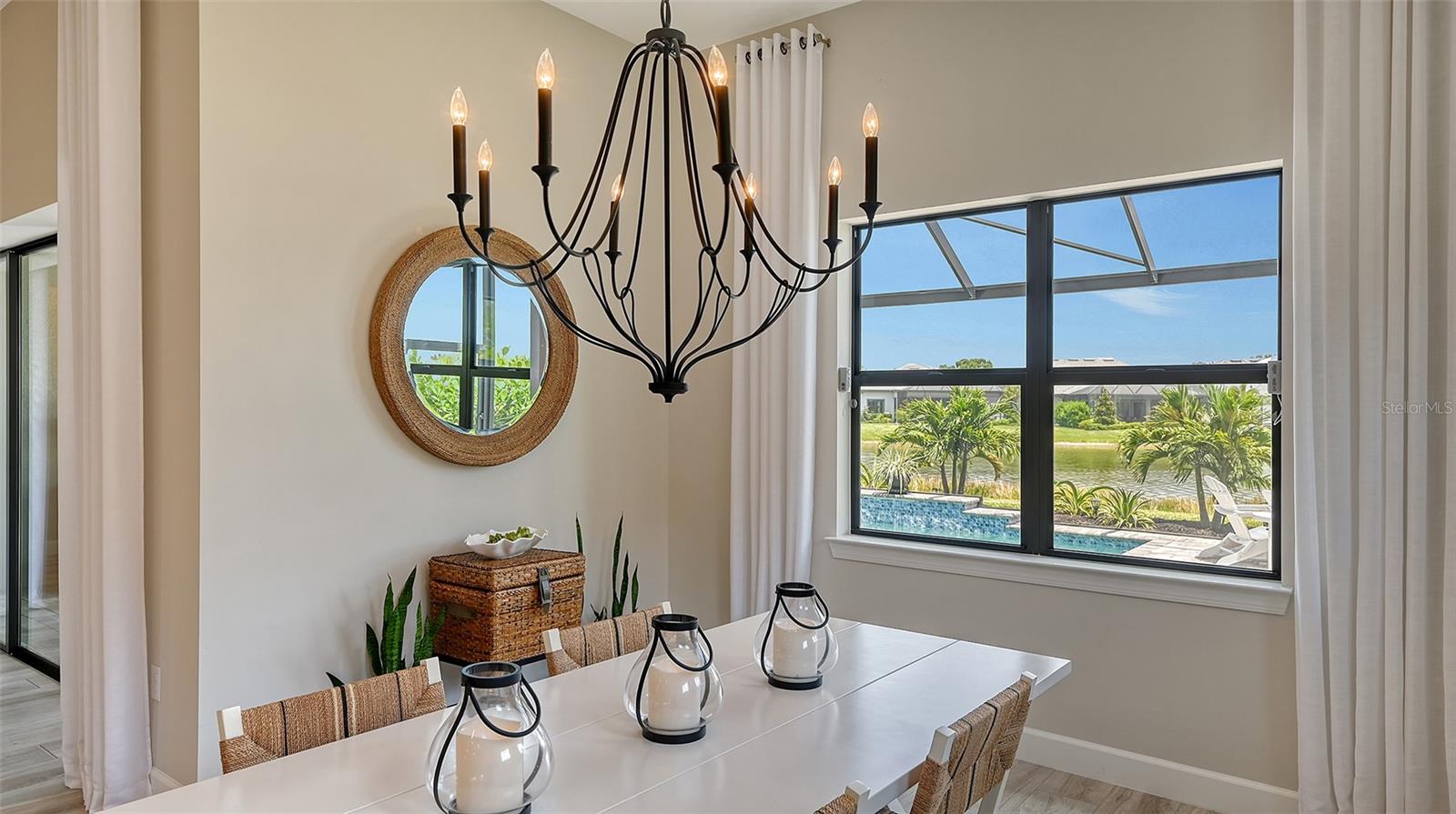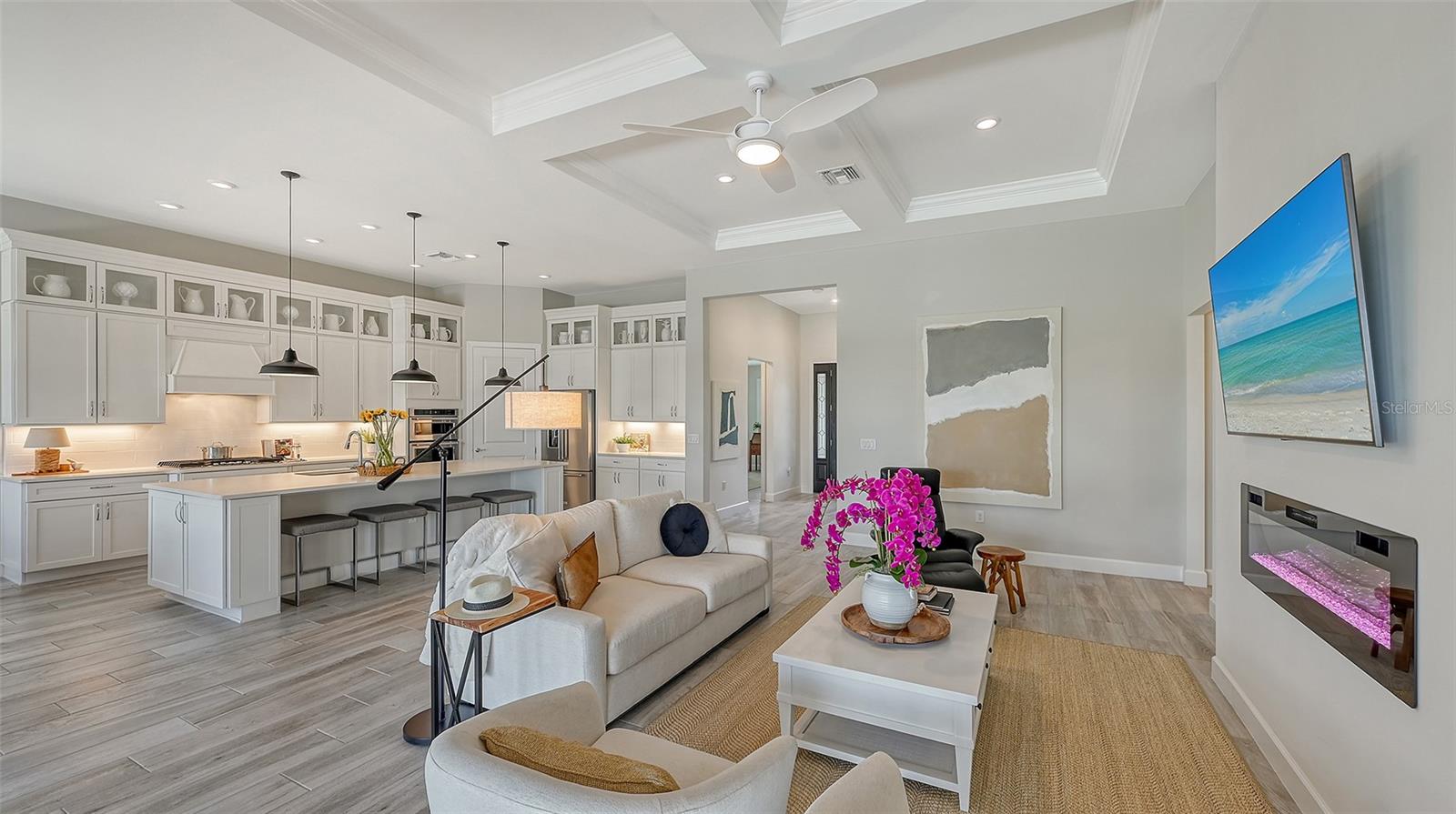 Welcome to the coveted Florida lifestyle at Shoreview Community at Waterside Place. Off the beaten path of the main entrance, 716 Sigsbee Loop is uniquely nestled on the peaceful banks of gently flowing Middle Teal Lake, and at the same time graciously positioned opposite one of Shoreview’s beautiful nature preserves. Custom 3 bedrooms, 3 full bathrooms – This 2021 “Pinnacle” model shows like a new home! Step inside to a spacious open floor plan. Fully tiled throughout, and using a neutral palate, this light and airy home exudes a relaxed, casual elegance. The Pinnacle features a 12’ coffered ceiling gathering room, a dining area with opulent palm and water views, and a well-appointed kitchen - where all 3 meet, for the perfect entertainment area! The kitchen boasts white, stacked cabinets with glass doors, upgraded KitchenAid appliances, a massive island, and large custom walk-in pantry. Overlooking Middle Teal Lake are triple sliding glass doors opening from the gathering room, which have a built-in linear fireplace. Enjoy the panoramic view from the lovely partially covered open lanai, overlooking the sparkling and lit saltwater pool and waterfall. The Primary owner’s suite, with a 12’ ceiling tray, overlooks the lake and pool, also has an extended shower, private linen closet, private en-suite bath and expansive custom walk-in closet. Two additional bedrooms have walk-in closets, one with en-suite bath and the study/flex room is off the foyer. Enter a finished laundry room featuring a stainless sink, custom built-ins and a sliding barn door with easy access to the 3-car air-conditioned and epoxied garage. Shoreview is a maintenance free community, so your lawn-care is included in your HOA as well as ALL the amenities here; clubhouse, tennis, pickleball, fitness center, kayak launch and MORE! Be sure to ask for the home and community features sheet. Bike, golf cart, or take Shoreviews Water Taxi to breathtaking sunsets minutes away at Waterside Plaza on Kingfisher Lake. Shoreview is conveniently located near shopping, dining, great schools, beaches and Sarasota Int’l Airport, making it one of Sarasota’s most sought after, new neighborhoods. Call for your personal tour today!