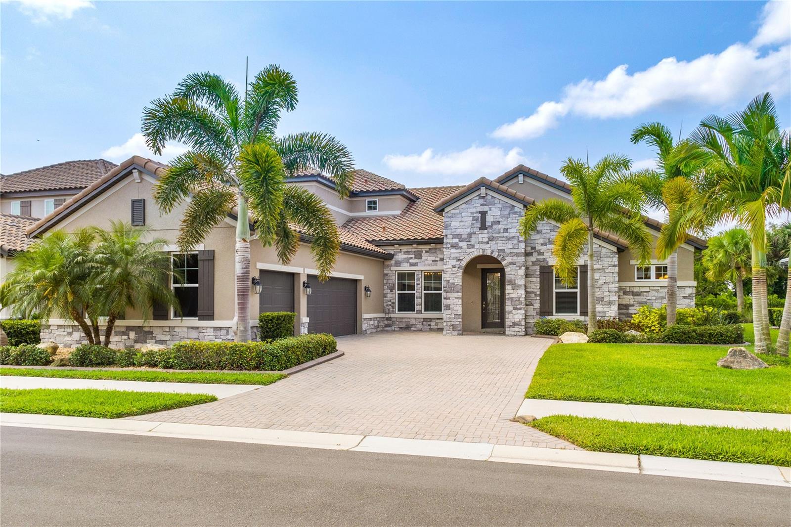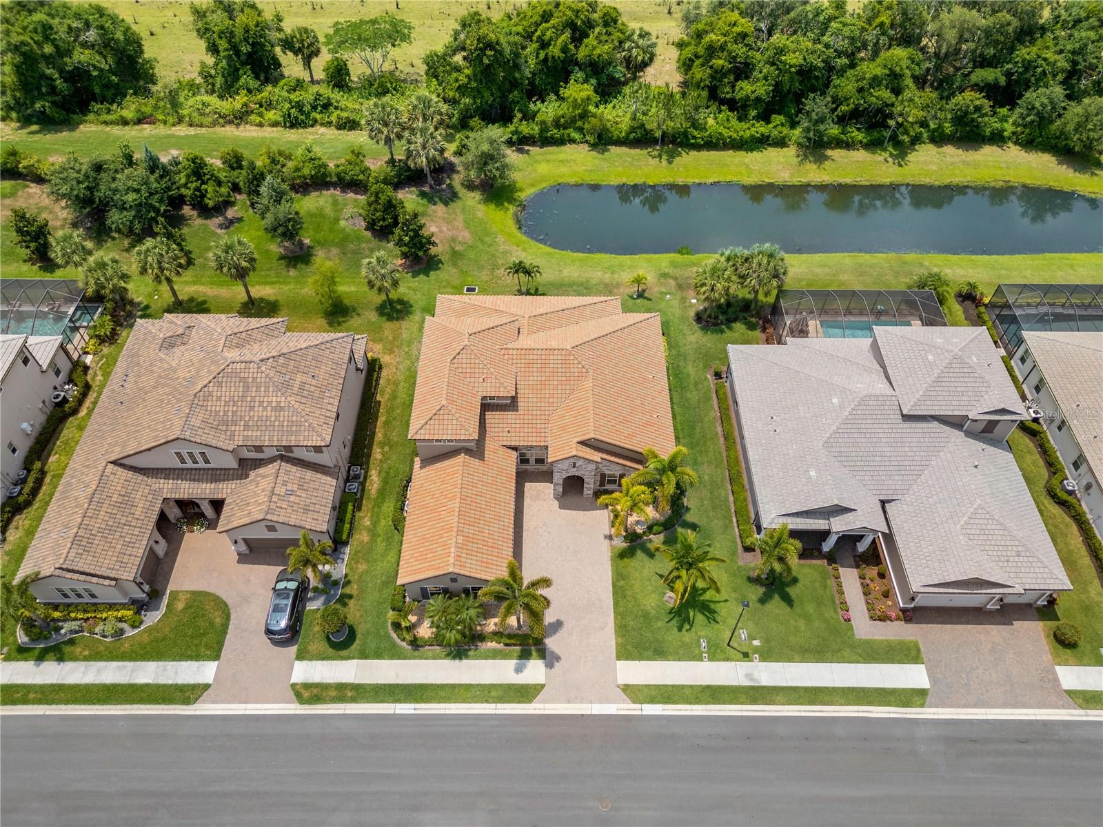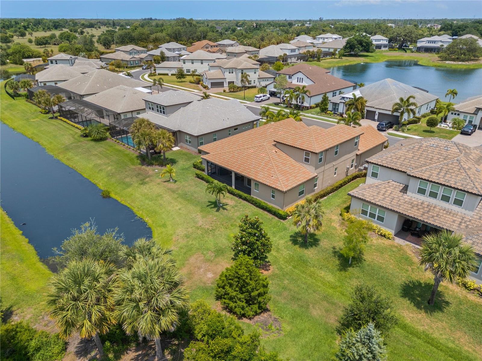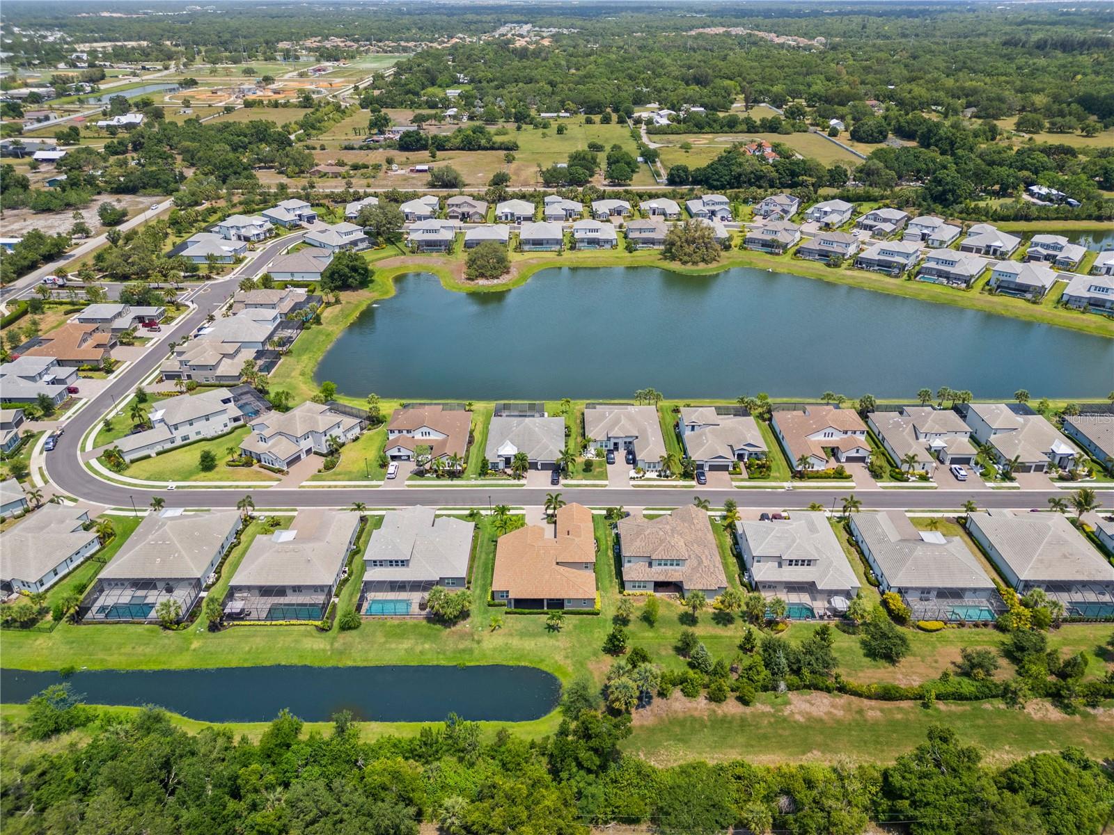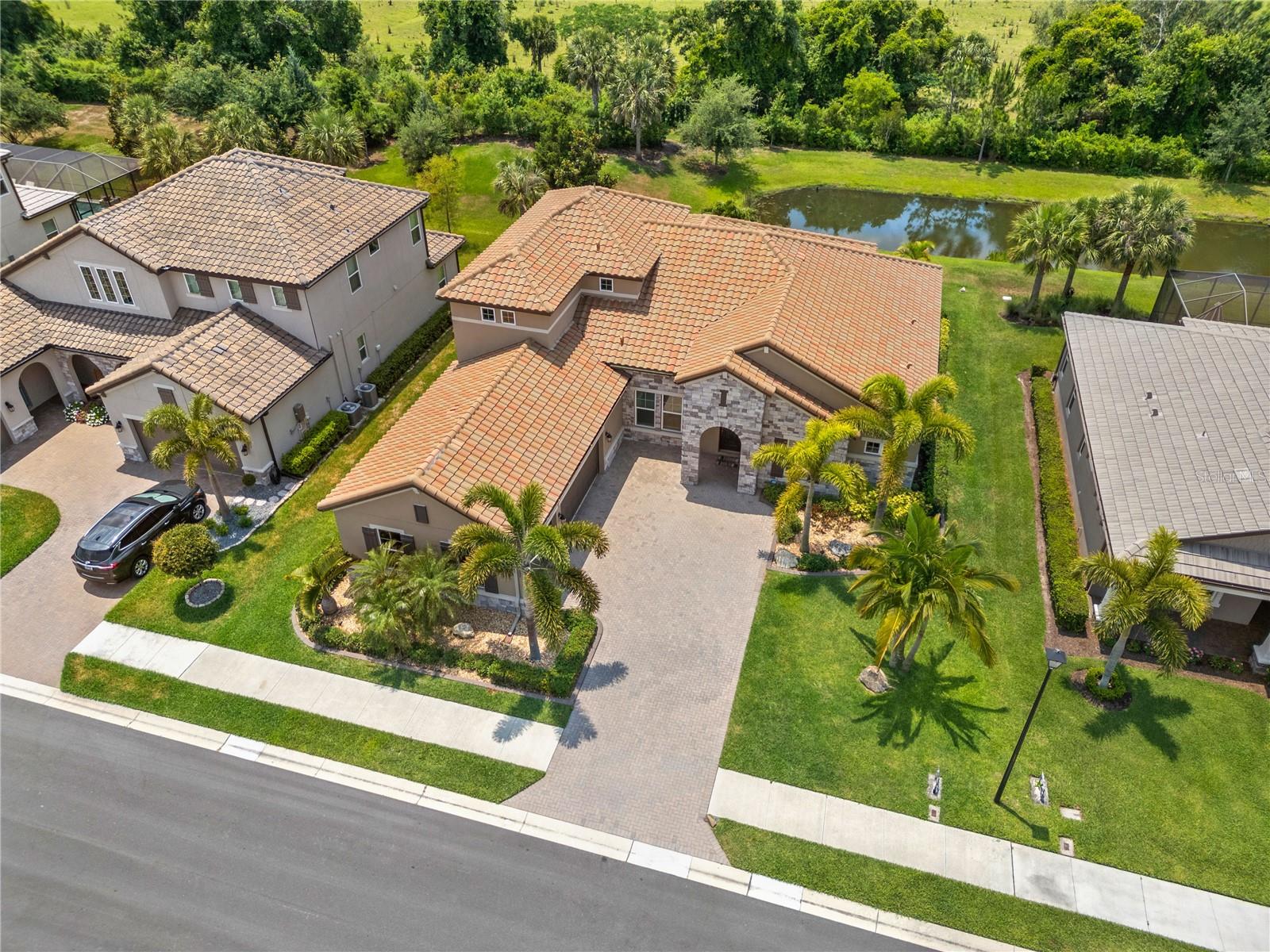 You will fall in love from the moment you walk in to the beautiful foyer of this Jubilee floor plan that consists of 4 bedrooms, 4 bathrooms plus bonus room, 2 separate dens, 3 car garage located on a tranquil lake. This home is light and bright, perfect for entertaining with it's spacious great room that is open to the gourmet kitchen boasting top of the line Cafe appliances consisting of a 5-burner gas cooktop and range hood, built in oven and convection/microwave oven, dishwasher, French door refrigerator that includes instant hot water, expansive center island with seating, three chandeliers, large stainless sink, gorgeous granite counters with subway tile back splash, shaker wood cabinetry with lots of drawers, and walk in pantry. Butlers pantry is perfect for a coffee bar which includes a wine refrigerator. The convenient first-floor owner's suite leaves nothing to be desired with a show stopping walk-in closet with custom built-ins and safe, quartz counters, two sinks and large cabinetry, soaking tub, walk-in roman shower with seat, and separate water closet. The main floor has two additional bedrooms which makes this home a perfect split plan. Laundry room includes washer, dryer and pedestal sink. Upstairs has a large bonus room with walk-in closet for additional storage, another bedroom with a built in safe located in the closet plus an additional full bathroom. The owners have spared no expense in creating a luxurious comfortable home featuring 10' ceilings, 8' doors, tray ceilings, recessed lighting, tile flooring throughout the home including custom inlays with the exception of hardwood located in the two dens, custom crown molding, wainscoting, chair railing, and detailed wood working around the windows and on the ceilings have been adorned. Enjoy relaxing on the screened in lanai over looking the peaceful lake. You will have peace of mind knowing the windows are impact glass resistant, 2 Carrier A/C units, tankless gas water heater, irrigation system with reclaimed water, and rain gutters. This home has been meticulously maintained and cared for creating a welcoming and inviting space for all that enter. Rivo Lakes is a gated community with LOW HOA Fees and NO CDD FEES conveniently located to Siesta Key, the beaches, shopping, restaurants, hospitals, downtown Sarasota, UTC, airports, and I-75.