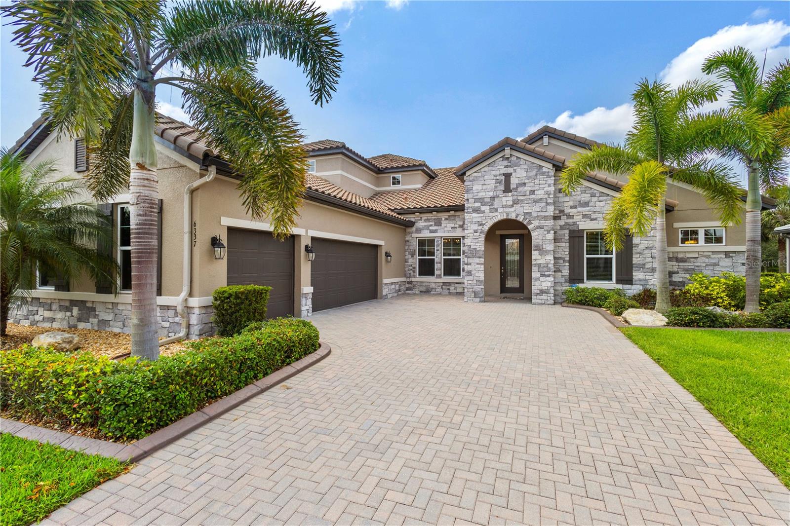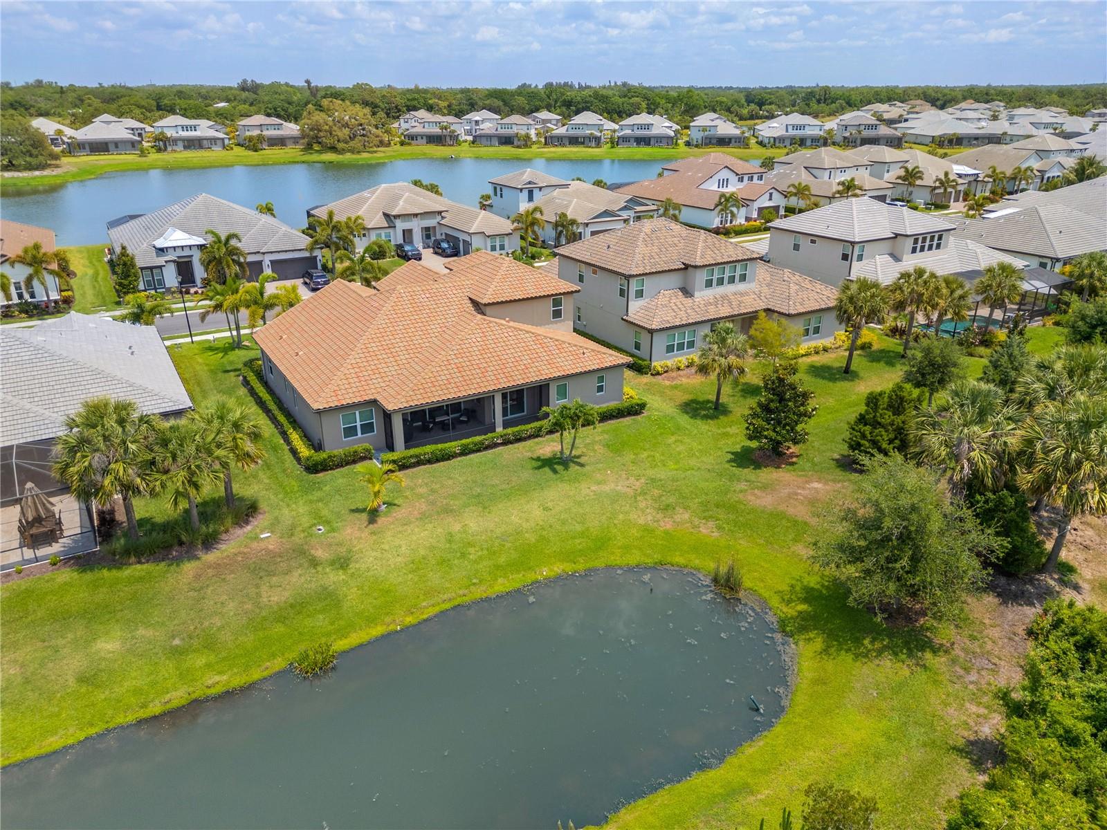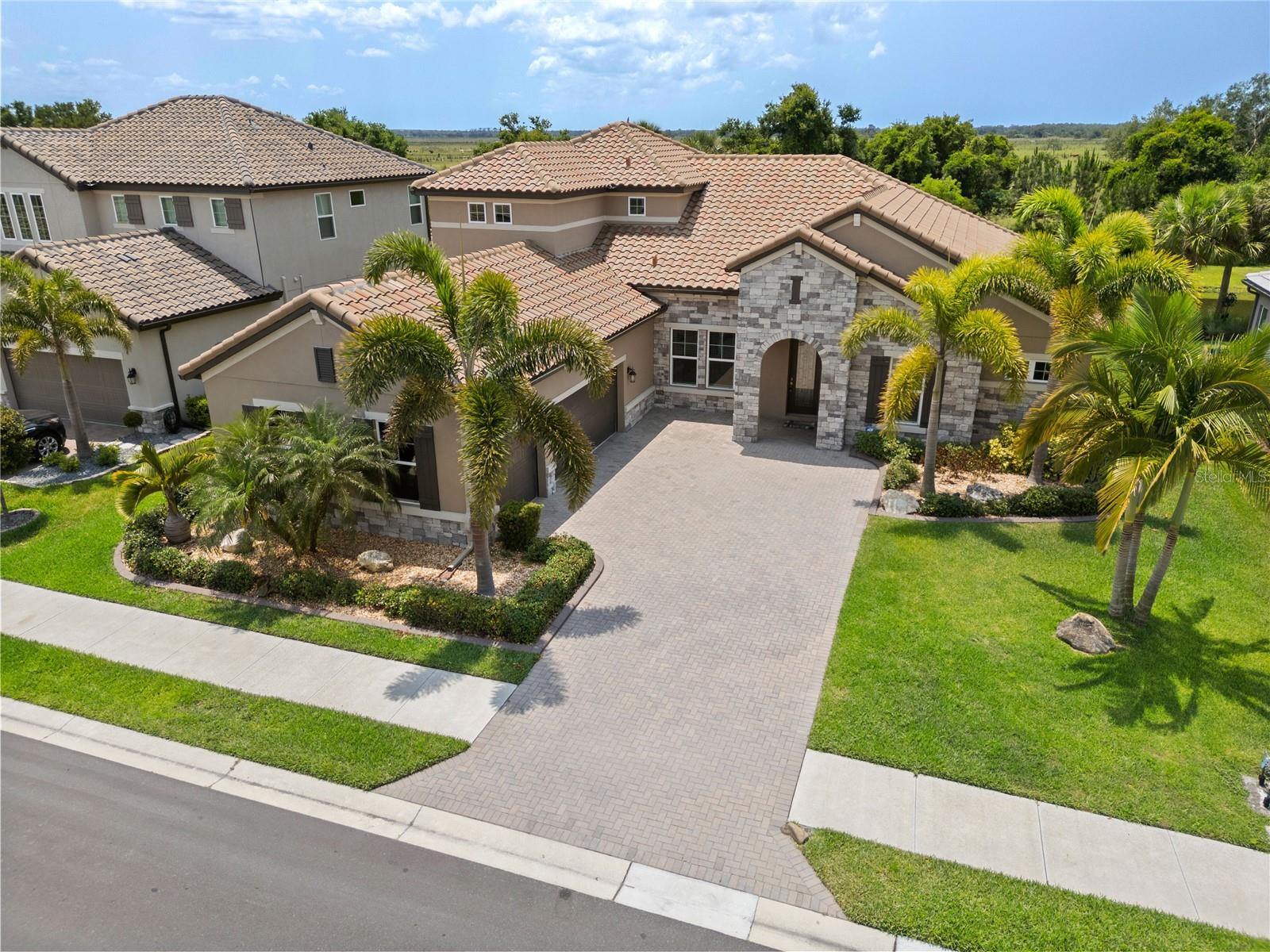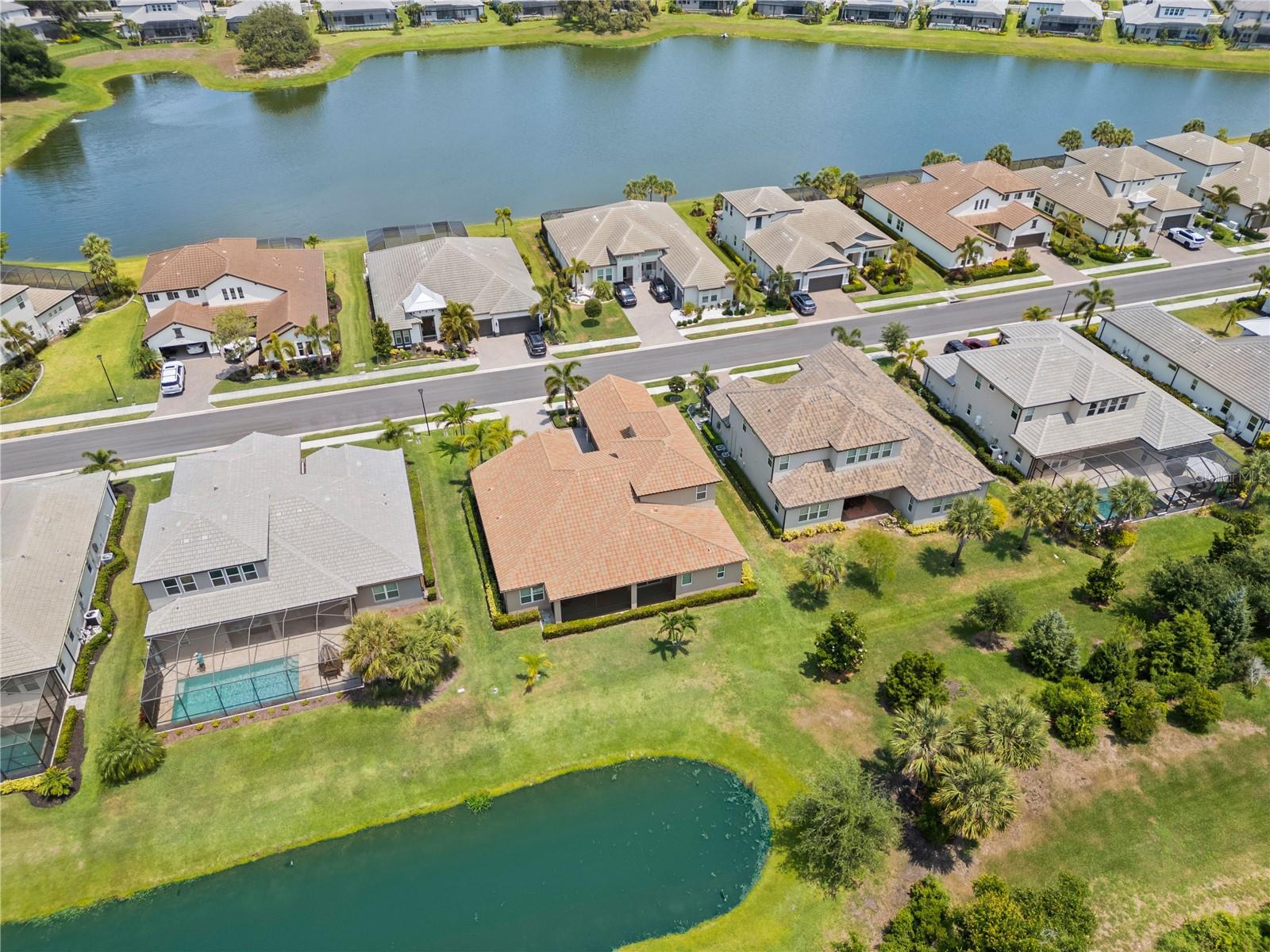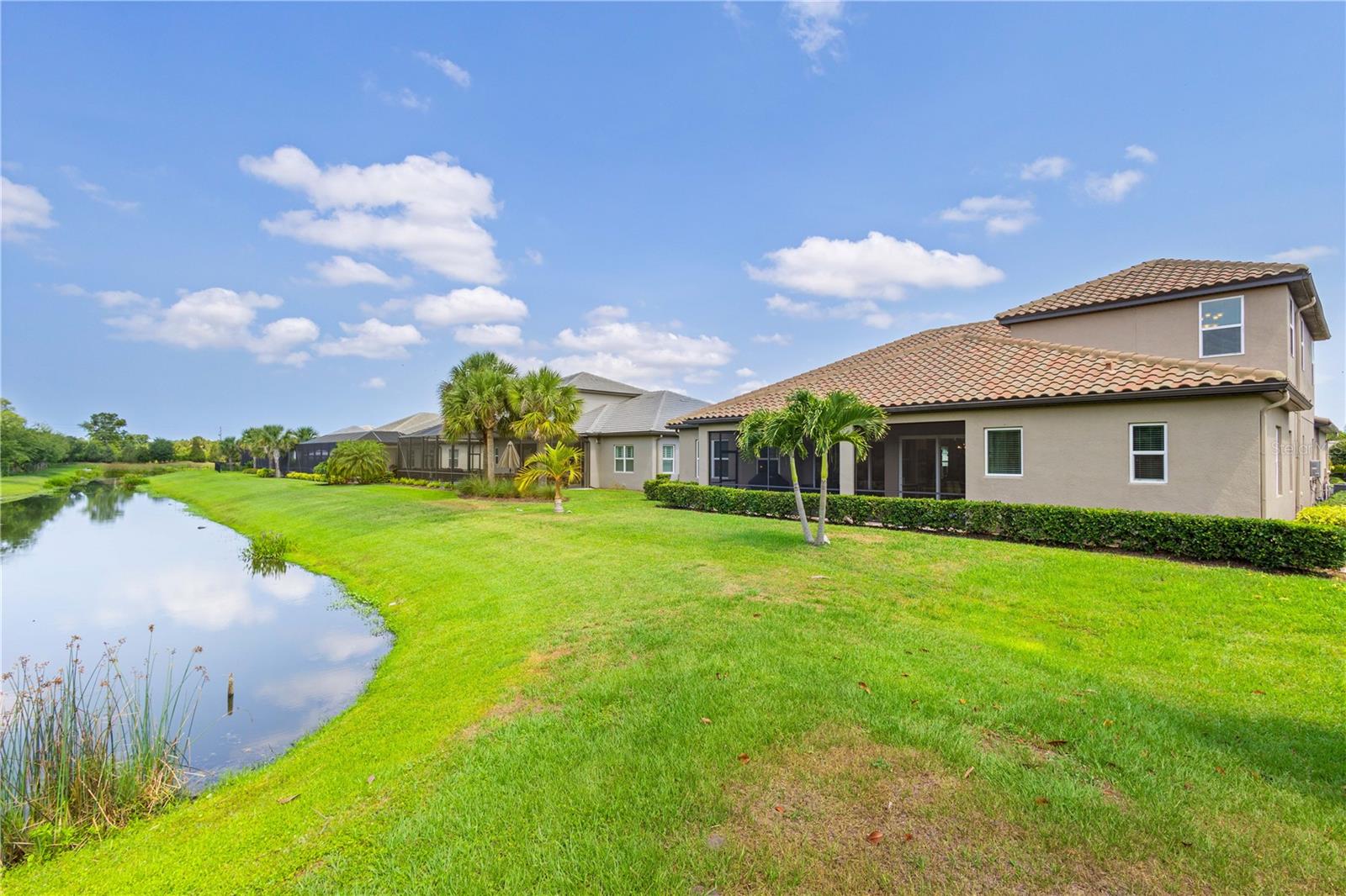 You will fall in love from the moment you walk in to the beautiful foyer of this Jubilee floor plan that consists of 4 bedrooms, 4 bathrooms plus bonus room, 2 separate dens, 3 car garage located on a tranquil lake. This home is light and bright, perfect for entertaining with it's spacious great room that is open to the gourmet kitchen boasting top of the line Cafe appliances consisting of a 5-burner gas cooktop and range hood, built in oven and convection/microwave oven, dishwasher, French door refrigerator that includes instant hot water, expansive center island with seating, three chandeliers, large stainless sink, gorgeous granite counters with subway tile back splash, shaker wood cabinetry with lots of drawers, and walk in pantry. Butlers pantry is perfect for a coffee bar which includes a wine refrigerator. The convenient first-floor owner's suite leaves nothing to be desired with a show stopping walk-in closet with custom built-ins and safe, quartz counters, two sinks and large cabinetry, soaking tub, walk-in roman shower with seat, and separate water closet. The main floor has two additional bedrooms which makes this home a perfect split plan. Laundry room includes washer, dryer and pedestal sink. Upstairs has a large bonus room with walk-in closet for additional storage, another bedroom with a built in safe located in the closet plus an additional full bathroom. The owners have spared no expense in creating a luxurious comfortable home featuring 10' ceilings, 8' doors, tray ceilings, recessed lighting, tile flooring throughout the home including custom inlays with the exception of hardwood located in the two dens, custom crown molding, wainscoting, chair railing, and detailed wood working around the windows and on the ceilings have been adorned. Enjoy relaxing on the screened in lanai over looking the peaceful lake. You will have peace of mind knowing the windows are impact glass resistant, 2 Carrier A/C units, tankless gas water heater, irrigation system with reclaimed water, and rain gutters. This home has been meticulously maintained and cared for creating a welcoming and inviting space for all that enter. Rivo Lakes is a gated community with LOW HOA Fees and NO CDD FEES conveniently located to Siesta Key, the beaches, shopping, restaurants, hospitals, downtown Sarasota, UTC, airports, and I-75.