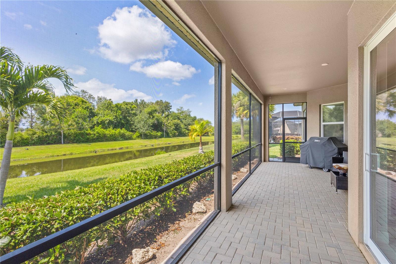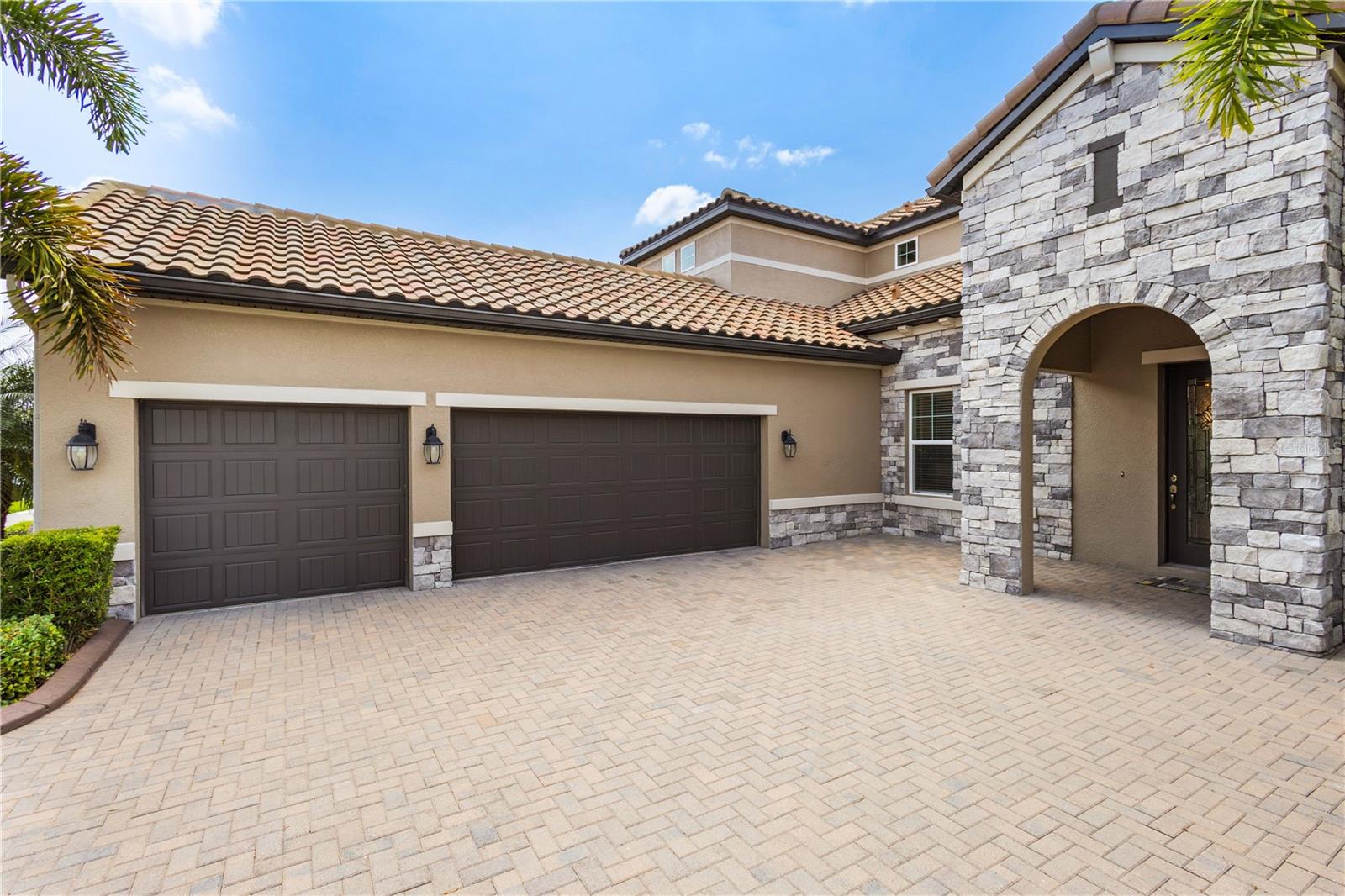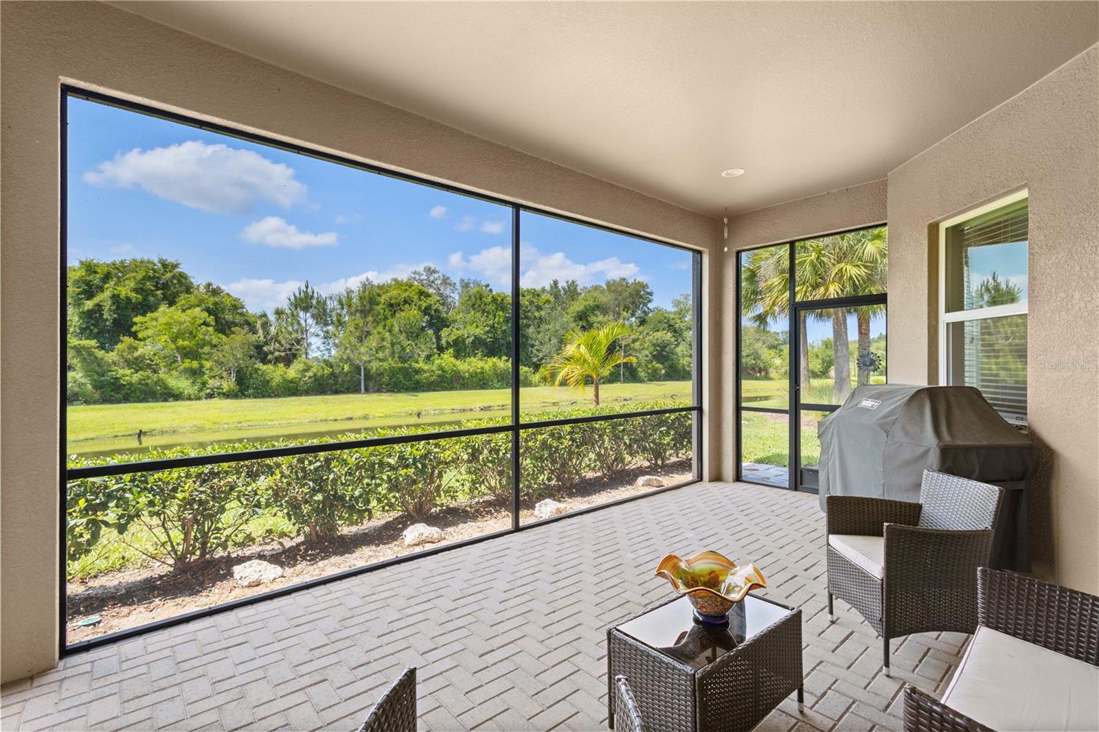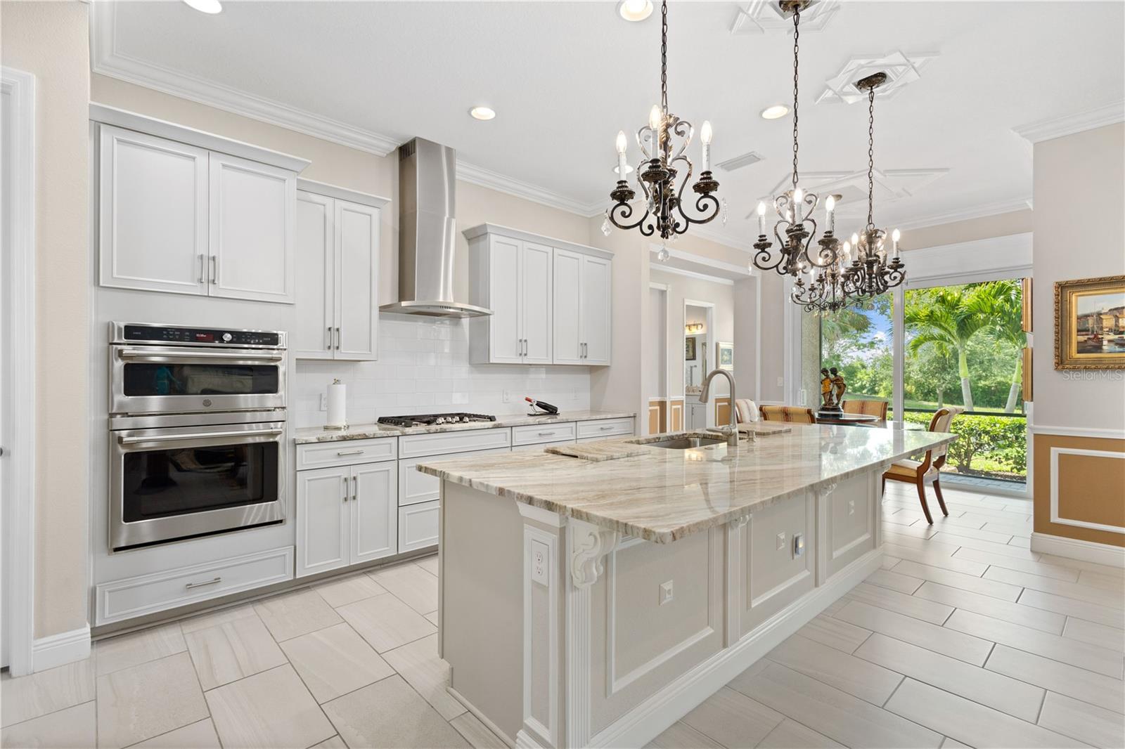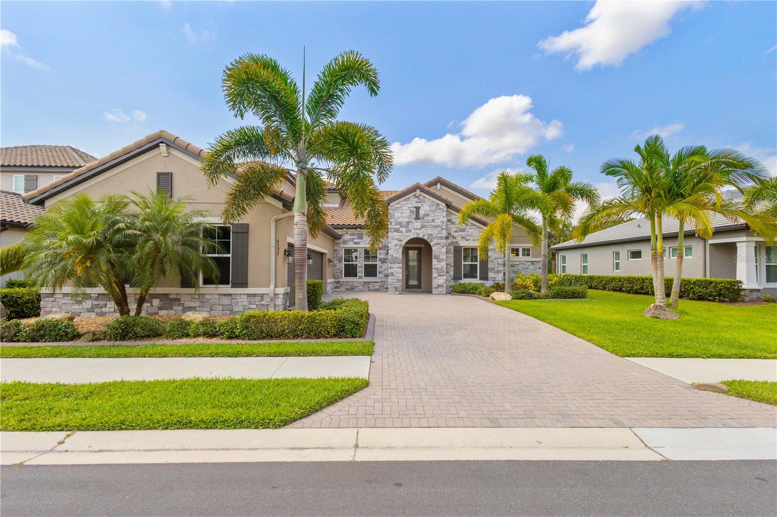 You will fall in love from the moment you walk in to the beautiful foyer of this Jubilee floor plan that consists of 4 bedrooms, 4 bathrooms plus bonus room, 2 separate dens, 3 car garage located on a tranquil lake. This home is light and bright, perfect for entertaining with it's spacious great room that is open to the gourmet kitchen boasting top of the line Cafe appliances consisting of a 5-burner gas cooktop and range hood, built in oven and convection/microwave oven, dishwasher, French door refrigerator that includes instant hot water, expansive center island with seating, three chandeliers, large stainless sink, gorgeous granite counters with subway tile back splash, shaker wood cabinetry with lots of drawers, and walk in pantry. Butlers pantry is perfect for a coffee bar which includes a wine refrigerator. The convenient first-floor owner's suite leaves nothing to be desired with a show stopping walk-in closet with custom built-ins and safe, quartz counters, two sinks and large cabinetry, soaking tub, walk-in roman shower with seat, and separate water closet. The main floor has two additional bedrooms which makes this home a perfect split plan. Laundry room includes washer, dryer and pedestal sink. Upstairs has a large bonus room with walk-in closet for additional storage, another bedroom with a built in safe located in the closet plus an additional full bathroom. The owners have spared no expense in creating a luxurious comfortable home featuring 10' ceilings, 8' doors, tray ceilings, recessed lighting, tile flooring throughout the home including custom inlays with the exception of hardwood located in the two dens, custom crown molding, wainscoting, chair railing, and detailed wood working around the windows and on the ceilings have been adorned. Enjoy relaxing on the screened in lanai over looking the peaceful lake. You will have peace of mind knowing the windows are impact glass resistant, 2 Carrier A/C units, tankless gas water heater, irrigation system with reclaimed water, and rain gutters. This home has been meticulously maintained and cared for creating a welcoming and inviting space for all that enter. Rivo Lakes is a gated community with LOW HOA Fees and NO CDD FEES conveniently located to Siesta Key, the beaches, shopping, restaurants, hospitals, downtown Sarasota, UTC, airports, and I-75.