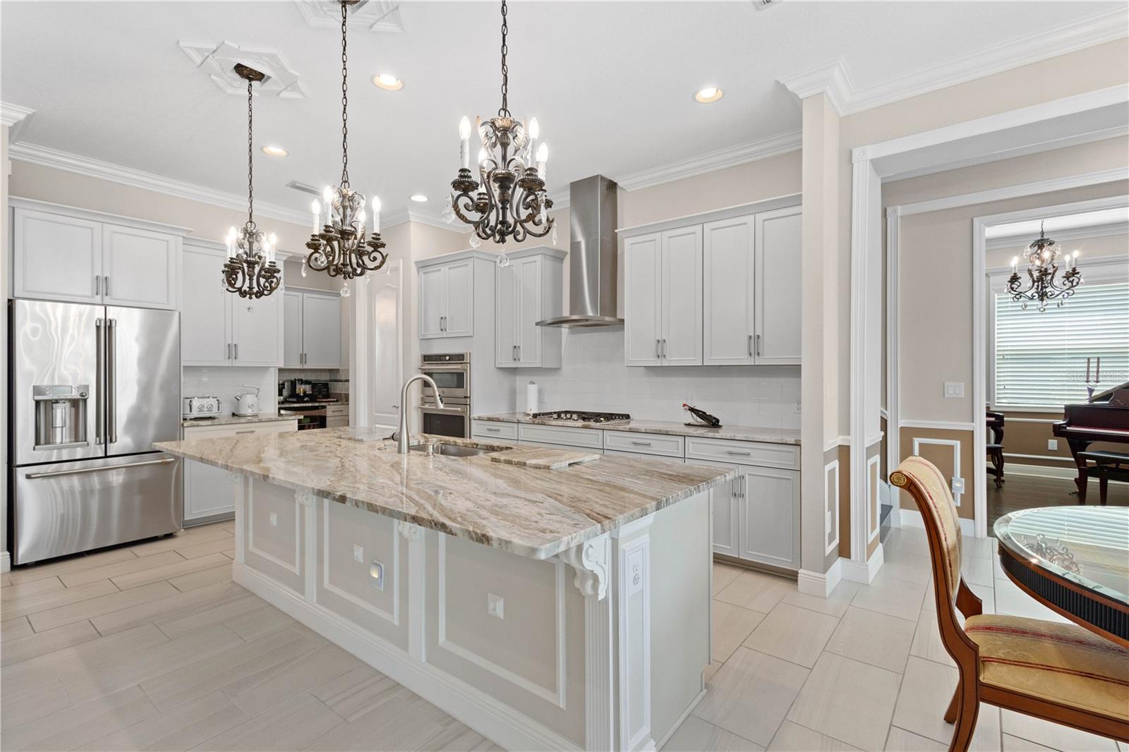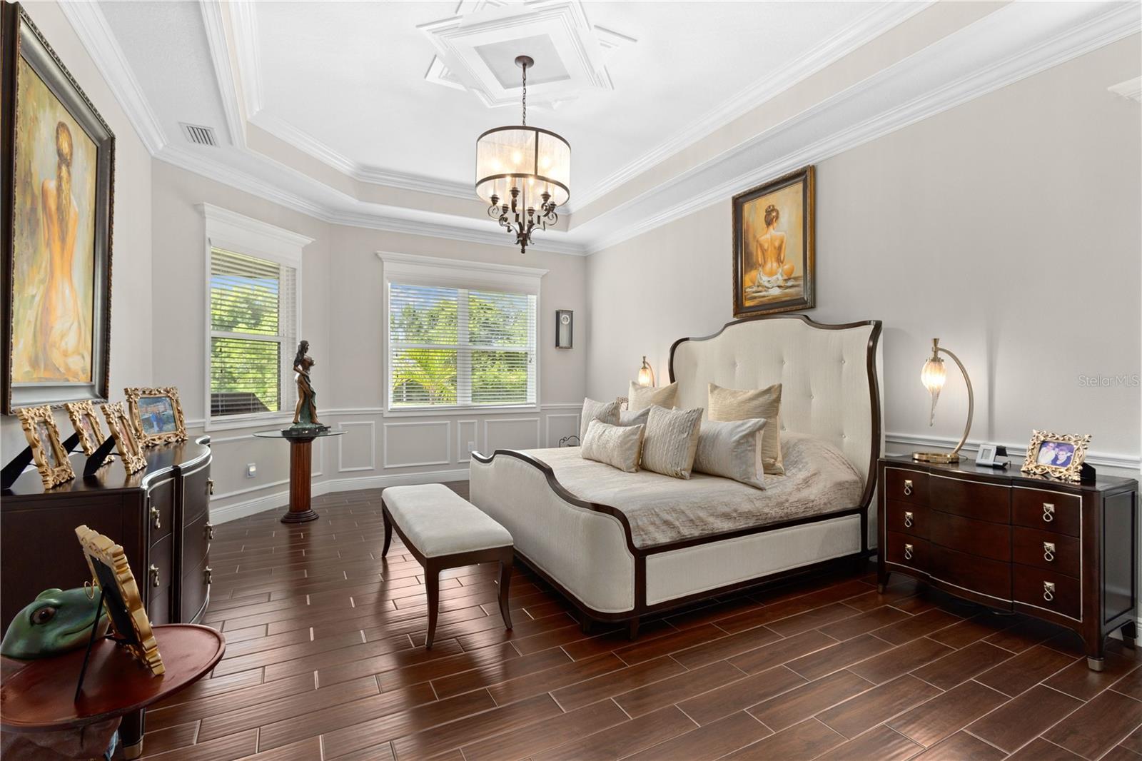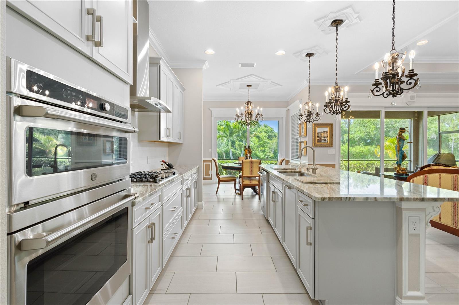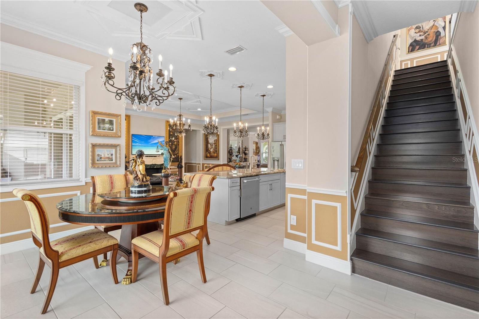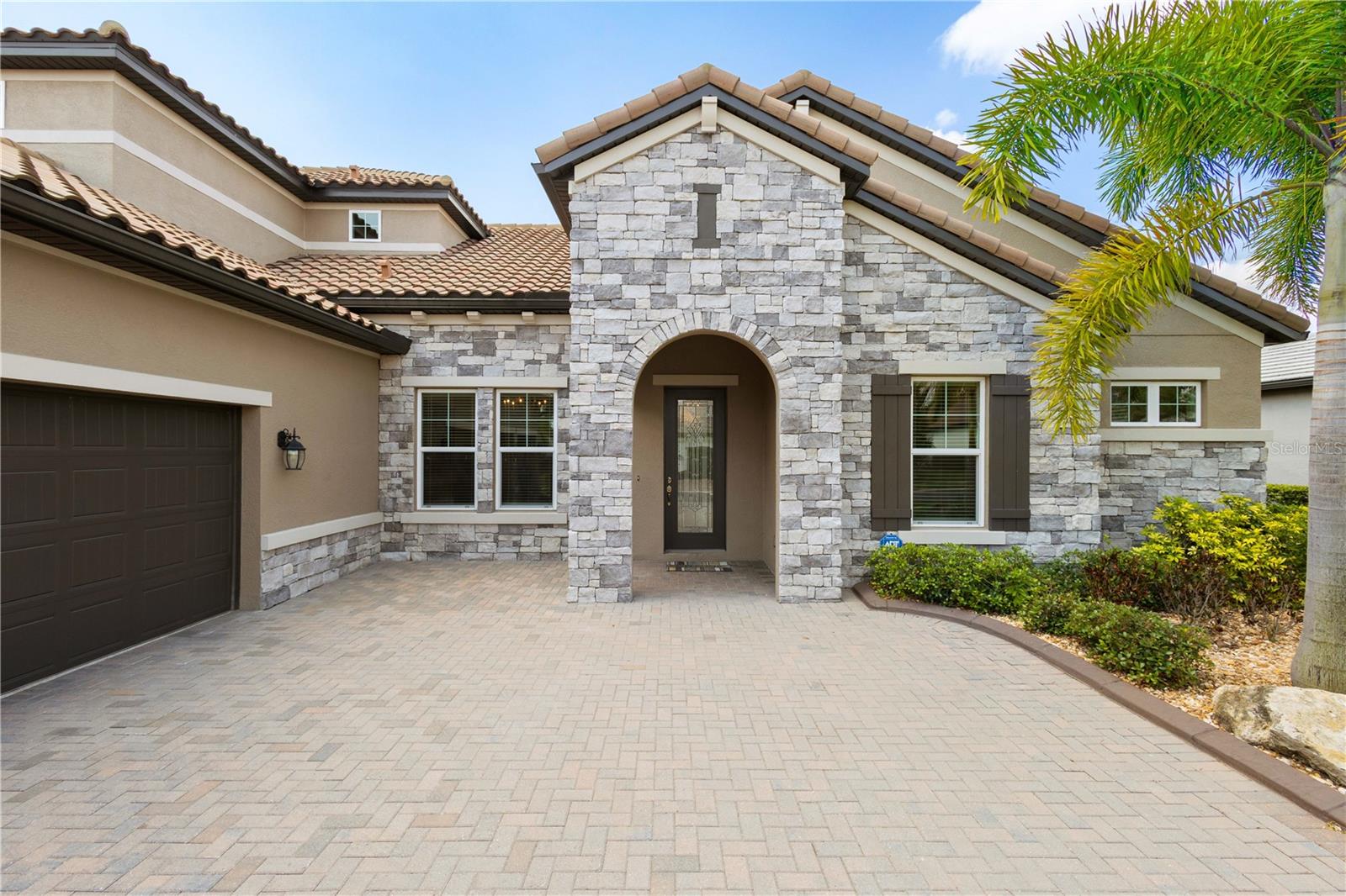 You will fall in love from the moment you walk in to the beautiful foyer of this Jubilee floor plan that consists of 4 bedrooms, 4 bathrooms plus bonus room, 2 separate dens, 3 car garage located on a tranquil lake. This home is light and bright, perfect for entertaining with it's spacious great room that is open to the gourmet kitchen boasting top of the line Cafe appliances consisting of a 5-burner gas cooktop and range hood, built in oven and convection/microwave oven, dishwasher, French door refrigerator that includes instant hot water, expansive center island with seating, three chandeliers, large stainless sink, gorgeous granite counters with subway tile back splash, shaker wood cabinetry with lots of drawers, and walk in pantry. Butlers pantry is perfect for a coffee bar which includes a wine refrigerator. The convenient first-floor owner's suite leaves nothing to be desired with a show stopping walk-in closet with custom built-ins and safe, quartz counters, two sinks and large cabinetry, soaking tub, walk-in roman shower with seat, and separate water closet. The main floor has two additional bedrooms which makes this home a perfect split plan. Laundry room includes washer, dryer and pedestal sink. Upstairs has a large bonus room with walk-in closet for additional storage, another bedroom with a built in safe located in the closet plus an additional full bathroom. The owners have spared no expense in creating a luxurious comfortable home featuring 10' ceilings, 8' doors, tray ceilings, recessed lighting, tile flooring throughout the home including custom inlays with the exception of hardwood located in the two dens, custom crown molding, wainscoting, chair railing, and detailed wood working around the windows and on the ceilings have been adorned. Enjoy relaxing on the screened in lanai over looking the peaceful lake. You will have peace of mind knowing the windows are impact glass resistant, 2 Carrier A/C units, tankless gas water heater, irrigation system with reclaimed water, and rain gutters. This home has been meticulously maintained and cared for creating a welcoming and inviting space for all that enter. Rivo Lakes is a gated community with LOW HOA Fees and NO CDD FEES conveniently located to Siesta Key, the beaches, shopping, restaurants, hospitals, downtown Sarasota, UTC, airports, and I-75.