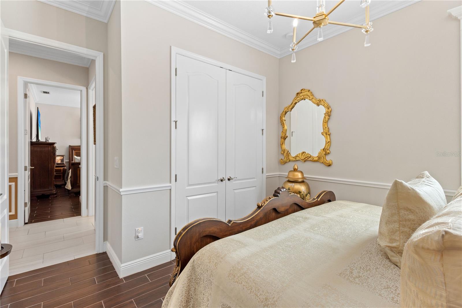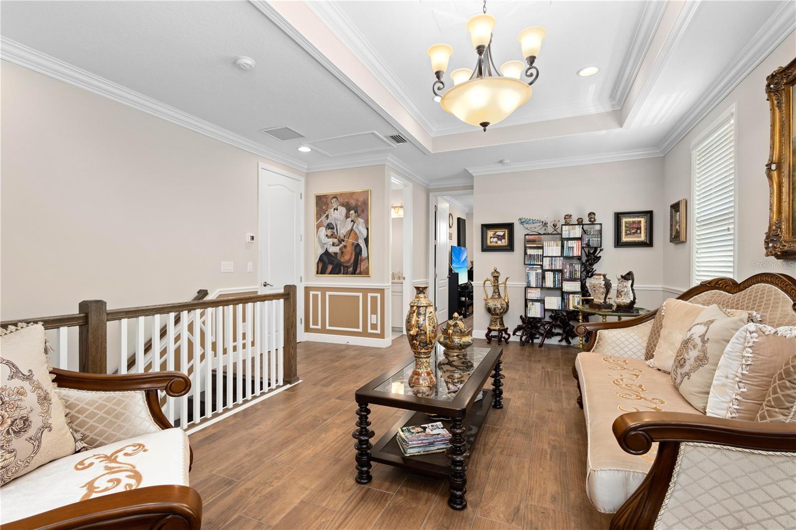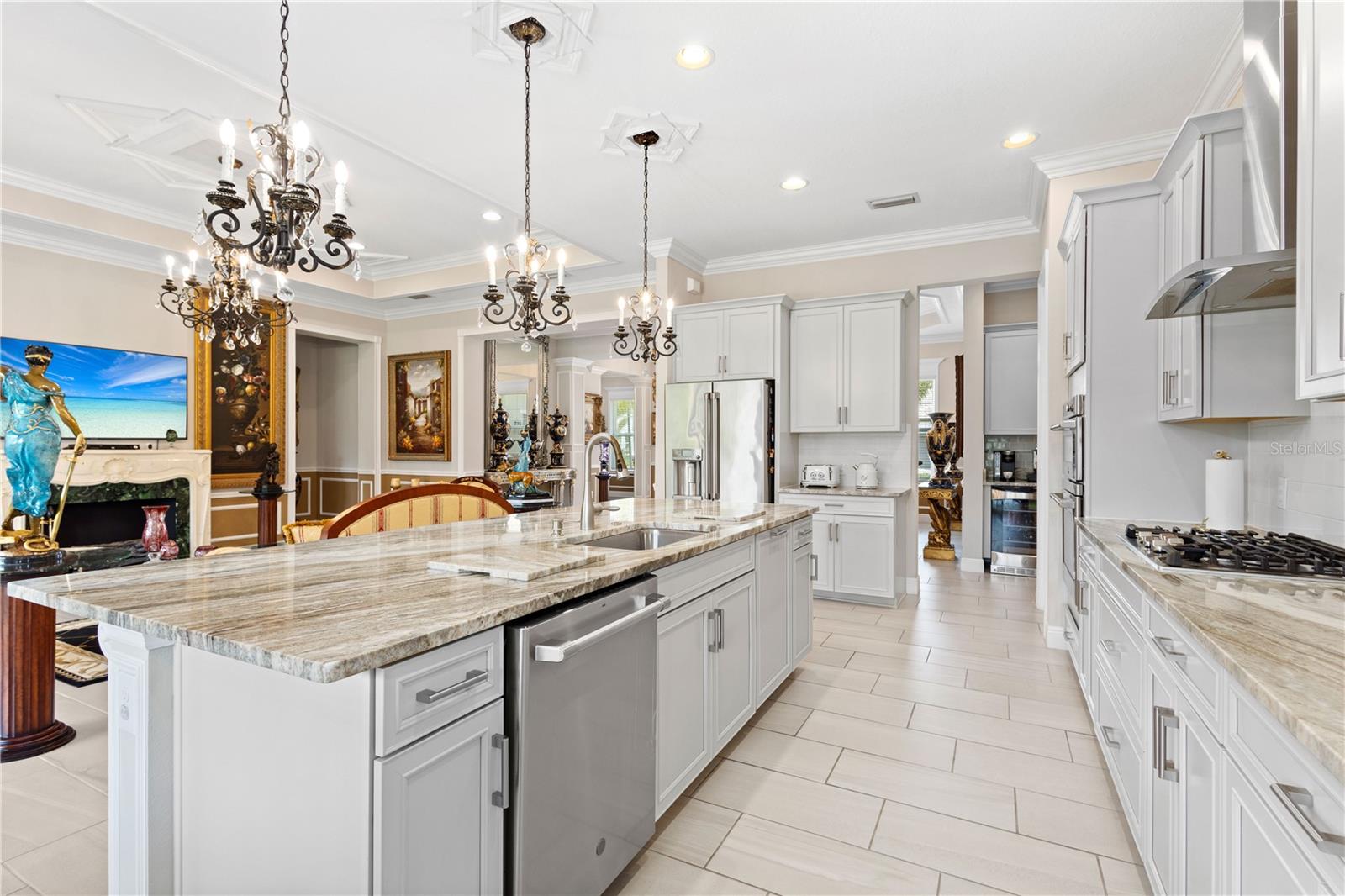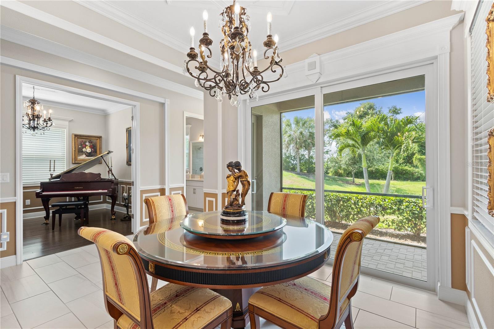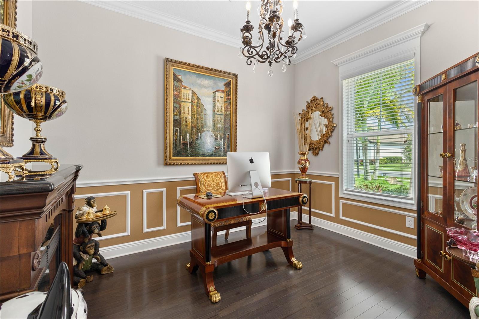 You will fall in love from the moment you walk in to the beautiful foyer of this Jubilee floor plan that consists of 4 bedrooms, 4 bathrooms plus bonus room, 2 separate dens, 3 car garage located on a tranquil lake. This home is light and bright, perfect for entertaining with it's spacious great room that is open to the gourmet kitchen boasting top of the line Cafe appliances consisting of a 5-burner gas cooktop and range hood, built in oven and convection/microwave oven, dishwasher, French door refrigerator that includes instant hot water, expansive center island with seating, three chandeliers, large stainless sink, gorgeous granite counters with subway tile back splash, shaker wood cabinetry with lots of drawers, and walk in pantry. Butlers pantry is perfect for a coffee bar which includes a wine refrigerator. The convenient first-floor owner's suite leaves nothing to be desired with a show stopping walk-in closet with custom built-ins and safe, quartz counters, two sinks and large cabinetry, soaking tub, walk-in roman shower with seat, and separate water closet. The main floor has two additional bedrooms which makes this home a perfect split plan. Laundry room includes washer, dryer and pedestal sink. Upstairs has a large bonus room with walk-in closet for additional storage, another bedroom with a built in safe located in the closet plus an additional full bathroom. The owners have spared no expense in creating a luxurious comfortable home featuring 10' ceilings, 8' doors, tray ceilings, recessed lighting, tile flooring throughout the home including custom inlays with the exception of hardwood located in the two dens, custom crown molding, wainscoting, chair railing, and detailed wood working around the windows and on the ceilings have been adorned. Enjoy relaxing on the screened in lanai over looking the peaceful lake. You will have peace of mind knowing the windows are impact glass resistant, 2 Carrier A/C units, tankless gas water heater, irrigation system with reclaimed water, and rain gutters. This home has been meticulously maintained and cared for creating a welcoming and inviting space for all that enter. Rivo Lakes is a gated community with LOW HOA Fees and NO CDD FEES conveniently located to Siesta Key, the beaches, shopping, restaurants, hospitals, downtown Sarasota, UTC, airports, and I-75.