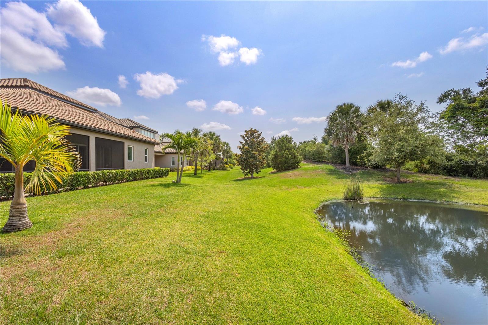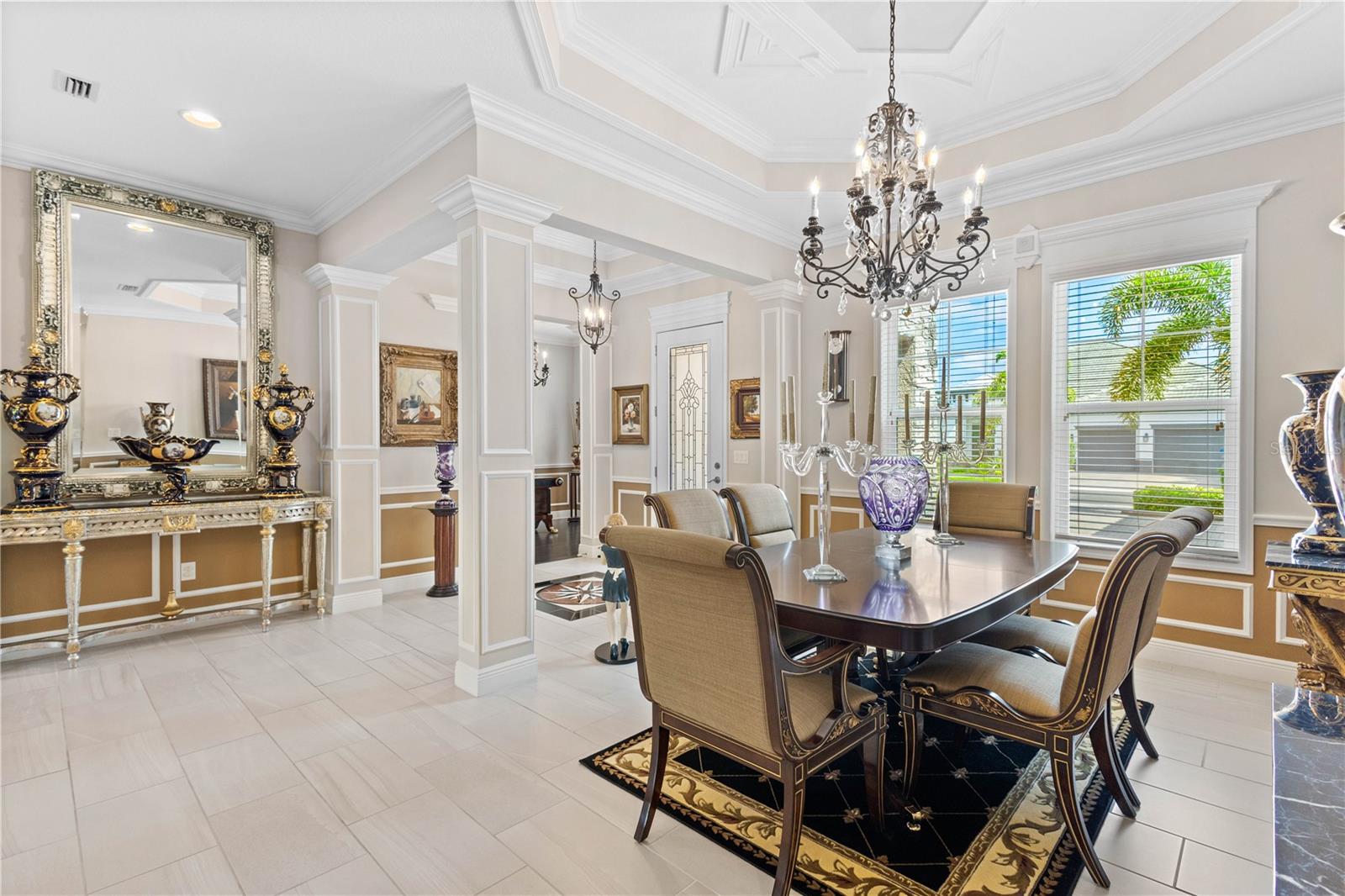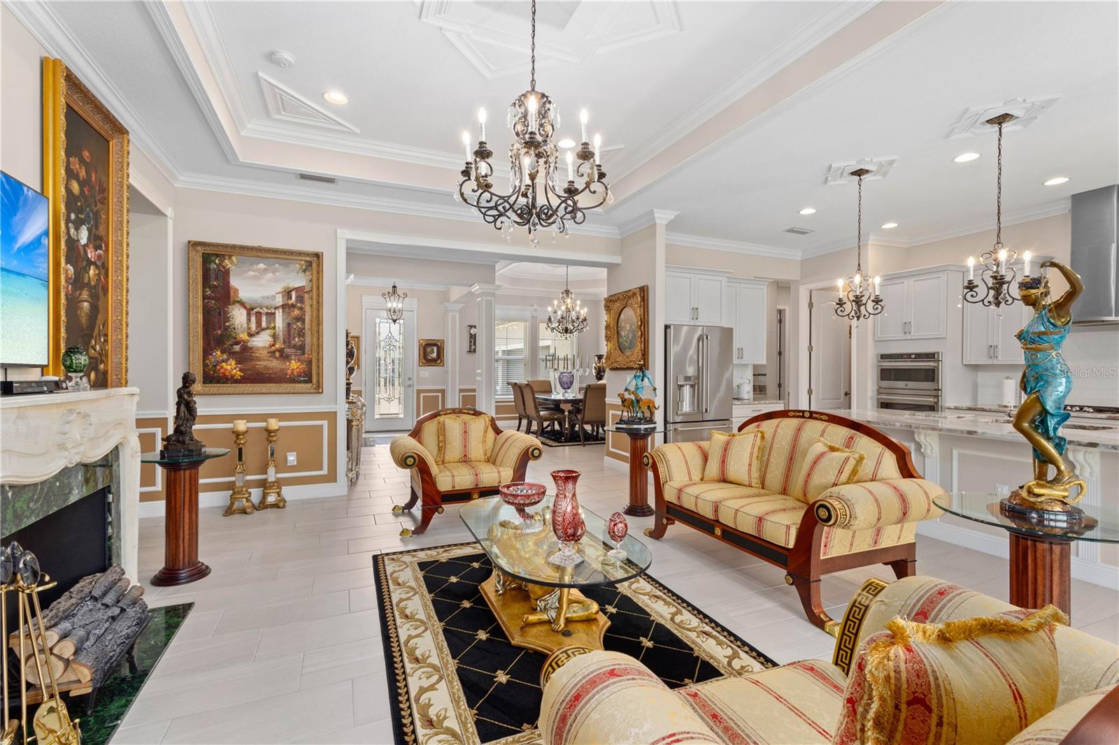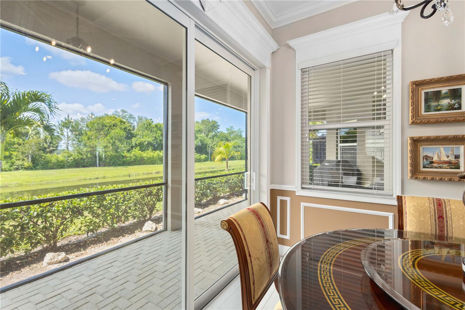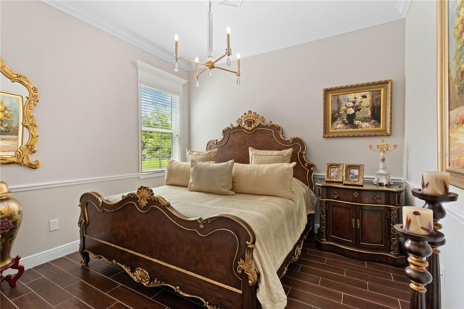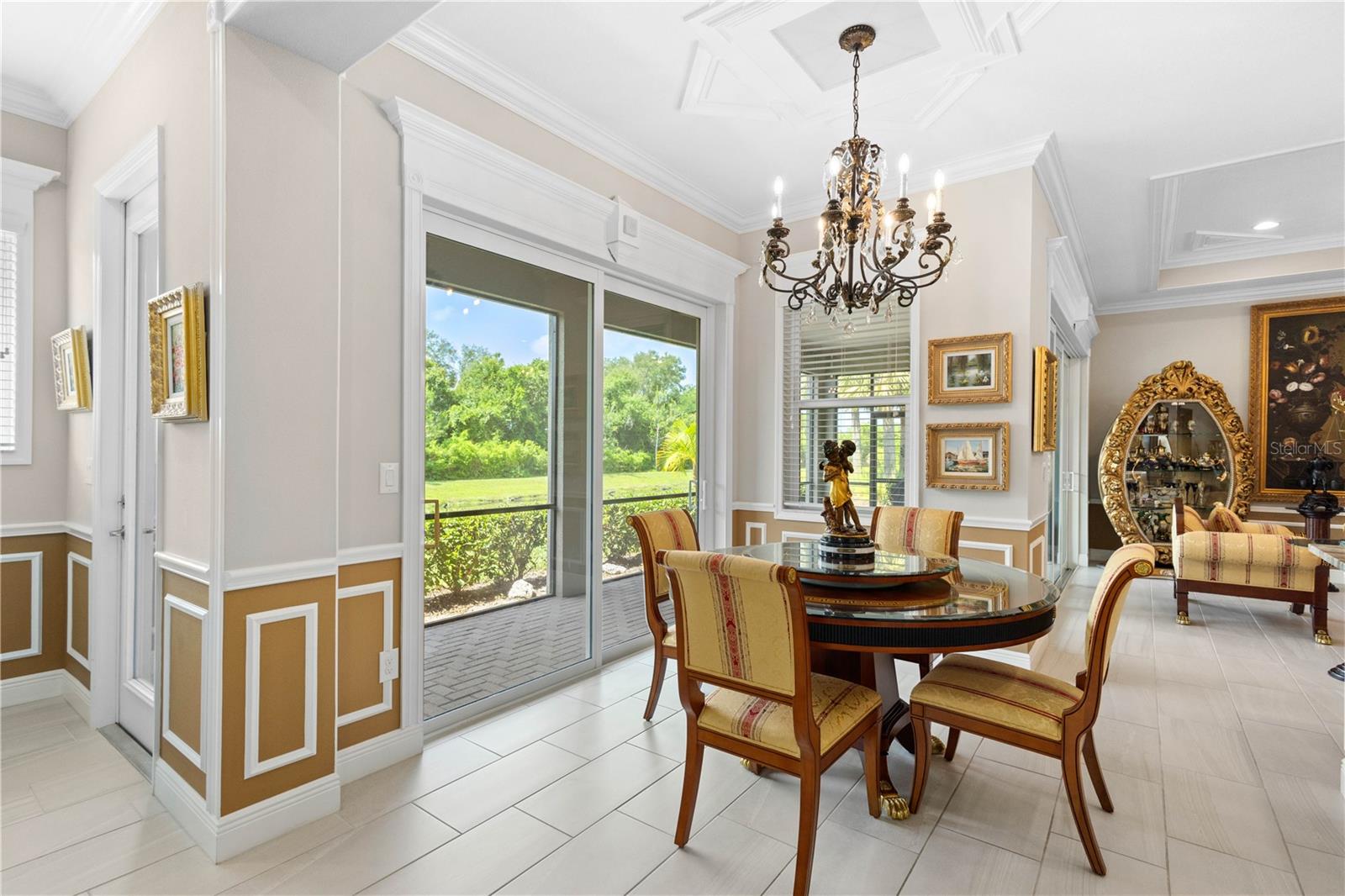 You will fall in love from the moment you walk in to the beautiful foyer of this Jubilee floor plan that consists of 4 bedrooms, 4 bathrooms plus bonus room, 2 separate dens, 3 car garage located on a tranquil lake. This home is light and bright, perfect for entertaining with it's spacious great room that is open to the gourmet kitchen boasting top of the line Cafe appliances consisting of a 5-burner gas cooktop and range hood, built in oven and convection/microwave oven, dishwasher, French door refrigerator that includes instant hot water, expansive center island with seating, three chandeliers, large stainless sink, gorgeous granite counters with subway tile back splash, shaker wood cabinetry with lots of drawers, and walk in pantry. Butlers pantry is perfect for a coffee bar which includes a wine refrigerator. The convenient first-floor owner's suite leaves nothing to be desired with a show stopping walk-in closet with custom built-ins and safe, quartz counters, two sinks and large cabinetry, soaking tub, walk-in roman shower with seat, and separate water closet. The main floor has two additional bedrooms which makes this home a perfect split plan. Laundry room includes washer, dryer and pedestal sink. Upstairs has a large bonus room with walk-in closet for additional storage, another bedroom with a built in safe located in the closet plus an additional full bathroom. The owners have spared no expense in creating a luxurious comfortable home featuring 10' ceilings, 8' doors, tray ceilings, recessed lighting, tile flooring throughout the home including custom inlays with the exception of hardwood located in the two dens, custom crown molding, wainscoting, chair railing, and detailed wood working around the windows and on the ceilings have been adorned. Enjoy relaxing on the screened in lanai over looking the peaceful lake. You will have peace of mind knowing the windows are impact glass resistant, 2 Carrier A/C units, tankless gas water heater, irrigation system with reclaimed water, and rain gutters. This home has been meticulously maintained and cared for creating a welcoming and inviting space for all that enter. Rivo Lakes is a gated community with LOW HOA Fees and NO CDD FEES conveniently located to Siesta Key, the beaches, shopping, restaurants, hospitals, downtown Sarasota, UTC, airports, and I-75.