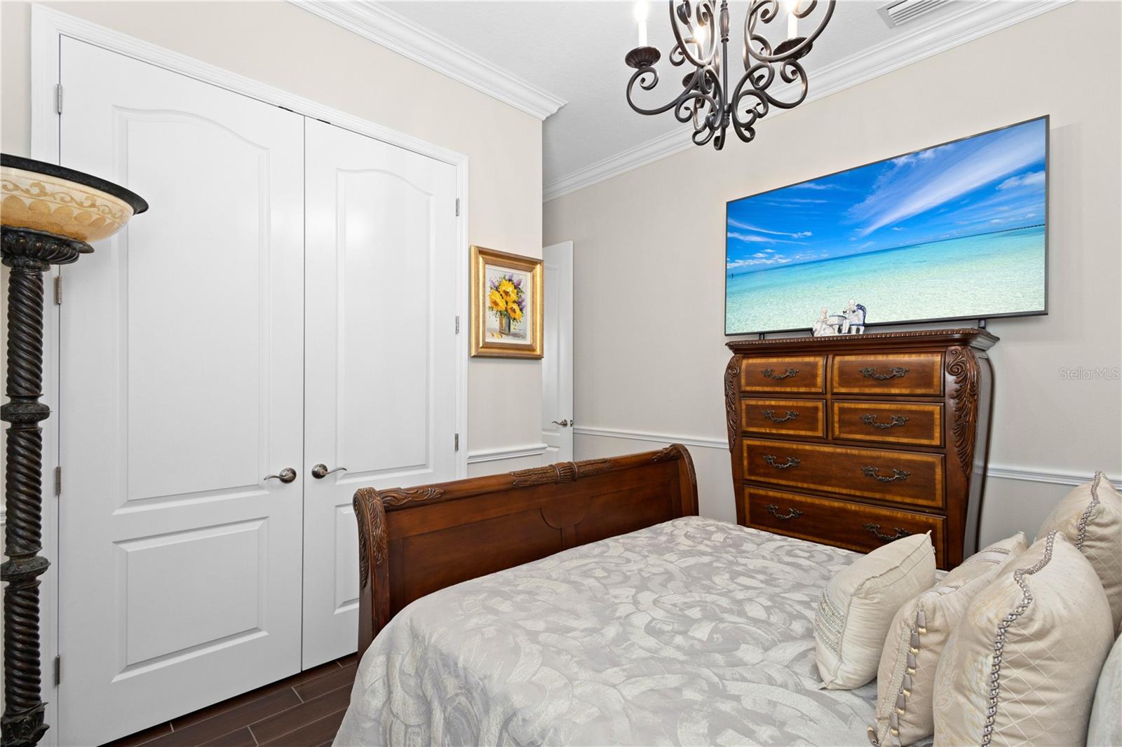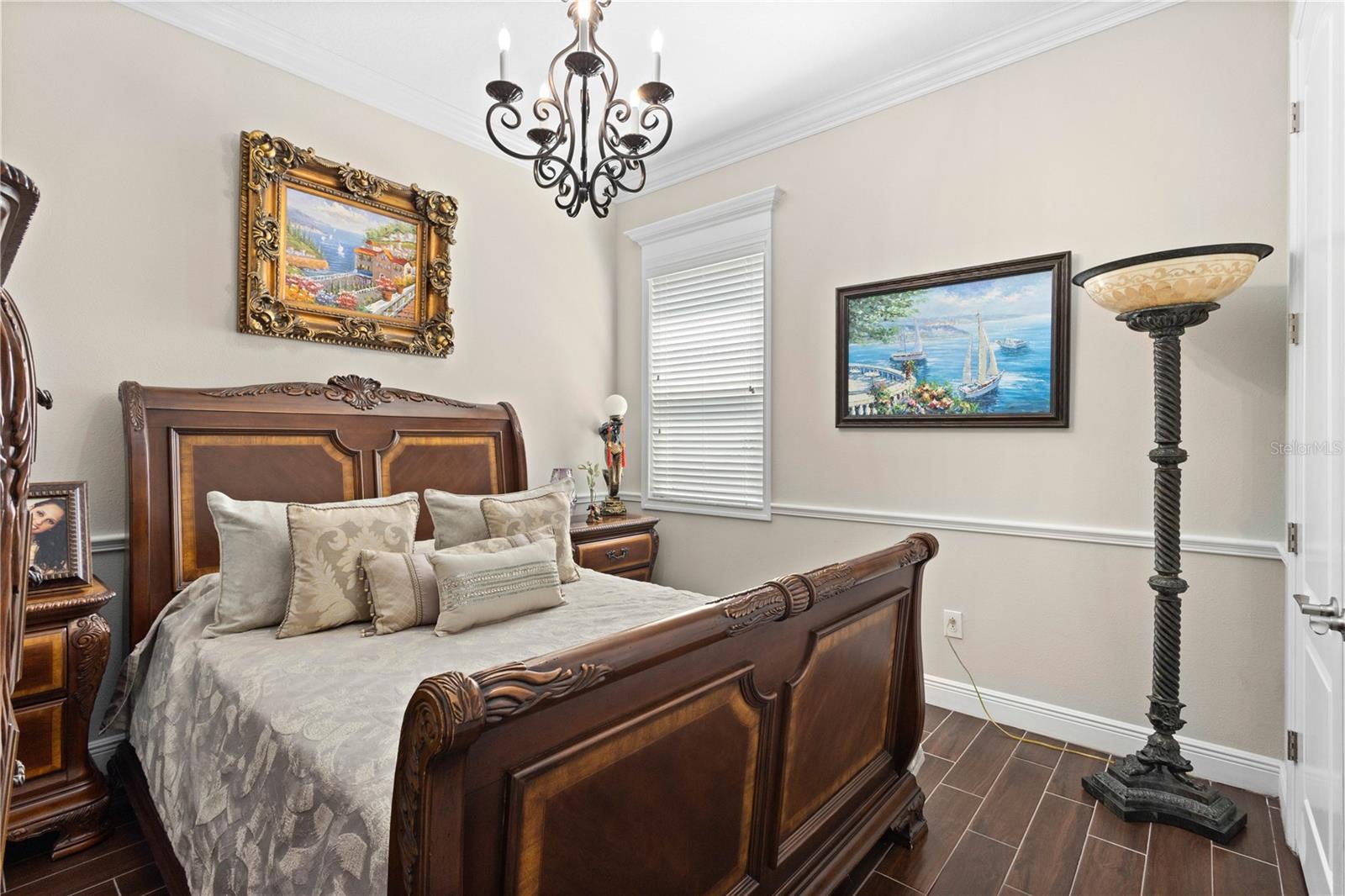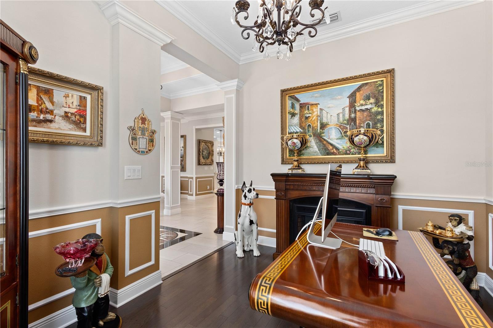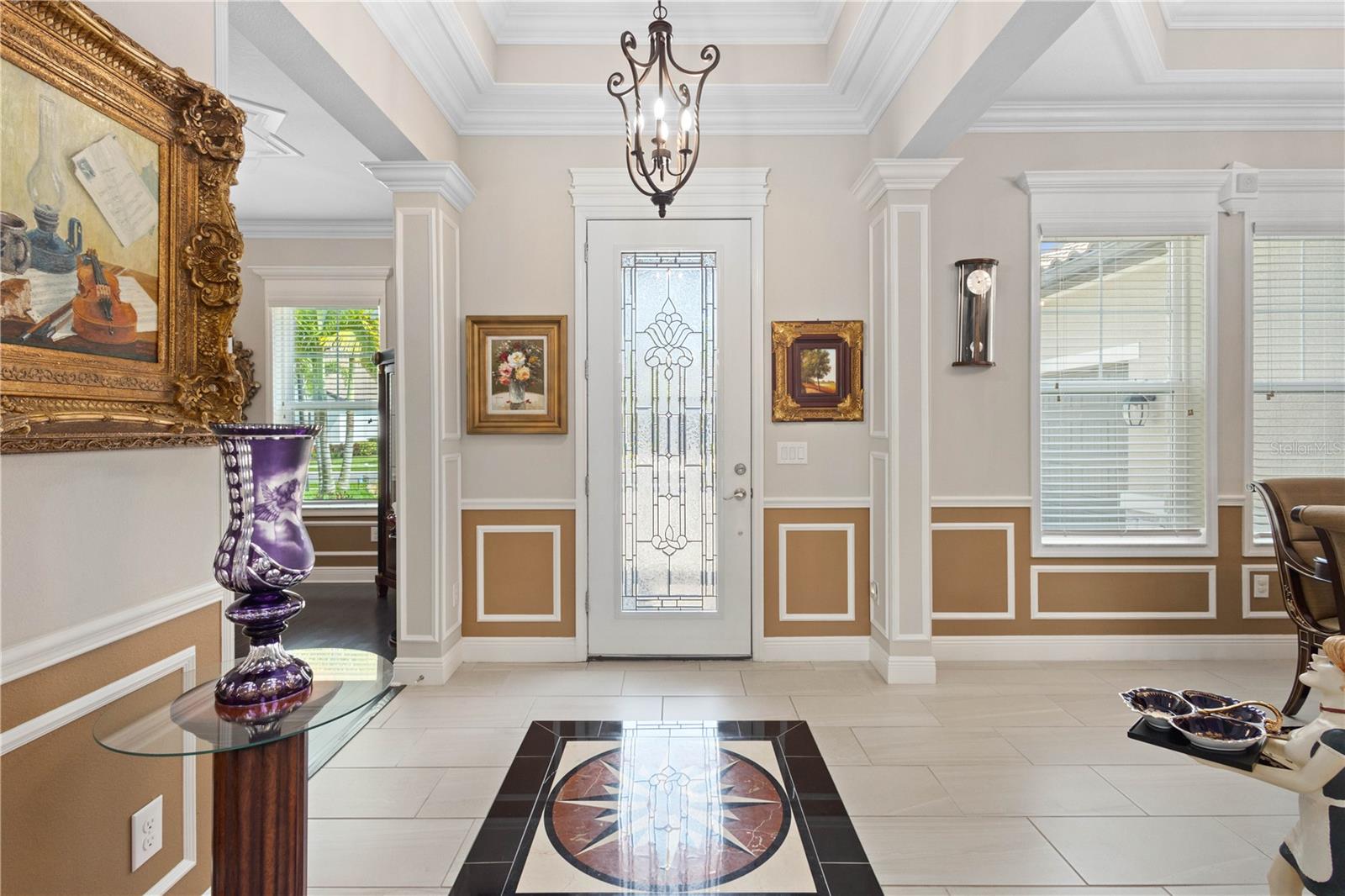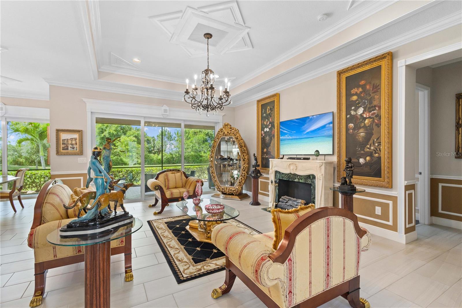 You will fall in love from the moment you walk in to the beautiful foyer of this Jubilee floor plan that consists of 4 bedrooms, 4 bathrooms plus bonus room, 2 separate dens, 3 car garage located on a tranquil lake. This home is light and bright, perfect for entertaining with it's spacious great room that is open to the gourmet kitchen boasting top of the line Cafe appliances consisting of a 5-burner gas cooktop and range hood, built in oven and convection/microwave oven, dishwasher, French door refrigerator that includes instant hot water, expansive center island with seating, three chandeliers, large stainless sink, gorgeous granite counters with subway tile back splash, shaker wood cabinetry with lots of drawers, and walk in pantry. Butlers pantry is perfect for a coffee bar which includes a wine refrigerator. The convenient first-floor owner's suite leaves nothing to be desired with a show stopping walk-in closet with custom built-ins and safe, quartz counters, two sinks and large cabinetry, soaking tub, walk-in roman shower with seat, and separate water closet. The main floor has two additional bedrooms which makes this home a perfect split plan. Laundry room includes washer, dryer and pedestal sink. Upstairs has a large bonus room with walk-in closet for additional storage, another bedroom with a built in safe located in the closet plus an additional full bathroom. The owners have spared no expense in creating a luxurious comfortable home featuring 10' ceilings, 8' doors, tray ceilings, recessed lighting, tile flooring throughout the home including custom inlays with the exception of hardwood located in the two dens, custom crown molding, wainscoting, chair railing, and detailed wood working around the windows and on the ceilings have been adorned. Enjoy relaxing on the screened in lanai over looking the peaceful lake. You will have peace of mind knowing the windows are impact glass resistant, 2 Carrier A/C units, tankless gas water heater, irrigation system with reclaimed water, and rain gutters. This home has been meticulously maintained and cared for creating a welcoming and inviting space for all that enter. Rivo Lakes is a gated community with LOW HOA Fees and NO CDD FEES conveniently located to Siesta Key, the beaches, shopping, restaurants, hospitals, downtown Sarasota, UTC, airports, and I-75.