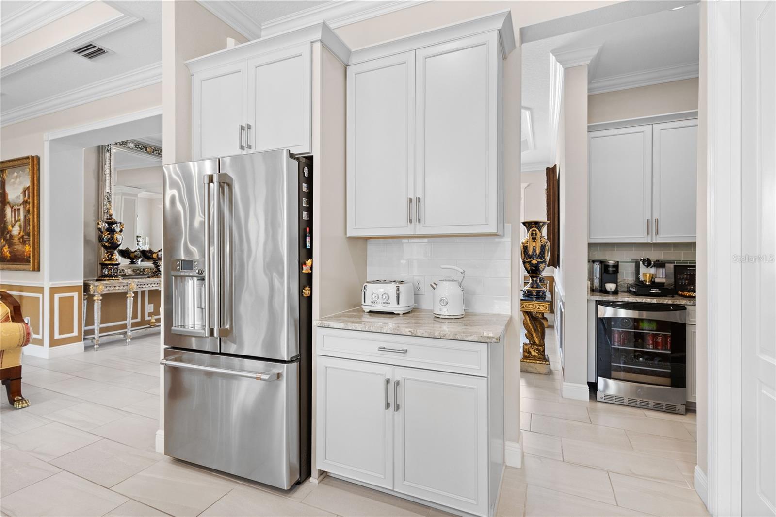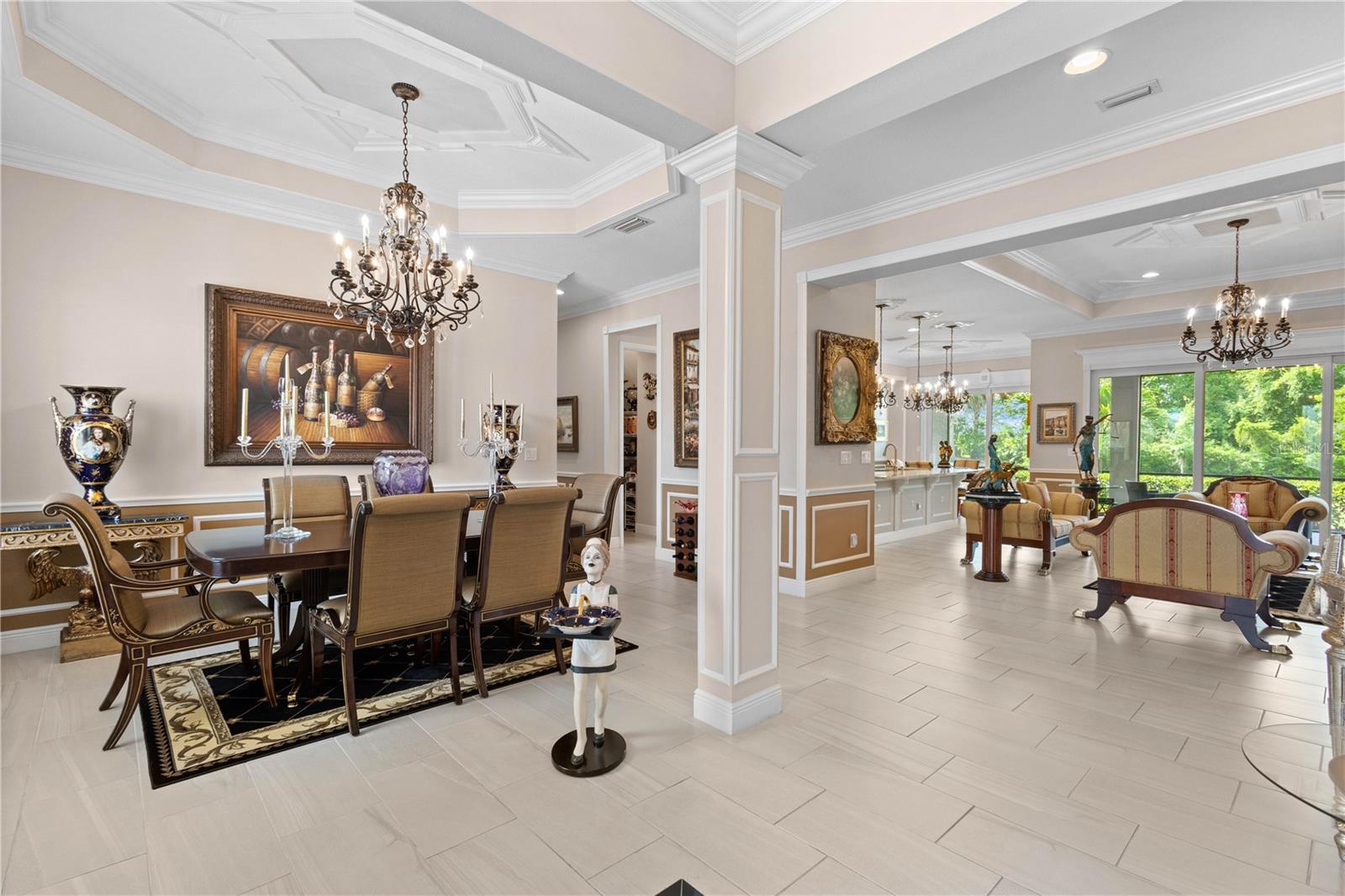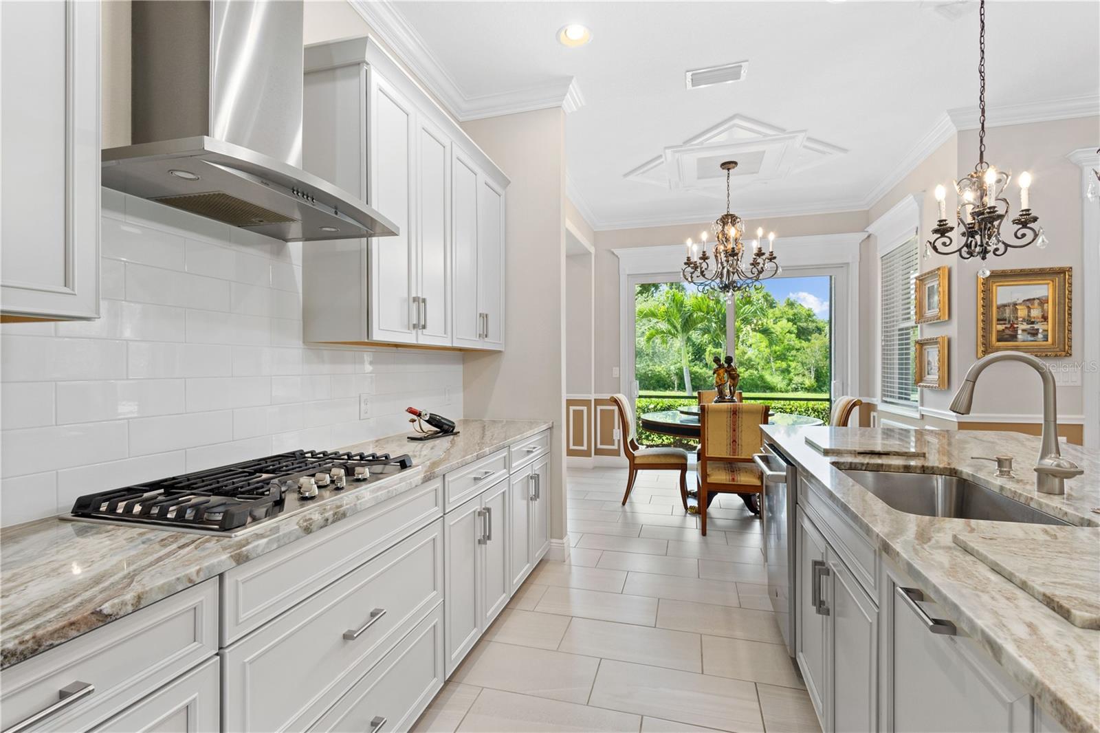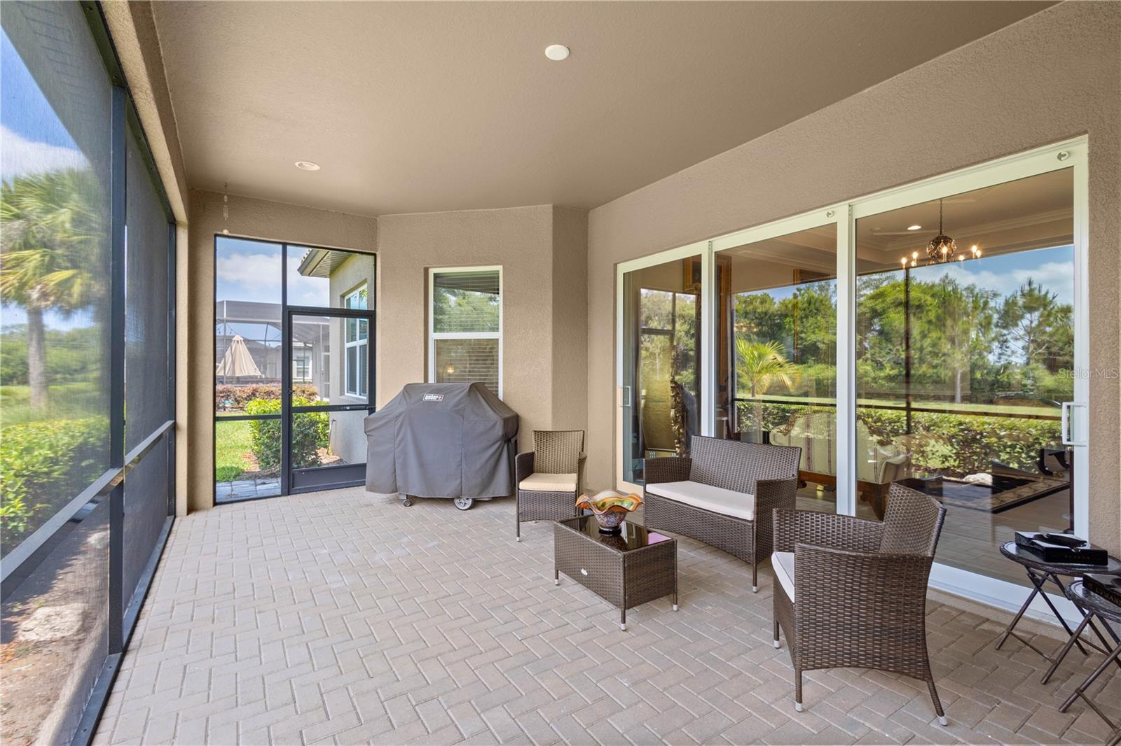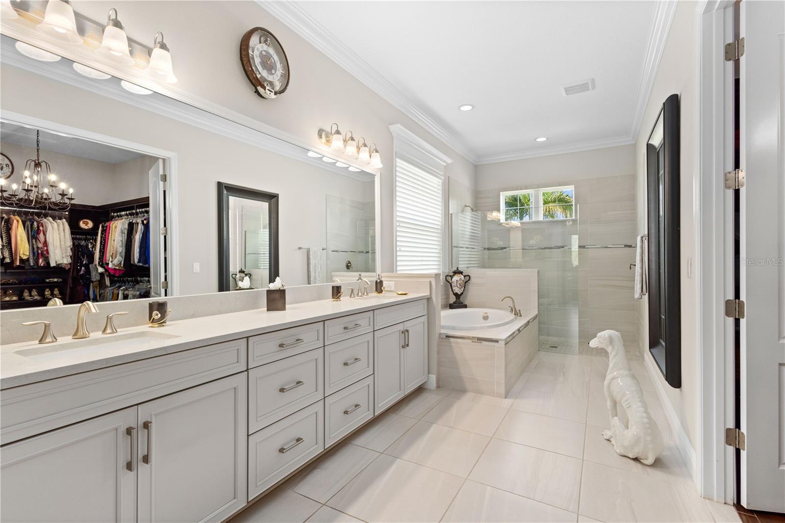 You will fall in love from the moment you walk in to the beautiful foyer of this Jubilee floor plan that consists of 4 bedrooms, 4 bathrooms plus bonus room, 2 separate dens, 3 car garage located on a tranquil lake. This home is light and bright, perfect for entertaining with it's spacious great room that is open to the gourmet kitchen boasting top of the line Cafe appliances consisting of a 5-burner gas cooktop and range hood, built in oven and convection/microwave oven, dishwasher, French door refrigerator that includes instant hot water, expansive center island with seating, three chandeliers, large stainless sink, gorgeous granite counters with subway tile back splash, shaker wood cabinetry with lots of drawers, and walk in pantry. Butlers pantry is perfect for a coffee bar which includes a wine refrigerator. The convenient first-floor owner's suite leaves nothing to be desired with a show stopping walk-in closet with custom built-ins and safe, quartz counters, two sinks and large cabinetry, soaking tub, walk-in roman shower with seat, and separate water closet. The main floor has two additional bedrooms which makes this home a perfect split plan. Laundry room includes washer, dryer and pedestal sink. Upstairs has a large bonus room with walk-in closet for additional storage, another bedroom with a built in safe located in the closet plus an additional full bathroom. The owners have spared no expense in creating a luxurious comfortable home featuring 10' ceilings, 8' doors, tray ceilings, recessed lighting, tile flooring throughout the home including custom inlays with the exception of hardwood located in the two dens, custom crown molding, wainscoting, chair railing, and detailed wood working around the windows and on the ceilings have been adorned. Enjoy relaxing on the screened in lanai over looking the peaceful lake. You will have peace of mind knowing the windows are impact glass resistant, 2 Carrier A/C units, tankless gas water heater, irrigation system with reclaimed water, and rain gutters. This home has been meticulously maintained and cared for creating a welcoming and inviting space for all that enter. Rivo Lakes is a gated community with LOW HOA Fees and NO CDD FEES conveniently located to Siesta Key, the beaches, shopping, restaurants, hospitals, downtown Sarasota, UTC, airports, and I-75.