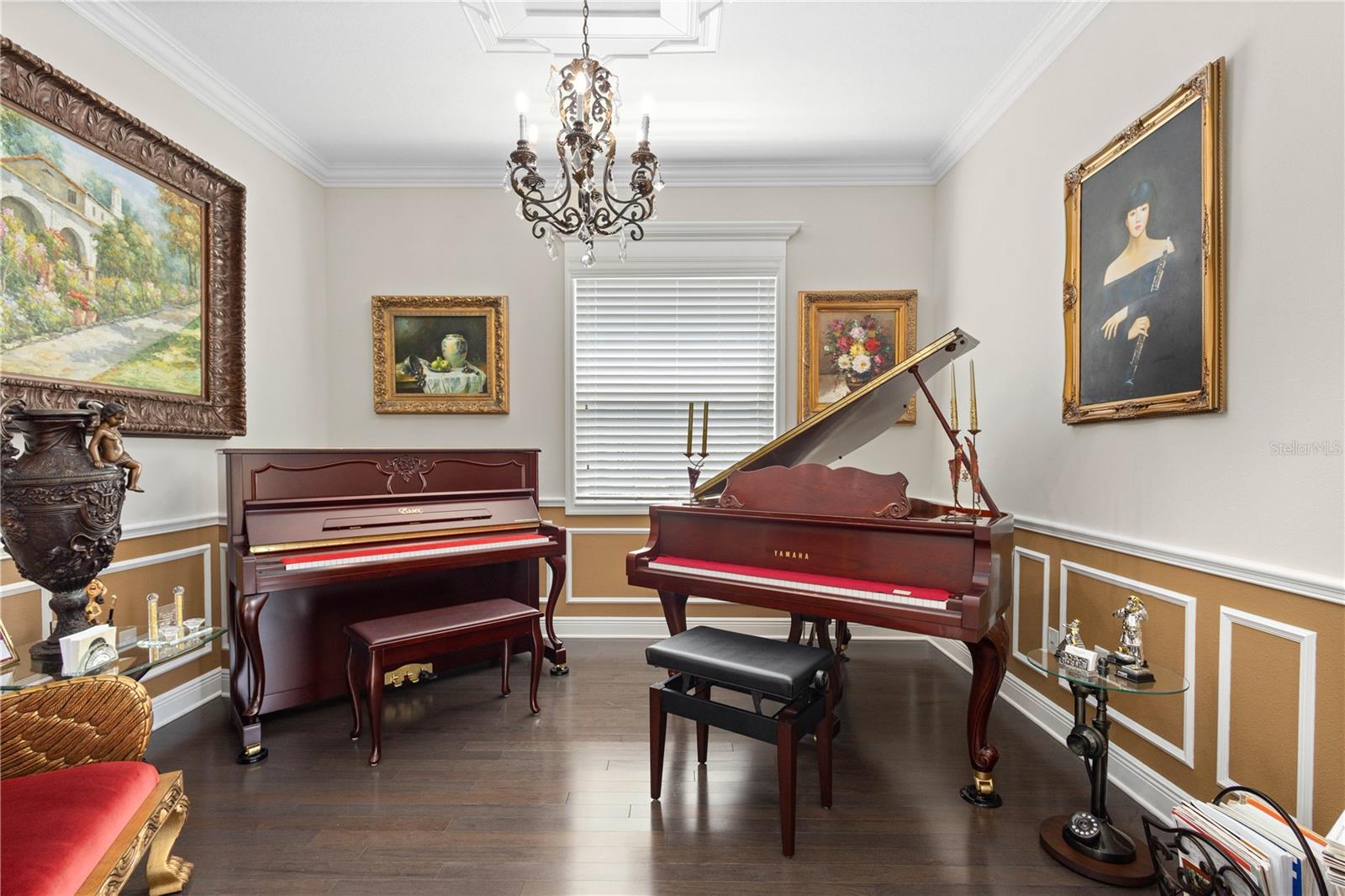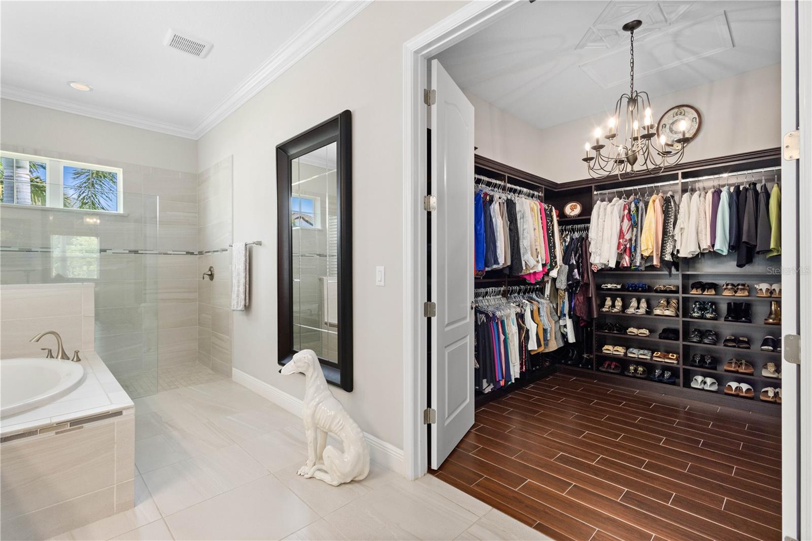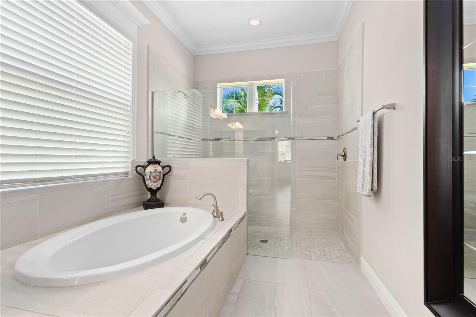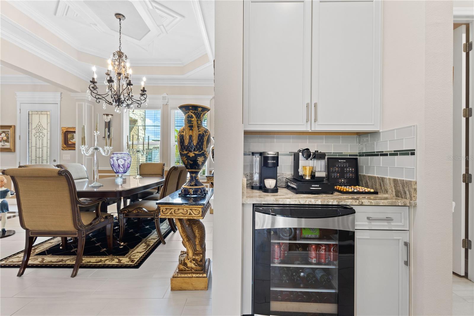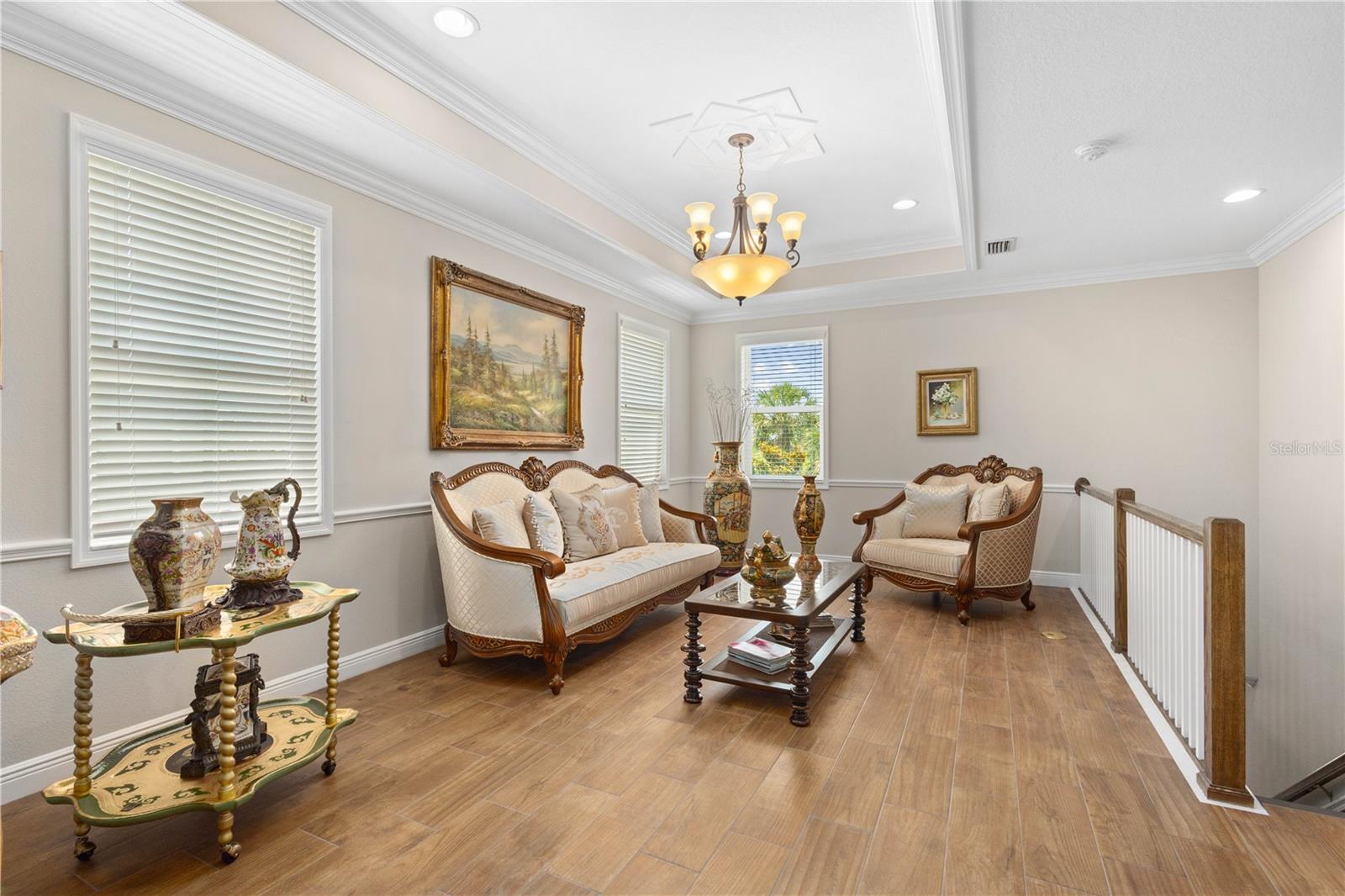 You will fall in love from the moment you walk in to the beautiful foyer of this Jubilee floor plan that consists of 4 bedrooms, 4 bathrooms plus bonus room, 2 separate dens, 3 car garage located on a tranquil lake. This home is light and bright, perfect for entertaining with it's spacious great room that is open to the gourmet kitchen boasting top of the line Cafe appliances consisting of a 5-burner gas cooktop and range hood, built in oven and convection/microwave oven, dishwasher, French door refrigerator that includes instant hot water, expansive center island with seating, three chandeliers, large stainless sink, gorgeous granite counters with subway tile back splash, shaker wood cabinetry with lots of drawers, and walk in pantry. Butlers pantry is perfect for a coffee bar which includes a wine refrigerator. The convenient first-floor owner's suite leaves nothing to be desired with a show stopping walk-in closet with custom built-ins and safe, quartz counters, two sinks and large cabinetry, soaking tub, walk-in roman shower with seat, and separate water closet. The main floor has two additional bedrooms which makes this home a perfect split plan. Laundry room includes washer, dryer and pedestal sink. Upstairs has a large bonus room with walk-in closet for additional storage, another bedroom with a built in safe located in the closet plus an additional full bathroom. The owners have spared no expense in creating a luxurious comfortable home featuring 10' ceilings, 8' doors, tray ceilings, recessed lighting, tile flooring throughout the home including custom inlays with the exception of hardwood located in the two dens, custom crown molding, wainscoting, chair railing, and detailed wood working around the windows and on the ceilings have been adorned. Enjoy relaxing on the screened in lanai over looking the peaceful lake. You will have peace of mind knowing the windows are impact glass resistant, 2 Carrier A/C units, tankless gas water heater, irrigation system with reclaimed water, and rain gutters. This home has been meticulously maintained and cared for creating a welcoming and inviting space for all that enter. Rivo Lakes is a gated community with LOW HOA Fees and NO CDD FEES conveniently located to Siesta Key, the beaches, shopping, restaurants, hospitals, downtown Sarasota, UTC, airports, and I-75.