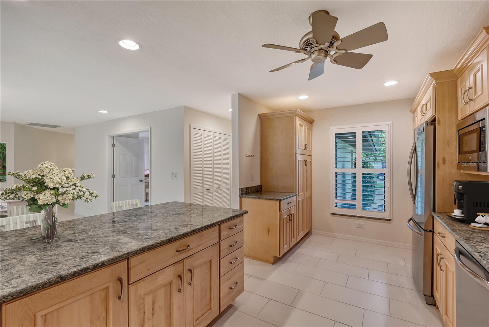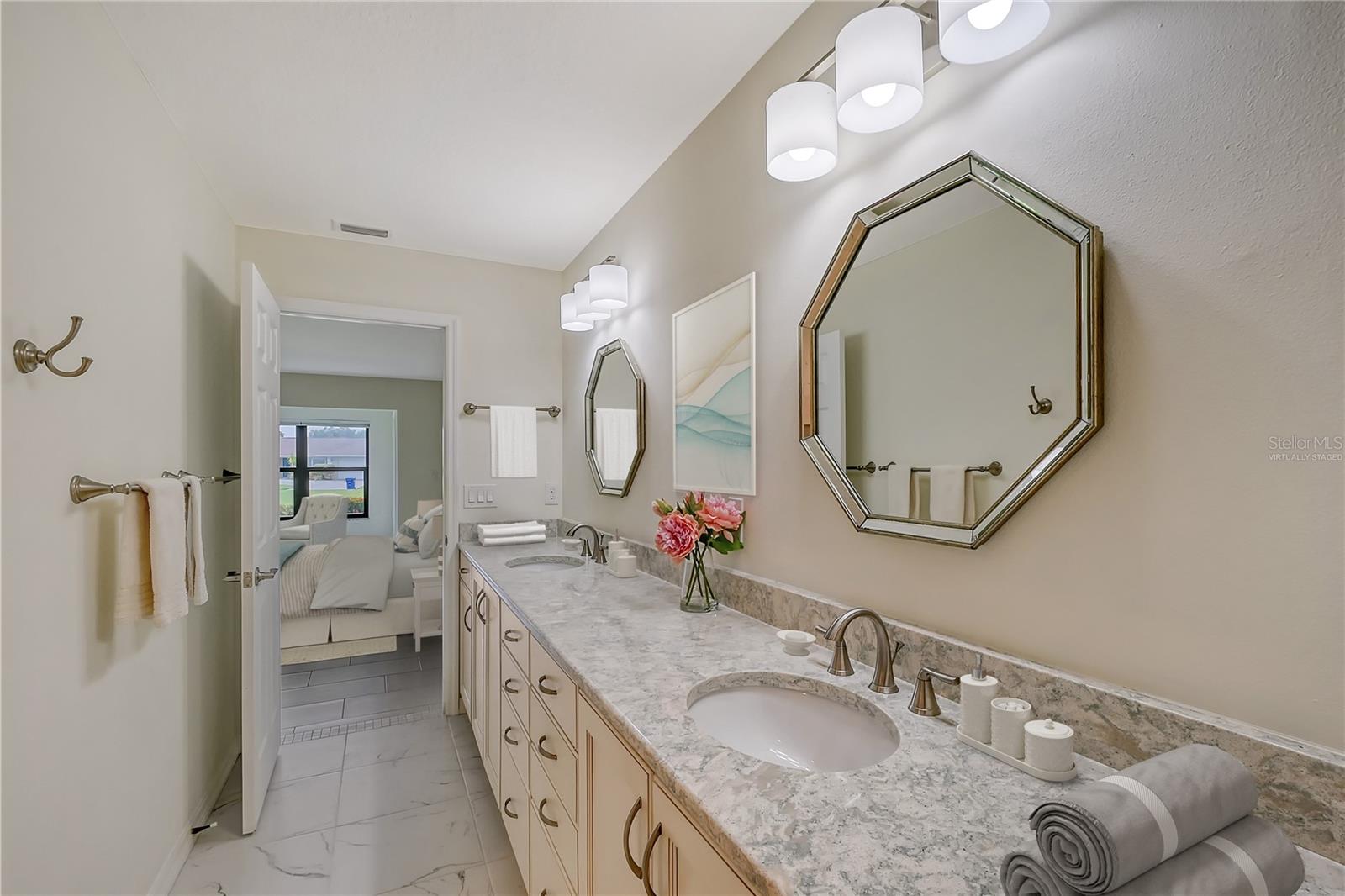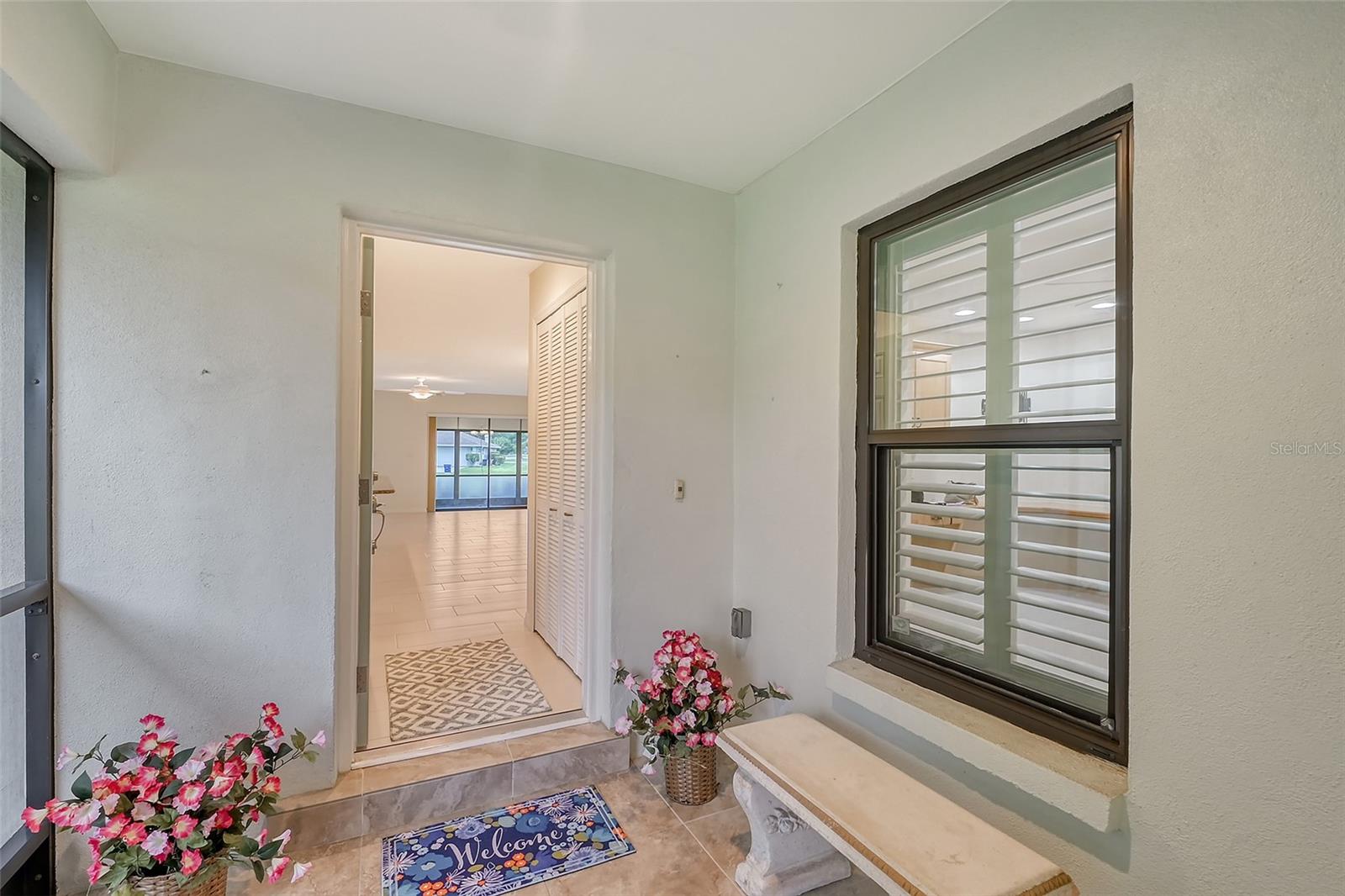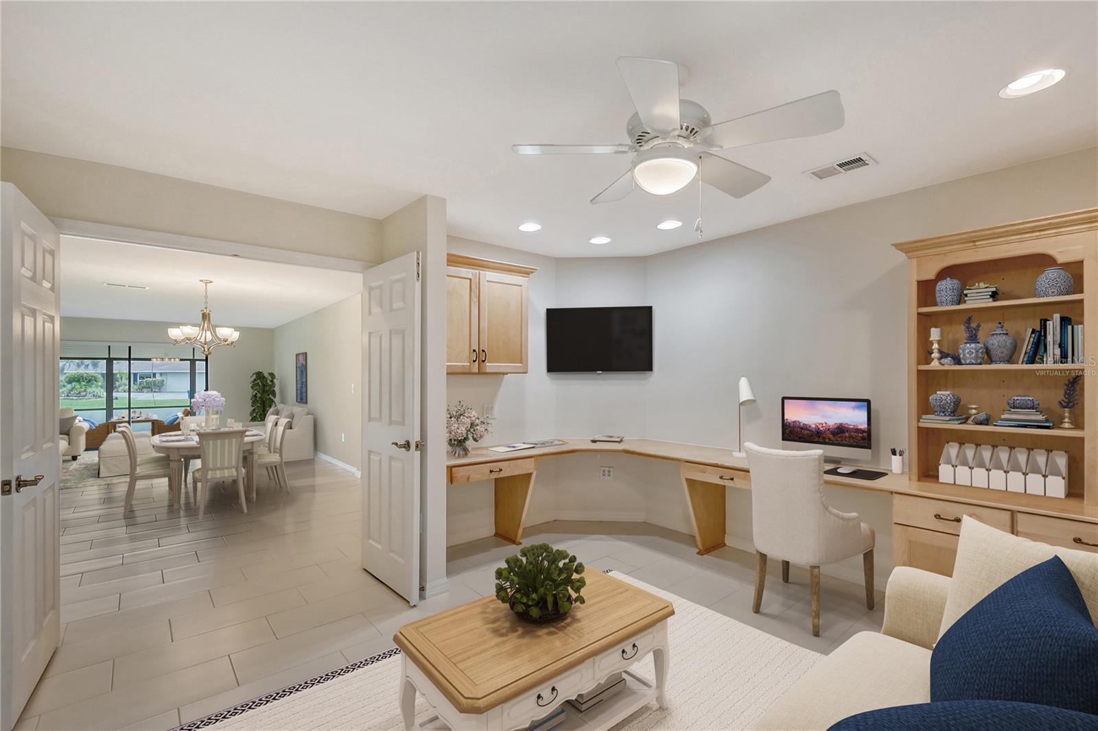 One or more photo(s) has been virtually staged. Experience serenity & comfort in this exquisite maintenance free end unit villa,2 bedroom,2 bath plus an office / study with custom built ins. Access your new home through the private gated entry. Escape the daily hustle & bustle, & embrace tranquility & comfort in this beautifully updated end unit villa. Perfect for those seeking a peaceful retreat without the hassle of constant maintenance or long commutes, this villa offers a unique blend of modern amenities, natural beauty & is a testament to meticulous care & quality updates. Freshly painted in neutral tones, the spacious open floor plan is enhanced with built-ins adding both functionality & charm. The serene neighborhood, adorned with mature landscaping & waterways, is home to a variety of resident birds, providing a picturesque backdrop for daily living. Enter through the covered & screened breezeway that connects the oversized two-car garage to the home. The garage features an epoxy moisture mitigation flooring system, painted ceiling & walls, & new 2023 Lift Master garage door openers. Additionally, a Kinetico Water Softener ensures soft water throughout the home, enhancing comfort & convenience. The luxurious interior features 12” by 24” porcelain tiles with grout sealer throughout, ensuring durability & easy maintenance. The custom kitchen is a chef's dream, featuring maple cabinetry beautifully crafted & spacious with quartz countertops both elegant & functional. The marble backsplash adds a touch of luxury. LED under cabinet lighting enhances visibility & ambiance. Innovative storage & operation solutions include a Rev-a-Lift for a mixer, coffee station, large pantry, rollout drawers everywhere, spice rack, utensil bin built-in, cutlery inserts, trash inserts & extensive work area. The spacious primary suite is bathed in natural light & offers stunning views of the greenbelt & golf course, with features including a walk-in closet with built-ins, providing ample storage. There are even two additional closets. The elegant ensuite bathroom boasts a dual sink vanity with a sparkling quartz countertop & an oversized walk-in shower with a built-in bench. The windows are equipped with full blackout adjustable custom blinds. The large guest bedroom offers comfortable guest accommodations situated at the opposite end of the villa for privacy, including a large walk-in closet with custom built-ins. The second bathroom mirrors the elegance of the primary suite, featuring a stylish shower & quartz countertops. The study, accessible through double doors, features a beautiful maple built-in desk with file drawers & book shelves. It can easily be converted into a third bedroom or serve as an occasional guest room with a pullout sofa. This villa is equipped with numerous hidden features that enhance its value & livability. There were PVC sewer lines installed throughout the home in 2015, water heater 2015, HVAC System 2018, with 10-year extended warranty, lightning surge protector, dehumidifier, & a complete home air purifier. Hurricane windows are installed throughout for added safety & shutters on lanai with all window treatments included. New roof May 2024. This exquisite end unit villa offers a rare combination of quality, comfort, modern amenities, meticulous maintenance, & serene surroundings providing a retreat for those seeking a peaceful & hassle-free lifestyle. Move right in & start enjoying the tranquility & elegance of this exceptional home & neighborhood!