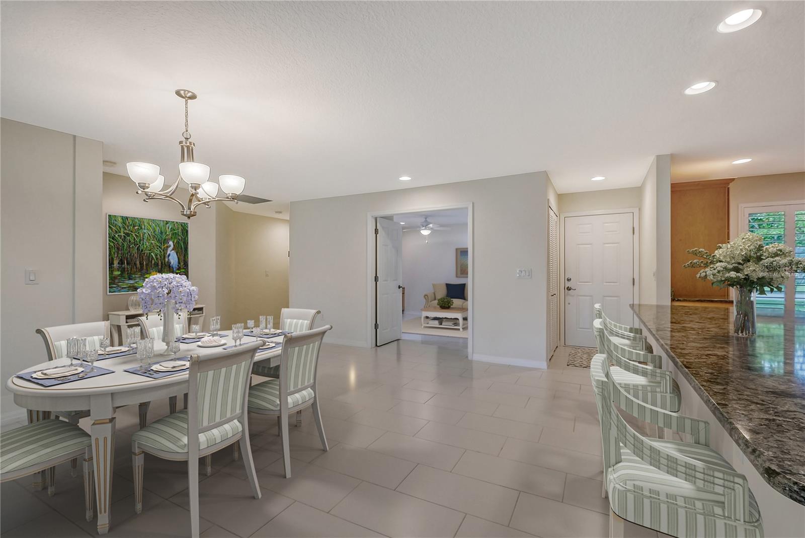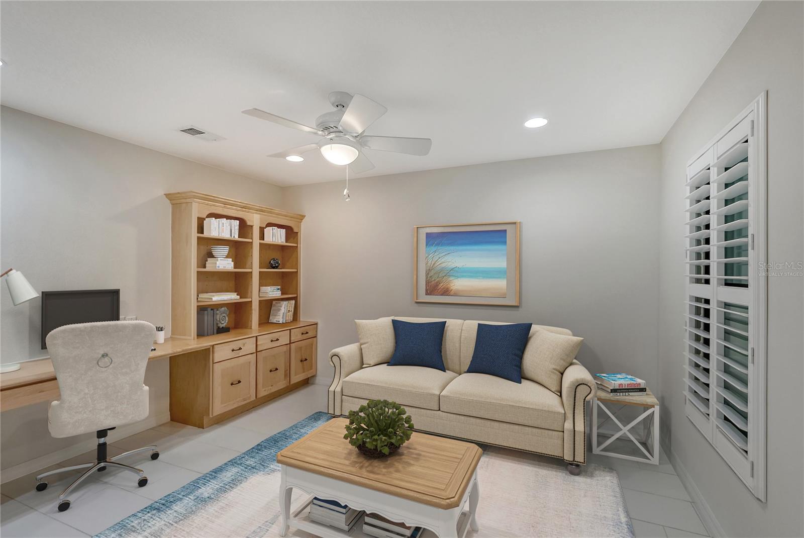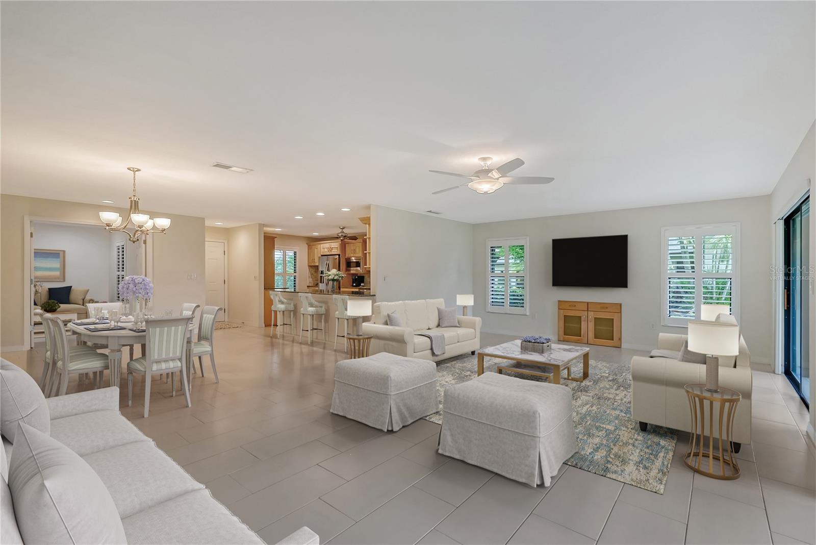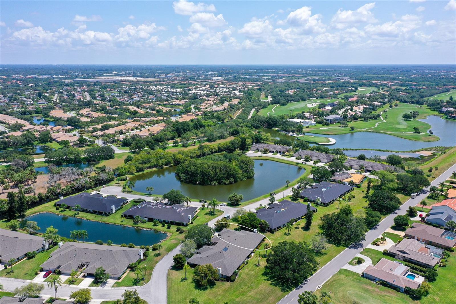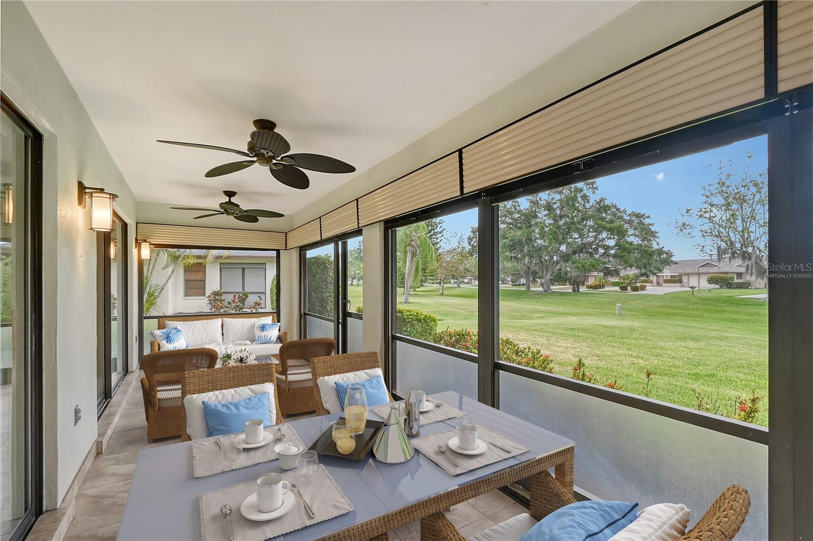 One or more photo(s) has been virtually staged. Experience serenity & comfort in this exquisite maintenance free end unit villa,2 bedroom,2 bath plus an office / study with custom built ins. Access your new home through the private gated entry. Escape the daily hustle & bustle, & embrace tranquility & comfort in this beautifully updated end unit villa. Perfect for those seeking a peaceful retreat without the hassle of constant maintenance or long commutes, this villa offers a unique blend of modern amenities, natural beauty & is a testament to meticulous care & quality updates. Freshly painted in neutral tones, the spacious open floor plan is enhanced with built-ins adding both functionality & charm. The serene neighborhood, adorned with mature landscaping & waterways, is home to a variety of resident birds, providing a picturesque backdrop for daily living. Enter through the covered & screened breezeway that connects the oversized two-car garage to the home. The garage features an epoxy moisture mitigation flooring system, painted ceiling & walls, & new 2023 Lift Master garage door openers. Additionally, a Kinetico Water Softener ensures soft water throughout the home, enhancing comfort & convenience. The luxurious interior features 12” by 24” porcelain tiles with grout sealer throughout, ensuring durability & easy maintenance. The custom kitchen is a chef's dream, featuring maple cabinetry beautifully crafted & spacious with quartz countertops both elegant & functional. The marble backsplash adds a touch of luxury. LED under cabinet lighting enhances visibility & ambiance. Innovative storage & operation solutions include a Rev-a-Lift for a mixer, coffee station, large pantry, rollout drawers everywhere, spice rack, utensil bin built-in, cutlery inserts, trash inserts & extensive work area. The spacious primary suite is bathed in natural light & offers stunning views of the greenbelt & golf course, with features including a walk-in closet with built-ins, providing ample storage. There are even two additional closets. The elegant ensuite bathroom boasts a dual sink vanity with a sparkling quartz countertop & an oversized walk-in shower with a built-in bench. The windows are equipped with full blackout adjustable custom blinds. The large guest bedroom offers comfortable guest accommodations situated at the opposite end of the villa for privacy, including a large walk-in closet with custom built-ins. The second bathroom mirrors the elegance of the primary suite, featuring a stylish shower & quartz countertops. The study, accessible through double doors, features a beautiful maple built-in desk with file drawers & book shelves. It can easily be converted into a third bedroom or serve as an occasional guest room with a pullout sofa. This villa is equipped with numerous hidden features that enhance its value & livability. There were PVC sewer lines installed throughout the home in 2015, water heater 2015, HVAC System 2018, with 10-year extended warranty, lightning surge protector, dehumidifier, & a complete home air purifier. Hurricane windows are installed throughout for added safety & shutters on lanai with all window treatments included. New roof May 2024. This exquisite end unit villa offers a rare combination of quality, comfort, modern amenities, meticulous maintenance, & serene surroundings providing a retreat for those seeking a peaceful & hassle-free lifestyle. Move right in & start enjoying the tranquility & elegance of this exceptional home & neighborhood!
