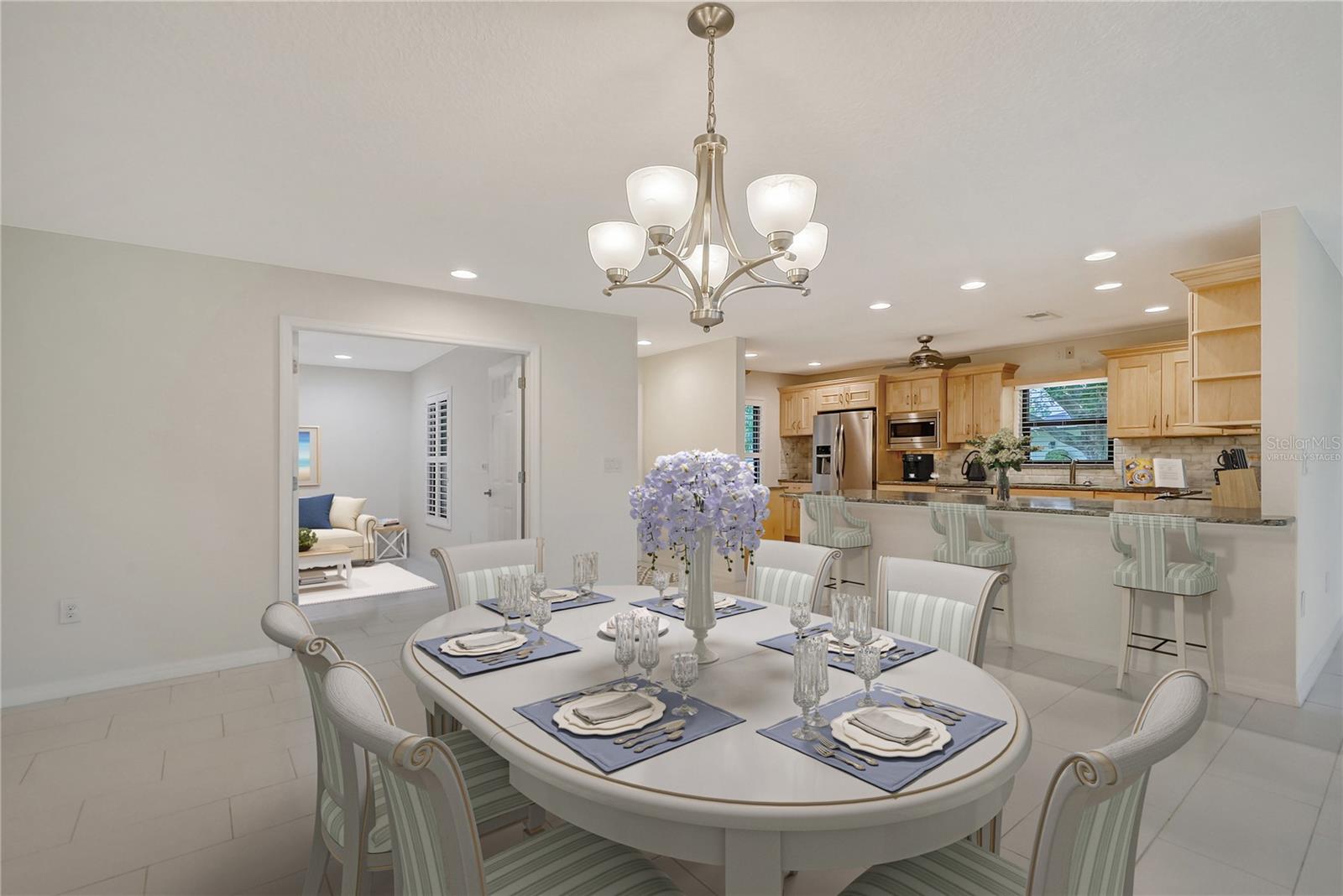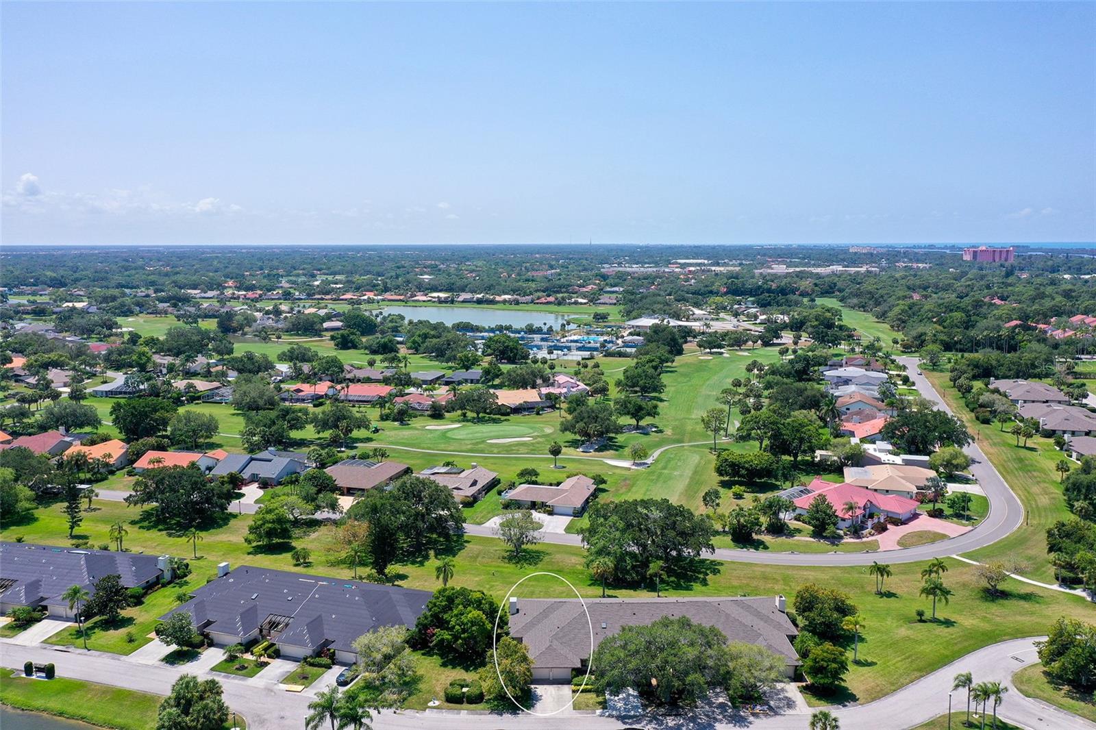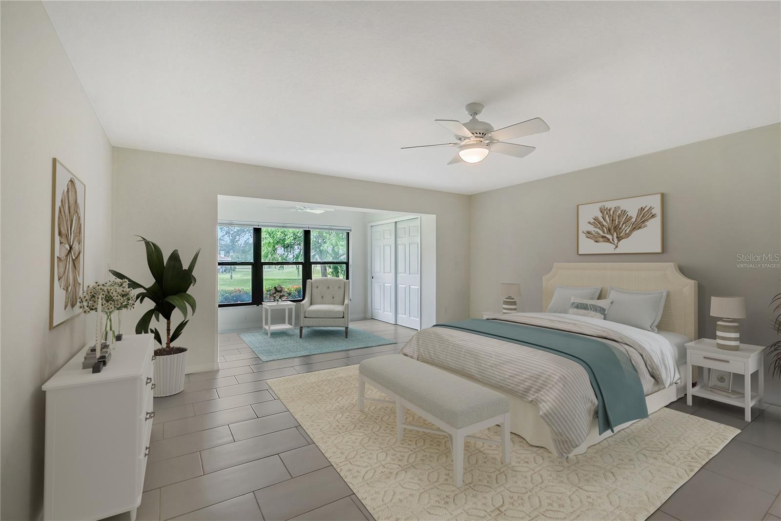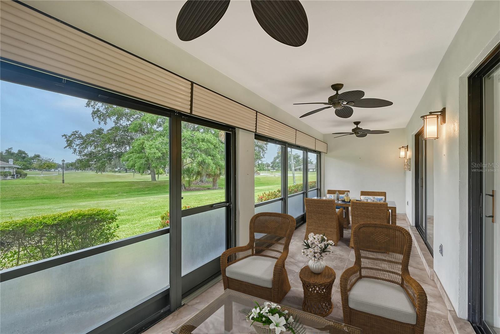 One or more photo(s) has been virtually staged. Experience serenity & comfort in this exquisite maintenance free end unit villa,2 bedroom,2 bath plus an office / study with custom built ins. Access your new home through the private gated entry. Escape the daily hustle & bustle, & embrace tranquility & comfort in this beautifully updated end unit villa. Perfect for those seeking a peaceful retreat without the hassle of constant maintenance or long commutes, this villa offers a unique blend of modern amenities, natural beauty & is a testament to meticulous care & quality updates. Freshly painted in neutral tones, the spacious open floor plan is enhanced with built-ins adding both functionality & charm. The serene neighborhood, adorned with mature landscaping & waterways, is home to a variety of resident birds, providing a picturesque backdrop for daily living. Enter through the covered & screened breezeway that connects the oversized two-car garage to the home. The garage features an epoxy moisture mitigation flooring system, painted ceiling & walls, & new 2023 Lift Master garage door openers. Additionally, a Kinetico Water Softener ensures soft water throughout the home, enhancing comfort & convenience. The luxurious interior features 12” by 24” porcelain tiles with grout sealer throughout, ensuring durability & easy maintenance. The custom kitchen is a chef's dream, featuring maple cabinetry beautifully crafted & spacious with quartz countertops both elegant & functional. The marble backsplash adds a touch of luxury. LED under cabinet lighting enhances visibility & ambiance. Innovative storage & operation solutions include a Rev-a-Lift for a mixer, coffee station, large pantry, rollout drawers everywhere, spice rack, utensil bin built-in, cutlery inserts, trash inserts & extensive work area. The spacious primary suite is bathed in natural light & offers stunning views of the greenbelt & golf course, with features including a walk-in closet with built-ins, providing ample storage. There are even two additional closets. The elegant ensuite bathroom boasts a dual sink vanity with a sparkling quartz countertop & an oversized walk-in shower with a built-in bench. The windows are equipped with full blackout adjustable custom blinds. The large guest bedroom offers comfortable guest accommodations situated at the opposite end of the villa for privacy, including a large walk-in closet with custom built-ins. The second bathroom mirrors the elegance of the primary suite, featuring a stylish shower & quartz countertops. The study, accessible through double doors, features a beautiful maple built-in desk with file drawers & book shelves. It can easily be converted into a third bedroom or serve as an occasional guest room with a pullout sofa. This villa is equipped with numerous hidden features that enhance its value & livability. There were PVC sewer lines installed throughout the home in 2015, water heater 2015, HVAC System 2018, with 10-year extended warranty, lightning surge protector, dehumidifier, & a complete home air purifier. Hurricane windows are installed throughout for added safety & shutters on lanai with all window treatments included. New roof May 2024. This exquisite end unit villa offers a rare combination of quality, comfort, modern amenities, meticulous maintenance, & serene surroundings providing a retreat for those seeking a peaceful & hassle-free lifestyle. Move right in & start enjoying the tranquility & elegance of this exceptional home & neighborhood!