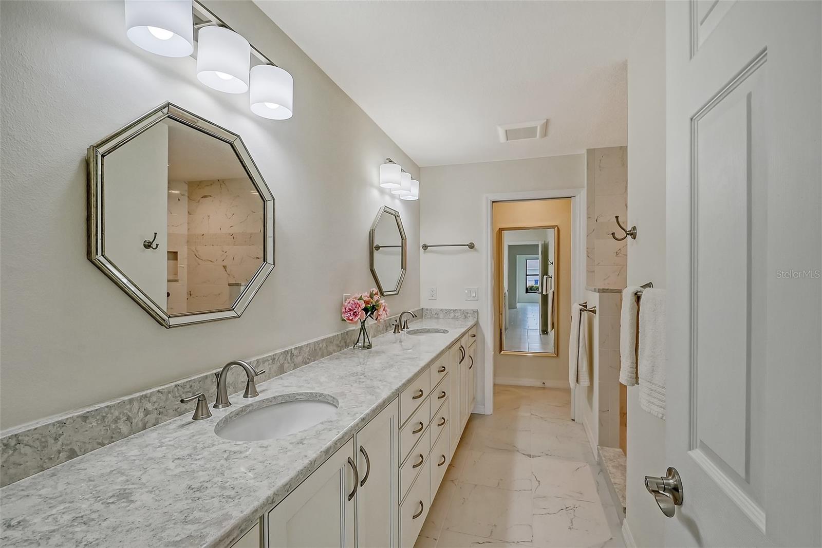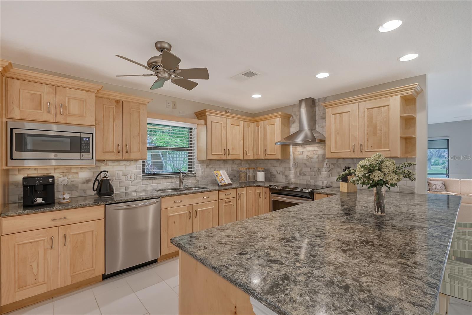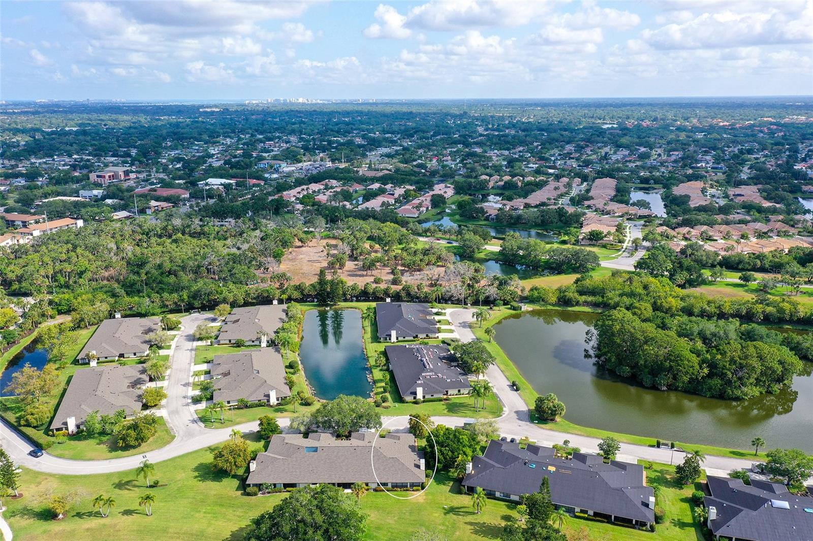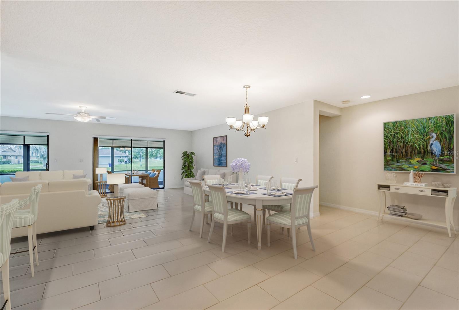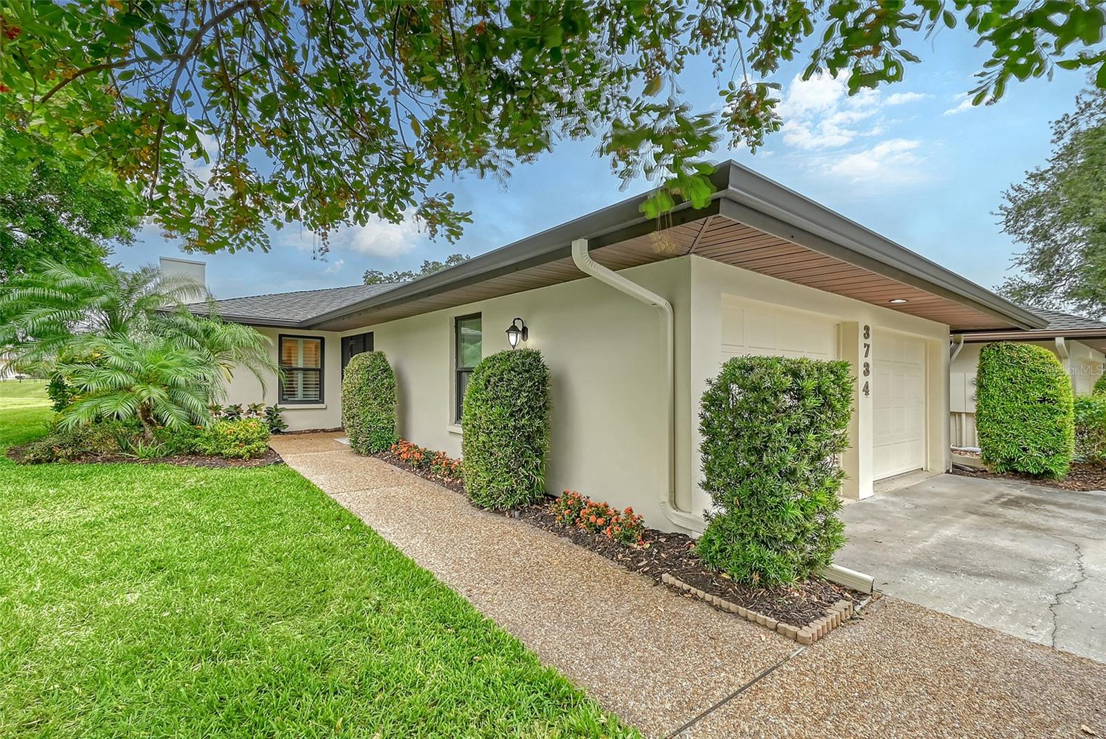 One or more photo(s) has been virtually staged. Experience serenity & comfort in this exquisite maintenance free end unit villa,2 bedroom,2 bath plus an office / study with custom built ins. Access your new home through the private gated entry. Escape the daily hustle & bustle, & embrace tranquility & comfort in this beautifully updated end unit villa. Perfect for those seeking a peaceful retreat without the hassle of constant maintenance or long commutes, this villa offers a unique blend of modern amenities, natural beauty & is a testament to meticulous care & quality updates. Freshly painted in neutral tones, the spacious open floor plan is enhanced with built-ins adding both functionality & charm. The serene neighborhood, adorned with mature landscaping & waterways, is home to a variety of resident birds, providing a picturesque backdrop for daily living. Enter through the covered & screened breezeway that connects the oversized two-car garage to the home. The garage features an epoxy moisture mitigation flooring system, painted ceiling & walls, & new 2023 Lift Master garage door openers. Additionally, a Kinetico Water Softener ensures soft water throughout the home, enhancing comfort & convenience. The luxurious interior features 12” by 24” porcelain tiles with grout sealer throughout, ensuring durability & easy maintenance. The custom kitchen is a chef's dream, featuring maple cabinetry beautifully crafted & spacious with quartz countertops both elegant & functional. The marble backsplash adds a touch of luxury. LED under cabinet lighting enhances visibility & ambiance. Innovative storage & operation solutions include a Rev-a-Lift for a mixer, coffee station, large pantry, rollout drawers everywhere, spice rack, utensil bin built-in, cutlery inserts, trash inserts & extensive work area. The spacious primary suite is bathed in natural light & offers stunning views of the greenbelt & golf course, with features including a walk-in closet with built-ins, providing ample storage. There are even two additional closets. The elegant ensuite bathroom boasts a dual sink vanity with a sparkling quartz countertop & an oversized walk-in shower with a built-in bench. The windows are equipped with full blackout adjustable custom blinds. The large guest bedroom offers comfortable guest accommodations situated at the opposite end of the villa for privacy, including a large walk-in closet with custom built-ins. The second bathroom mirrors the elegance of the primary suite, featuring a stylish shower & quartz countertops. The study, accessible through double doors, features a beautiful maple built-in desk with file drawers & book shelves. It can easily be converted into a third bedroom or serve as an occasional guest room with a pullout sofa. This villa is equipped with numerous hidden features that enhance its value & livability. There were PVC sewer lines installed throughout the home in 2015, water heater 2015, HVAC System 2018, with 10-year extended warranty, lightning surge protector, dehumidifier, & a complete home air purifier. Hurricane windows are installed throughout for added safety & shutters on lanai with all window treatments included. New roof May 2024. This exquisite end unit villa offers a rare combination of quality, comfort, modern amenities, meticulous maintenance, & serene surroundings providing a retreat for those seeking a peaceful & hassle-free lifestyle. Move right in & start enjoying the tranquility & elegance of this exceptional home & neighborhood!