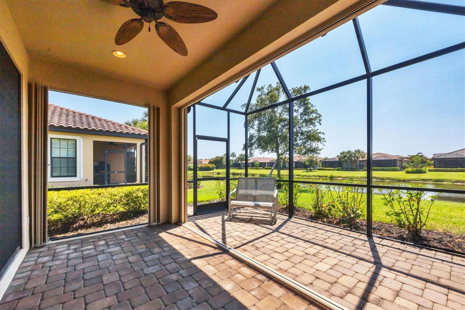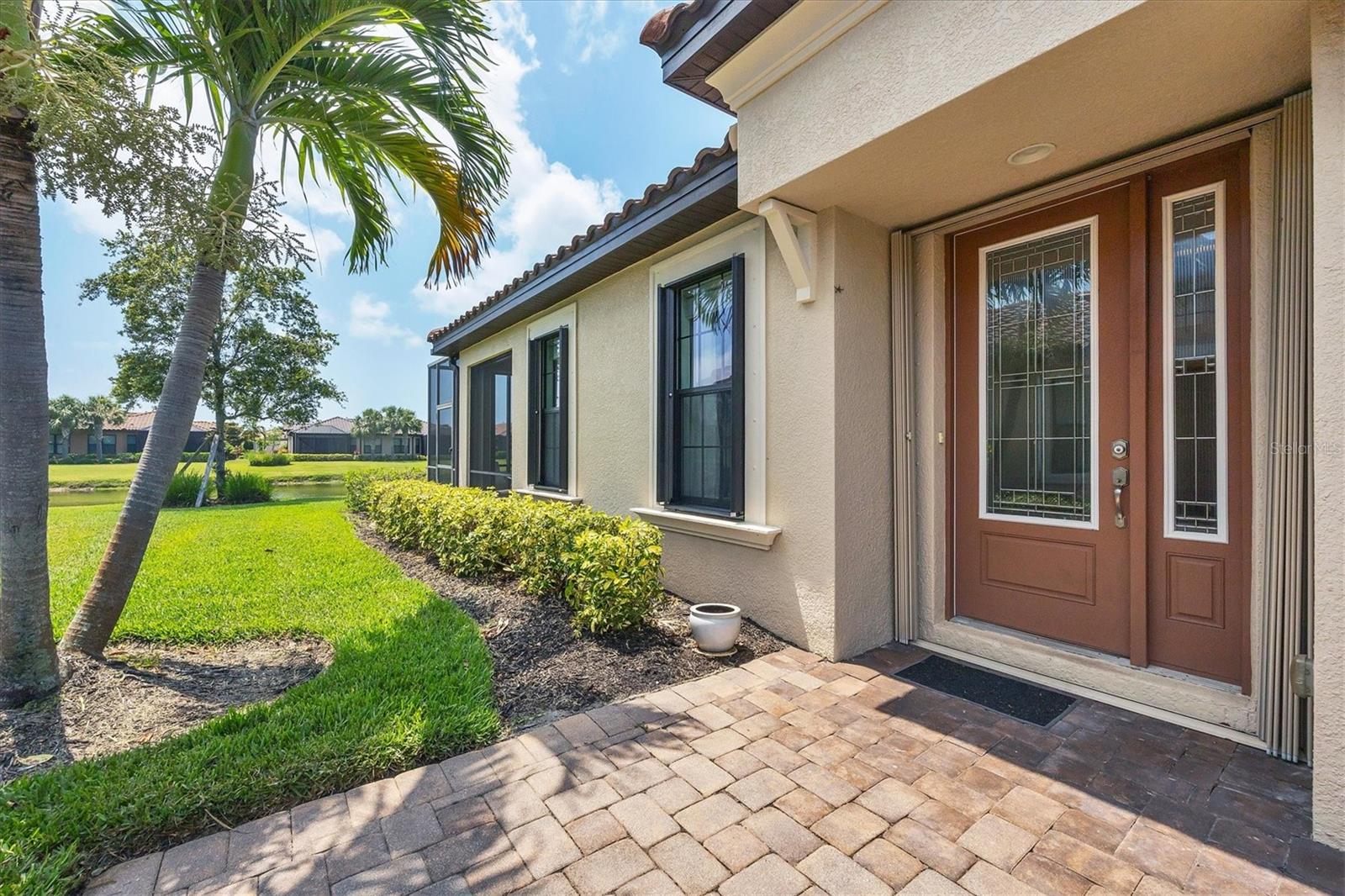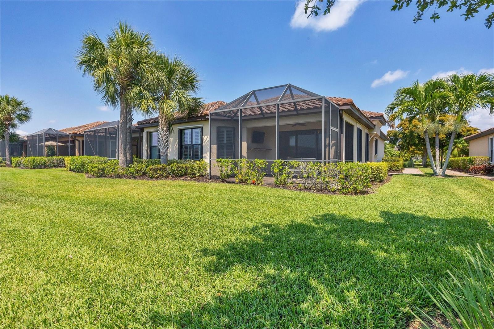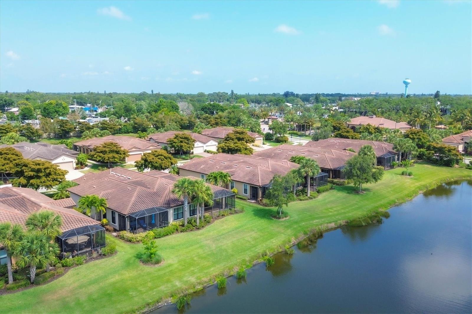 No Flooding with hurricane shutters and located in a fabulous location just one mile from Siesta Key. This rarely available villa home in Esplanade by Siesta Key, offers an active lifestyle, maintenance-free living, and gated resort-style amenities This spacious split-plan two-bedroom with den, two-bath one-level villa has an open floor plan, west-facing spacious screened-in lanai overlooking a very nice pond, two-car garage, and located just a few doors down from the amazing amenities center. The interior designer finishes have been upgraded, and the home offers crown molding, coffered ceiling in the great room, chair rails, and tray ceilings in the dining room, new refrigerator, range/oven, and microwave in the kitchen, three rooms of new neutral carpet, water softener in the garage, and natural gas for ease of cooking. More features include a spacious primary bedroom with a water view, plantation shutters, grab rails in the shower and water closet, very nicely sized walk-in closets in both bedrooms, ceiling fans throughout, and plenty of cabinets for storage in the kitchen and separate laundry room. Within the community, the residents enjoy a very social environment and access to a lagoon-style pool, pickleball, tennis on Har-Tru courts, a fitness center, a clubhouse with planned activities, a paw park, and sidewalks providing miles of walking and biking opportunities. The location is very central to dining, shopping, downtown Sarasota, and the beaches of Siesta Key. Very easy to show and move-in ready.