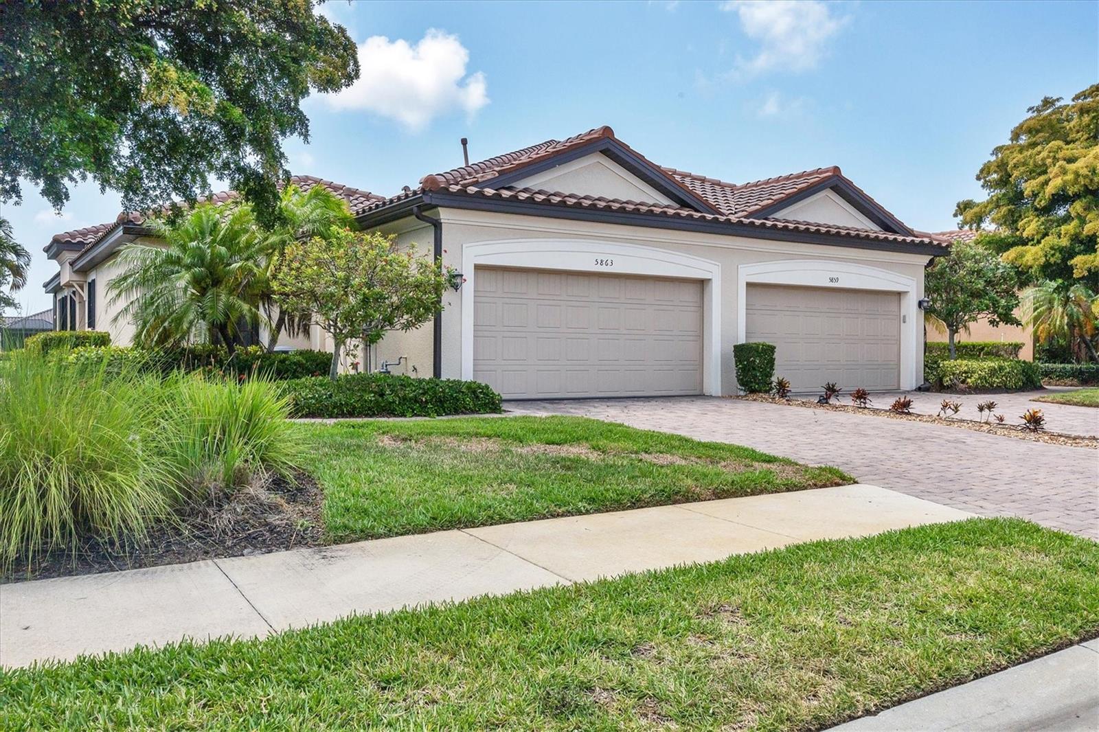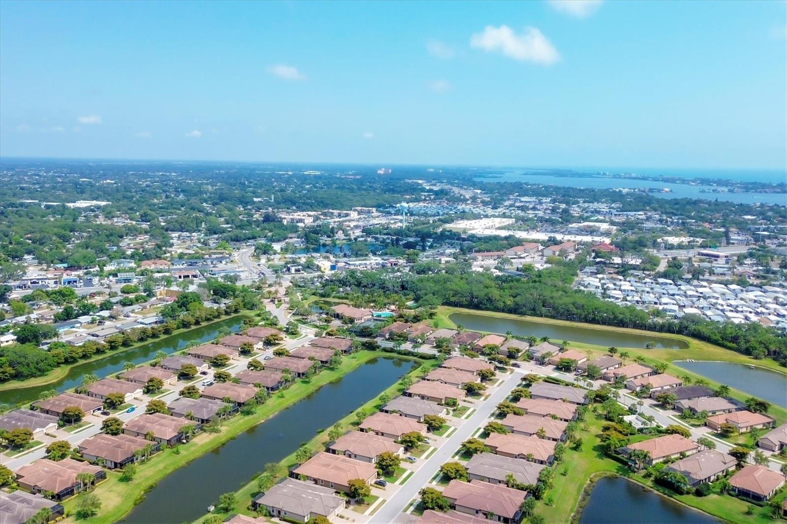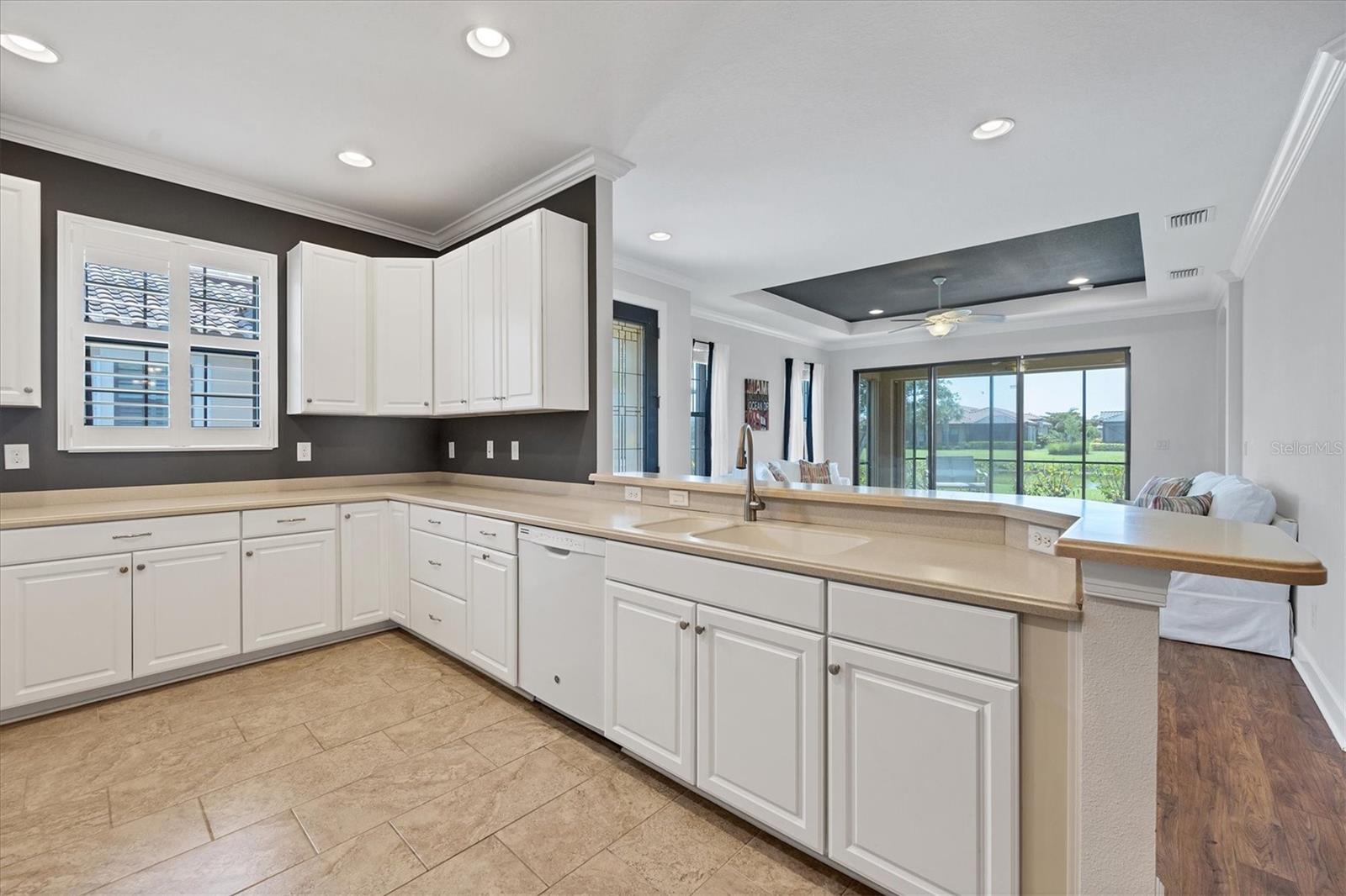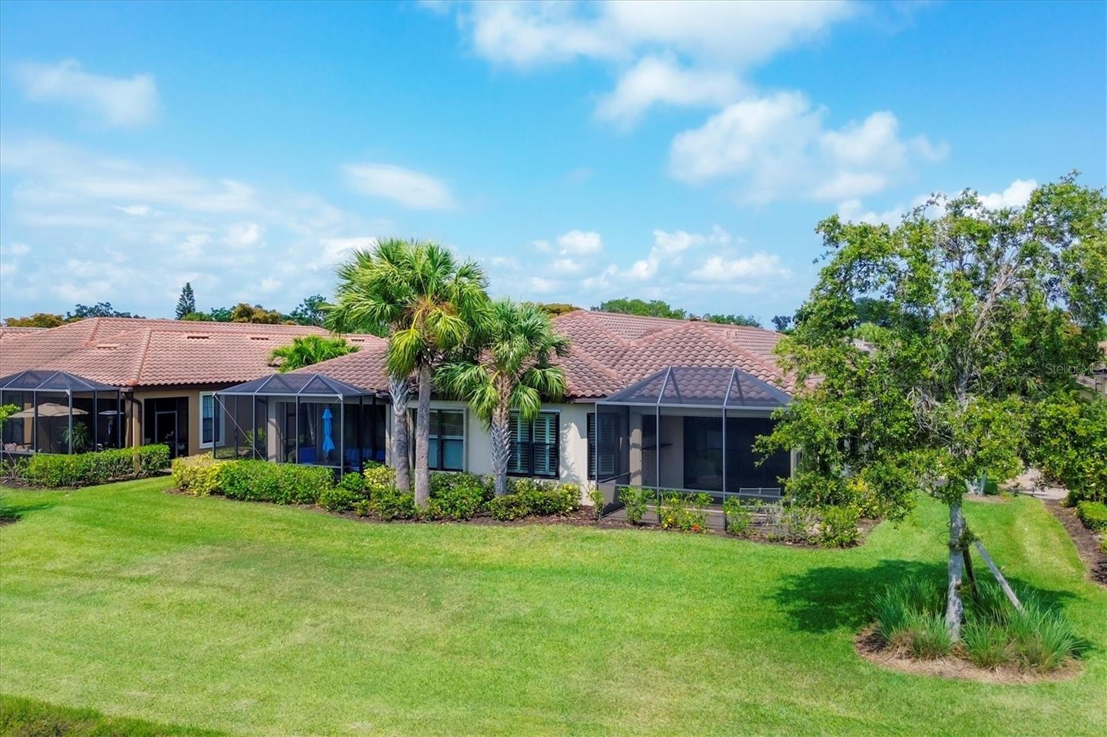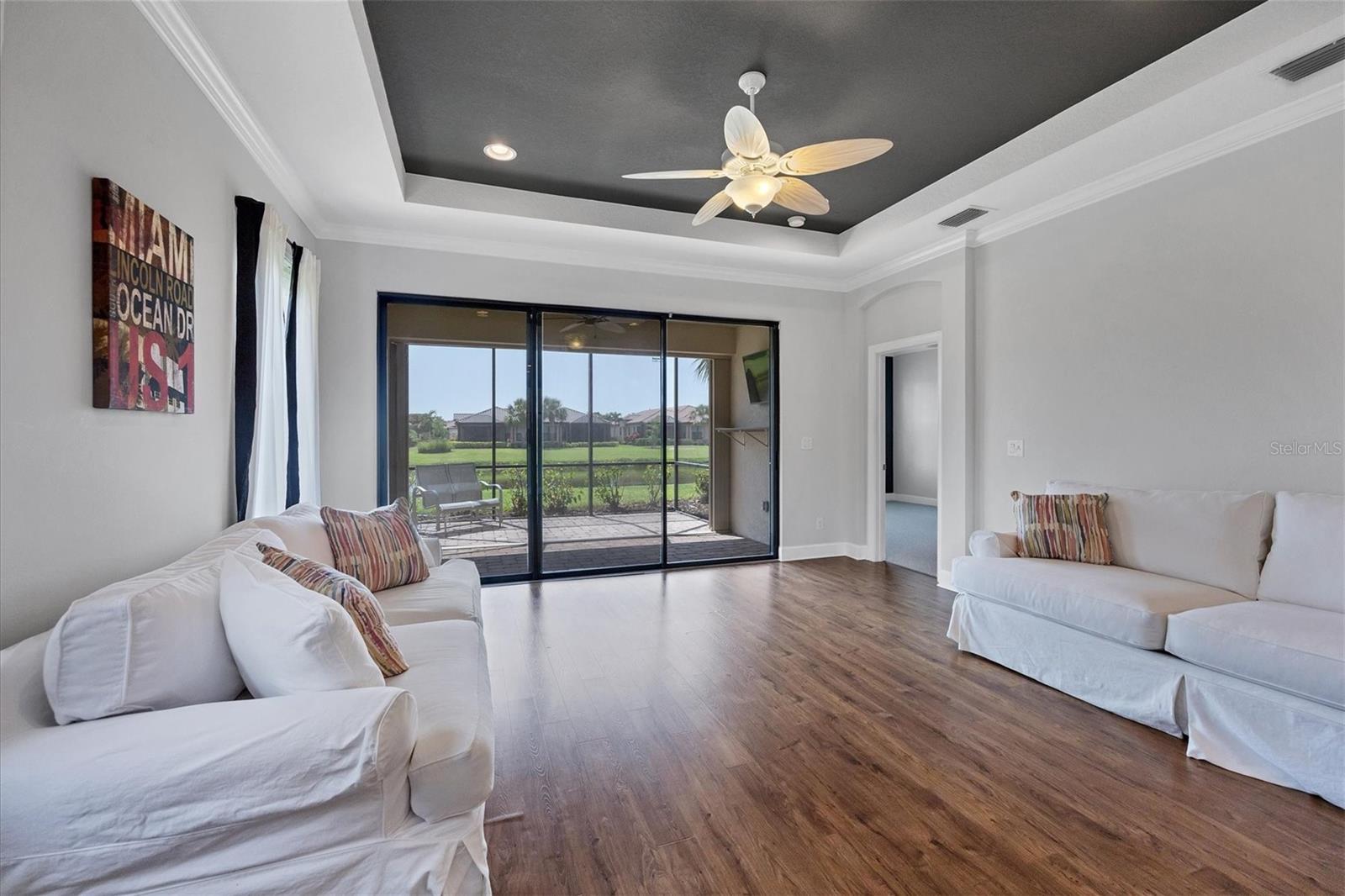 No Flooding with hurricane shutters and located in a fabulous location just one mile from Siesta Key. This rarely available villa home in Esplanade by Siesta Key, offers an active lifestyle, maintenance-free living, and gated resort-style amenities This spacious split-plan two-bedroom with den, two-bath one-level villa has an open floor plan, west-facing spacious screened-in lanai overlooking a very nice pond, two-car garage, and located just a few doors down from the amazing amenities center. The interior designer finishes have been upgraded, and the home offers crown molding, coffered ceiling in the great room, chair rails, and tray ceilings in the dining room, new refrigerator, range/oven, and microwave in the kitchen, three rooms of new neutral carpet, water softener in the garage, and natural gas for ease of cooking. More features include a spacious primary bedroom with a water view, plantation shutters, grab rails in the shower and water closet, very nicely sized walk-in closets in both bedrooms, ceiling fans throughout, and plenty of cabinets for storage in the kitchen and separate laundry room. Within the community, the residents enjoy a very social environment and access to a lagoon-style pool, pickleball, tennis on Har-Tru courts, a fitness center, a clubhouse with planned activities, a paw park, and sidewalks providing miles of walking and biking opportunities. The location is very central to dining, shopping, downtown Sarasota, and the beaches of Siesta Key. Very easy to show and move-in ready.