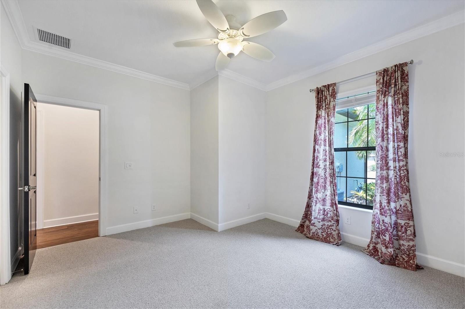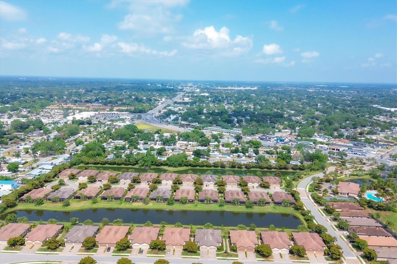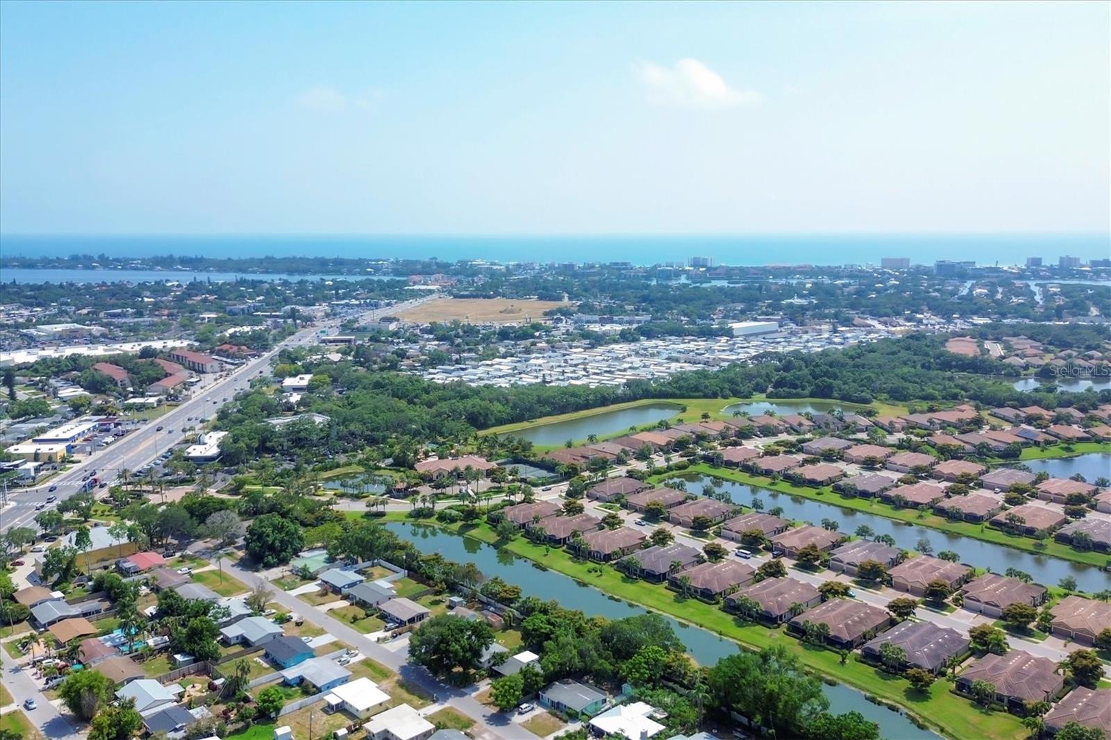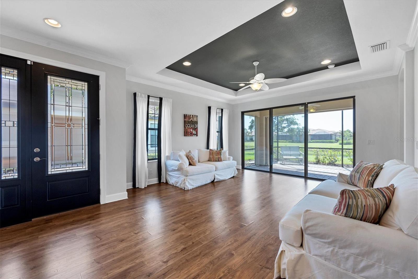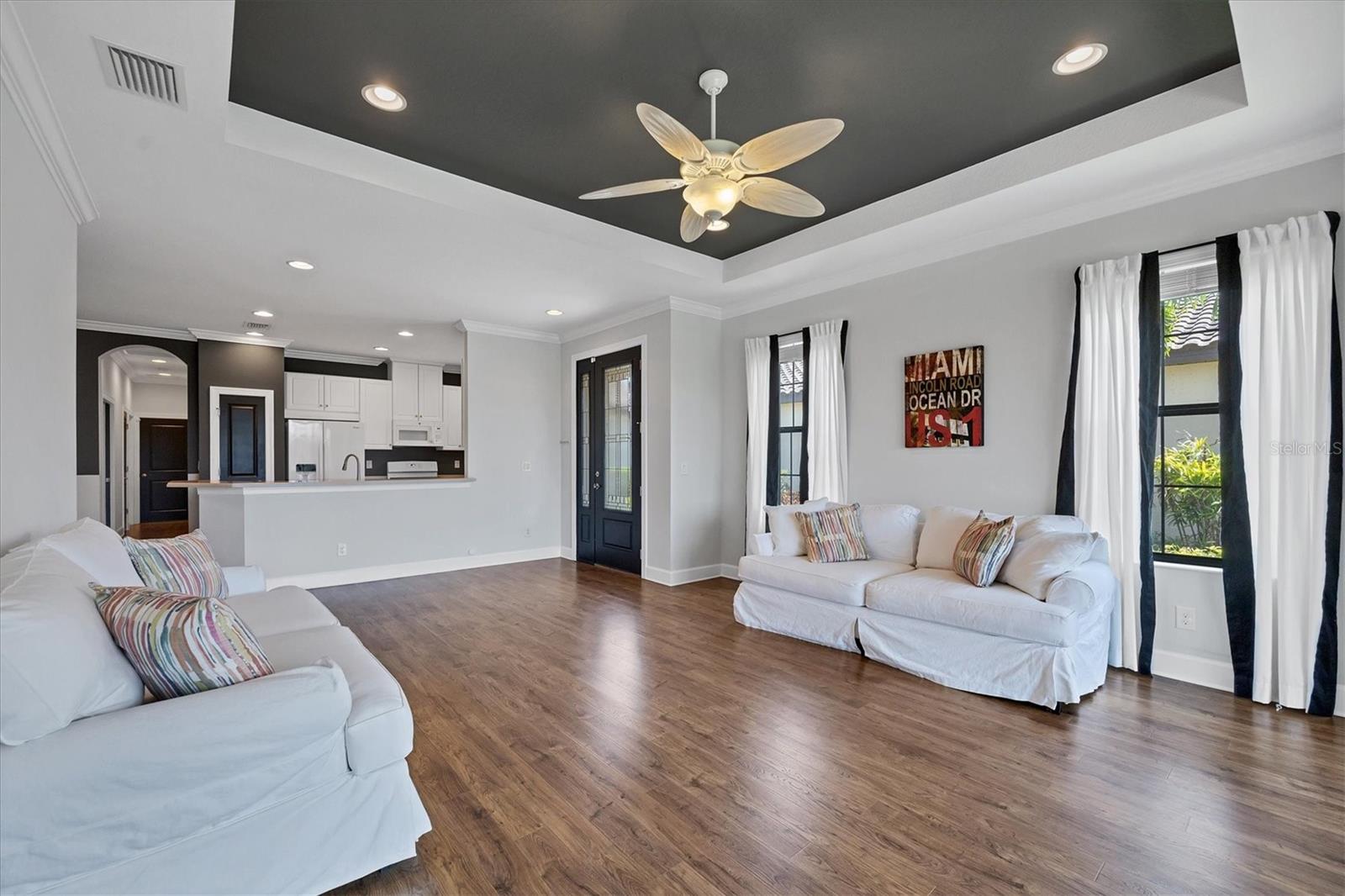 No Flooding with hurricane shutters and located in a fabulous location just one mile from Siesta Key. This rarely available villa home in Esplanade by Siesta Key, offers an active lifestyle, maintenance-free living, and gated resort-style amenities This spacious split-plan two-bedroom with den, two-bath one-level villa has an open floor plan, west-facing spacious screened-in lanai overlooking a very nice pond, two-car garage, and located just a few doors down from the amazing amenities center. The interior designer finishes have been upgraded, and the home offers crown molding, coffered ceiling in the great room, chair rails, and tray ceilings in the dining room, new refrigerator, range/oven, and microwave in the kitchen, three rooms of new neutral carpet, water softener in the garage, and natural gas for ease of cooking. More features include a spacious primary bedroom with a water view, plantation shutters, grab rails in the shower and water closet, very nicely sized walk-in closets in both bedrooms, ceiling fans throughout, and plenty of cabinets for storage in the kitchen and separate laundry room. Within the community, the residents enjoy a very social environment and access to a lagoon-style pool, pickleball, tennis on Har-Tru courts, a fitness center, a clubhouse with planned activities, a paw park, and sidewalks providing miles of walking and biking opportunities. The location is very central to dining, shopping, downtown Sarasota, and the beaches of Siesta Key. Very easy to show and move-in ready.
