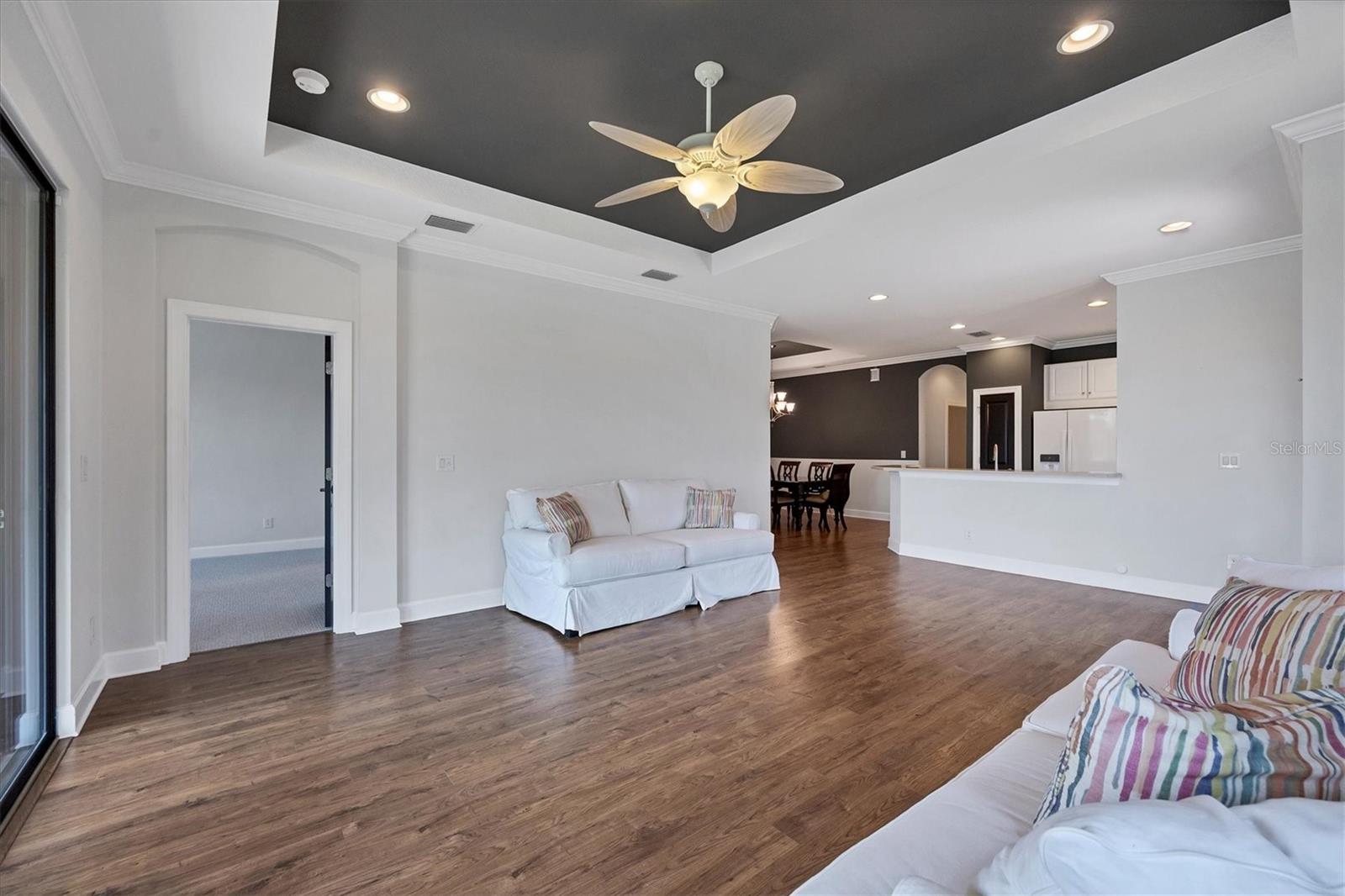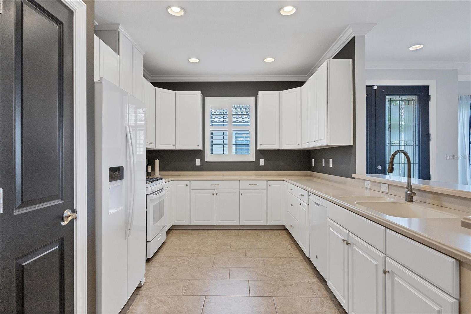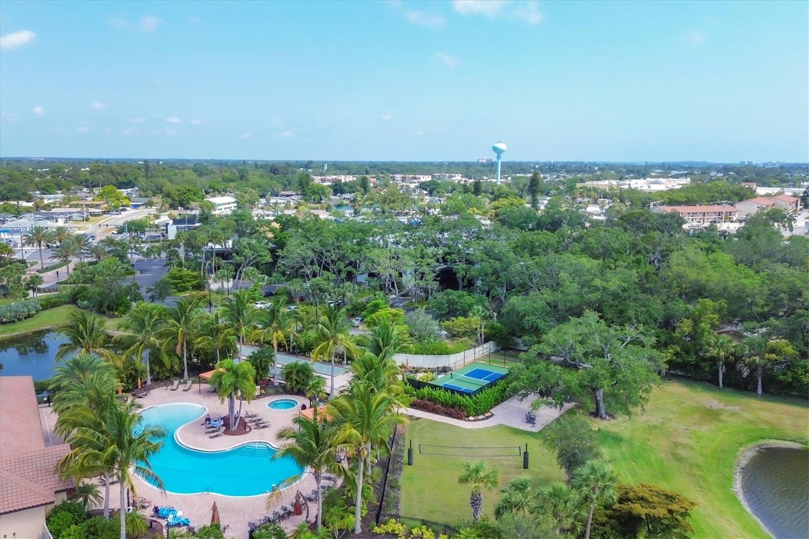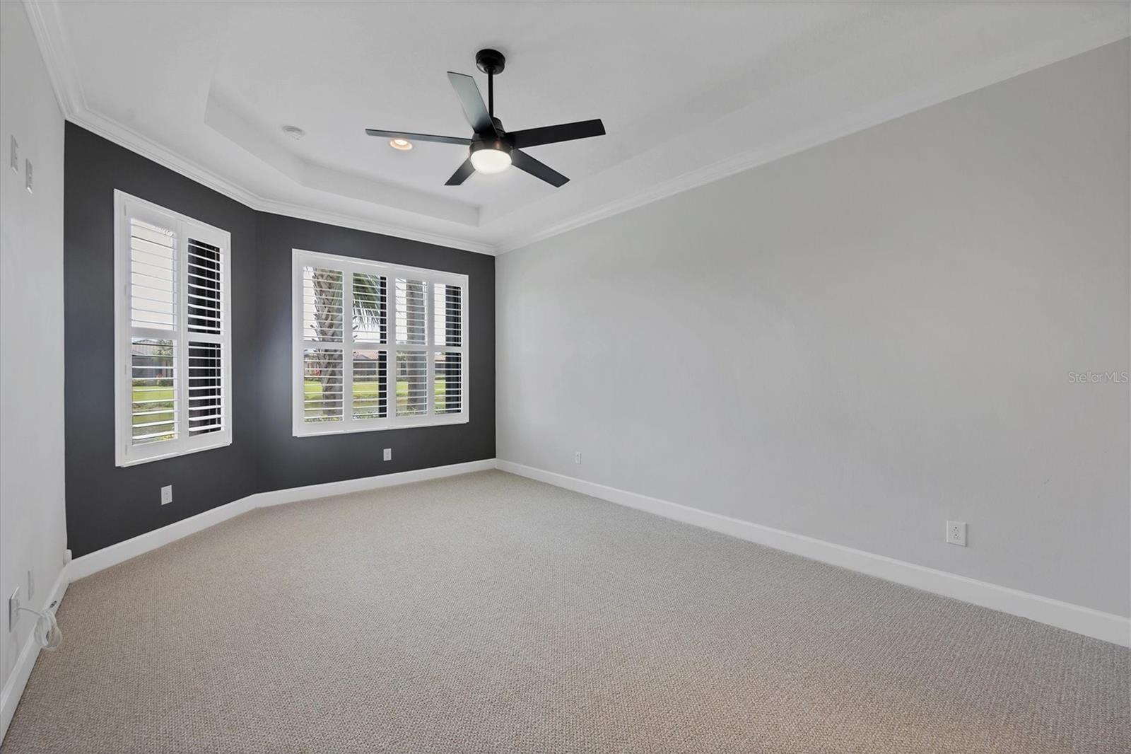 No Flooding with hurricane shutters and located in a fabulous location just one mile from Siesta Key. This rarely available villa home in Esplanade by Siesta Key, offers an active lifestyle, maintenance-free living, and gated resort-style amenities This spacious split-plan two-bedroom with den, two-bath one-level villa has an open floor plan, west-facing spacious screened-in lanai overlooking a very nice pond, two-car garage, and located just a few doors down from the amazing amenities center. The interior designer finishes have been upgraded, and the home offers crown molding, coffered ceiling in the great room, chair rails, and tray ceilings in the dining room, new refrigerator, range/oven, and microwave in the kitchen, three rooms of new neutral carpet, water softener in the garage, and natural gas for ease of cooking. More features include a spacious primary bedroom with a water view, plantation shutters, grab rails in the shower and water closet, very nicely sized walk-in closets in both bedrooms, ceiling fans throughout, and plenty of cabinets for storage in the kitchen and separate laundry room. Within the community, the residents enjoy a very social environment and access to a lagoon-style pool, pickleball, tennis on Har-Tru courts, a fitness center, a clubhouse with planned activities, a paw park, and sidewalks providing miles of walking and biking opportunities. The location is very central to dining, shopping, downtown Sarasota, and the beaches of Siesta Key. Very easy to show and move-in ready.