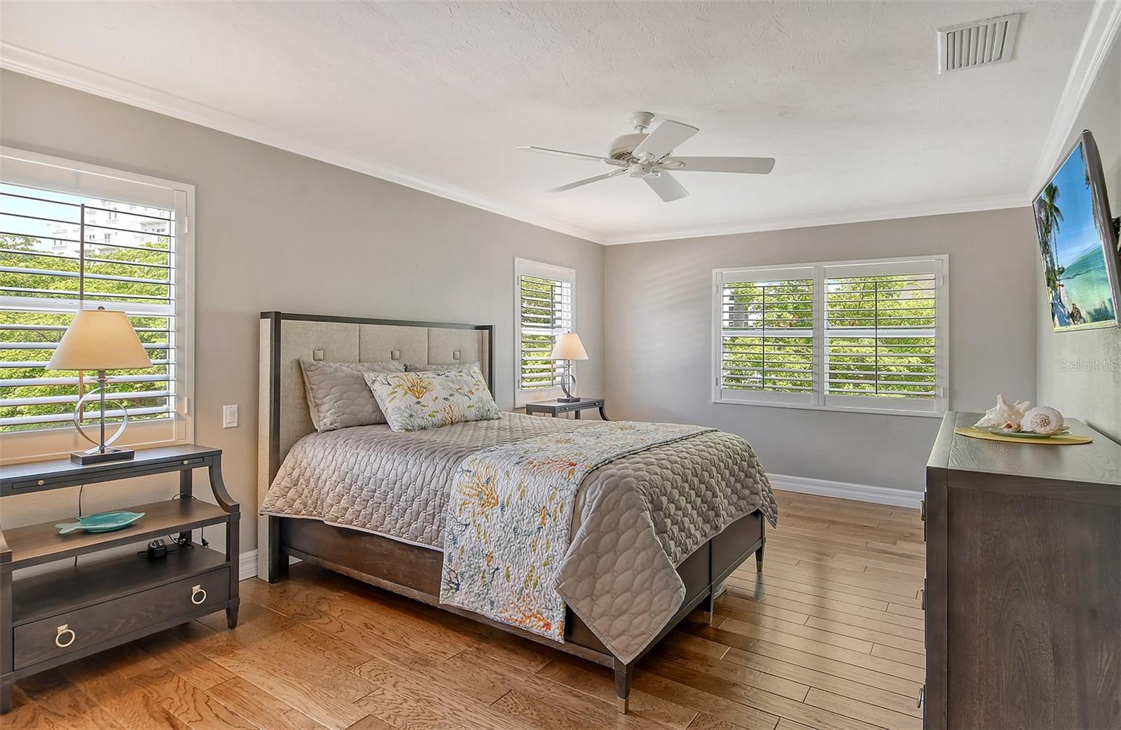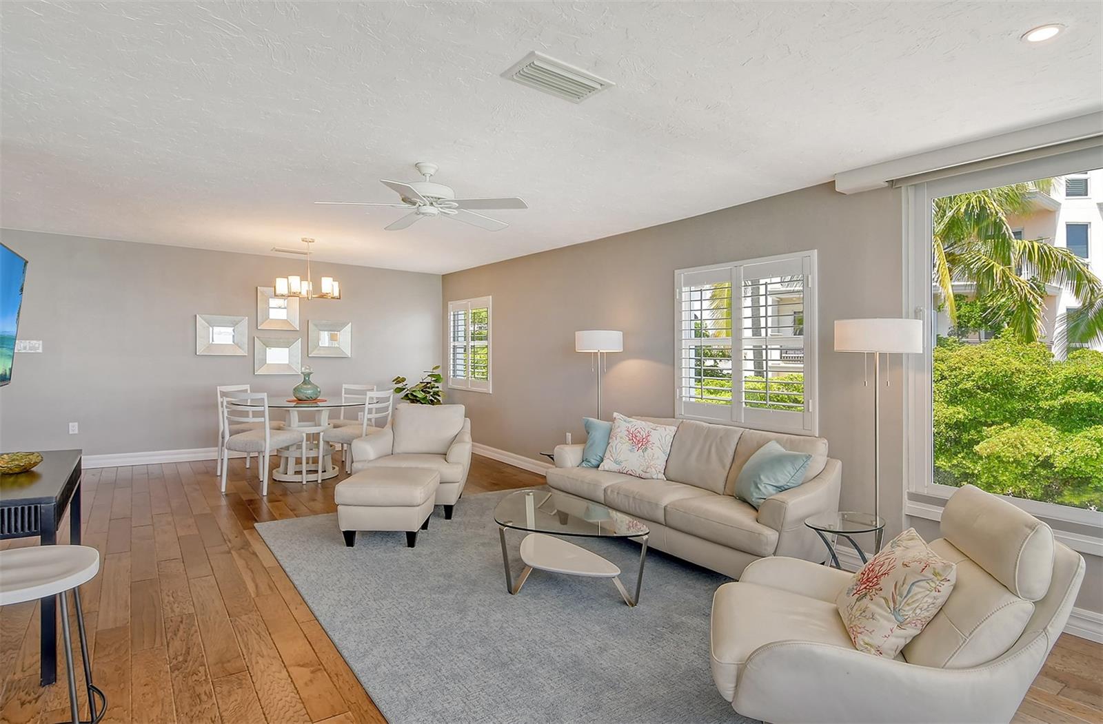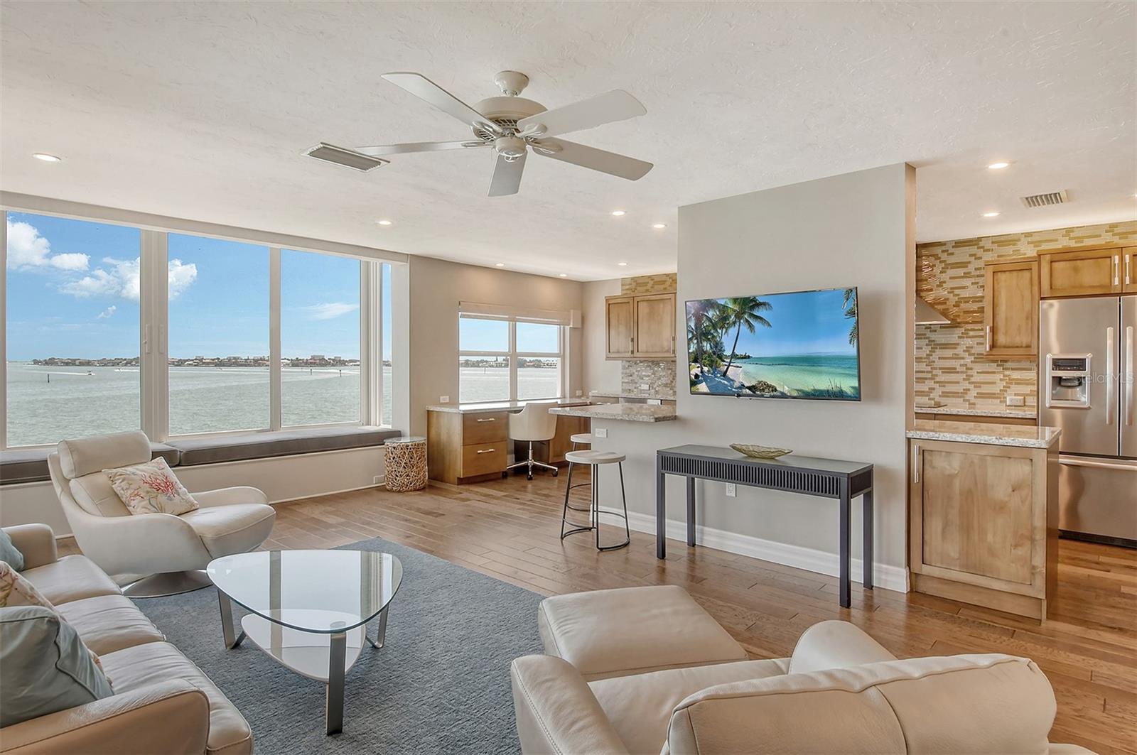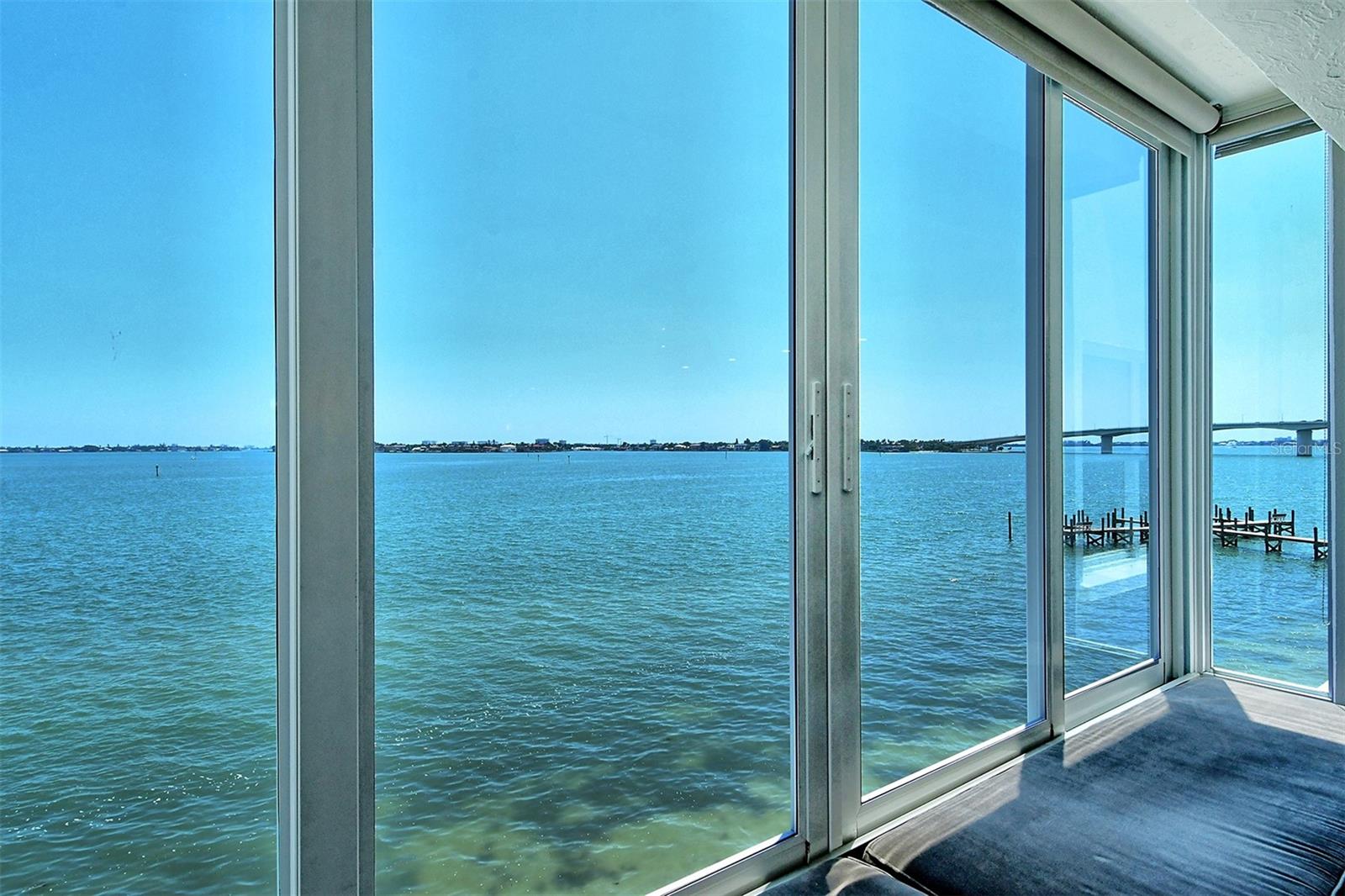 Exquisite living at Harbor House South, where nothing comes between you and the 180-degree Southerly views across Sarasota Bay. This 3rd floor 2 bedroom, 2 bath end unit incorporates an expansive set of windows with cozy window seats to provide ever-changing waterfront scenery. Enjoy your private panoramic views with glimpses of marine wildlife, luxurious yachts and sailboats, and the daily sunrise and sunset shows. Elegant and beautifully crafted, this home is attractively appointed with porcelain tile, crown molding, plantation shutters, solid core doors, and spa-inspired bathrooms. Entertaining or relaxing at home this well-designed floor plan incorporates a living room/dining room, as well as a built-in office facing the bay. The kitchen is fitted with soft close wood cabinets, quartz countertops, an induction cook top with stainless steel hood, built-in convection oven, and built-in microwave, and a striking counter to ceiling glass-tiled wall. Ideally located near to Marina Jack, the Ringling Bridge and Downtown Sarasota. Perfectly situated in a private setting, and just minutes to all that Sarasota offers, this home provides the best of all worlds. Add this fantastic home to your must-have list!