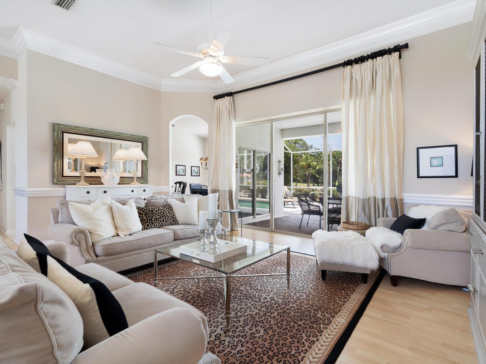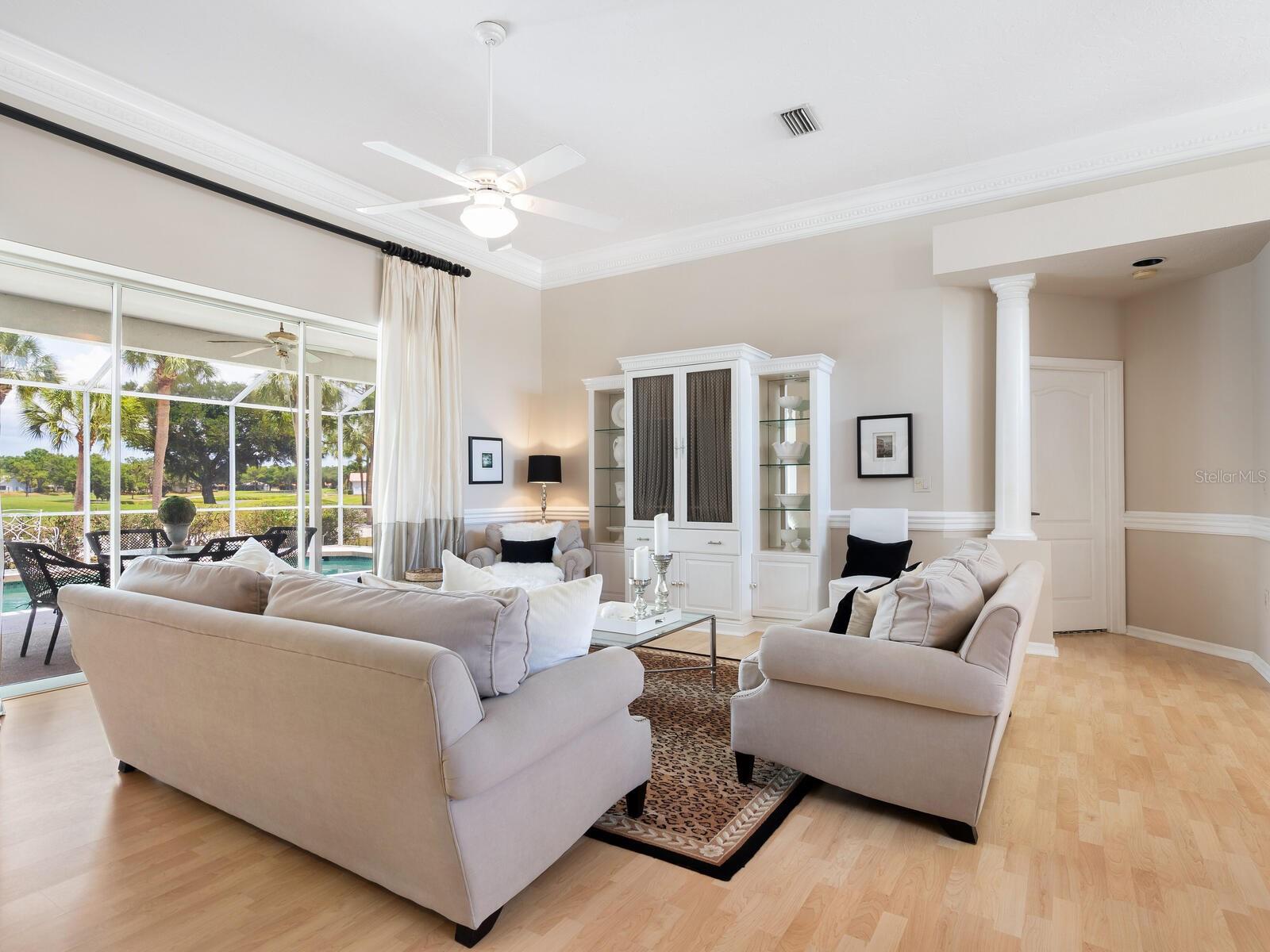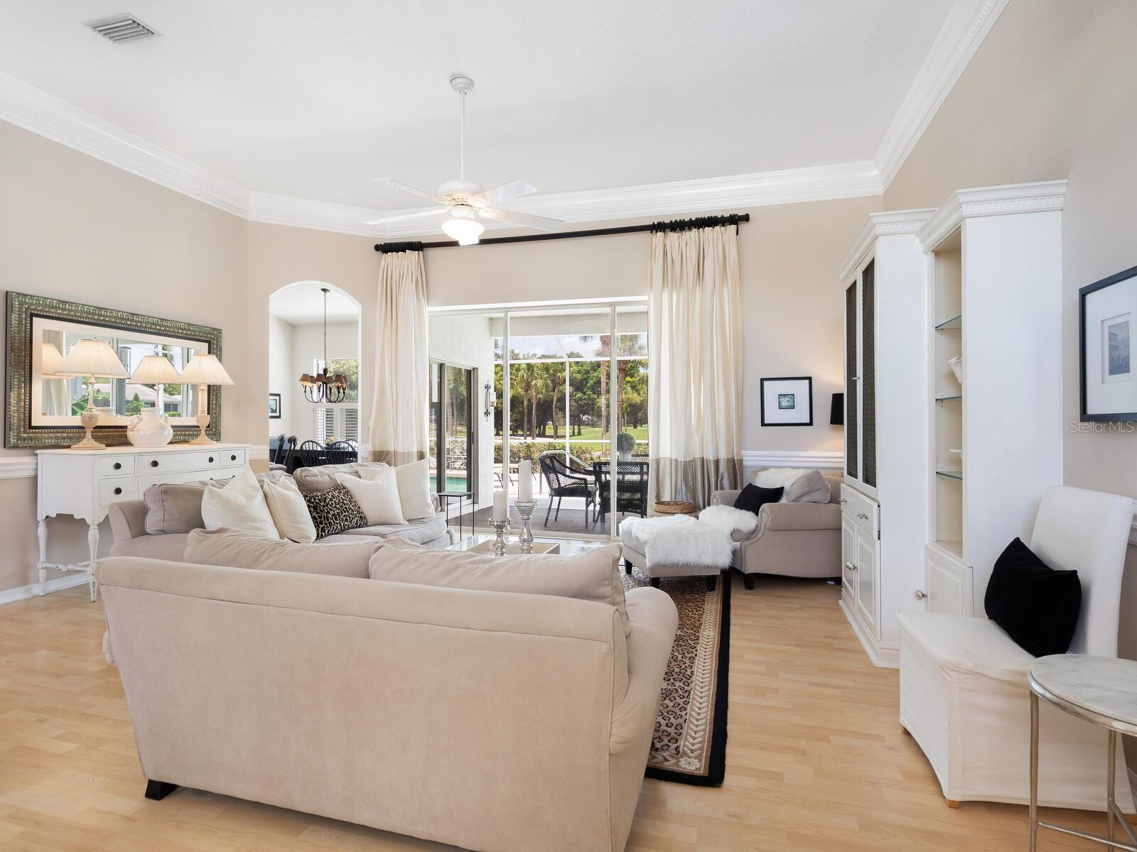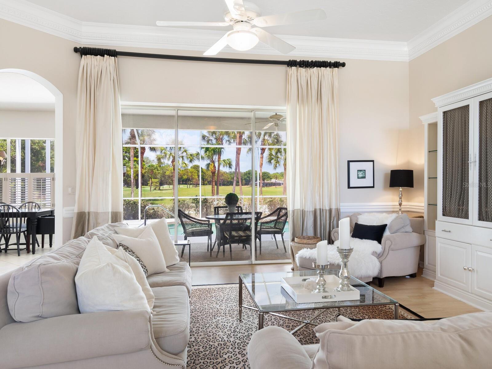 Welcome to a lifestyle of luxury and tranquility in this stunning home, situated in a premier country club community. Enjoy expansive views with golf course frontage and a serene lake view, all from the comfort of your exquisitely designed residence. The home features a neutral color palette and stunning architectural details throughout, including hand-carved crown molding and 10’ ceilings. The expansive great room and dining room offer ample space for entertaining, while the main living areas open to the pool through disappearing sliders, seamlessly blending indoor and outdoor living. The kitchen boasts black granite counters, a chef’s sink and faucet, a breakfast bar, and a casual dining area with breathtaking views. At the end of the day, the owner’s suite offers a relaxing retreat complete with a generous sitting area and a spa-like bath. A separate guest wing offers two additional bedrooms and a shared bath, providing privacy and comfort for all. Residency in The Meadows Community includes the Renaissance Access Plan, with access to premier amenities. Enhanced country club memberships are also available. You’ll be minutes away from the shops and restaurants of UTC, Benderson Park and Rowing Facility, the arts and entertainment of downtown Sarasota, and Sarasota’s pristine beaches. This tasteful, move-in ready home, along with its coveted location, is a statement of refined living, with every detail thoughtfully curated to enhance your lifestyle. As a bonus, the home can be purchased turnkey with its timeless designer French neoclassical furnishings and accessories, available under a separate contract.