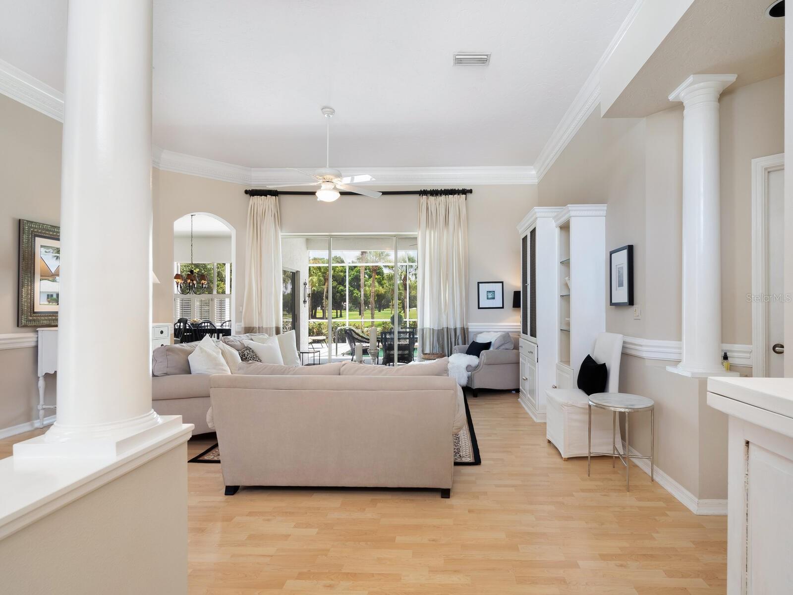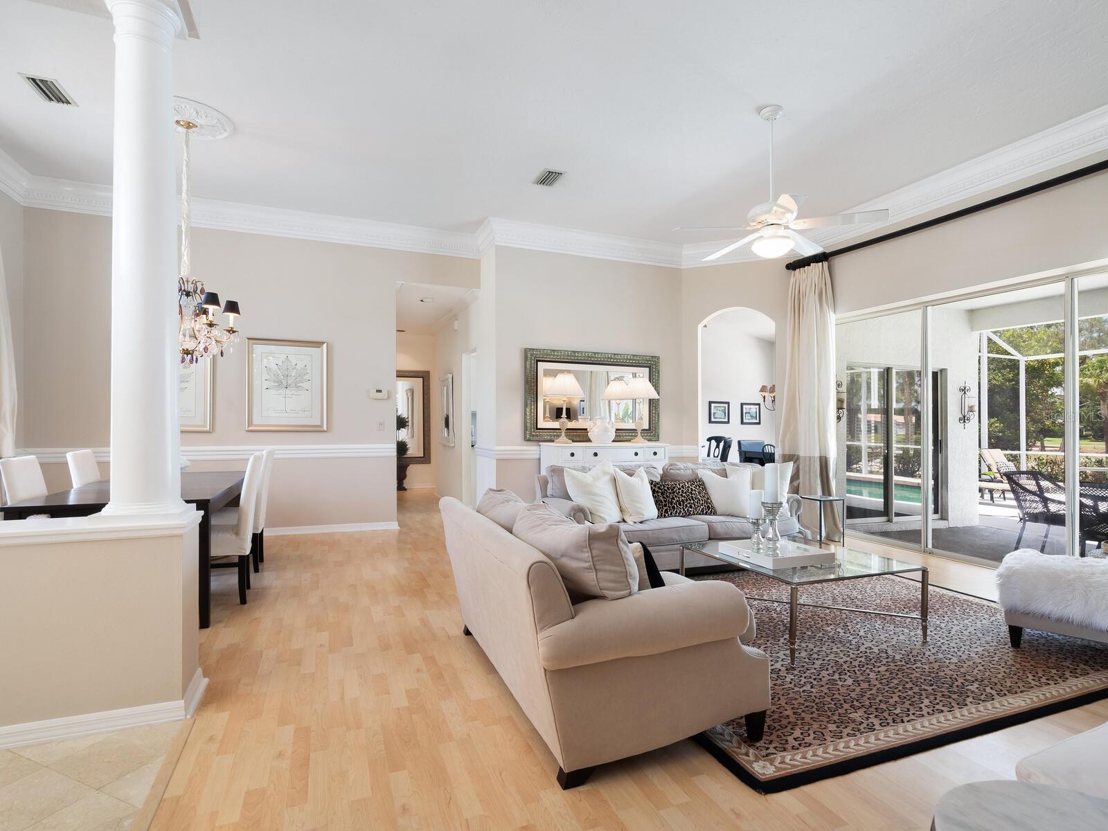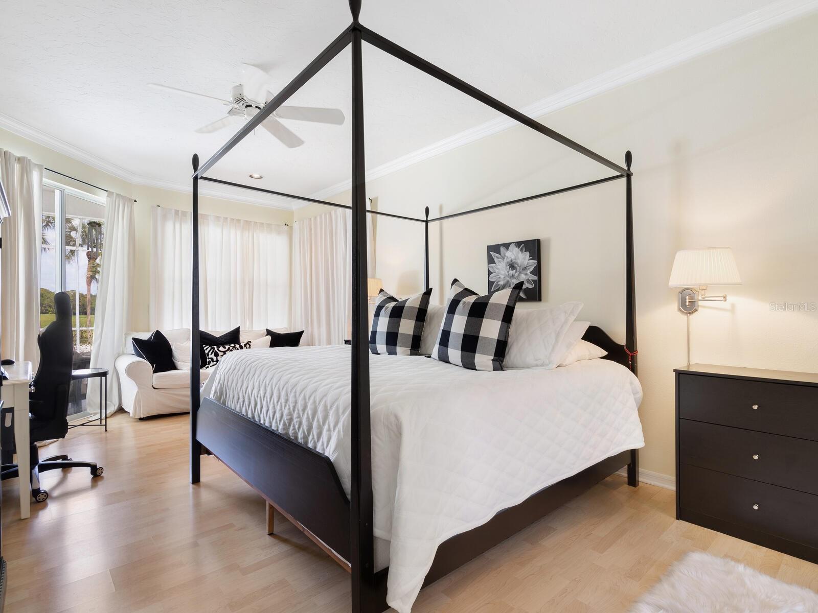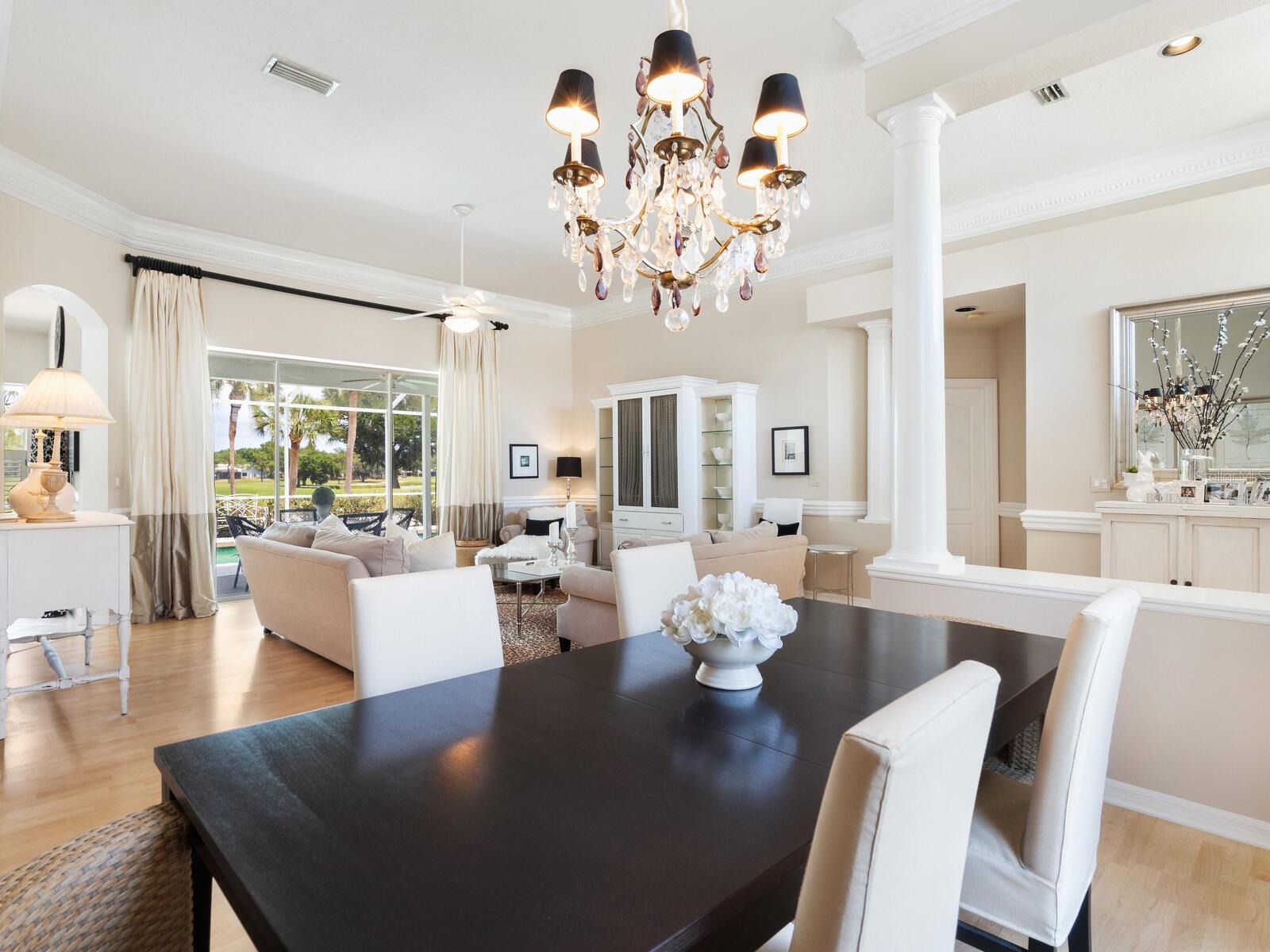 Welcome to a lifestyle of luxury and tranquility in this stunning home, situated in a premier country club community. Enjoy expansive views with golf course frontage and a serene lake view, all from the comfort of your exquisitely designed residence. The home features a neutral color palette and stunning architectural details throughout, including hand-carved crown molding and 10’ ceilings. The expansive great room and dining room offer ample space for entertaining, while the main living areas open to the pool through disappearing sliders, seamlessly blending indoor and outdoor living. The kitchen boasts black granite counters, a chef’s sink and faucet, a breakfast bar, and a casual dining area with breathtaking views. At the end of the day, the owner’s suite offers a relaxing retreat complete with a generous sitting area and a spa-like bath. A separate guest wing offers two additional bedrooms and a shared bath, providing privacy and comfort for all. Residency in The Meadows Community includes the Renaissance Access Plan, with access to premier amenities. Enhanced country club memberships are also available. You’ll be minutes away from the shops and restaurants of UTC, Benderson Park and Rowing Facility, the arts and entertainment of downtown Sarasota, and Sarasota’s pristine beaches. This tasteful, move-in ready home, along with its coveted location, is a statement of refined living, with every detail thoughtfully curated to enhance your lifestyle. As a bonus, the home can be purchased turnkey with its timeless designer French neoclassical furnishings and accessories, available under a separate contract.