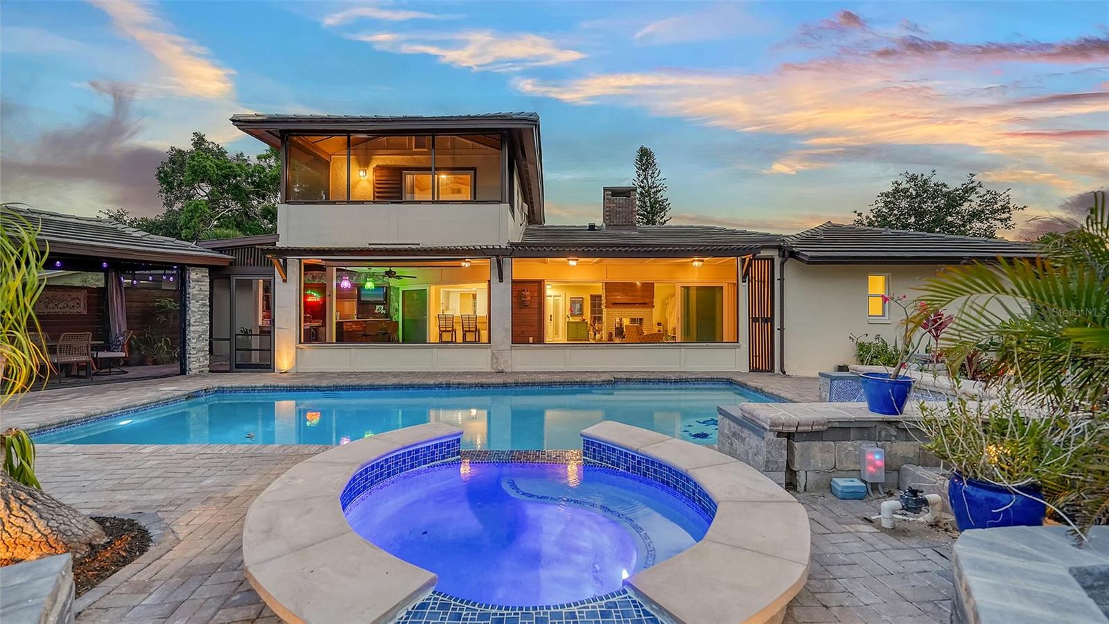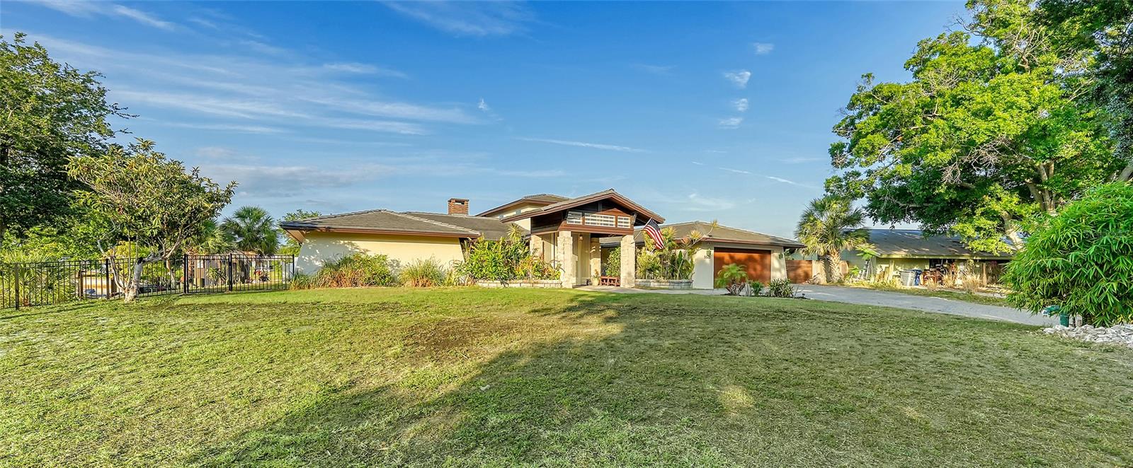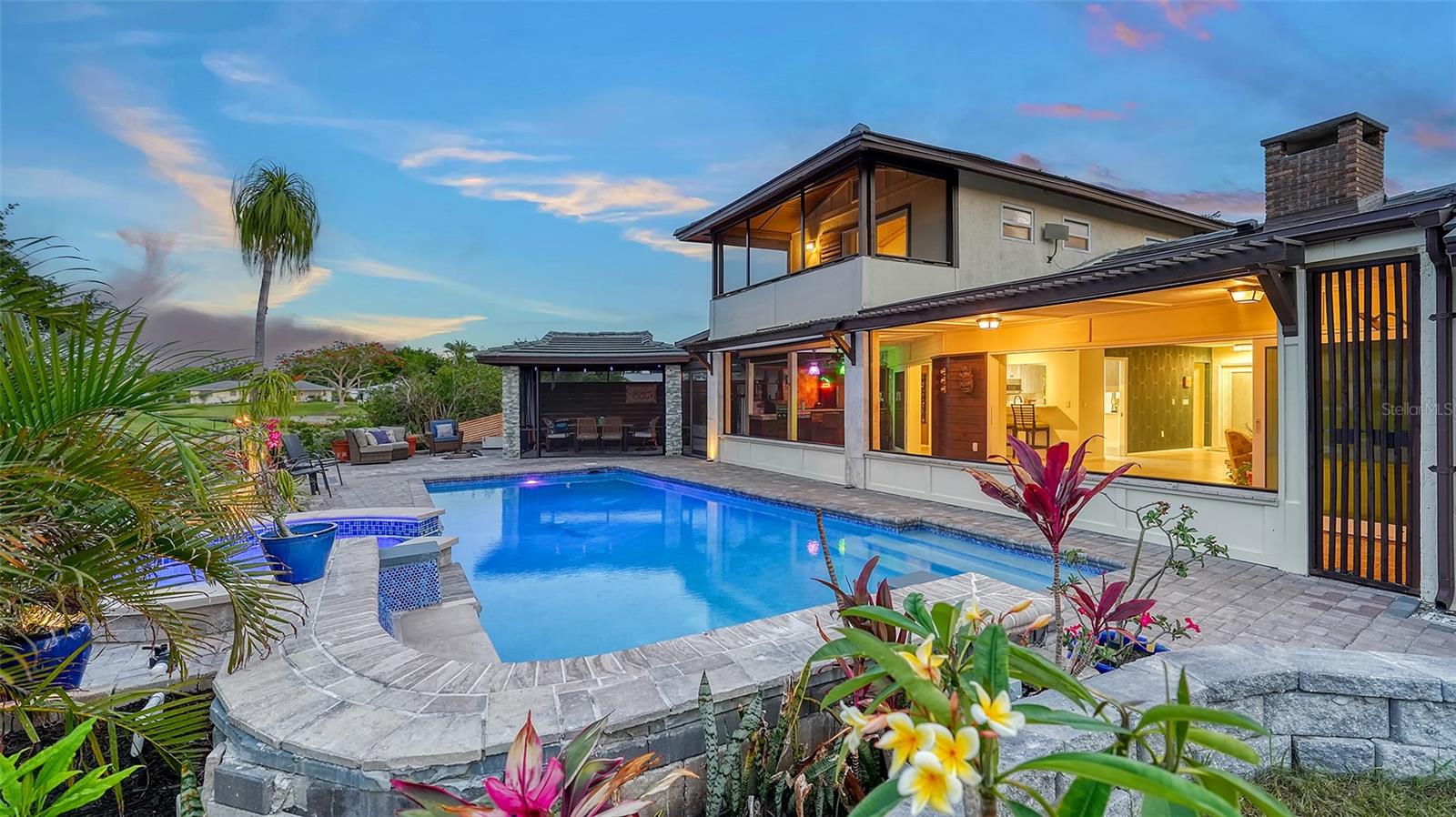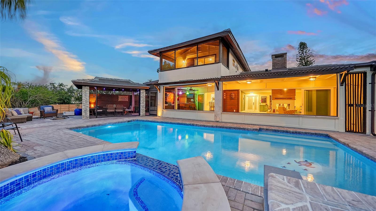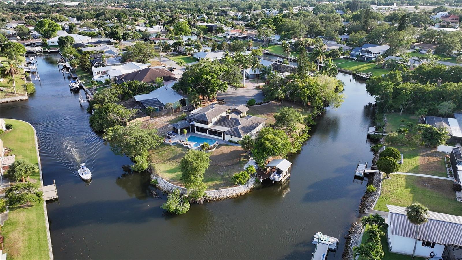 One or more photo(s) has been virtually staged. PRIVATE WATERFRONT PENINSULA! This property is the quintessential location for living an incredible Florida lifestyle. The home itself is unique, offering space that lends itself to anything you can imagine. With four bedrooms, some of which can be configured to other uses, and 4 full baths, this home is made for entertaining. But you may find the pièce de résistance is outside, as the oversized .61-acre lot is beautifully situated on two waterways just off Phillippi Creek. With over 400 feet of private water frontage, this property is truly your tropical oasis, quiet and peaceful, yet close to everything you need. The house itself has been continuously updated from 2017-2024. Exploring the interior, you will find a great room with a dual sided wood burning fireplace, large, updated kitchen with stainless steel appliances, farmhouse sink and pot filler. With 3 bedrooms on the first floor (one en-suite), and a master suite on the 2nd floor, there is room for residents and guests alike. The balcony off the 2nd floor provides gorgeous views, morning and night, with big blue-sky views to sunrises and sunsets. Want to feel like you are on vacation every day of the year? This home is made for tropical living. It has an outdoor tiki hut with a bar and grill, 2 outdoor fire pits, 5 zone outdoor exterior low voltage automatic night lighting, a pool, spa and boat lift. Other upgrades include a new boat house in 2019, new seawall in 2023/2024, two new A/C in 2019, and septic to sewer conversion in 2018. Tucked away at the end of cul-de-sac in Phillippi Gardens, the location is ideal, While the neighbor is private and quiet, it is close to The Landings and other shopping and eatery venues, a short bike ride to Gulf beaches, and not far from the vibrant downtown of Sarasota and all its cultural and recreational offerings. You truly must see this amazing property to appreciate all it has to offer.