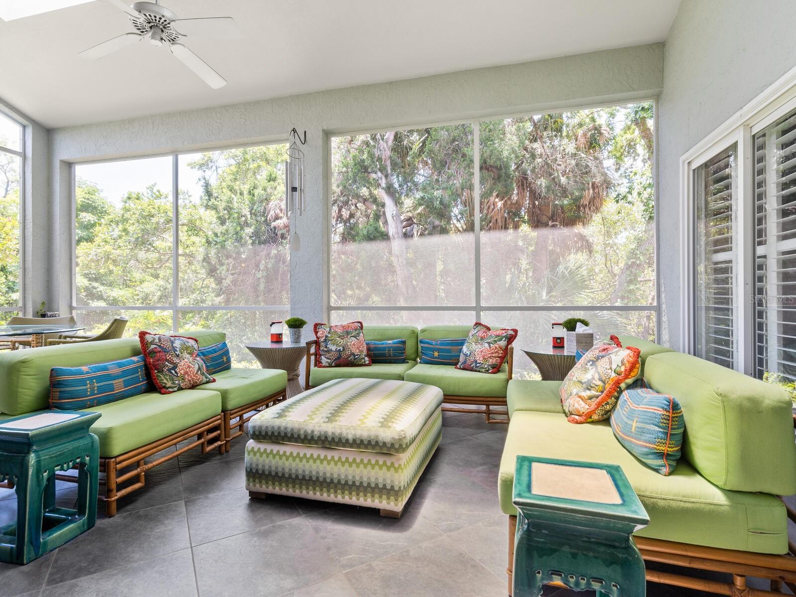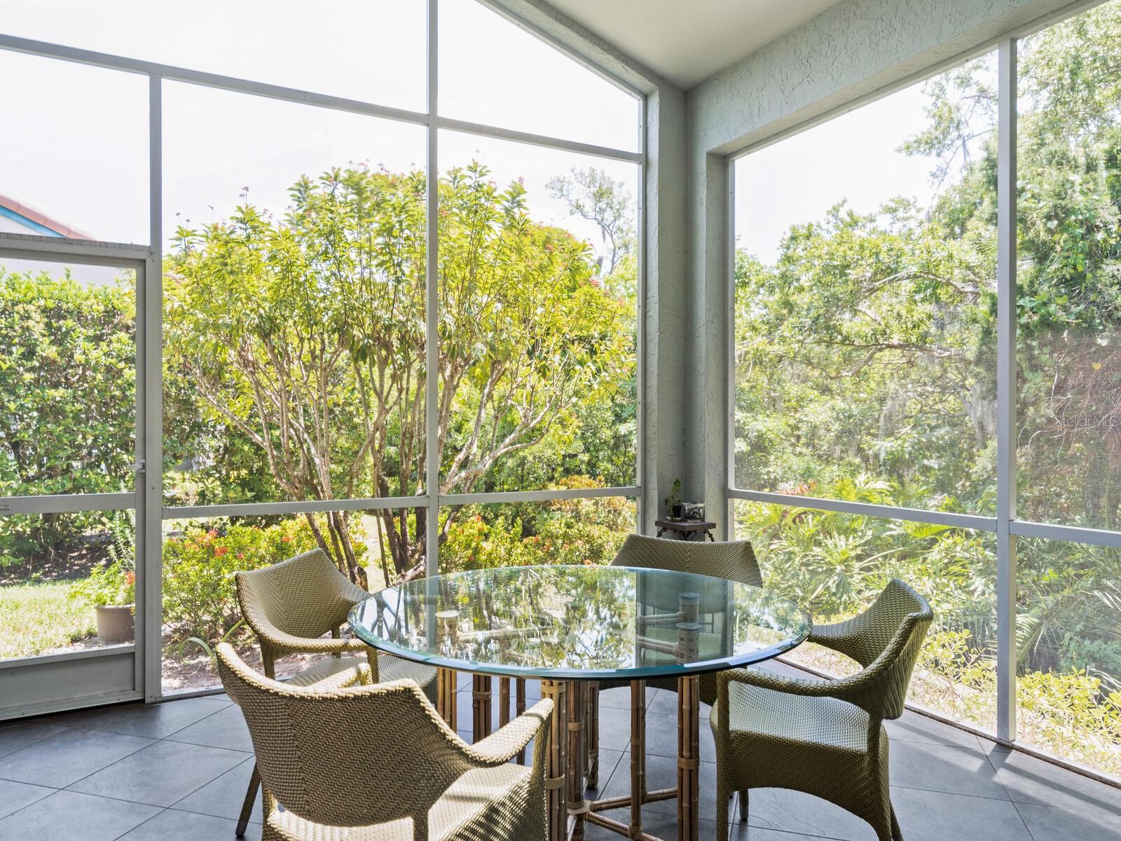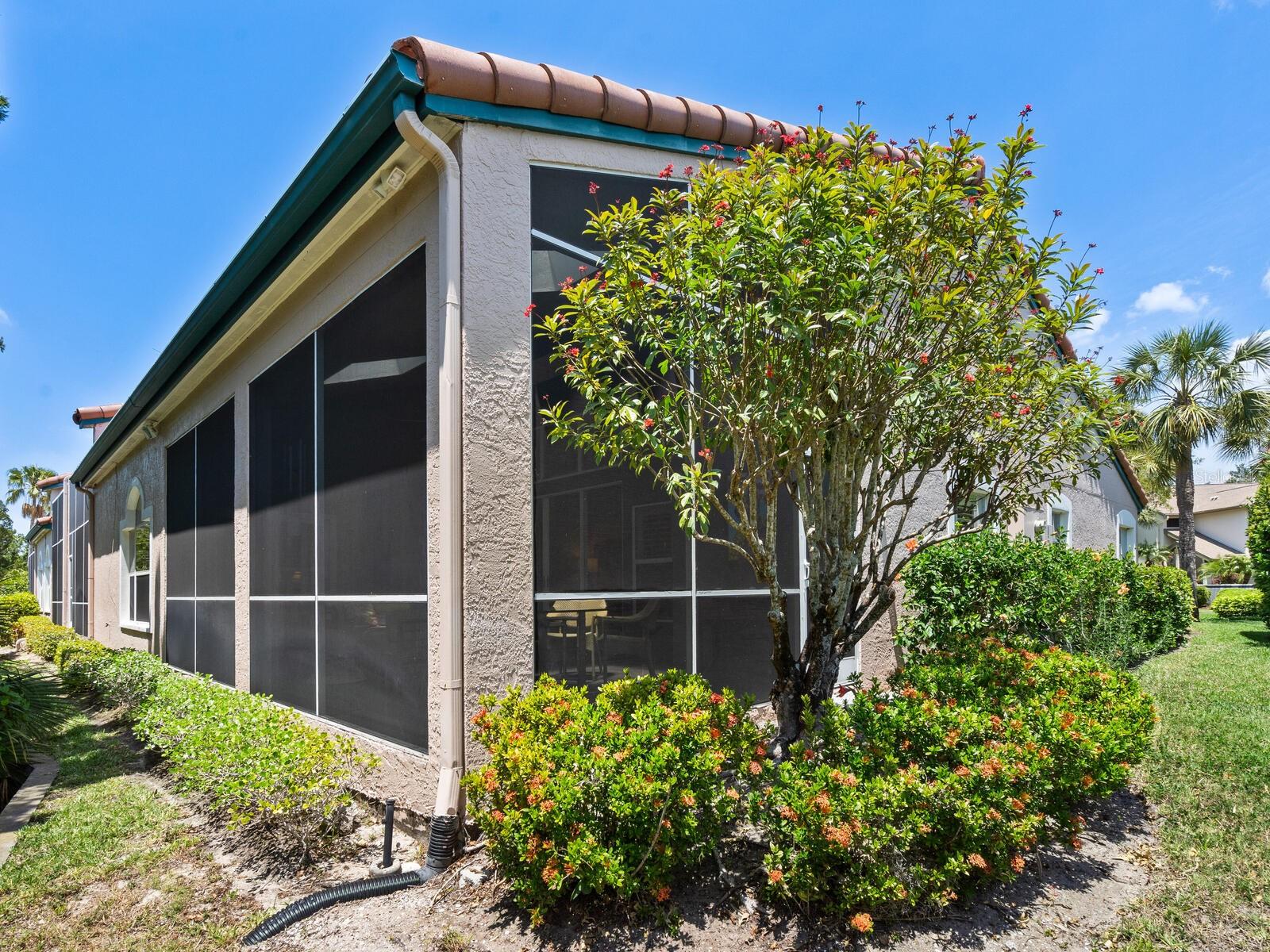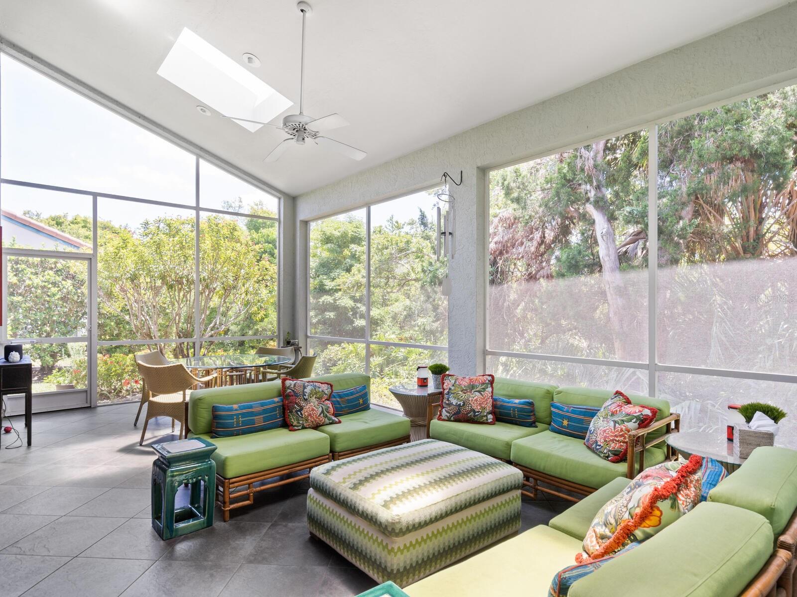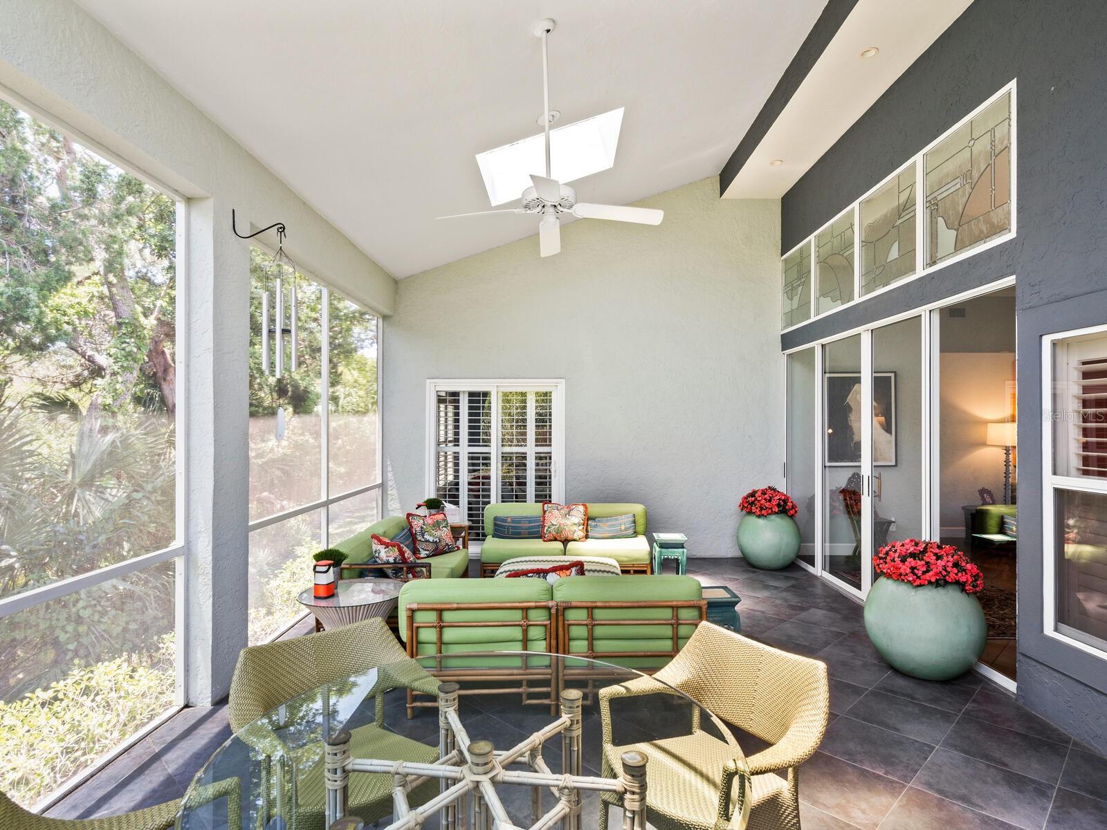 Tasteful and chic, a single-story Eagles Point villa in The Landings with a southern exposure and preserve view. Walking into this 2 bedroom with den/2 bath villa you are drawn into the open great room and feel the sun pulling you out to the spacious screened lanai sanctuary. Sliding glass doors with leaded transom windows above are the focal point to the great room as well as the volume ceiling and skylights. The kitchen is a chef’s delight with a clean design, ample storage, wood cabinetry, granite counters with waterfall detail on the kitchen island. Subzero refrigerator and Fisher Paykel double drawer dishwasher, induction cooktop and wall oven complete the high-end appliance package. Plenty of room for a casual dining table in the kitchen or entertaining the cook while sitting on bar stools at the island. The primary bedroom is bright and cheery with plenty of light with custom walk-in closets, ensuite with spa bath, shower stall and dual sinks. The walk-in closet connects directly to the laundry room for easy access. There are two additional bedrooms, one currently used as den/office. Plantation shutters, and ceramic tile floors throughout. Attached two-car garage with paver driveway. Take advantage of the Landings amenities with membership to the exclusive Landings Racquet Club with social activities, har-tru tennis courts, exercise room, heated pool/spa, sauna, library or walk the nature trail leading to the bayfront gazebo. Kayak storage is available on the nature trail with a new newly built launch site. Enjoy fishing from the gazebo and watching the boats go by.