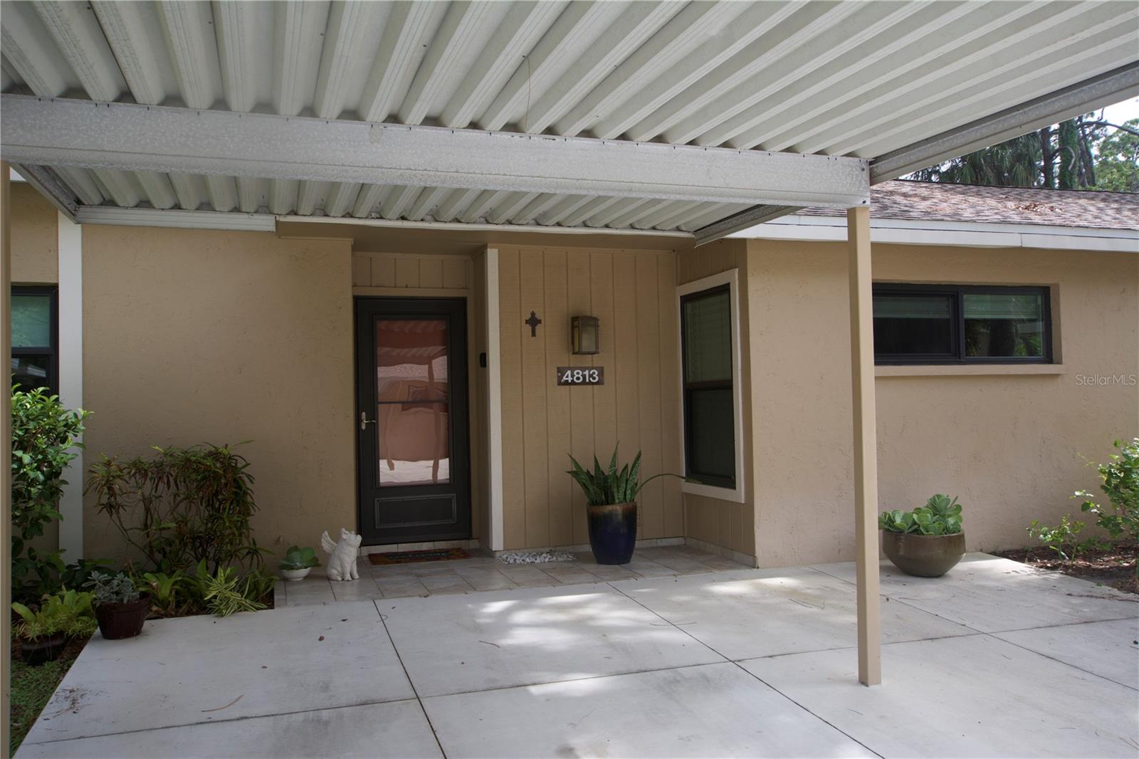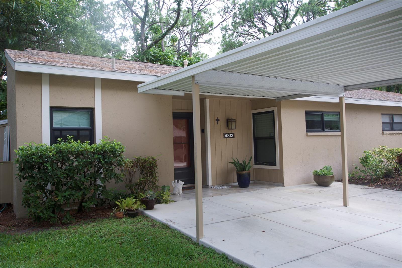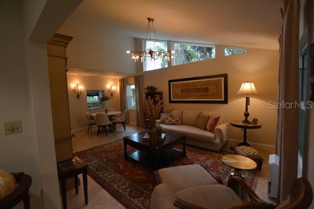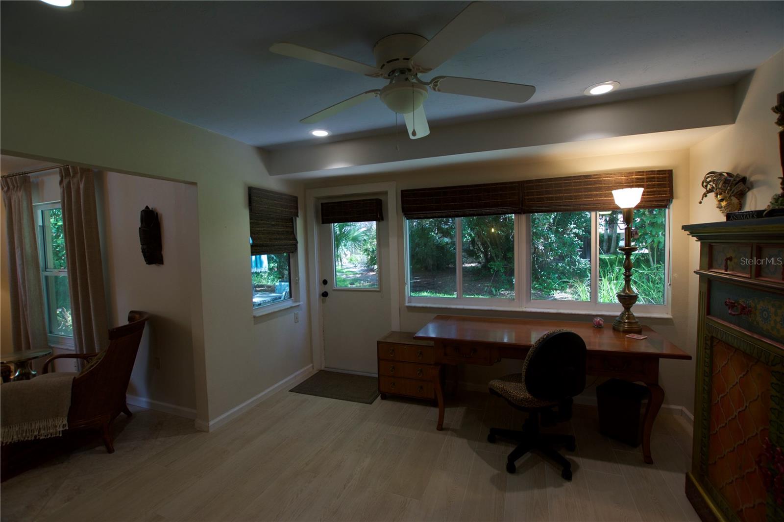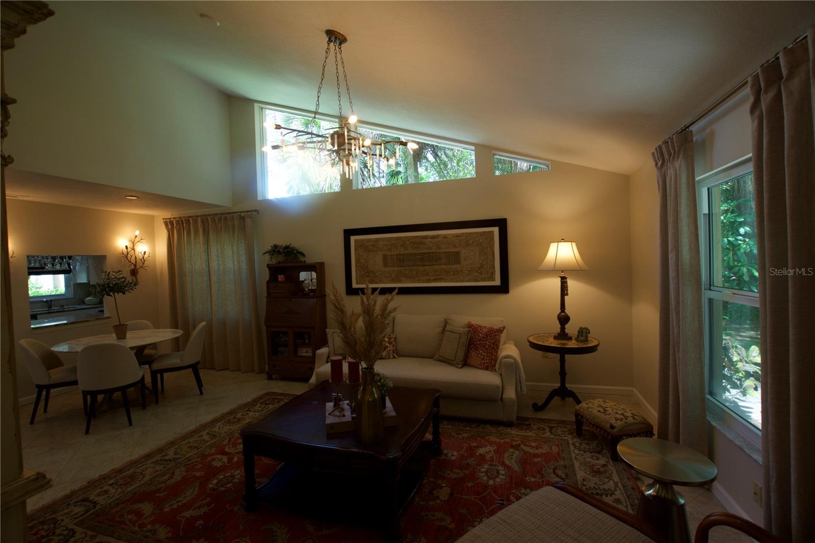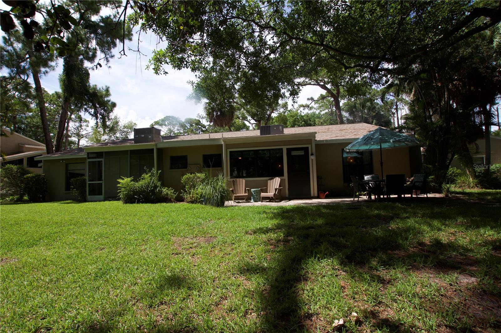 TROPICAL PARADISE IN UNBEATABLE LOCATION!!! NO STAIRS and ONLY 2 UNITS PER BUILDING -WINDOWS ON 3 SIDES give this no maintenance condo the feel of a single family home! Great location… 6 minute drive to Downtown, 10 minutes to St. Armands Circle and Lido Beach. 7 minutes to UTC Mall and 5 minutes to Publix. Walk to Water Tower Park and Ringling Museum. Light and bright 2 bedroom condo has upper Transom Windows in Vaulted Ceiling Living Room, large window (6’) in Office and is LIGHT, BRIGHT AND OPEN. Due to conversion of porch to living area unit shows much larger than actual footage. Updated with NEW porcelain tile throughout, white kitchen cabinets, stainless appliances, 1 1/2 years NEW counter depth refrigerator (that truly is counter depth!), gas range & oven, “extended” recirculating fan over stove, microwave & disposal. Pass thru bar to dining area with wine rack. NEW Living/Dining lighting, NEW draperies and custom Bali blinds in 2022. NEW Porcelain tile in 2 Bedrooms and Office in 2022. Refrigerator NEW in 2022. A/C NEW appx 6 years ago. NEW Gas Water Heater 2024. Porch converted to NEW living area appx 2018. NEW sound reduction double pane windows (excluding porch) in 2020. NEW Patio pavers installed across entire rear of home in 2016. NEW Dishwasher appx. 2019. NEW dimmers installed in Kitchen, Living room, Dining room and Main bedroom in 2022. NEW Pendant lighting in Main bedroom in 2022, NEW Light fixture in Living Room and NEW coordinating Wall Sconces in 2022. Community conveniently located close to airport but due to sound deafening windows you won’t know it! This condo feels like a house due to design with only 2 units per building and windows on 3 sides and it is like living in a house without the maintenance hassles! Community Clubhouse with BBQ Facilities, Pool with covered Lanai, Library and Kitchen in clubhouse, Tennis, Pickleball and Shuffleboard available. Neighborhood activities such as Happy Hour available to those who choose to participate. Conveniently located to everything and in move in condition…call today to view this exceptional property! TV in guest bedroom is included. Foyer mirror and draperies in guest bedroom do not convey (privacy blinds are included).