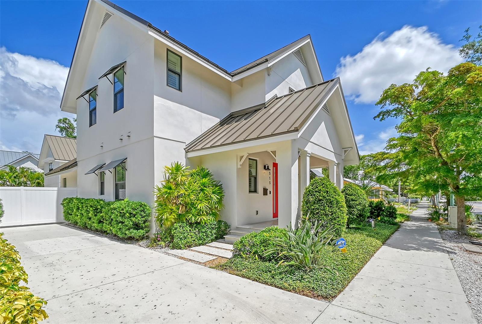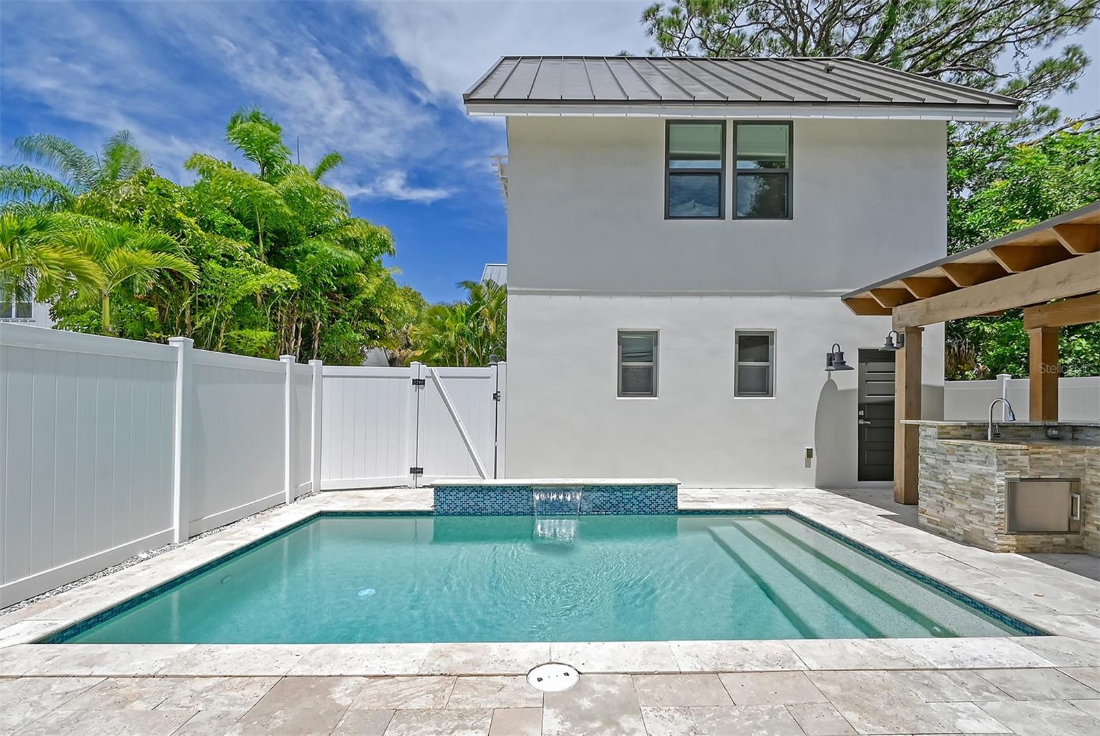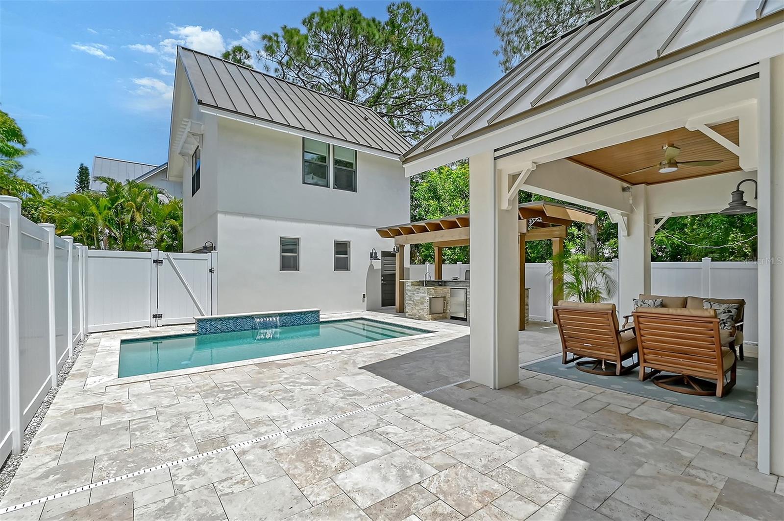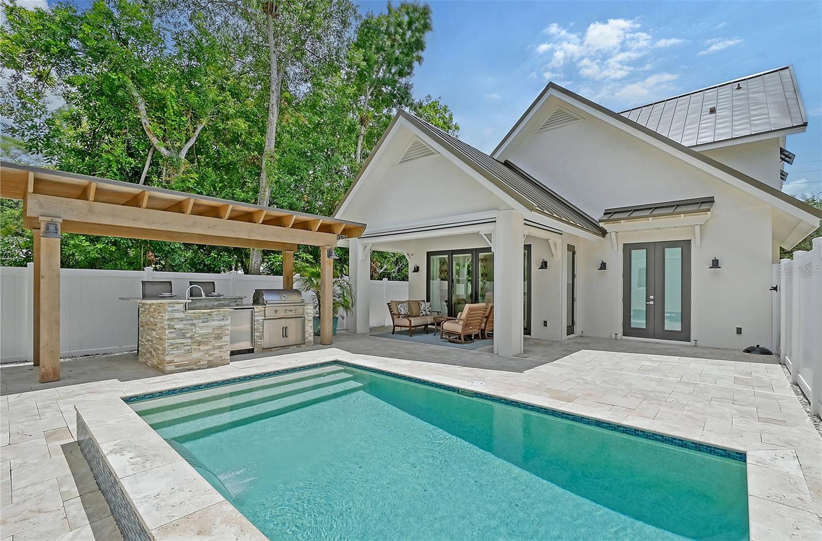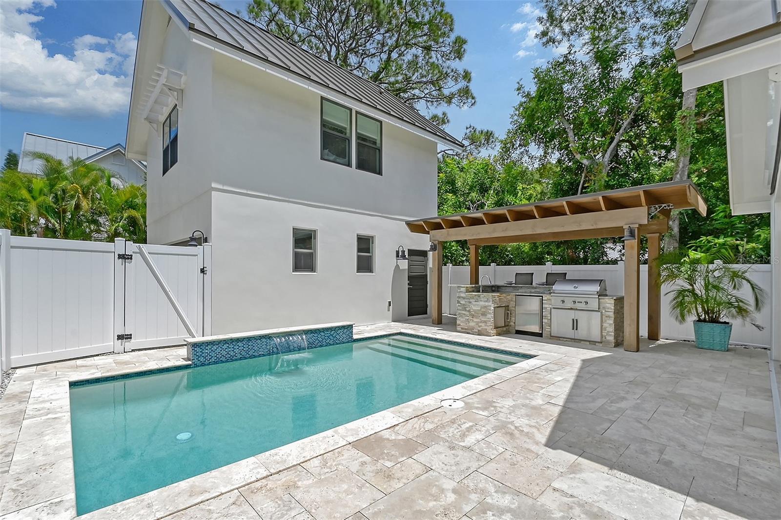 Welcome to Downtown Sarasota’s Historic Laurel Park. A hidden gem within the bustling city, offering a perfect blend of traditional design and coastal charm. This exceptional residence, built in 2018 presents an opportunity for urban living in a serene walkable neighborhood. Upon entering, one is greeted by wood flooring, plank ceilings, and enhanced baseboards and crown molding. Encompassing a flexible floorplan, the main house is complemented by a guest house above the two-car garage. At the heart of the home, the chef’s kitchen is adorned with top-of-the-line appliances including a 6-burner Thermador Professional gas range, Mid Continent Cabinetry and quartz waterfall countertops. The kitchen seamlessly flows into the great room featuring a wood plank vaulted ceiling and sliding glass doors leading out to the covered lanai, offering a perfect blend of indoor/outdoor living. The first-floor primary suite is a haven boasting a tray ceiling with wood plank, French doors to the lanai, two walk-in custom California closets, and a spa-inspired bathroom with a large dual vanity, walk-in shower and freestanding soaking tub. Upstairs, a central loft serves as the perfect bonus room or media room, while two additional large bedrooms and two full bathrooms provide ample space. The studio apartment above the garage serves as the fourth bedroom, complete with a full bathroom and a private entry, making it the ideal space for guests, an art studio, or home office. The outdoor oasis is a refreshing retreat featuring a natural tone travertine deck that leads to a heated pool with waterfall feature. An outdoor kitchen, nestled under a wood pergola, is fully equipped with a built-in grill, beverage refrigerator, and sink. The covered lanai, equipped with electronic retractable screens, seamlessly integrates indoor and outdoor living. Fully fenced outdoor entertaining area, along with an electric gate on the driveway, ensures privacy and security. Additional: high impact windows and doors, window treatments throughout, smart home devices, reverse osmosis water filtration system, wired ethernet throughout, new pool pump (May 2023), new pool heater (March 2022), and new mini-split a/c unit in guest house above garage (Dec 2023). Historic Laurel Park is a walkable neighborhood, offering easy access to grocery stores, Bayfront Park, Downtown Farmers Market, shopping, dining, and cultural entertainment. This downtown oasis presents an unparalleled opportunity to embrace a vibrant urban lifestyle within a serene and picturesque community.