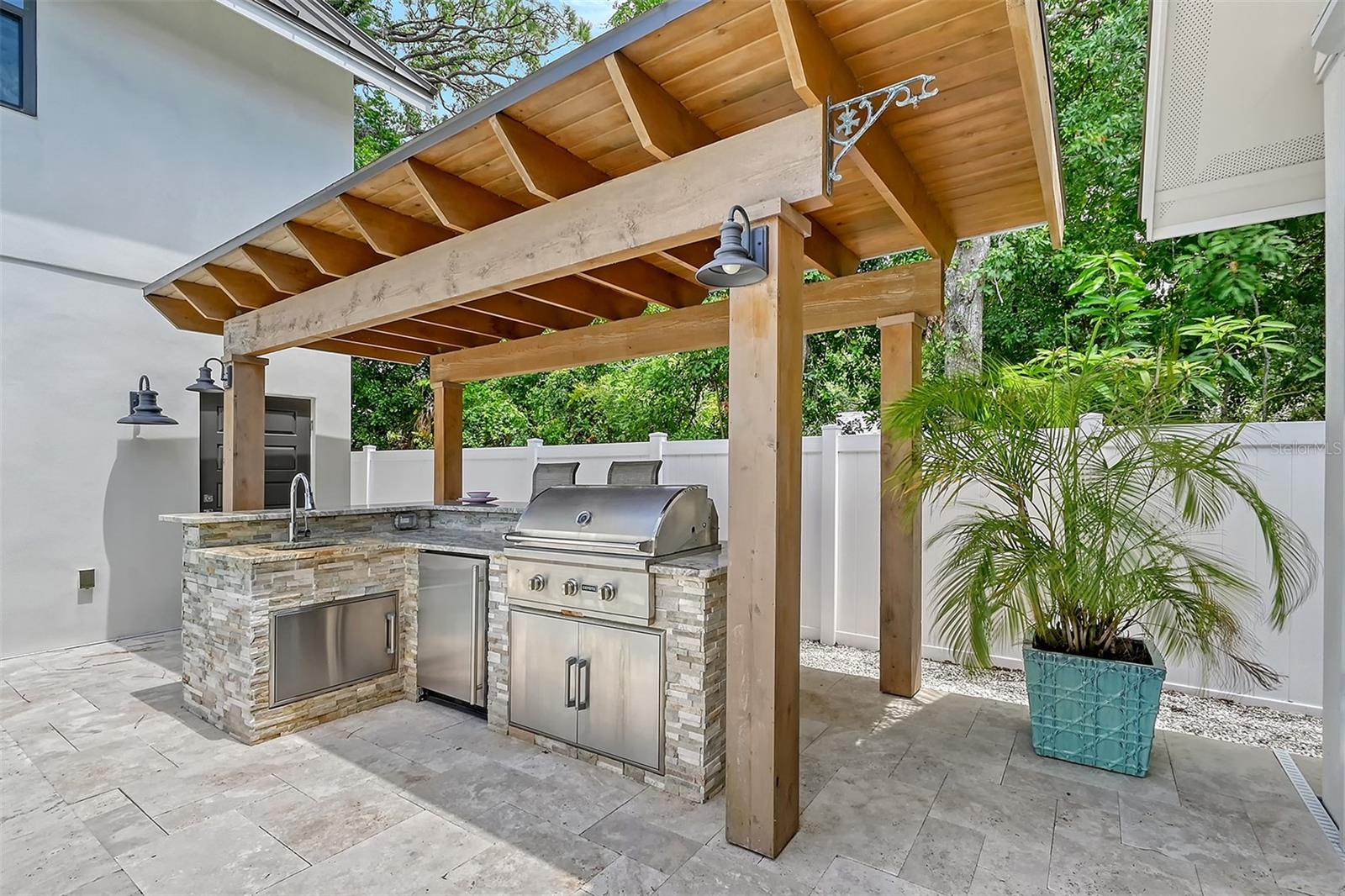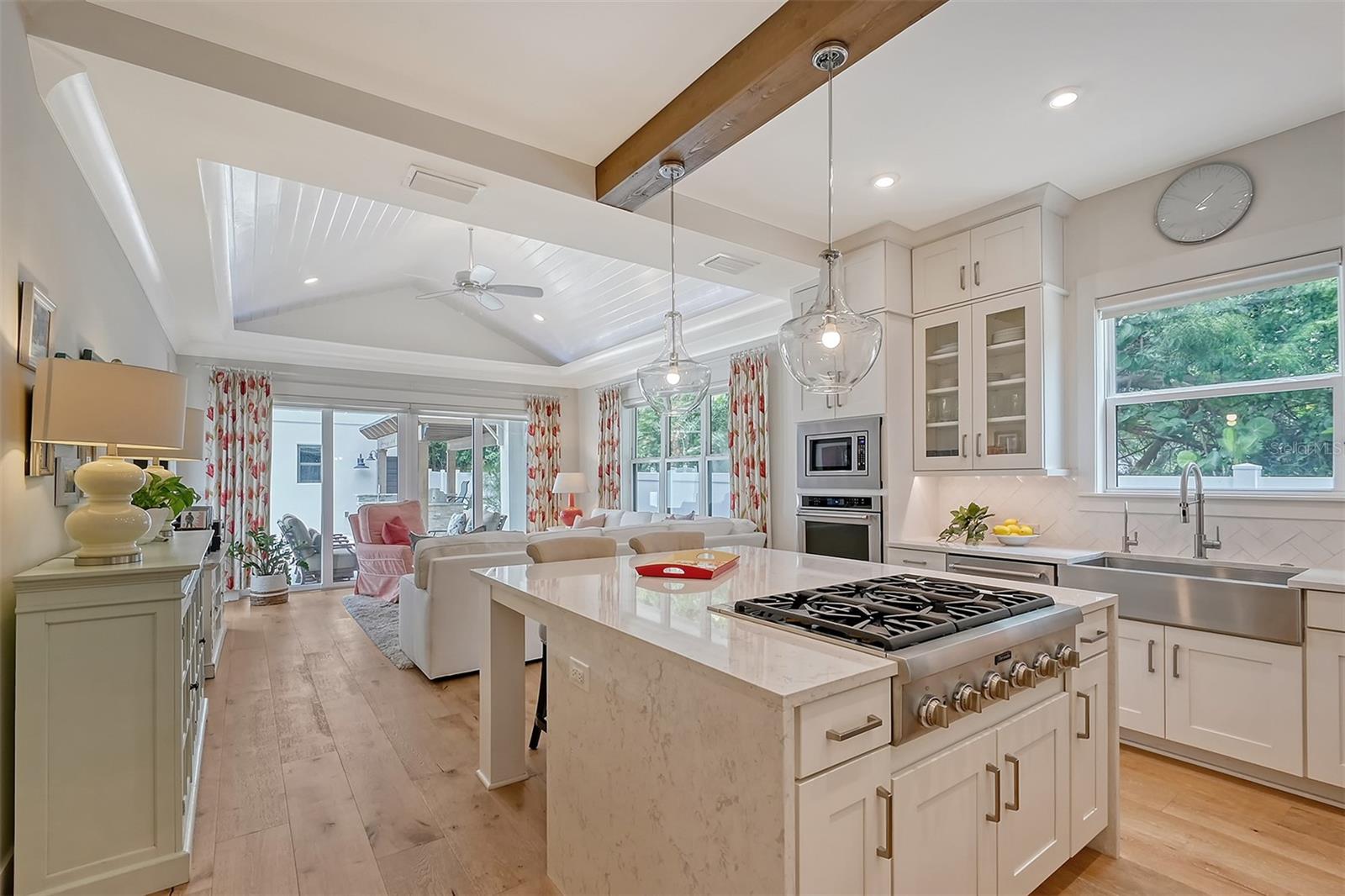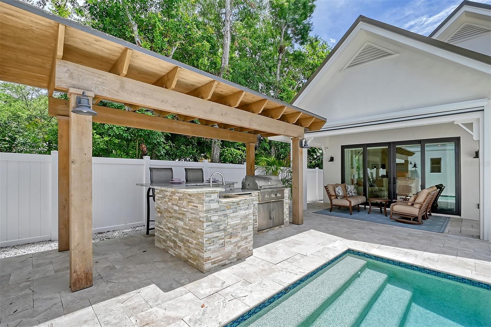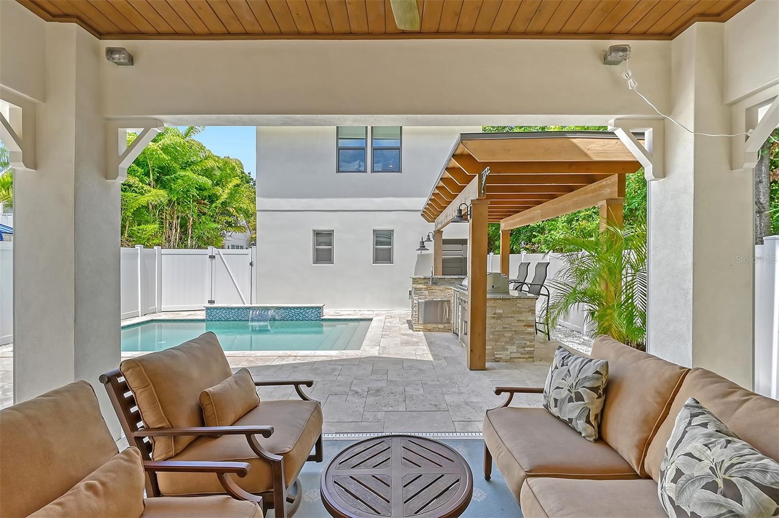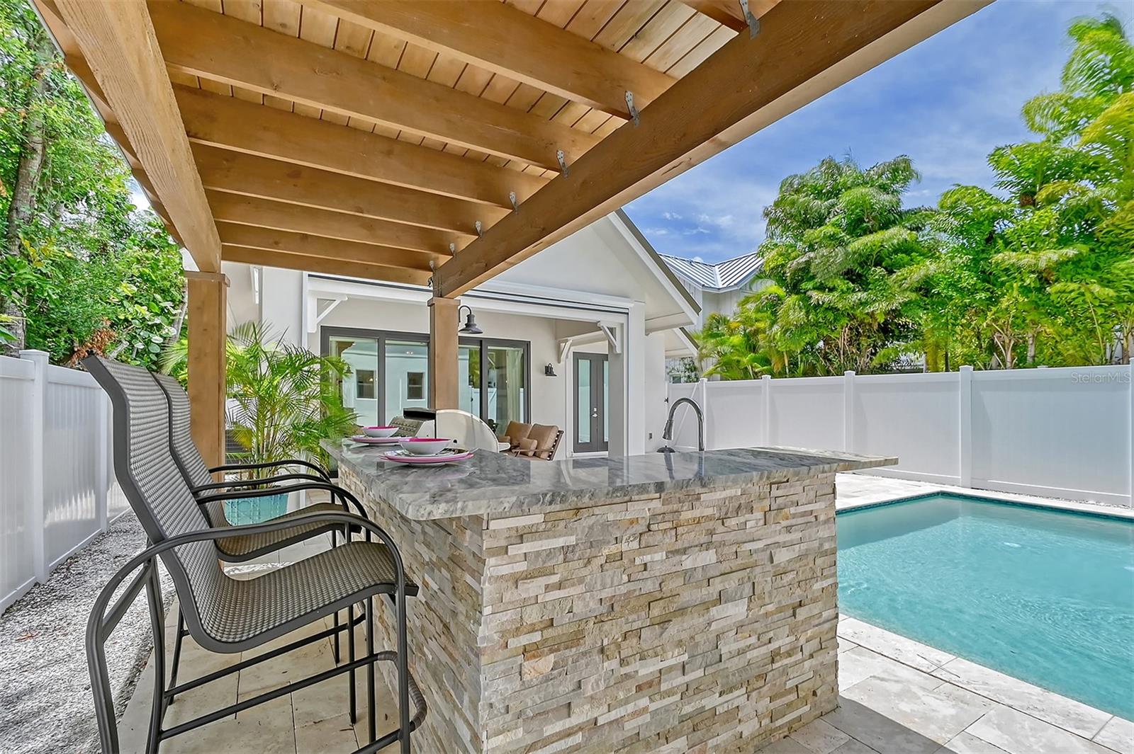 Welcome to Downtown Sarasota’s Historic Laurel Park. A hidden gem within the bustling city, offering a perfect blend of traditional design and coastal charm. This exceptional residence, built in 2018 presents an opportunity for urban living in a serene walkable neighborhood. Upon entering, one is greeted by wood flooring, plank ceilings, and enhanced baseboards and crown molding. Encompassing a flexible floorplan, the main house is complemented by a guest house above the two-car garage. At the heart of the home, the chef’s kitchen is adorned with top-of-the-line appliances including a 6-burner Thermador Professional gas range, Mid Continent Cabinetry and quartz waterfall countertops. The kitchen seamlessly flows into the great room featuring a wood plank vaulted ceiling and sliding glass doors leading out to the covered lanai, offering a perfect blend of indoor/outdoor living. The first-floor primary suite is a haven boasting a tray ceiling with wood plank, French doors to the lanai, two walk-in custom California closets, and a spa-inspired bathroom with a large dual vanity, walk-in shower and freestanding soaking tub. Upstairs, a central loft serves as the perfect bonus room or media room, while two additional large bedrooms and two full bathrooms provide ample space. The studio apartment above the garage serves as the fourth bedroom, complete with a full bathroom and a private entry, making it the ideal space for guests, an art studio, or home office. The outdoor oasis is a refreshing retreat featuring a natural tone travertine deck that leads to a heated pool with waterfall feature. An outdoor kitchen, nestled under a wood pergola, is fully equipped with a built-in grill, beverage refrigerator, and sink. The covered lanai, equipped with electronic retractable screens, seamlessly integrates indoor and outdoor living. Fully fenced outdoor entertaining area, along with an electric gate on the driveway, ensures privacy and security. Additional: high impact windows and doors, window treatments throughout, smart home devices, reverse osmosis water filtration system, wired ethernet throughout, new pool pump (May 2023), new pool heater (March 2022), and new mini-split a/c unit in guest house above garage (Dec 2023). Historic Laurel Park is a walkable neighborhood, offering easy access to grocery stores, Bayfront Park, Downtown Farmers Market, shopping, dining, and cultural entertainment. This downtown oasis presents an unparalleled opportunity to embrace a vibrant urban lifestyle within a serene and picturesque community.