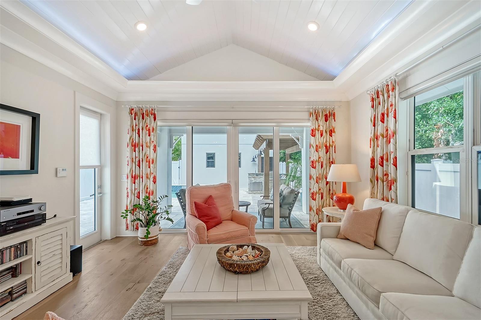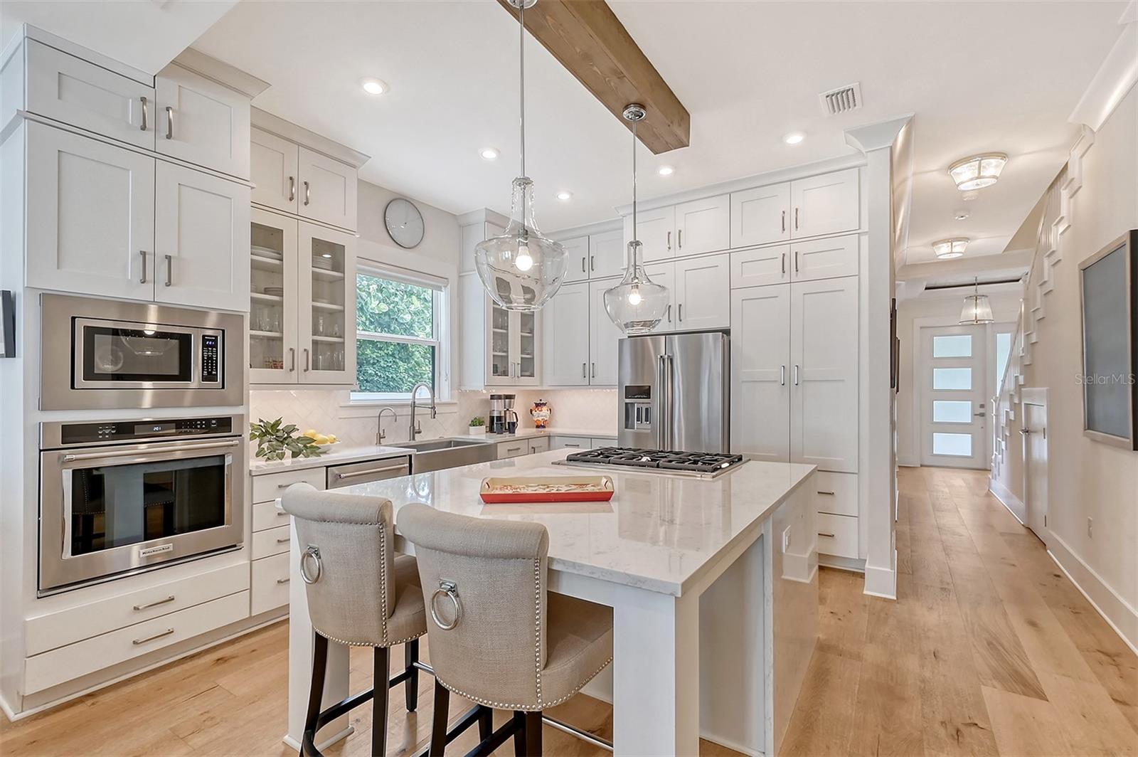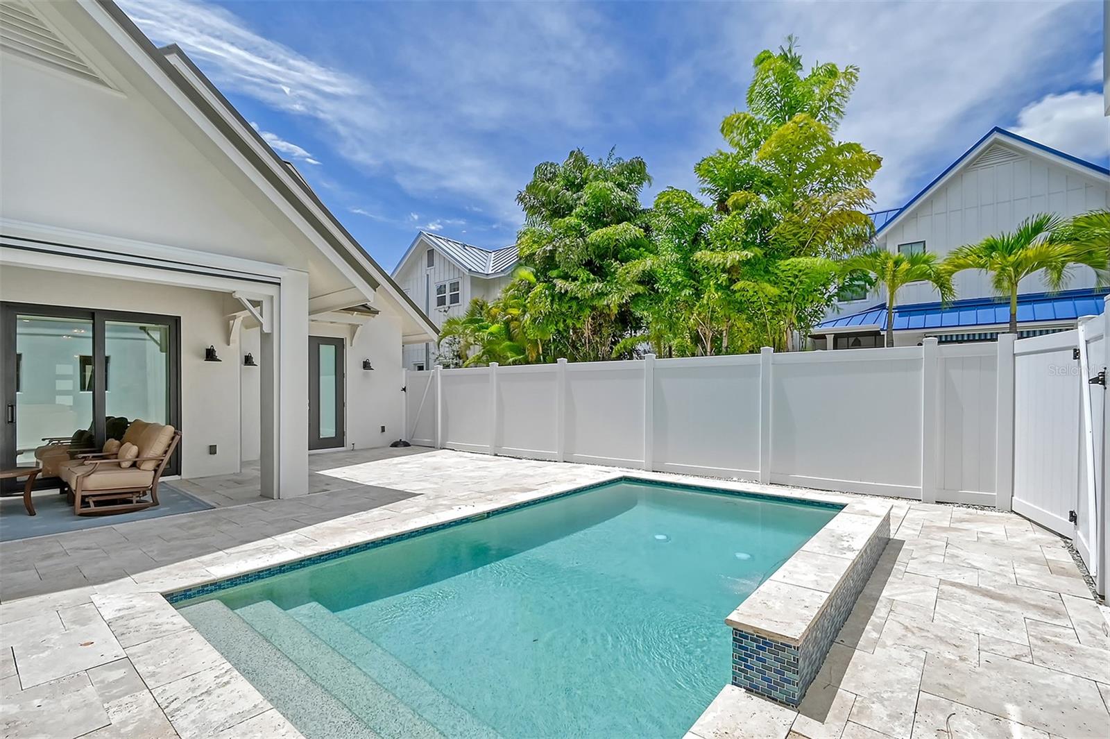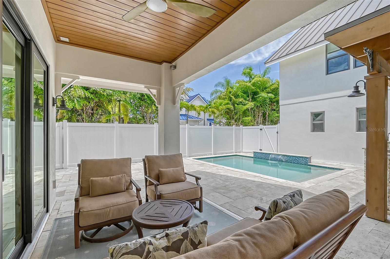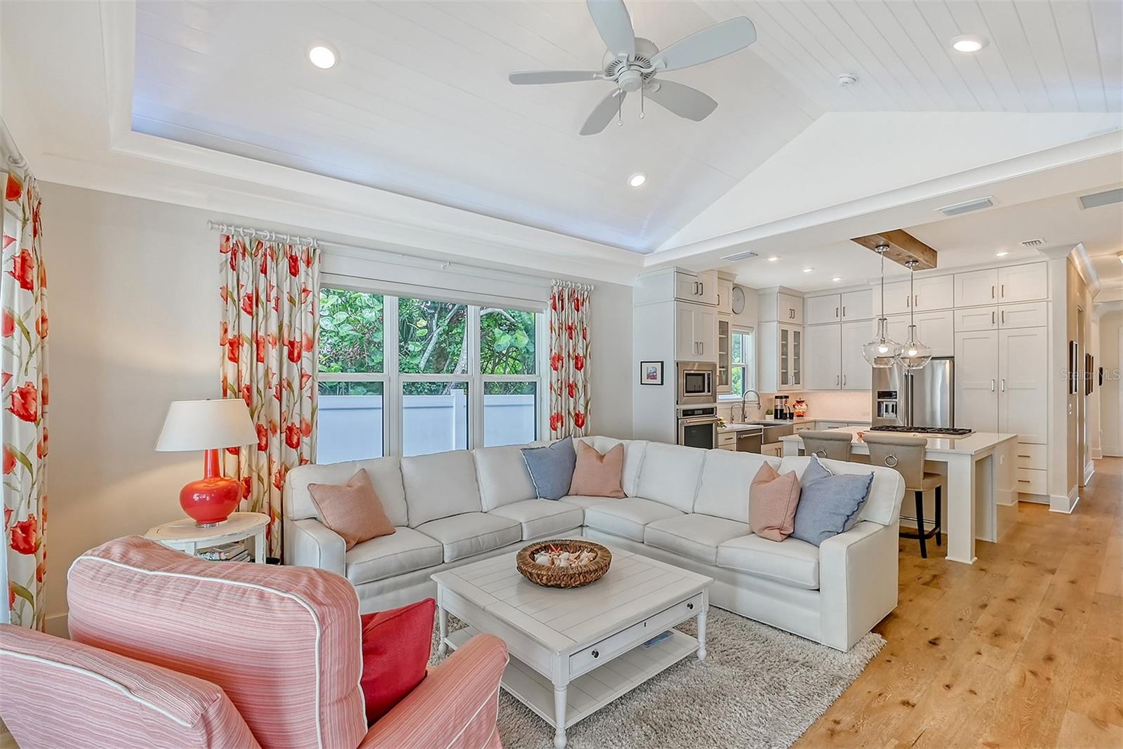 Welcome to Downtown Sarasota’s Historic Laurel Park. A hidden gem within the bustling city, offering a perfect blend of traditional design and coastal charm. This exceptional residence, built in 2018 presents an opportunity for urban living in a serene walkable neighborhood. Upon entering, one is greeted by wood flooring, plank ceilings, and enhanced baseboards and crown molding. Encompassing a flexible floorplan, the main house is complemented by a guest house above the two-car garage. At the heart of the home, the chef’s kitchen is adorned with top-of-the-line appliances including a 6-burner Thermador Professional gas range, Mid Continent Cabinetry and quartz waterfall countertops. The kitchen seamlessly flows into the great room featuring a wood plank vaulted ceiling and sliding glass doors leading out to the covered lanai, offering a perfect blend of indoor/outdoor living. The first-floor primary suite is a haven boasting a tray ceiling with wood plank, French doors to the lanai, two walk-in custom California closets, and a spa-inspired bathroom with a large dual vanity, walk-in shower and freestanding soaking tub. Upstairs, a central loft serves as the perfect bonus room or media room, while two additional large bedrooms and two full bathrooms provide ample space. The studio apartment above the garage serves as the fourth bedroom, complete with a full bathroom and a private entry, making it the ideal space for guests, an art studio, or home office. The outdoor oasis is a refreshing retreat featuring a natural tone travertine deck that leads to a heated pool with waterfall feature. An outdoor kitchen, nestled under a wood pergola, is fully equipped with a built-in grill, beverage refrigerator, and sink. The covered lanai, equipped with electronic retractable screens, seamlessly integrates indoor and outdoor living. Fully fenced outdoor entertaining area, along with an electric gate on the driveway, ensures privacy and security. Additional: high impact windows and doors, window treatments throughout, smart home devices, reverse osmosis water filtration system, wired ethernet throughout, new pool pump (May 2023), new pool heater (March 2022), and new mini-split a/c unit in guest house above garage (Dec 2023). Historic Laurel Park is a walkable neighborhood, offering easy access to grocery stores, Bayfront Park, Downtown Farmers Market, shopping, dining, and cultural entertainment. This downtown oasis presents an unparalleled opportunity to embrace a vibrant urban lifestyle within a serene and picturesque community.