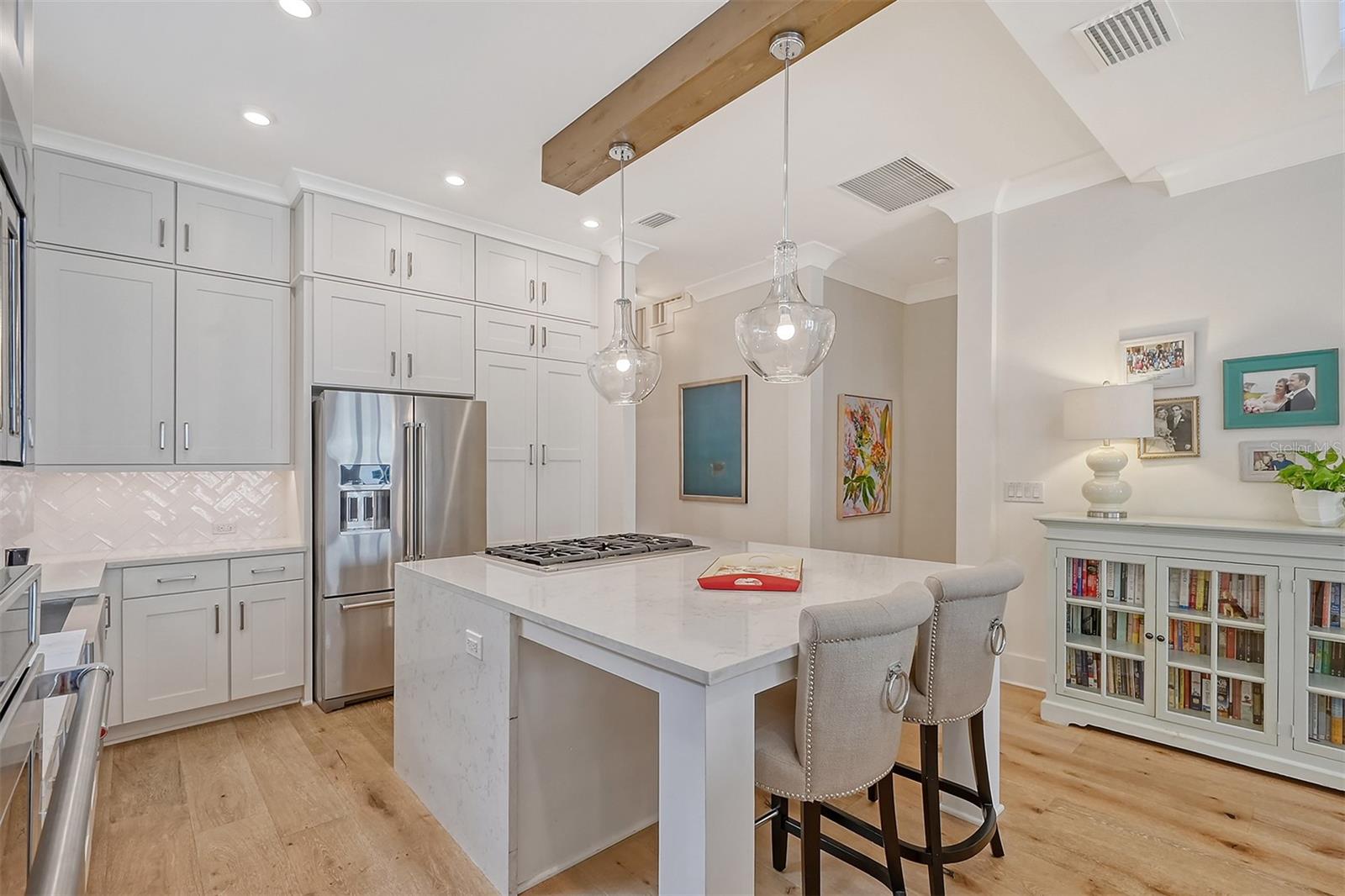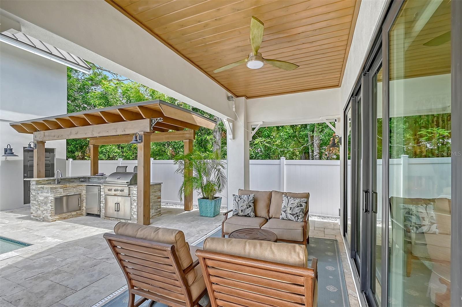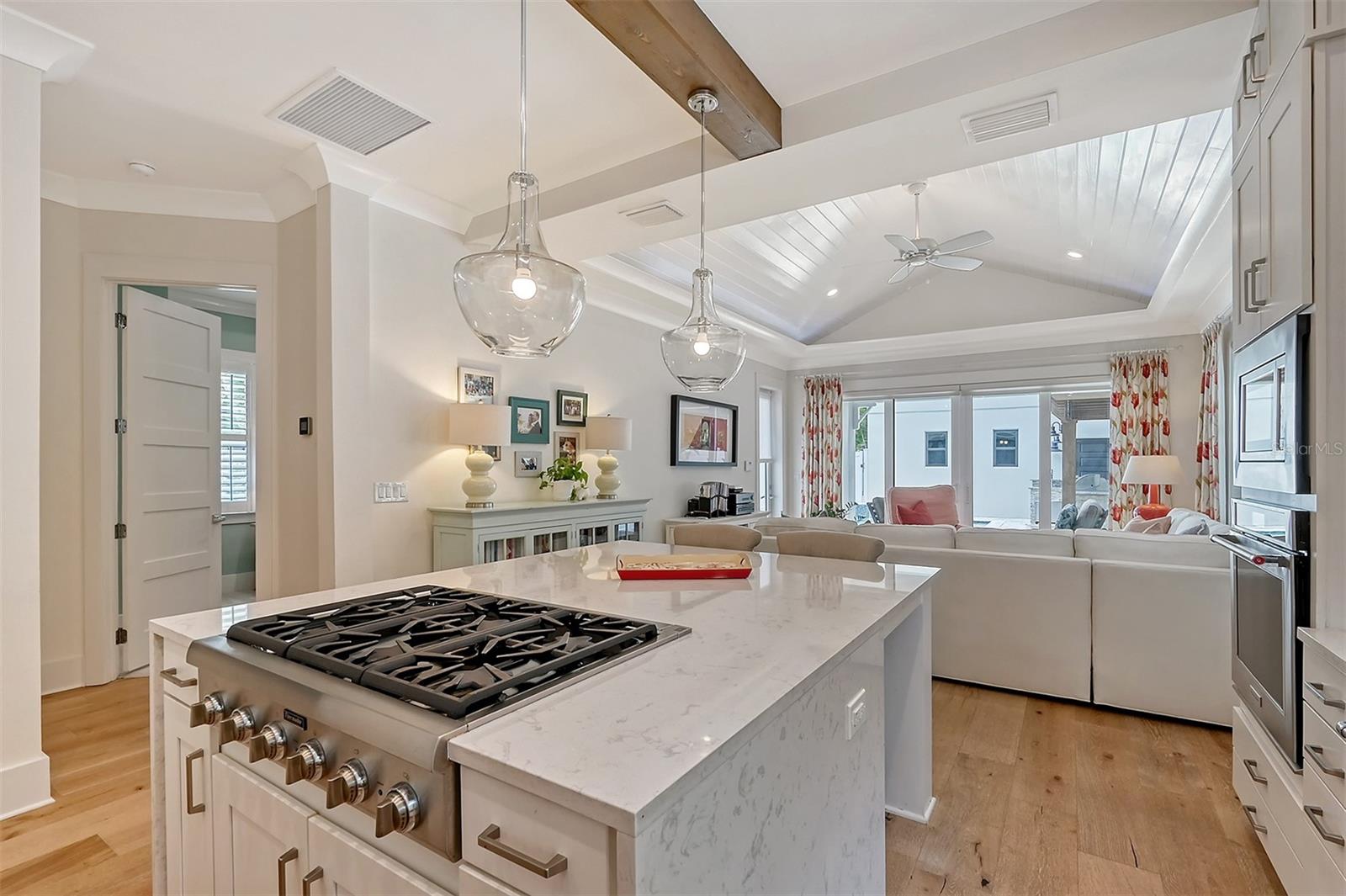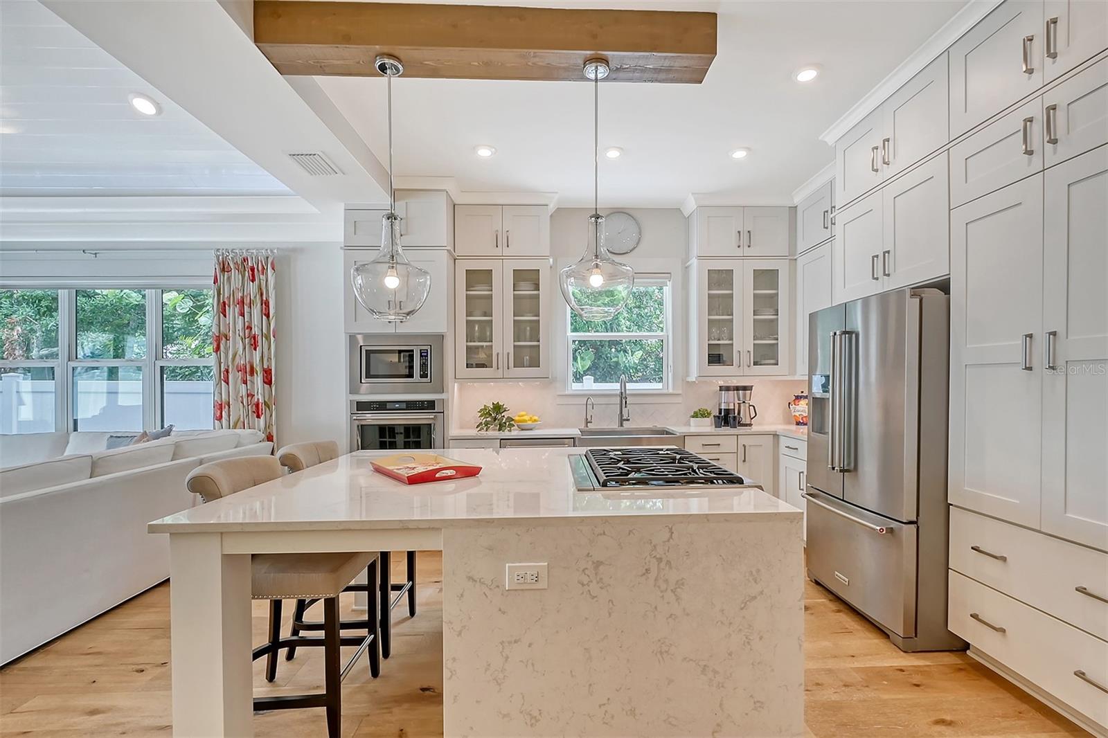 Welcome to Downtown Sarasota’s Historic Laurel Park. A hidden gem within the bustling city, offering a perfect blend of traditional design and coastal charm. This exceptional residence, built in 2018 presents an opportunity for urban living in a serene walkable neighborhood. Upon entering, one is greeted by wood flooring, plank ceilings, and enhanced baseboards and crown molding. Encompassing a flexible floorplan, the main house is complemented by a guest house above the two-car garage. At the heart of the home, the chef’s kitchen is adorned with top-of-the-line appliances including a 6-burner Thermador Professional gas range, Mid Continent Cabinetry and quartz waterfall countertops. The kitchen seamlessly flows into the great room featuring a wood plank vaulted ceiling and sliding glass doors leading out to the covered lanai, offering a perfect blend of indoor/outdoor living. The first-floor primary suite is a haven boasting a tray ceiling with wood plank, French doors to the lanai, two walk-in custom California closets, and a spa-inspired bathroom with a large dual vanity, walk-in shower and freestanding soaking tub. Upstairs, a central loft serves as the perfect bonus room or media room, while two additional large bedrooms and two full bathrooms provide ample space. The studio apartment above the garage serves as the fourth bedroom, complete with a full bathroom and a private entry, making it the ideal space for guests, an art studio, or home office. The outdoor oasis is a refreshing retreat featuring a natural tone travertine deck that leads to a heated pool with waterfall feature. An outdoor kitchen, nestled under a wood pergola, is fully equipped with a built-in grill, beverage refrigerator, and sink. The covered lanai, equipped with electronic retractable screens, seamlessly integrates indoor and outdoor living. Fully fenced outdoor entertaining area, along with an electric gate on the driveway, ensures privacy and security. Additional: high impact windows and doors, window treatments throughout, smart home devices, reverse osmosis water filtration system, wired ethernet throughout, new pool pump (May 2023), new pool heater (March 2022), and new mini-split a/c unit in guest house above garage (Dec 2023). Historic Laurel Park is a walkable neighborhood, offering easy access to grocery stores, Bayfront Park, Downtown Farmers Market, shopping, dining, and cultural entertainment. This downtown oasis presents an unparalleled opportunity to embrace a vibrant urban lifestyle within a serene and picturesque community.