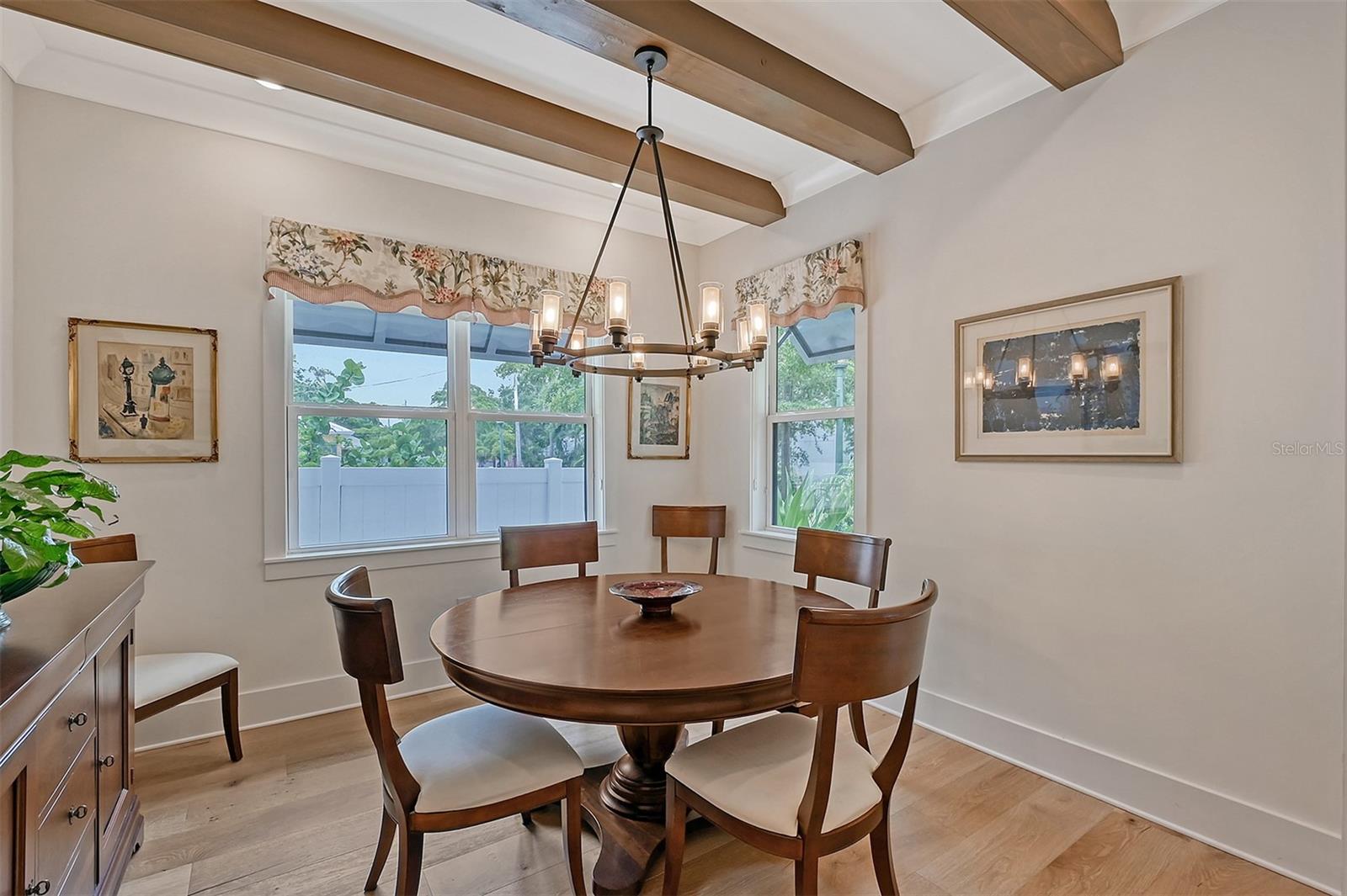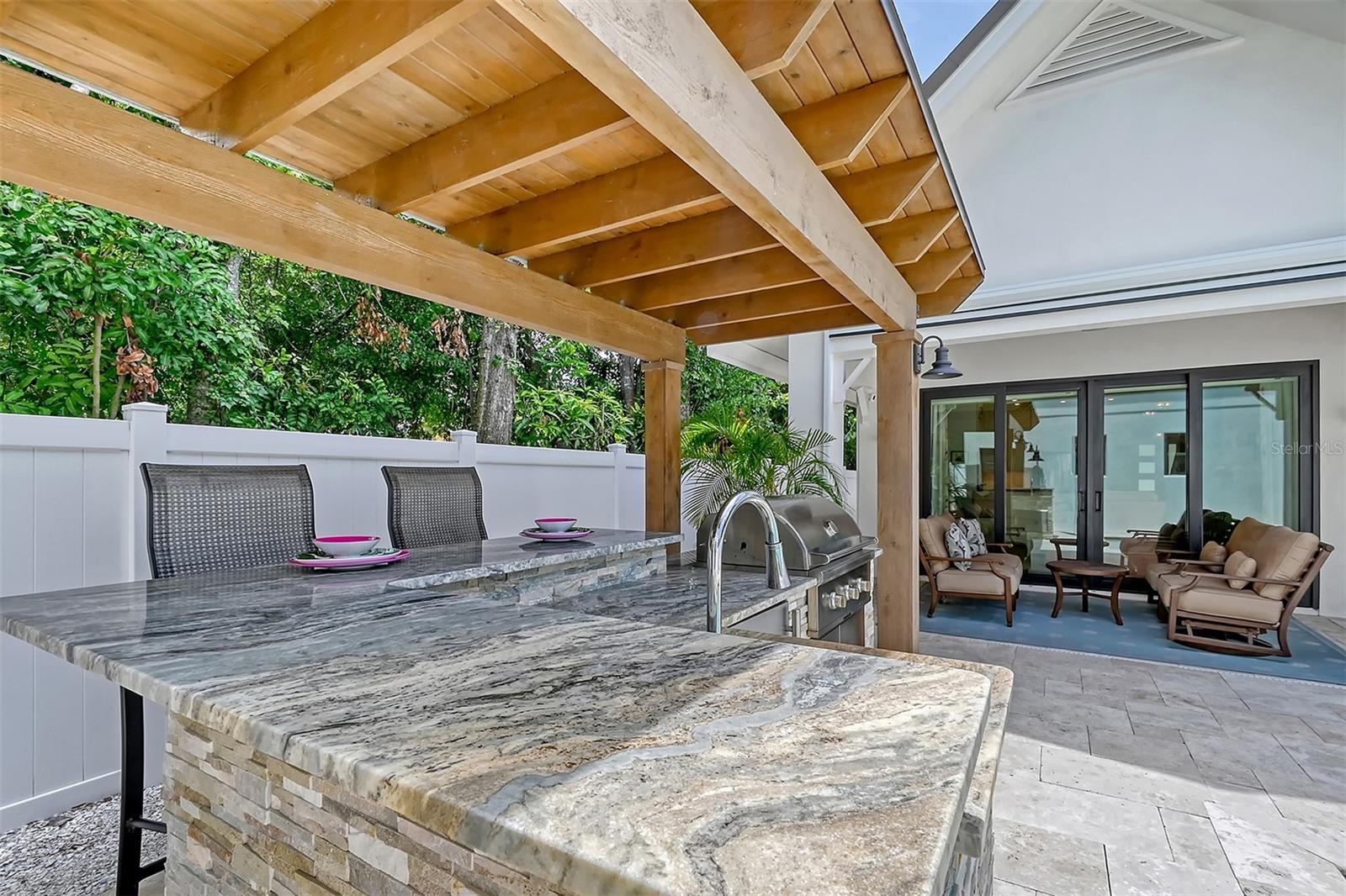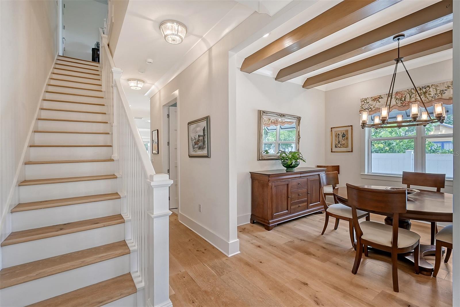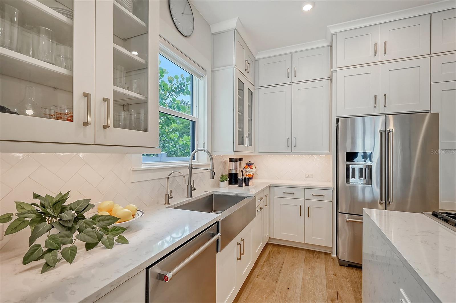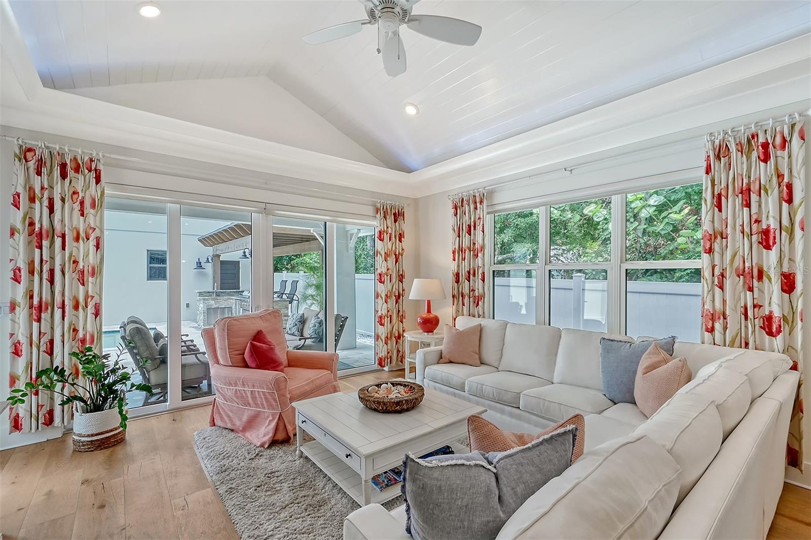 Welcome to Downtown Sarasota’s Historic Laurel Park. A hidden gem within the bustling city, offering a perfect blend of traditional design and coastal charm. This exceptional residence, built in 2018 presents an opportunity for urban living in a serene walkable neighborhood. Upon entering, one is greeted by wood flooring, plank ceilings, and enhanced baseboards and crown molding. Encompassing a flexible floorplan, the main house is complemented by a guest house above the two-car garage. At the heart of the home, the chef’s kitchen is adorned with top-of-the-line appliances including a 6-burner Thermador Professional gas range, Mid Continent Cabinetry and quartz waterfall countertops. The kitchen seamlessly flows into the great room featuring a wood plank vaulted ceiling and sliding glass doors leading out to the covered lanai, offering a perfect blend of indoor/outdoor living. The first-floor primary suite is a haven boasting a tray ceiling with wood plank, French doors to the lanai, two walk-in custom California closets, and a spa-inspired bathroom with a large dual vanity, walk-in shower and freestanding soaking tub. Upstairs, a central loft serves as the perfect bonus room or media room, while two additional large bedrooms and two full bathrooms provide ample space. The studio apartment above the garage serves as the fourth bedroom, complete with a full bathroom and a private entry, making it the ideal space for guests, an art studio, or home office. The outdoor oasis is a refreshing retreat featuring a natural tone travertine deck that leads to a heated pool with waterfall feature. An outdoor kitchen, nestled under a wood pergola, is fully equipped with a built-in grill, beverage refrigerator, and sink. The covered lanai, equipped with electronic retractable screens, seamlessly integrates indoor and outdoor living. Fully fenced outdoor entertaining area, along with an electric gate on the driveway, ensures privacy and security. Additional: high impact windows and doors, window treatments throughout, smart home devices, reverse osmosis water filtration system, wired ethernet throughout, new pool pump (May 2023), new pool heater (March 2022), and new mini-split a/c unit in guest house above garage (Dec 2023). Historic Laurel Park is a walkable neighborhood, offering easy access to grocery stores, Bayfront Park, Downtown Farmers Market, shopping, dining, and cultural entertainment. This downtown oasis presents an unparalleled opportunity to embrace a vibrant urban lifestyle within a serene and picturesque community.