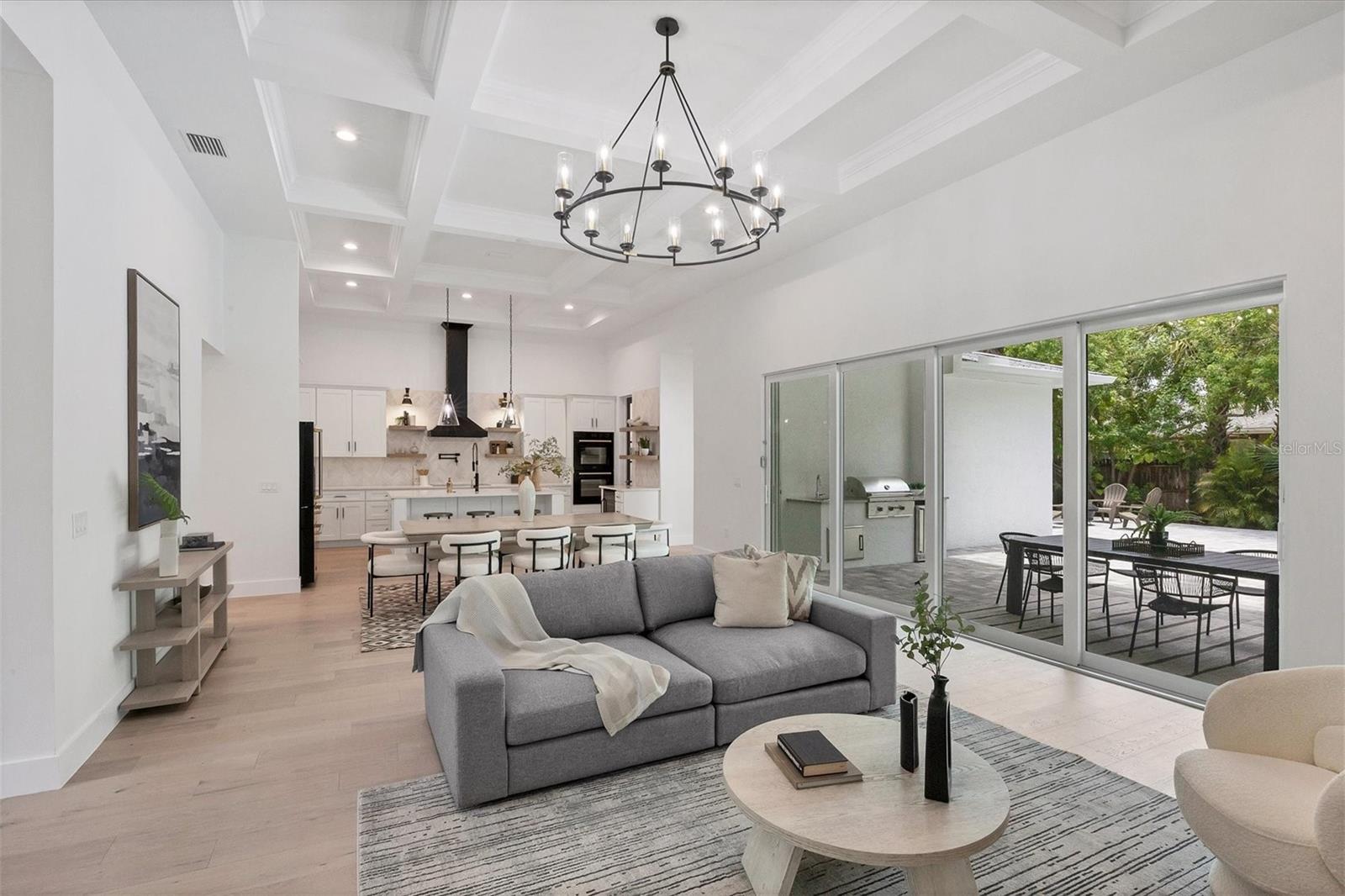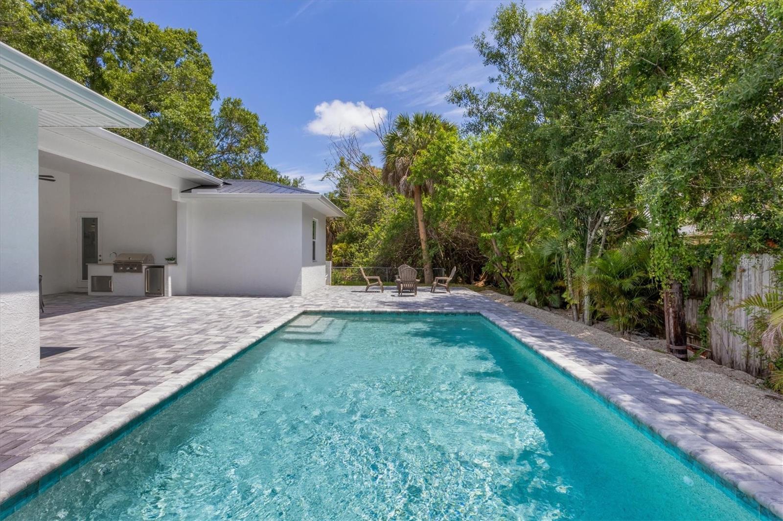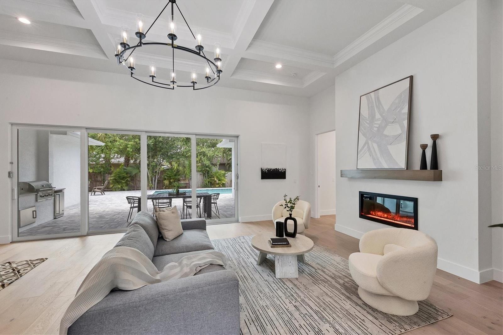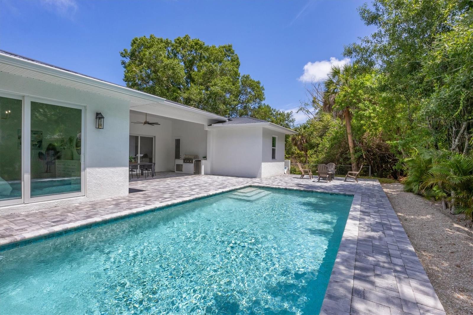 Welcome to your dream home—an impeccably designed new construction that blends sophistication, comfort, and durability. Offering 2,537 square feet of heated space and 3,545 square feet under air, this four-bedroom, three-bath estate has been thoughtfully crafted for seamless living and entertaining. Every element, from its elegant interiors to the outdoor spaces, reflects meticulous attention to detail. Step outside and immerse yourself in a personal oasis. The oversized saltwater pool, surrounded by an expansive paver deck and lanai, creates the perfect setting for relaxation or hosting guests. The outdoor kitchen, equipped with granite countertops, a gas grill, sink, and refrigerator, is a chef’s dream, making al fresco dining effortless. Built with a stem-wall foundation and all-block construction, this home offers unmatched durability. Energy-efficient spray-in insulation and a sleek black metal roof provide year-round comfort while reducing energy costs. Maintenance-free aluminum soffits and fascia ensure the exterior remains pristine with minimal upkeep, and impact-rated hurricane windows, doors, and sliders deliver peace of mind and safety during storm season. Inside, the great room captivates with 12’8” coffered ceilings, a cozy fireplace, and wall-to-wall sliding glass doors that open to the lanai, blending indoor and outdoor living spaces. Engineered hardwood floors flow throughout the home, complemented by custom lighting and upgraded Moen plumbing fixtures. The gourmet kitchen features all-wood custom shaker cabinets, quartz countertops, and Z-Line appliances with gold accents, including a double oven and separate induction range—perfect for preparing meals for any occasion. The luxurious main retreat offers a tranquil escape, featuring tray ceilings, a custom-designed feature wall, and private access to the pool. The spa-like ensuite bath invites relaxation with a freestanding soaking tub, oversized shower, and premium fixtures. Additional highlights include a versatile flex room or fourth bedroom, ideal as an office or guest space, and an oversized two-car garage with hurricane-rated doors for added protection. A well-appointed laundry room, complete with quartz countertops, abundant storage, and Samsung Smart appliances, adds convenience to everyday living. Located just minutes from downtown Sarasota, in X FLOOD ZONE, this home puts you close to the city’s vibrant arts, dining, and cultural scene. The Legacy Trail, less than a mile away, offers a scenic route for biking or walking, while Sarasota’s world-renowned beaches are just a short drive away, making it easy to enjoy the best of coastal living. This home offers a rare combination of elegance, convenience, and resilience, creating the perfect backdrop for a modern lifestyle. Don’t miss the opportunity to make it yours—schedule a private tour today and experience a property that will inspire you for years to come.