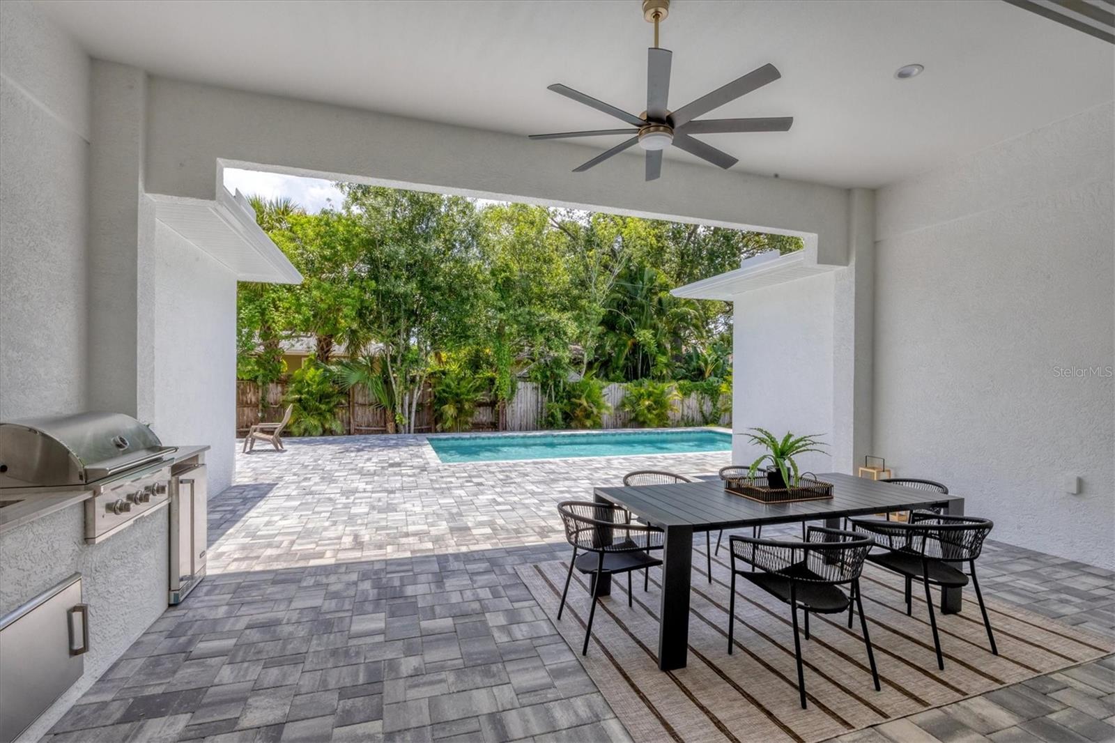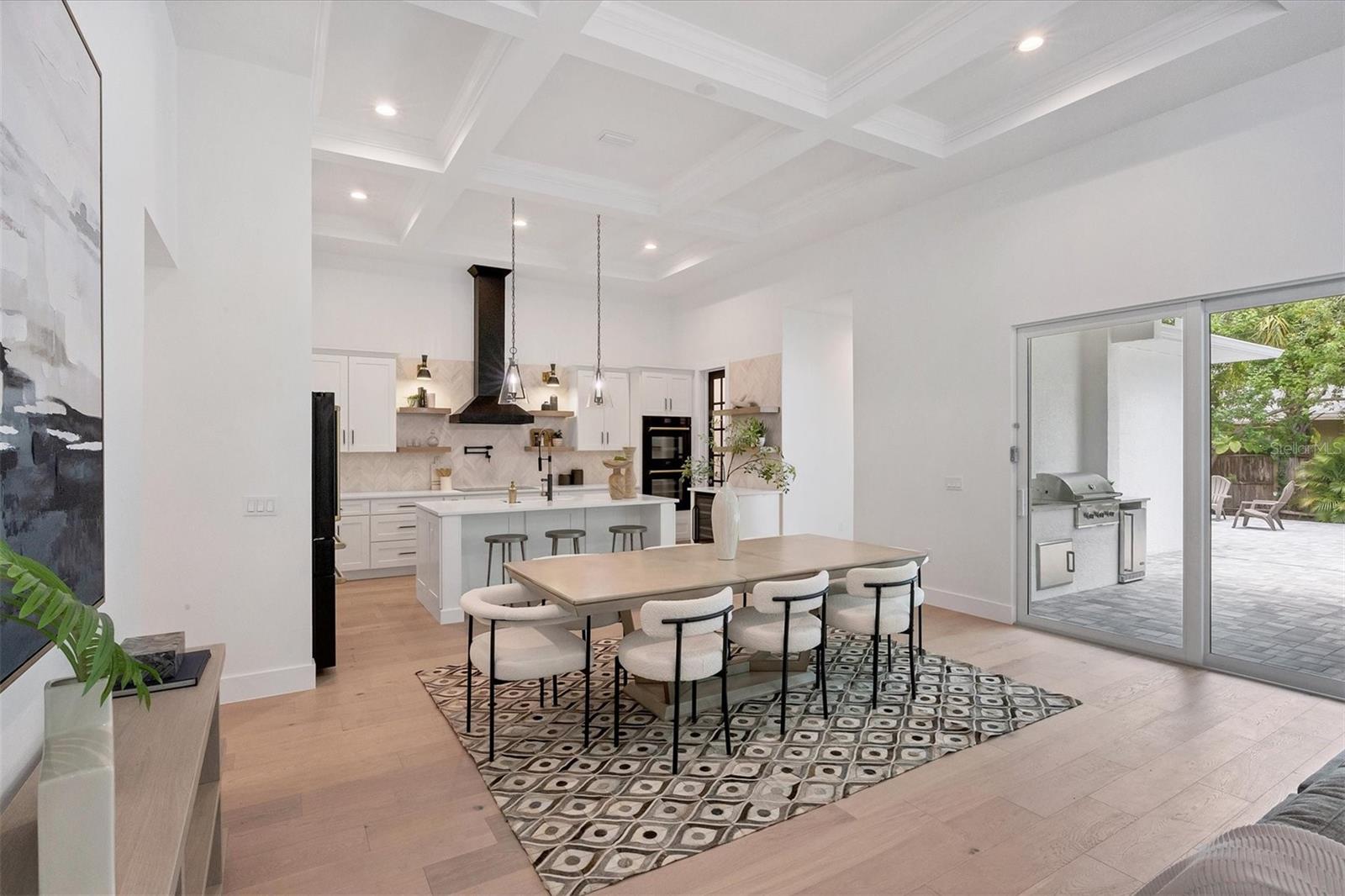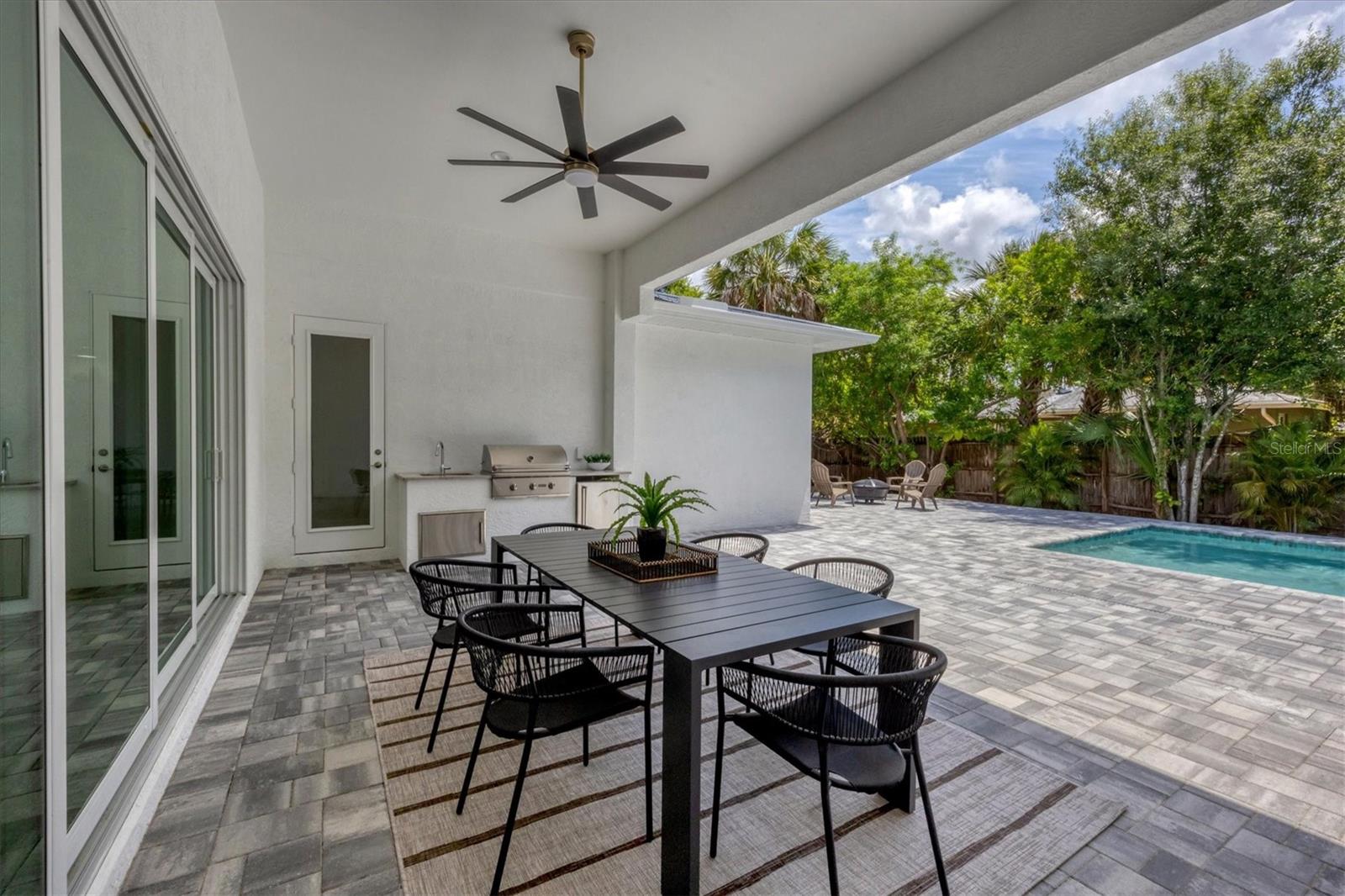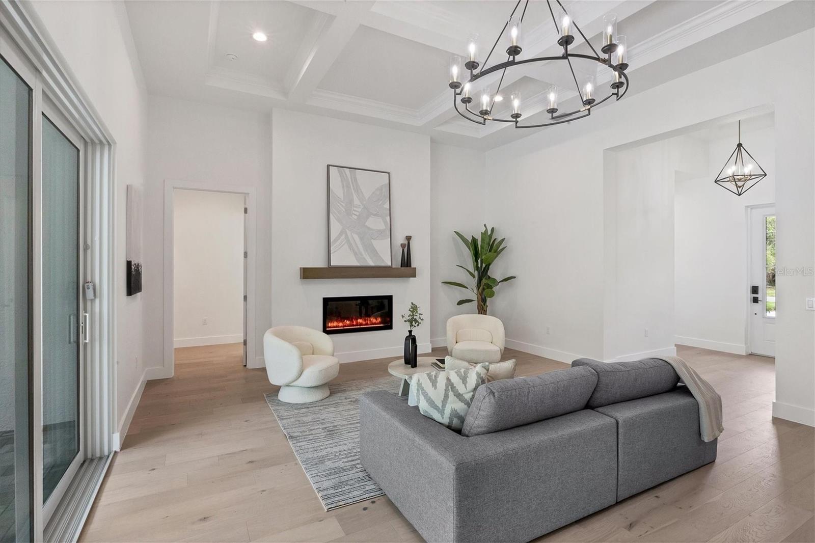 Welcome to your dream home—an impeccably designed new construction that blends sophistication, comfort, and durability. Offering 2,537 square feet of heated space and 3,545 square feet under air, this four-bedroom, three-bath estate has been thoughtfully crafted for seamless living and entertaining. Every element, from its elegant interiors to the outdoor spaces, reflects meticulous attention to detail. Step outside and immerse yourself in a personal oasis. The oversized saltwater pool, surrounded by an expansive paver deck and lanai, creates the perfect setting for relaxation or hosting guests. The outdoor kitchen, equipped with granite countertops, a gas grill, sink, and refrigerator, is a chef’s dream, making al fresco dining effortless. Built with a stem-wall foundation and all-block construction, this home offers unmatched durability. Energy-efficient spray-in insulation and a sleek black metal roof provide year-round comfort while reducing energy costs. Maintenance-free aluminum soffits and fascia ensure the exterior remains pristine with minimal upkeep, and impact-rated hurricane windows, doors, and sliders deliver peace of mind and safety during storm season. Inside, the great room captivates with 12’8” coffered ceilings, a cozy fireplace, and wall-to-wall sliding glass doors that open to the lanai, blending indoor and outdoor living spaces. Engineered hardwood floors flow throughout the home, complemented by custom lighting and upgraded Moen plumbing fixtures. The gourmet kitchen features all-wood custom shaker cabinets, quartz countertops, and Z-Line appliances with gold accents, including a double oven and separate induction range—perfect for preparing meals for any occasion. The luxurious main retreat offers a tranquil escape, featuring tray ceilings, a custom-designed feature wall, and private access to the pool. The spa-like ensuite bath invites relaxation with a freestanding soaking tub, oversized shower, and premium fixtures. Additional highlights include a versatile flex room or fourth bedroom, ideal as an office or guest space, and an oversized two-car garage with hurricane-rated doors for added protection. A well-appointed laundry room, complete with quartz countertops, abundant storage, and Samsung Smart appliances, adds convenience to everyday living. Located just minutes from downtown Sarasota, in X FLOOD ZONE, this home puts you close to the city’s vibrant arts, dining, and cultural scene. The Legacy Trail, less than a mile away, offers a scenic route for biking or walking, while Sarasota’s world-renowned beaches are just a short drive away, making it easy to enjoy the best of coastal living. This home offers a rare combination of elegance, convenience, and resilience, creating the perfect backdrop for a modern lifestyle. Don’t miss the opportunity to make it yours—schedule a private tour today and experience a property that will inspire you for years to come.