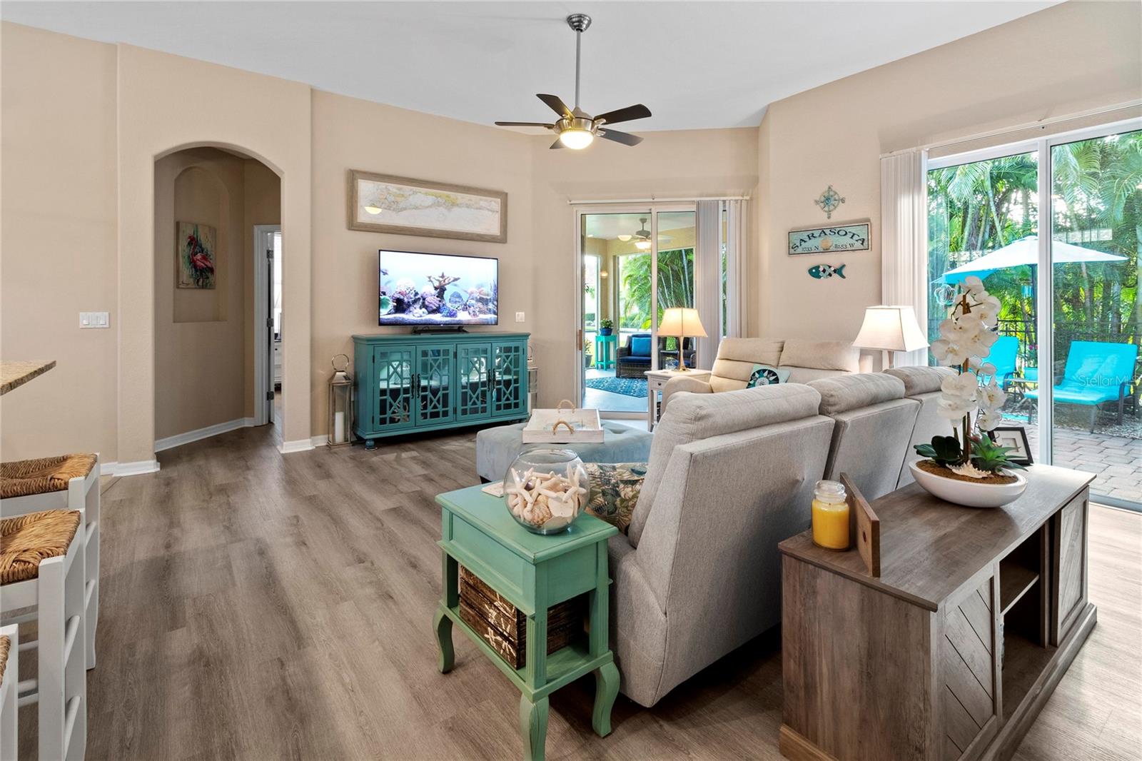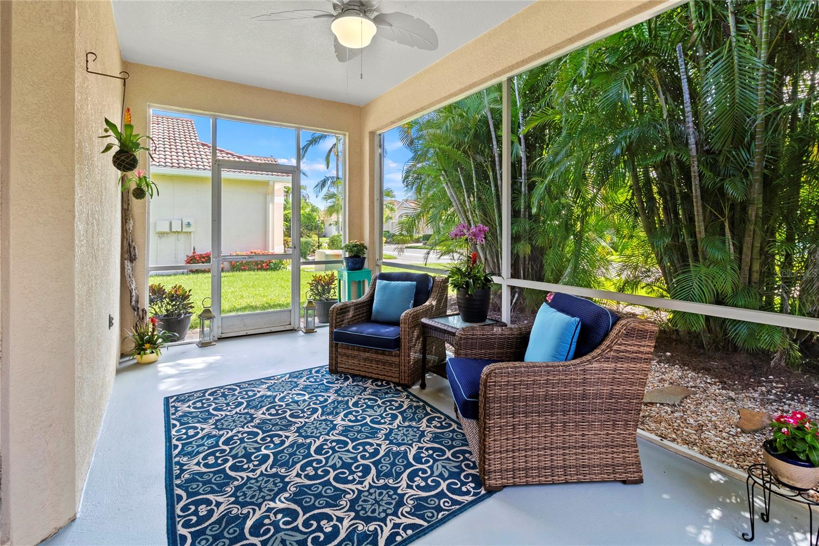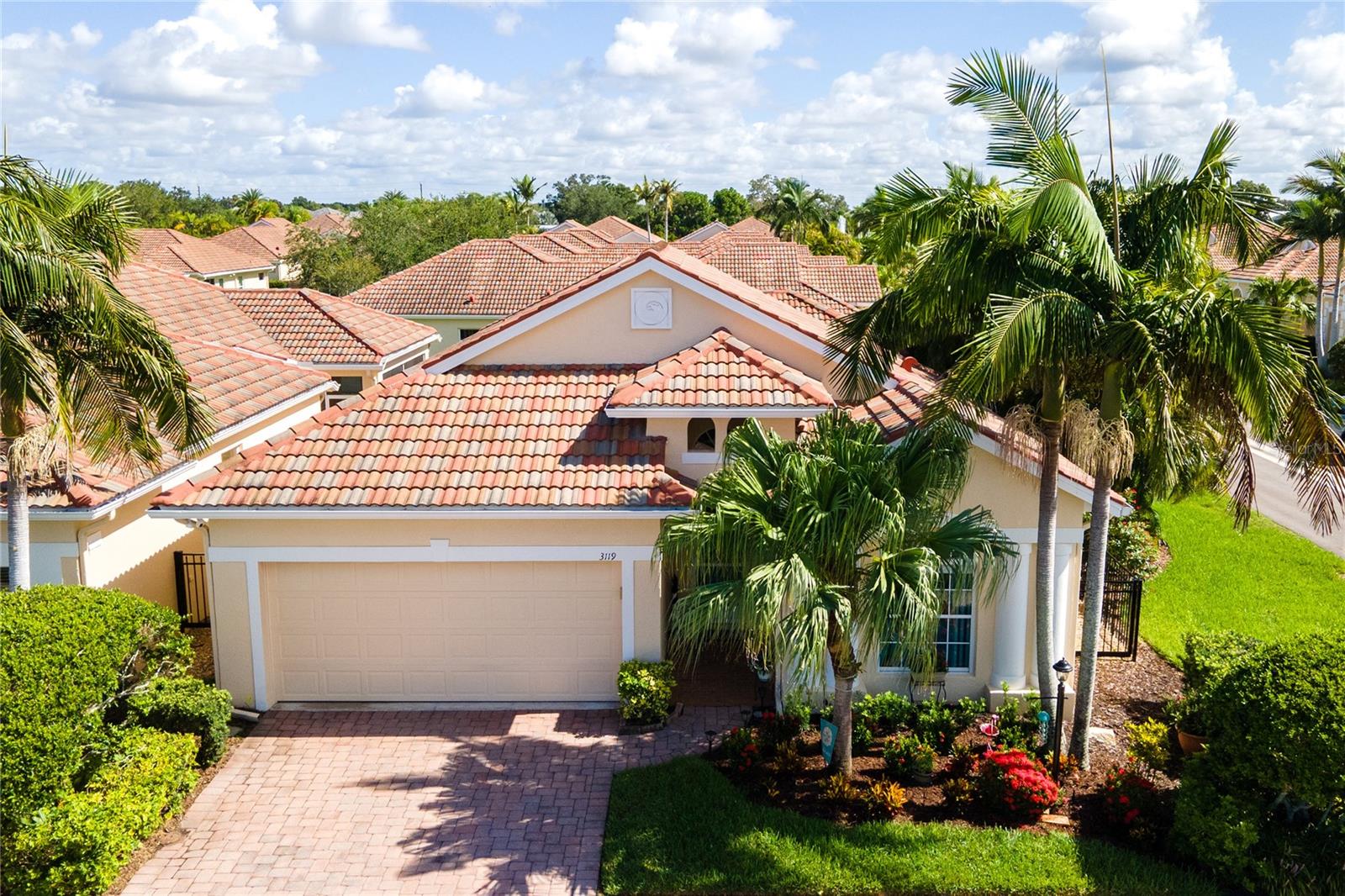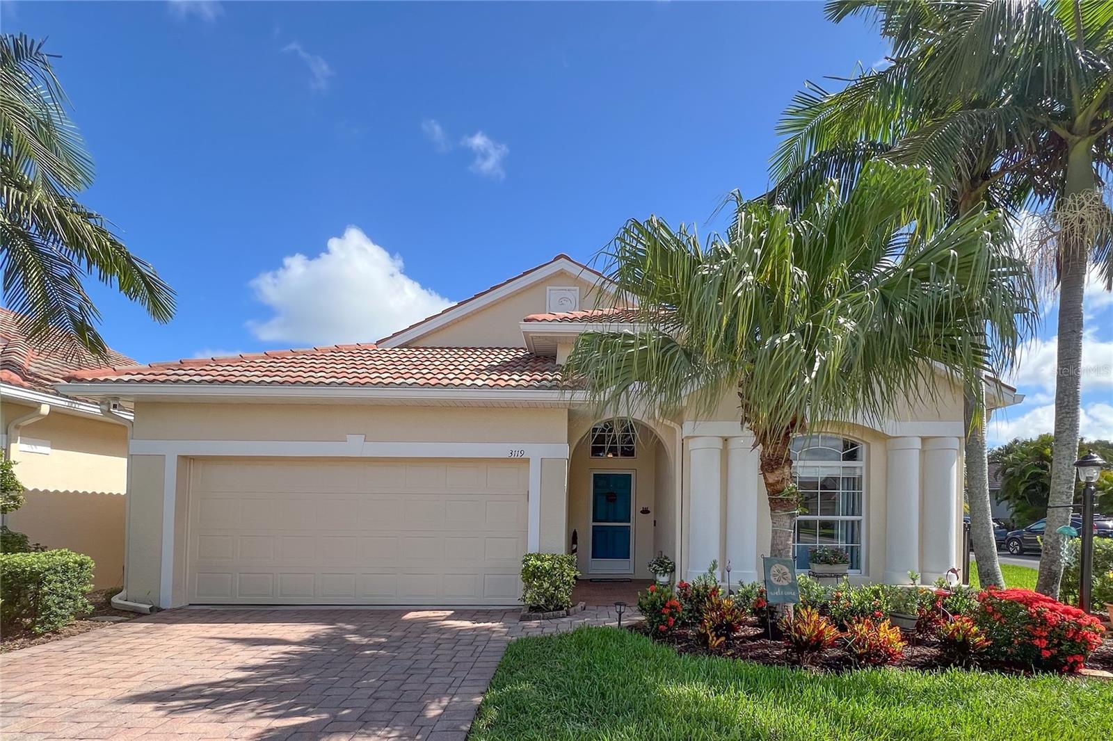 Experience the masterful blend of maintenance-free living with the privacy of a single-family home in this two bedroom + den and two bath residence situated on a corner lot. Palm Lakes is a gated community of single story, free-standing homes with low monthly dues. Perfect as a primary or secondary home. Make an entrance on the pavered walkway with enhanced landscaping to the foyer to find the split plan guest quarters for excellent privacy. Splendid great room floor plan perfect for entertaining including dining area, eat-in kitchen with generous breakfast bar, granite counters and newer stainless appliances (refrigerator 2024). Roomy primary bedroom offers access through sliders to the screened lanai offering a wonderful and private place to unwind and enjoy the fresh air. Let’s not forget the bonus den that could be easily converted to a third bedroom. You are sure to enjoy the convenience of the dedicated laundry room and roomy two car garage. New flooring, new hot water heater and new exterior paint ensuring peace of mind for years to come (Barrel Tile Roof 19 yo & HVAC 8 yo). The open design of this home boasts stunning new luxury vinyl flooring, hardwood (guest) and ceramic tile (kitchen & baths) requiring effortless maintenance and excellent for those sandy feet. This home offers high ceilings, beautiful custom architectural features that include arches, columns, recessed lighting, palladian windows and art niche foyer walls. Palm Lakes offers a community pool, playground and clubhouse with pool table & kitchen. There’s even a generator at the clubhouse. The low maintenance fees include lawn maintenance, exterior painting and pest control. This prime location affords convenient access to all cultural venues, dining, retail, golf, excellent schools and world-class powdery sand Gulf beaches. You are sure to find this tranquil oasis the place for great memories to be made.