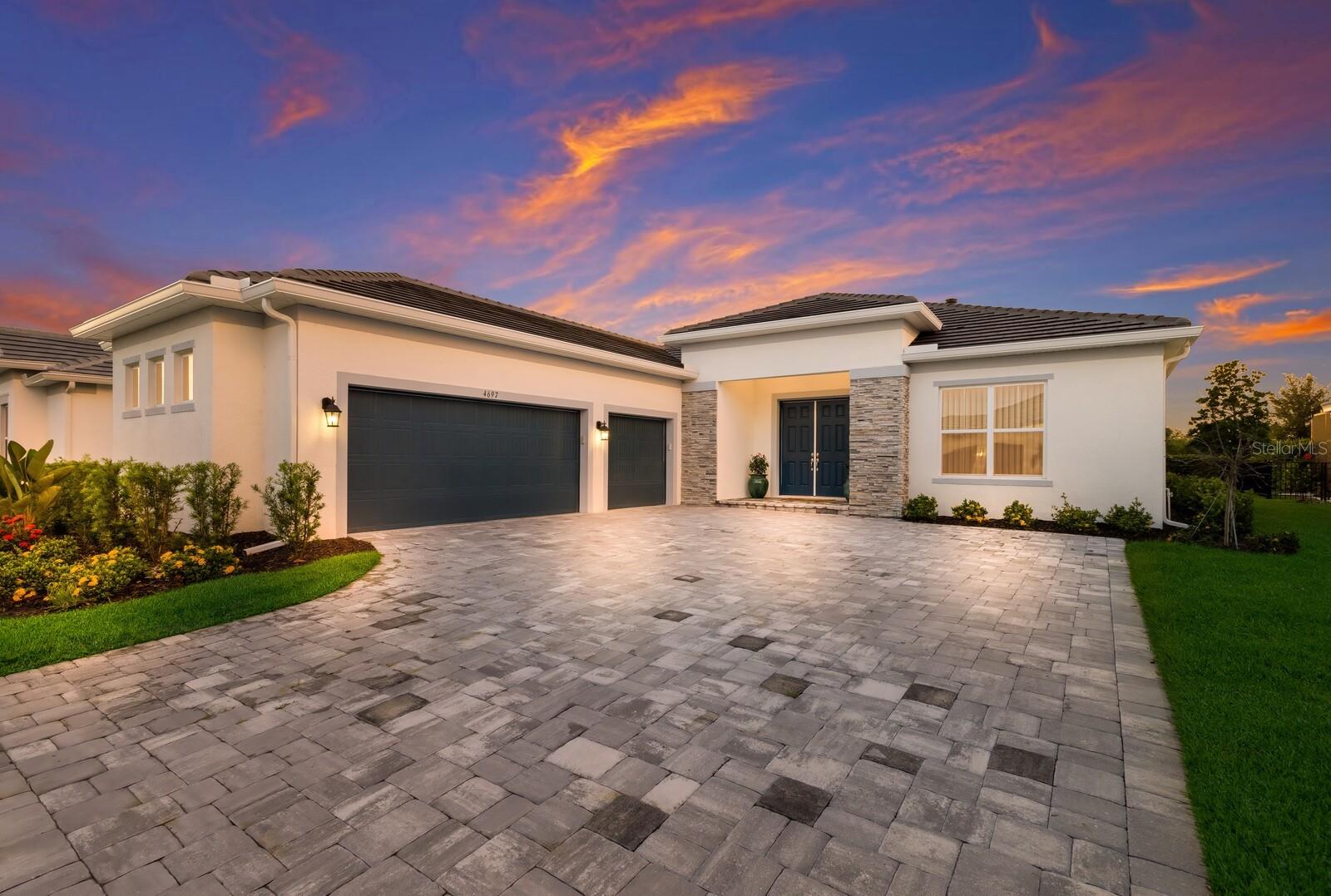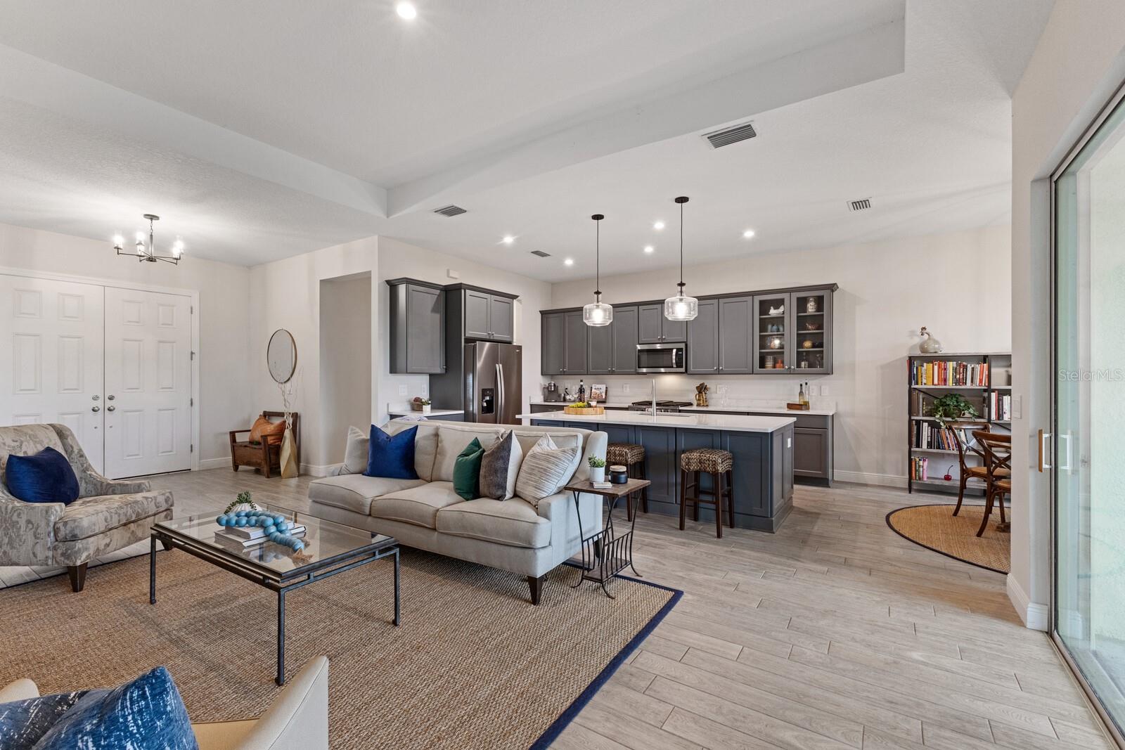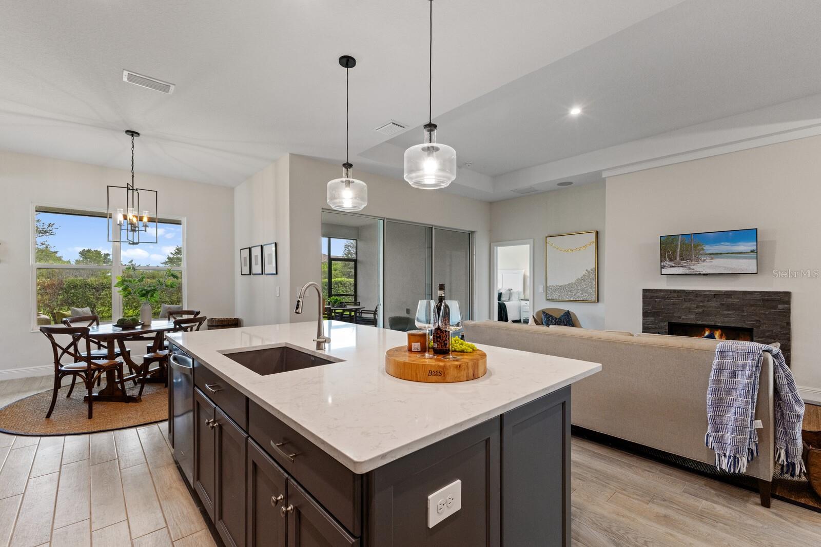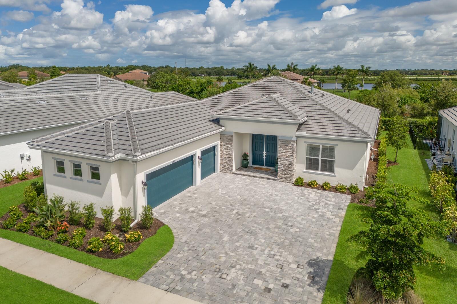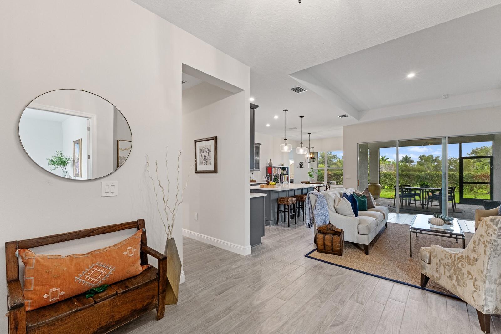 Situated on private setting, this Asher great room plan residence is nestled in Worthington, one of Sarasota’s newer gated communities offering an intimate neighborhood setting with maintenance-free living. This one-story 2,300 square foot open living concept plan boasts serene surroundings, optimal curb appeal, volume tray ceilings, and stunning plank tile flooring throughout. This three bedroom plus den and a bonus room plan is ideal for entertaining and every day living at every turn flowing seamlessly between the great room with gas fireplace, dining area and kitchen. Chefs will delight in the upgraded cabinetry and quartz counters, counter height island bar, stainless steel appliances, oversized walk-in pantry, and perfectly sized dining area engulfed by the surrounding private views beyond. Seamlessly connected to the outdoors, glass sliders reveal a serene outdoor living space with ample under cover screened entertainment areas, plus plenty of space to add a pool, spa, and outdoor kitchen. Relax and unwind in the elegant owner’s retreat positioned on a private wing, offering two walk-in closets, tray ceiling, and an appointed bath boasting separate vanities with quartz counters, large shower, and separate water closet. Overnight visitors will be right at home on their own separate wing with two generous guest suites centered by the home’s second full bath. Behind double doors off the great room, this inviting residence offers a dedicated separate study/den as well as a bonus room just off the third full bath. This inviting gem evokes a coastal elegance with a plethora of additional highlights including an oversized laundry room with utility sink, central vacuum, tankless water heater, hurricane shutters, pavered driveway, barrel tile roof, and a courtyard entry three car garage. Worthington is positioned in East Sarasota, minutes from downtown Sarasota, UTC Mall, Waterside Place, and Lakewood Ranch.