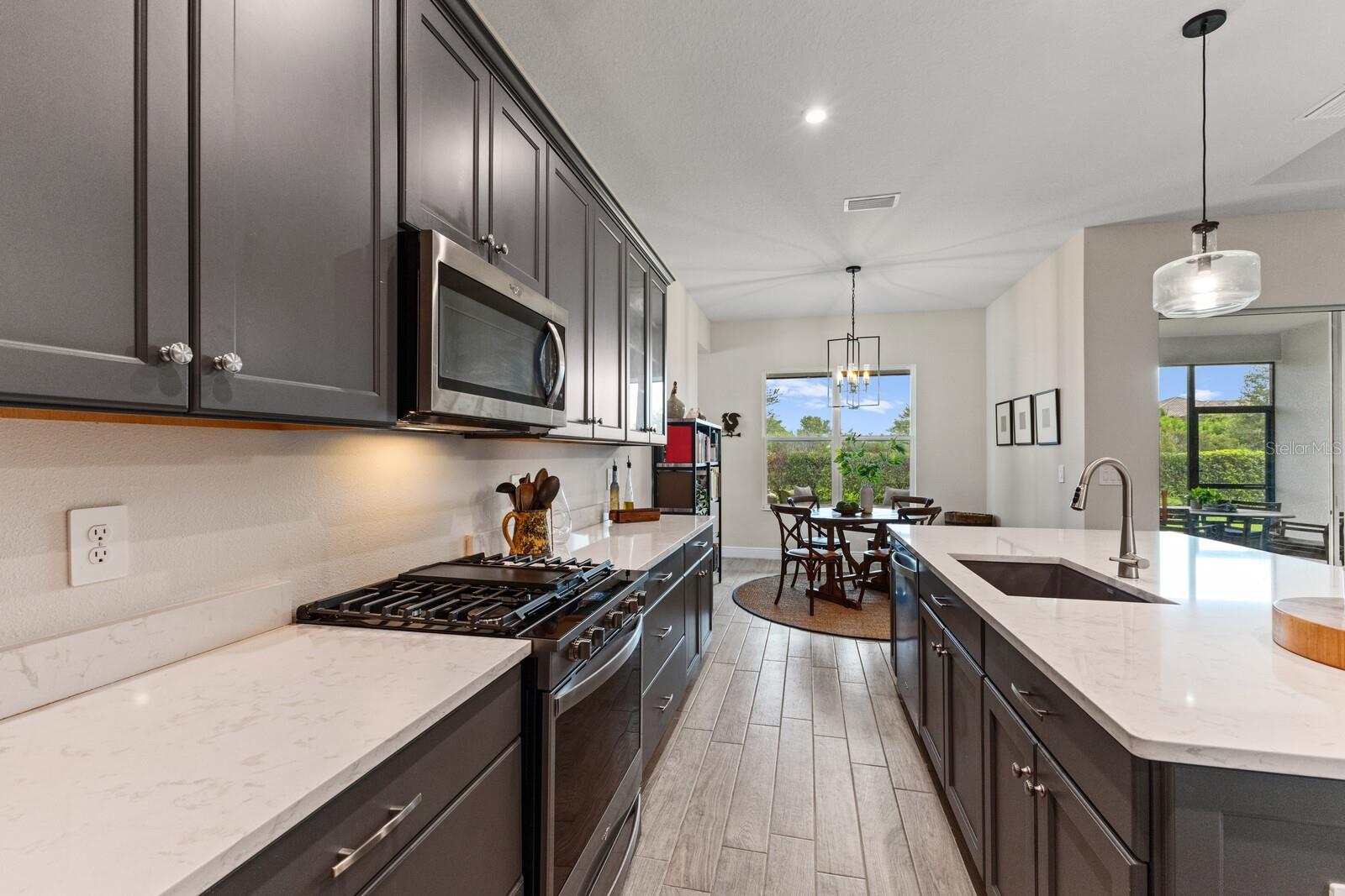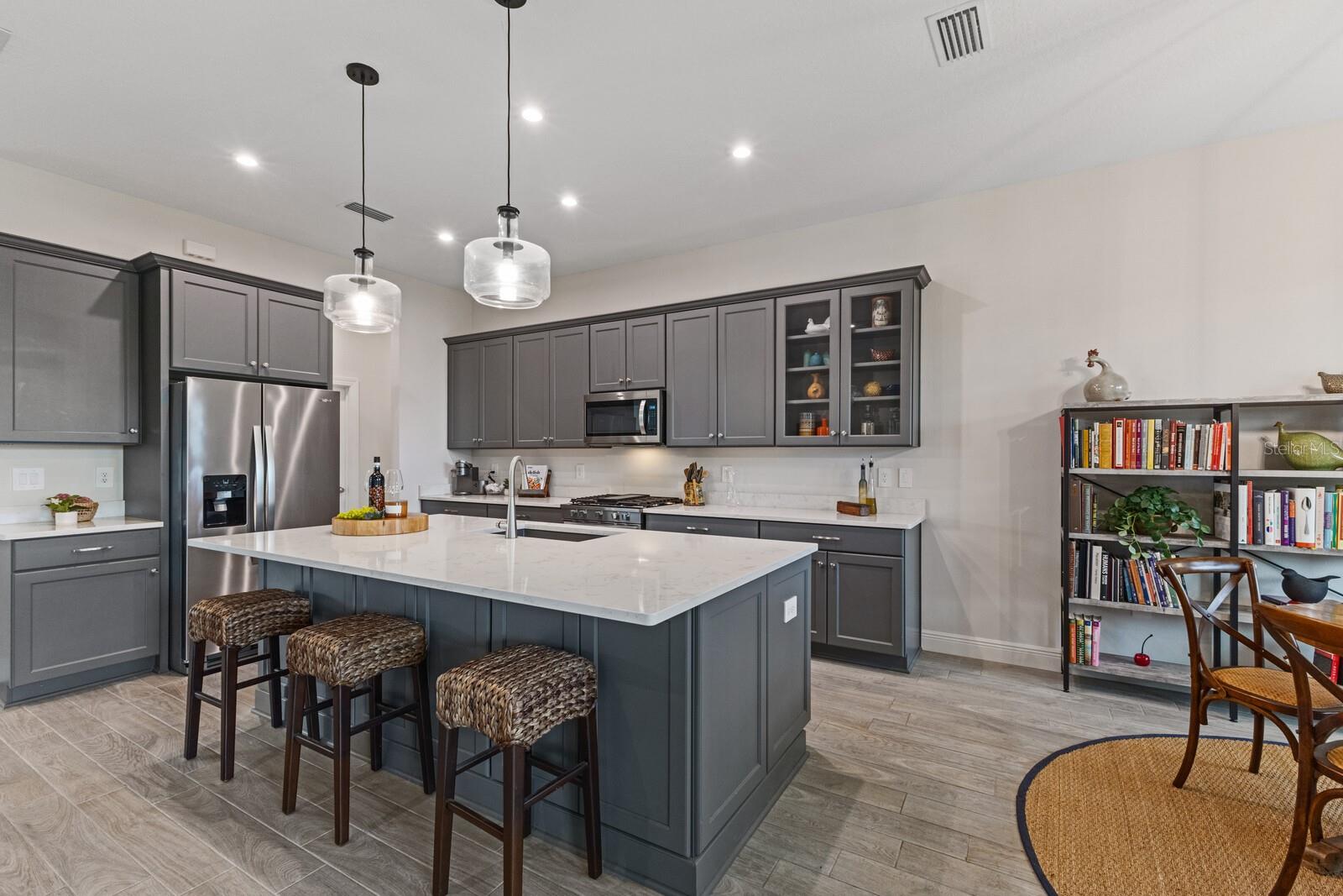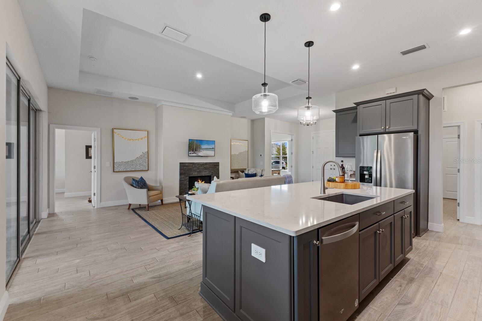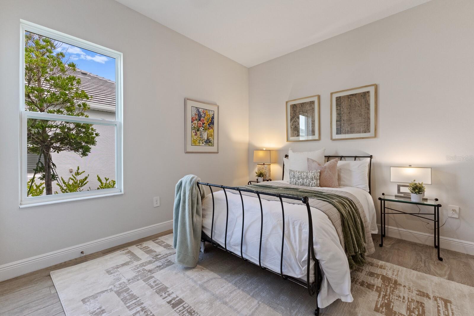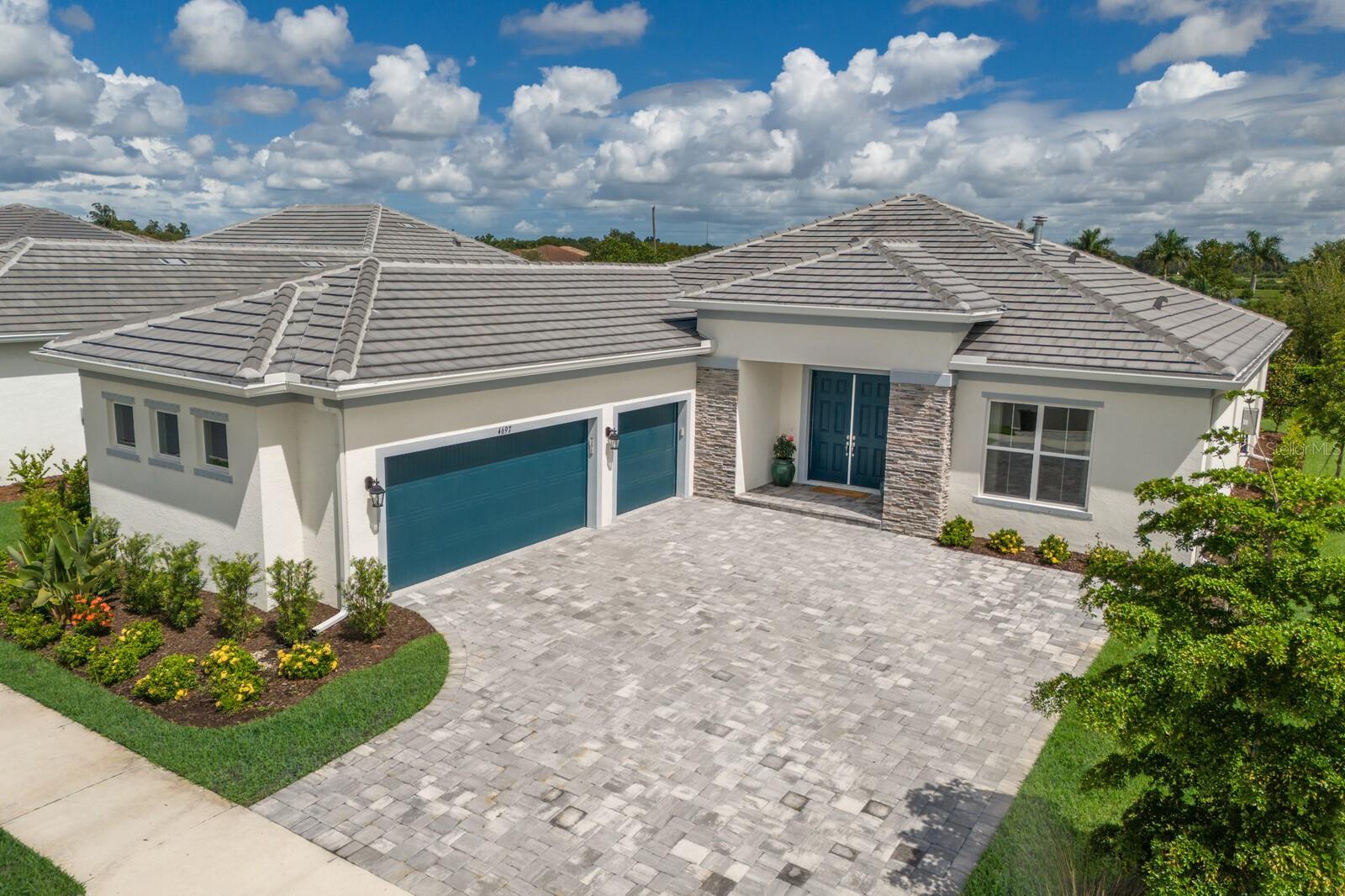 Situated on private setting, this Asher great room plan residence is nestled in Worthington, one of Sarasota’s newer gated communities offering an intimate neighborhood setting with maintenance-free living. This one-story 2,300 square foot open living concept plan boasts serene surroundings, optimal curb appeal, volume tray ceilings, and stunning plank tile flooring throughout. This three bedroom plus den and a bonus room plan is ideal for entertaining and every day living at every turn flowing seamlessly between the great room with gas fireplace, dining area and kitchen. Chefs will delight in the upgraded cabinetry and quartz counters, counter height island bar, stainless steel appliances, oversized walk-in pantry, and perfectly sized dining area engulfed by the surrounding private views beyond. Seamlessly connected to the outdoors, glass sliders reveal a serene outdoor living space with ample under cover screened entertainment areas, plus plenty of space to add a pool, spa, and outdoor kitchen. Relax and unwind in the elegant owner’s retreat positioned on a private wing, offering two walk-in closets, tray ceiling, and an appointed bath boasting separate vanities with quartz counters, large shower, and separate water closet. Overnight visitors will be right at home on their own separate wing with two generous guest suites centered by the home’s second full bath. Behind double doors off the great room, this inviting residence offers a dedicated separate study/den as well as a bonus room just off the third full bath. This inviting gem evokes a coastal elegance with a plethora of additional highlights including an oversized laundry room with utility sink, central vacuum, tankless water heater, hurricane shutters, pavered driveway, barrel tile roof, and a courtyard entry three car garage. Worthington is positioned in East Sarasota, minutes from downtown Sarasota, UTC Mall, Waterside Place, and Lakewood Ranch.