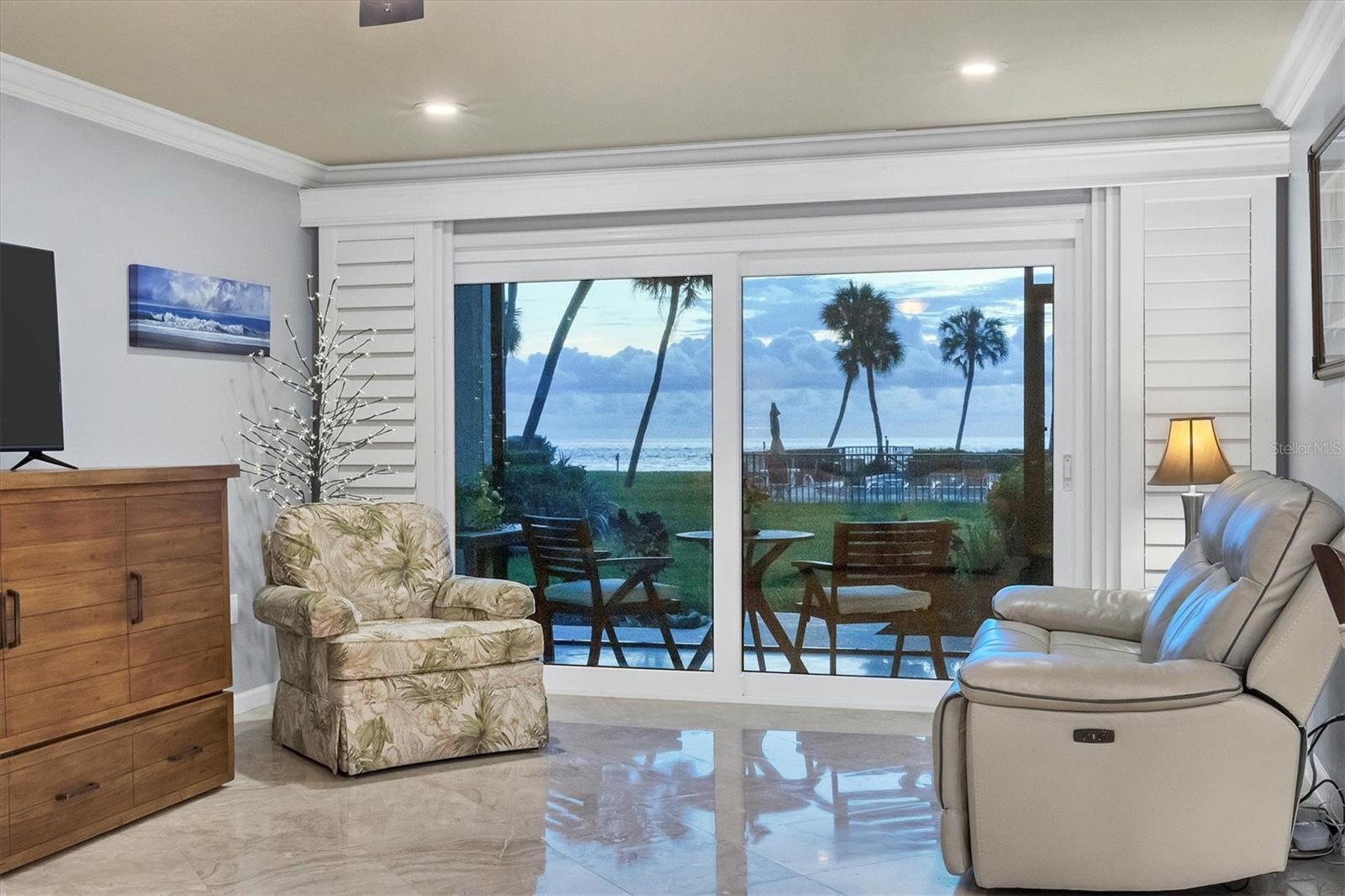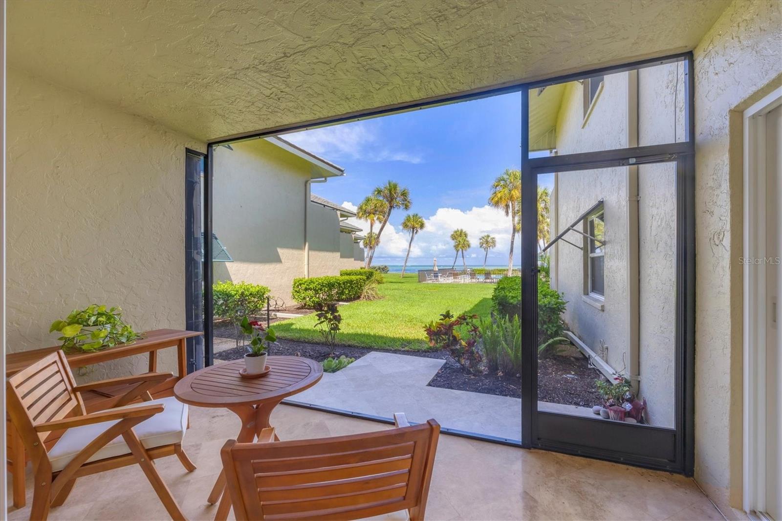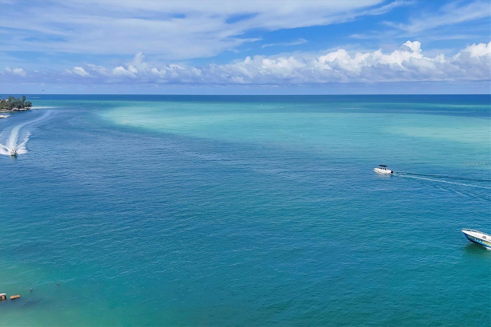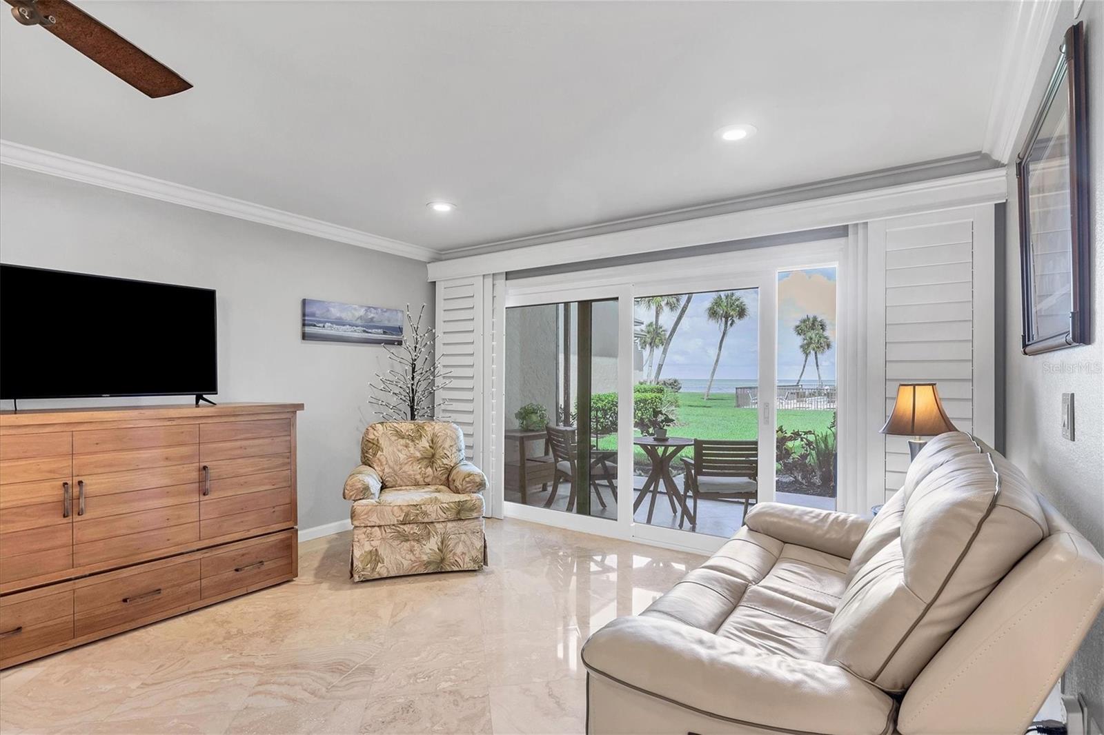 Discover a stunning, turnkey furnished waterfront condo in the highly desirable Sea Village community. Perfect for both seasonal retreats and year-round living, this condo offers a true paradise with breathtaking views of Big Pass and the Gulf of Mexico and is just steps from the heated community pool. The foyer greets you with travertine floors and an abundance of natural light streaming through the front door. Step into the living room, adorned with crown molding and hurricane rated sliders with plantation shutters, drawing you to the stunning water and sunset views. The dining room, featuring an ornate chandelier and crown molding, seamlessly opens to the kitchen and living room. The kitchen is a chef's delight with recessed lighting, wood cabinetry, granite countertops, a lazy susan, and pendant lights over the sink and breakfast bar with bar-height seating. It is equipped with a Samsung refrigerator and microwave, GE range, and Bosch dishwasher. The primary bedroom boasts crown molding, a French door entry, and sliders to the lanai offering those crazy views of the blue green waters. The spa-like bath includes dual sinks, wood cabinetry, travertine floors, a walk-in shower, and a wall of closets. The guest bedroom features crown molding, a window with plantation shutters, and a wall of closets. The guest bath is elegantly designed with a wood vanity with a granite top and travertine on the walls to the ceiling and in the shower. The lanai, with travertine flooring that extends to the outdoor patio beyond the screened-in area, offers a clear view screen, perfect for enjoying expanded views and the outdoors. There is also a fishing pier for residents to use. For peace of mind, the unit is equipped with impact-rated glass. This residence is being sold turnkey furnished, except for a few personal items and select pieces of art. Located on the north end of the island, this residence offers easy access to Siesta Key Beach, Sarasota, and the area's wealth of amenities and attractions. With Siesta Key Village within walking distance, you can effortlessly enjoy the island's finest dining, shopping, and entertainment options, making every day a delightful coastal experience.