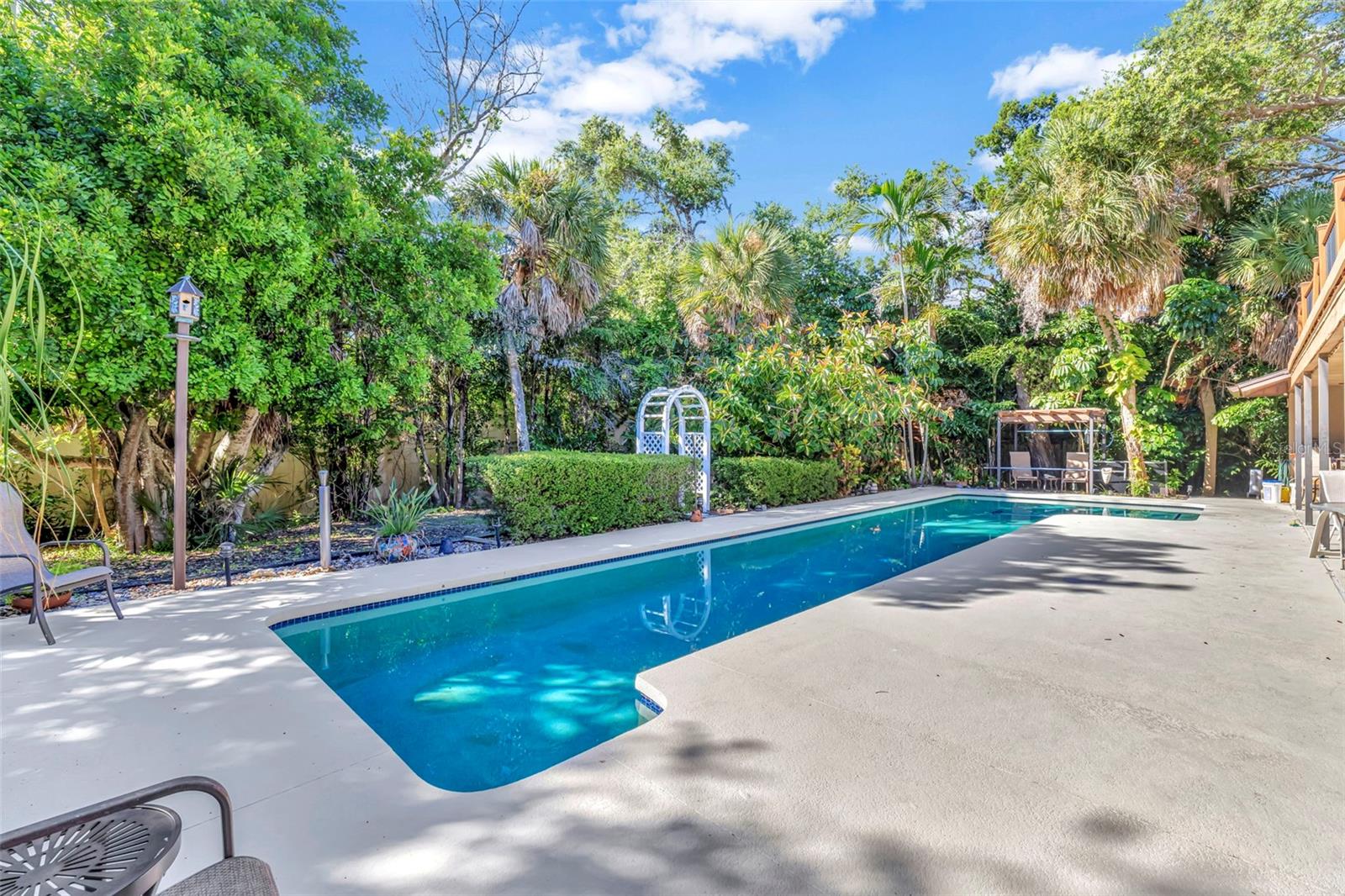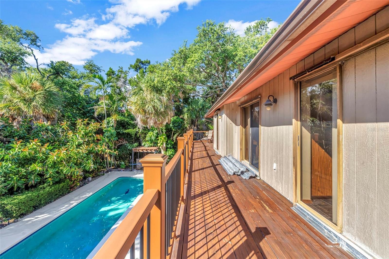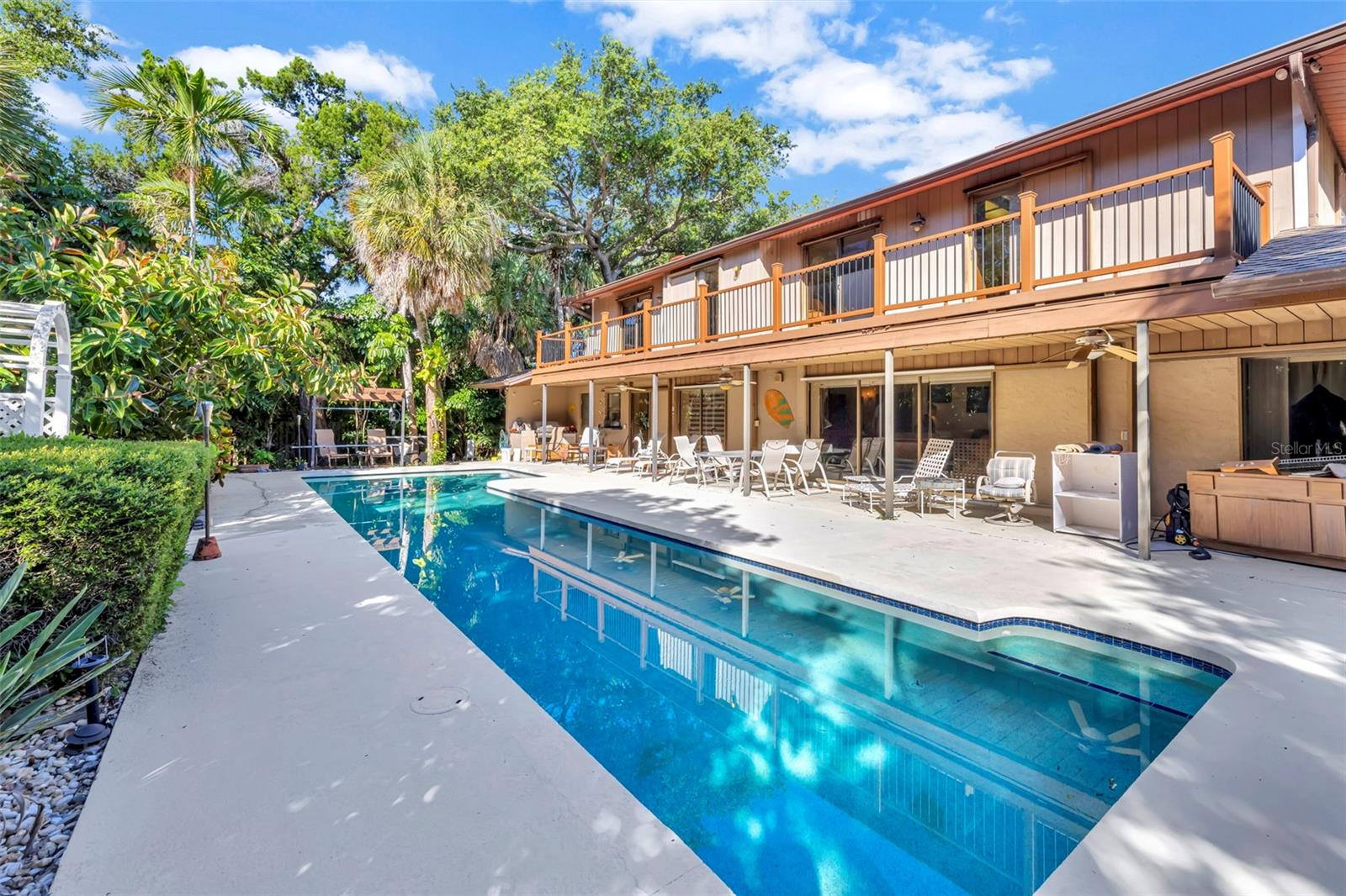 ALMOST A HALF ACRE ON SIESTA KEY: This rare piece of prime real estate is .42 acres on OCEAN BLVD. This four bedroom, four and half bath home has two floors, an expansive second level deck with a stunning view of the pool and backyard. The front has a grand entrance with enough space to park up to six vehicles and also has a two car garage. The first floor of this home has a large dining/family room combo with view of pool and a charming study/reading room directly off the primary bedroom that overlooks an outdoor garden courtyard. Off the primary bedroom there is a private outdoor shower and cooling off area. Second floor includes all the guest bedrooms/baths and game room. The pool area is very nicely designed with shaded covered space, enough room for grilling/eating outdoors as well as unshaded area for relaxing in the sun. The yard on each side has enough space for boats, jet skis and a hot tub. Add your own personal upgrades to your perfect beach getaway. The local Siesta Key restaurants are under a half mile away (.4 miles) and the public beach is two and a half miles from the home. This location is perfect for beach retreat or vacation rental.